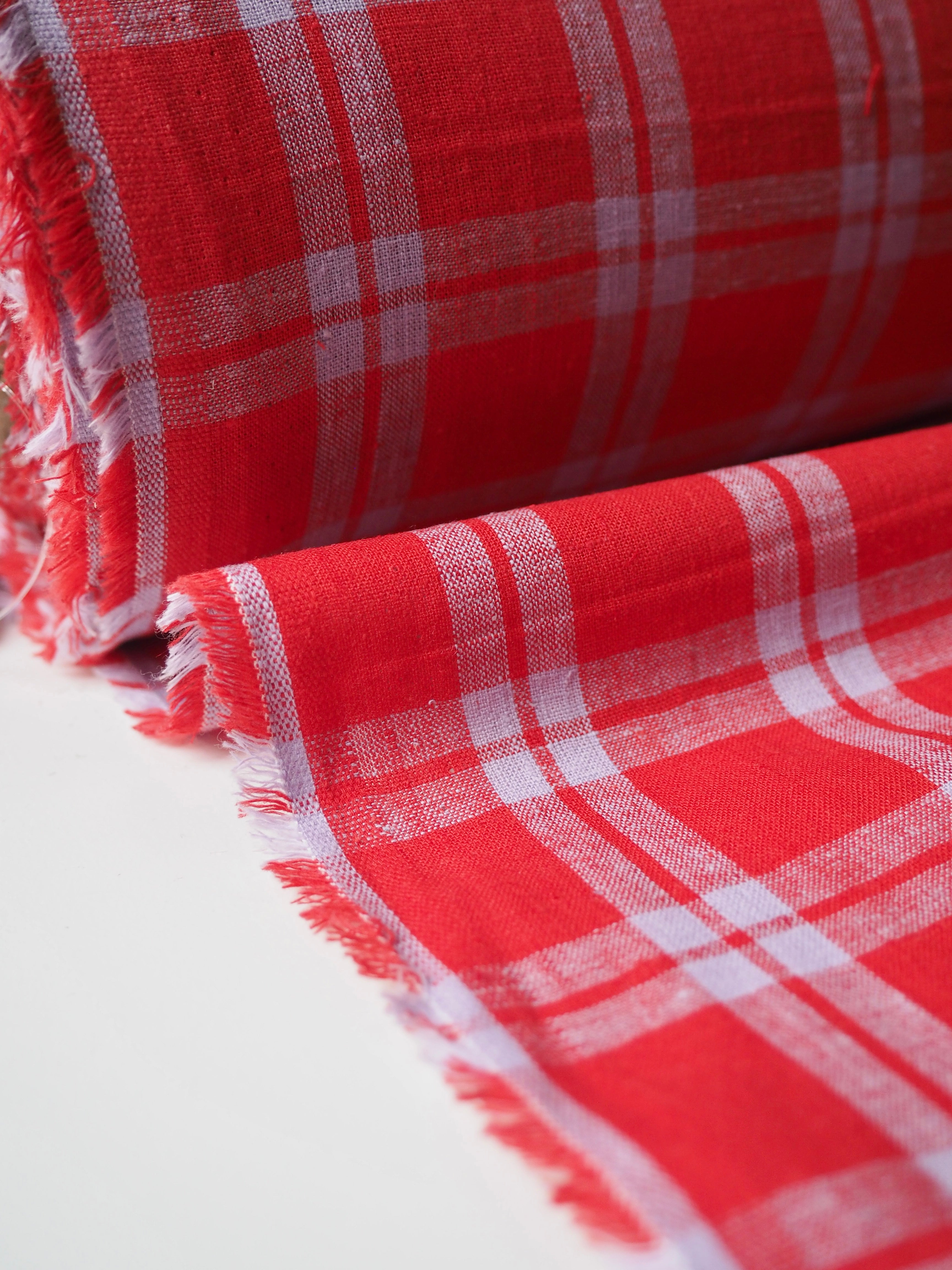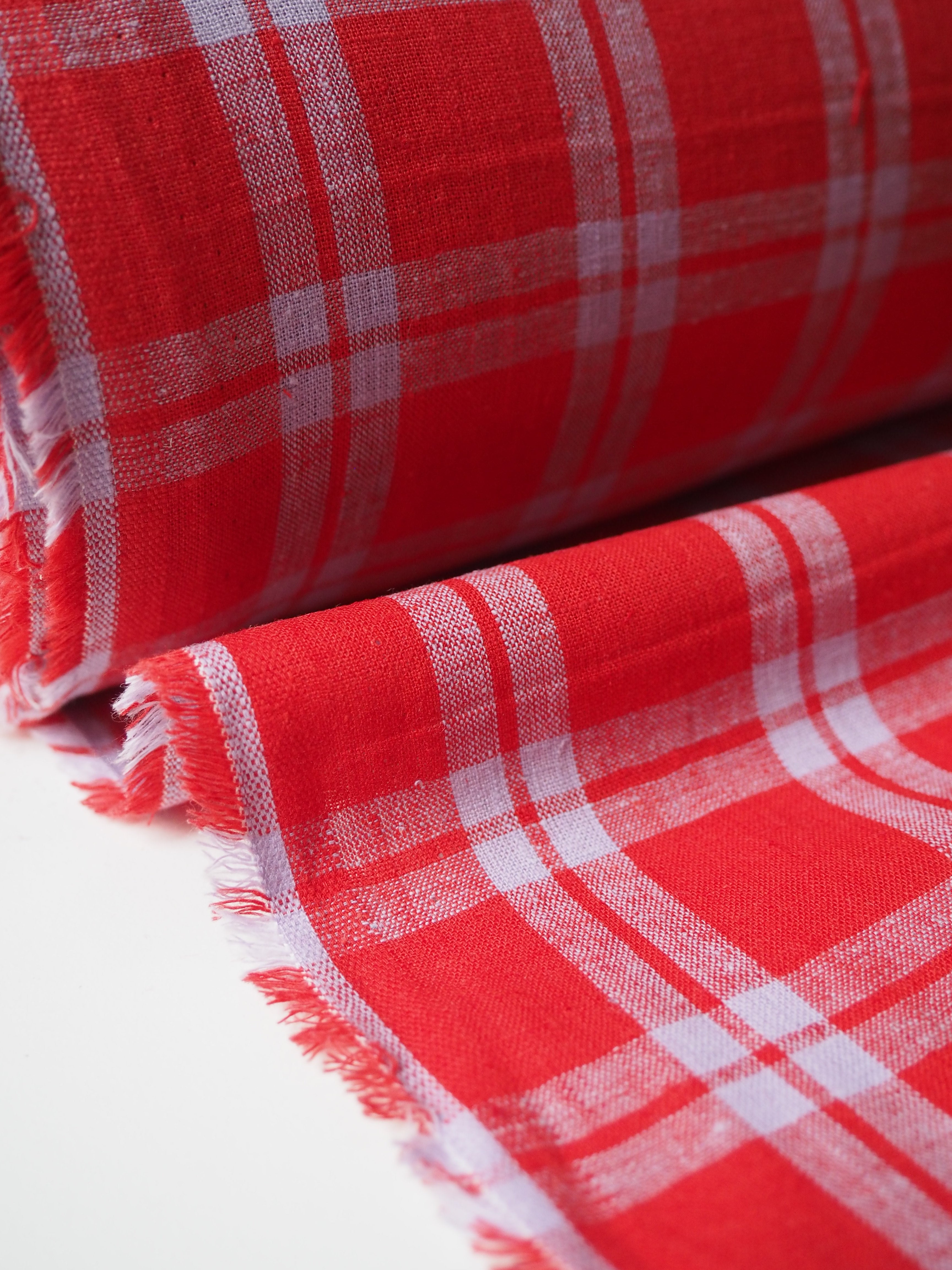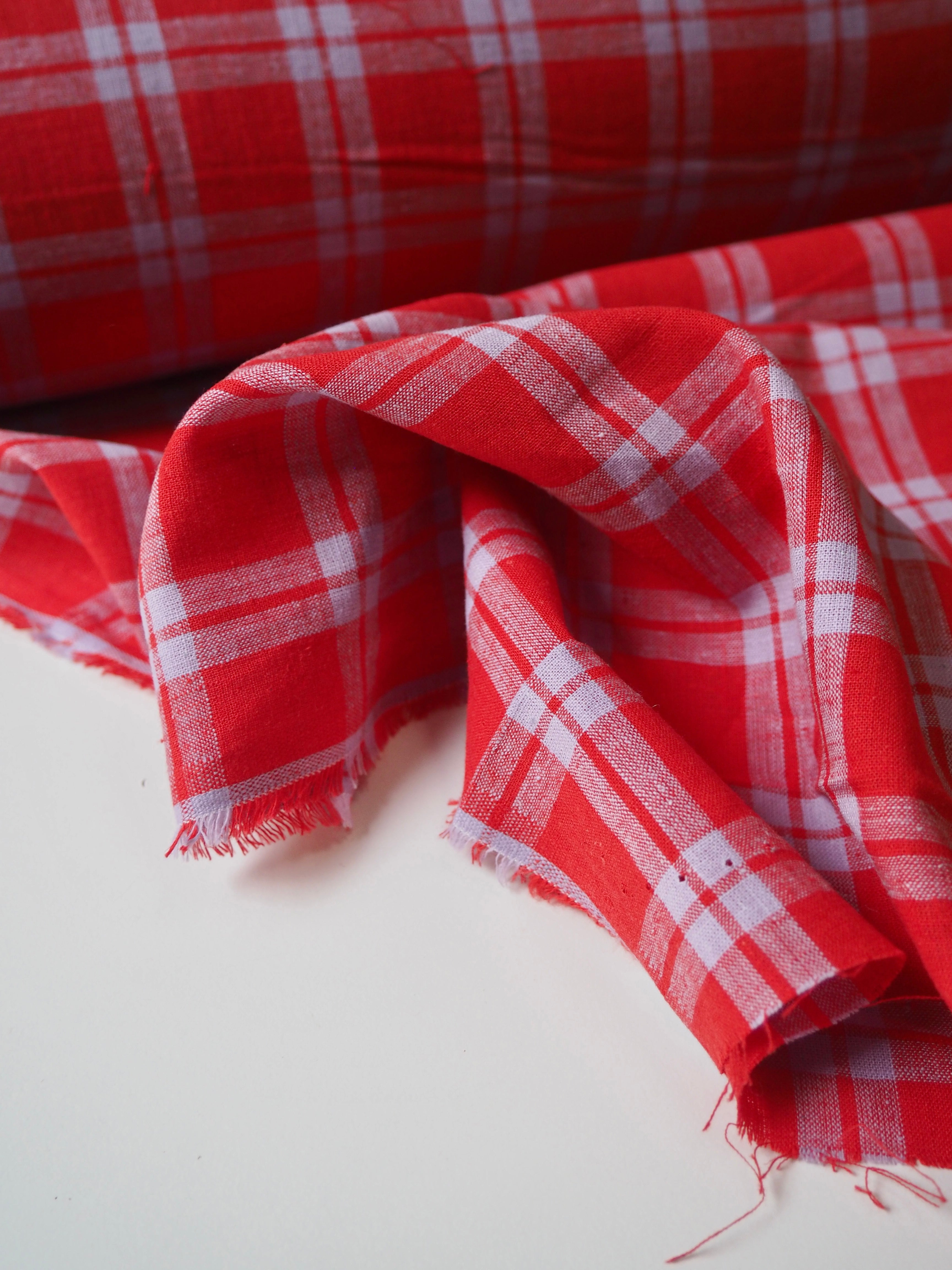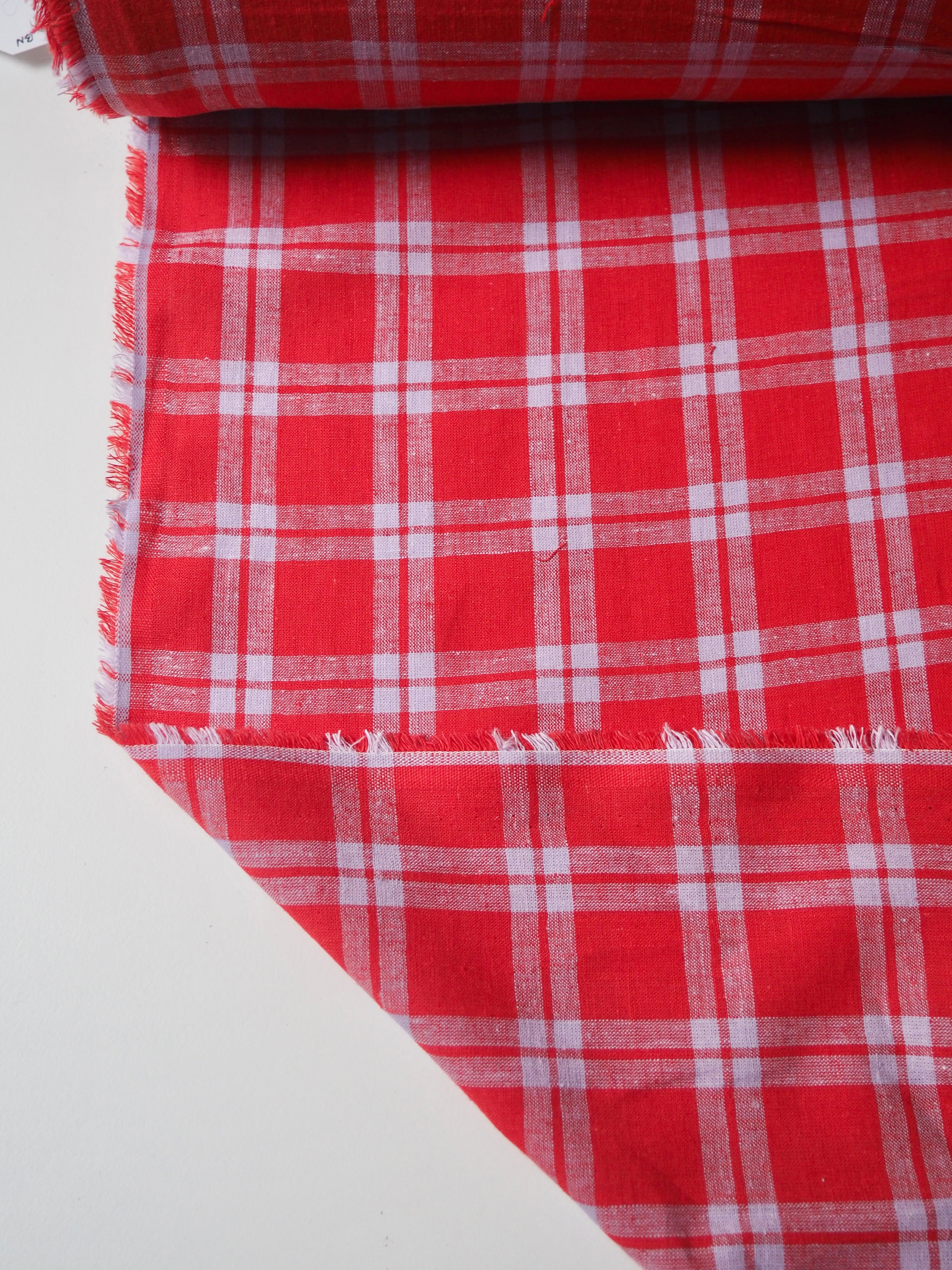 This ex-designer fabric is a cotton/linen. It's a red and pale lilac check. It's from a London-based brand called Beyond Nine. It has a super soft and gentle blended weave, with an ideal cotton-y handle that's so wearable. That little bit of linen really elevates the cloth! Very lightweight with a gentle structured drape, breathable, and fully opaque. Lovely for our Everyday Dress/Top, summer tops or Everyday Trousers, (or even a co-ord!), or a tablecloth and napkin set! We can't wait to see what you make!