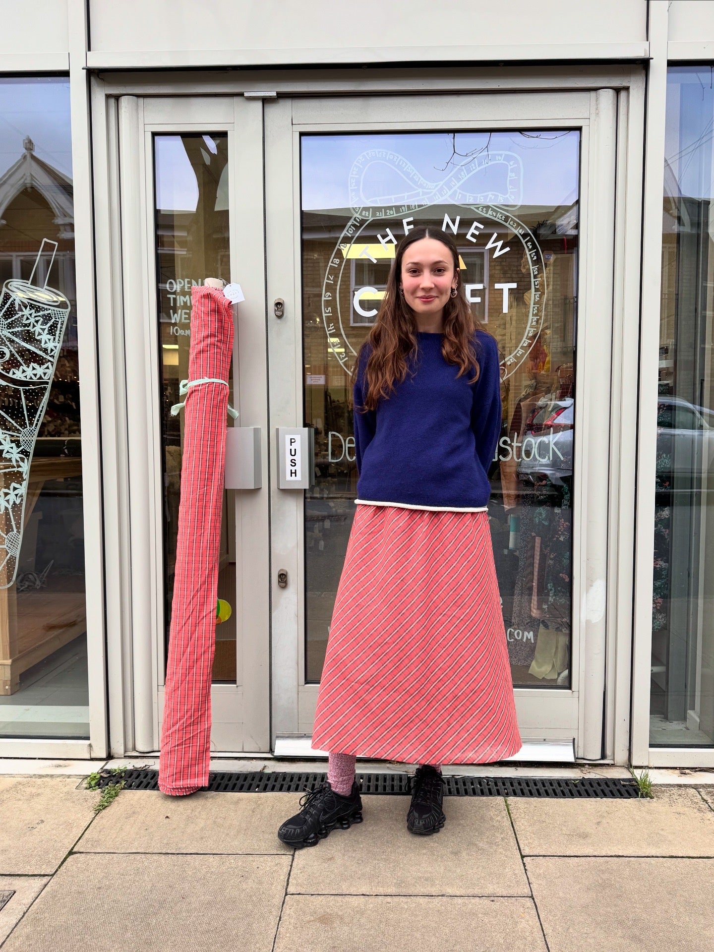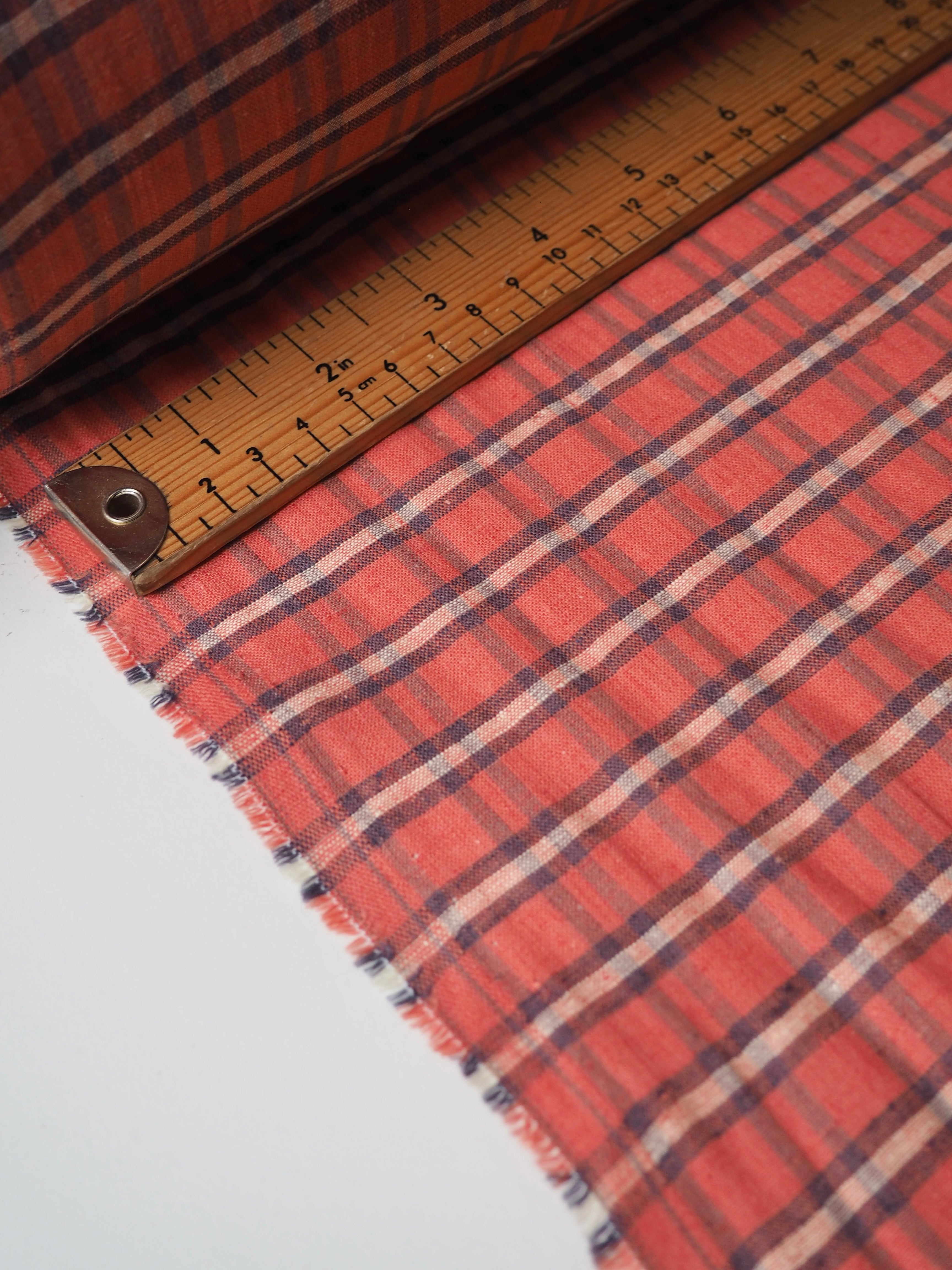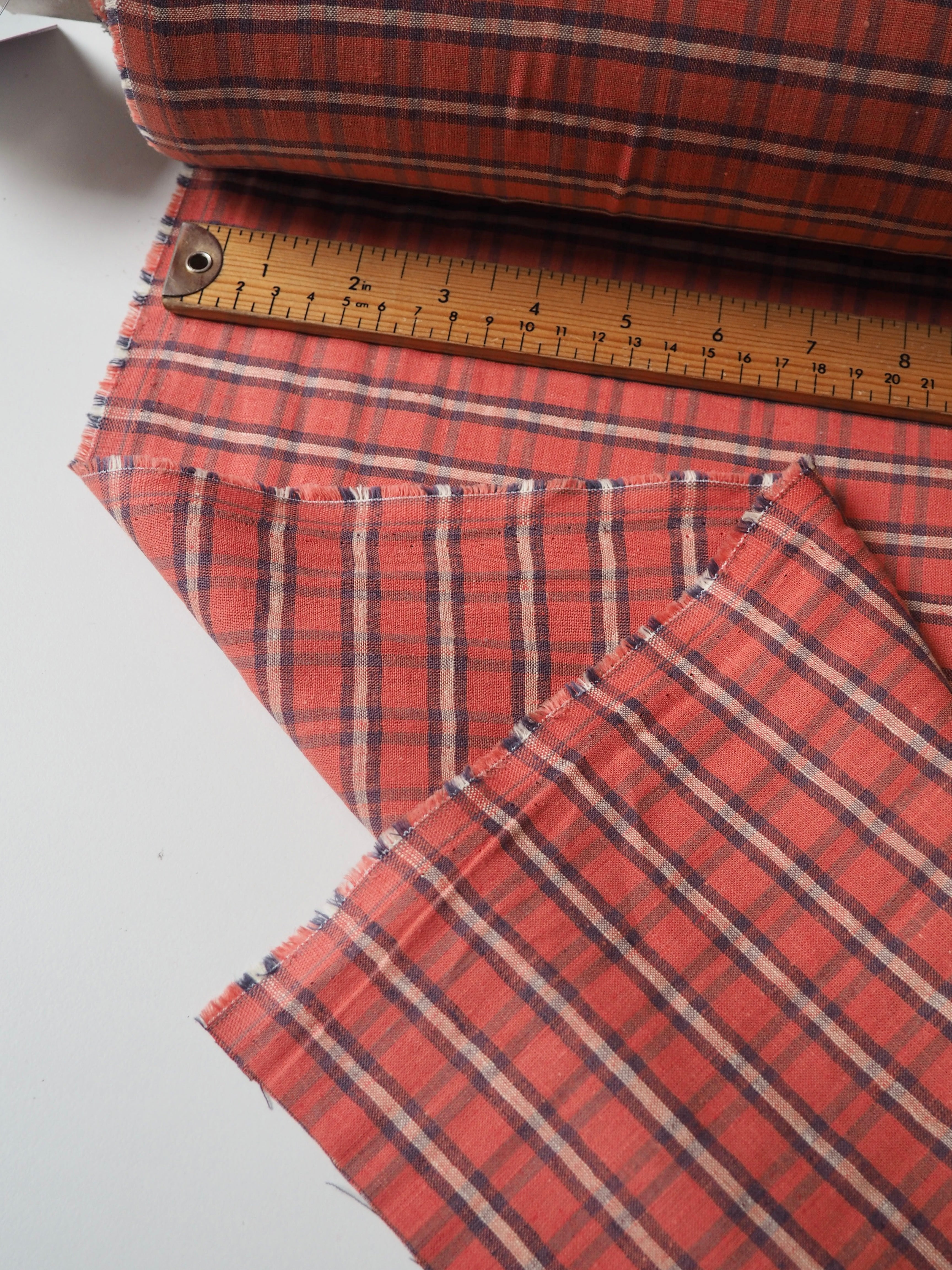This ex-designer fabric is a cotton/linen. It's a salamander pinky-orange and blue check. It's from a London-based brand called Beyond Nine. It has a super soft and gentle blended weave, with an ideal cotton-y handle that's so wearable. That little bit of linen really elevates the cloth! Very lightweight with a gentle structured drape, breathable, and fully opaque. Lovely for our Everyday Dress/Top, summer tops or Everyday Trousers, (or even a co-ord!), or a tablecloth and napkin set! We can't wait to see what you make!