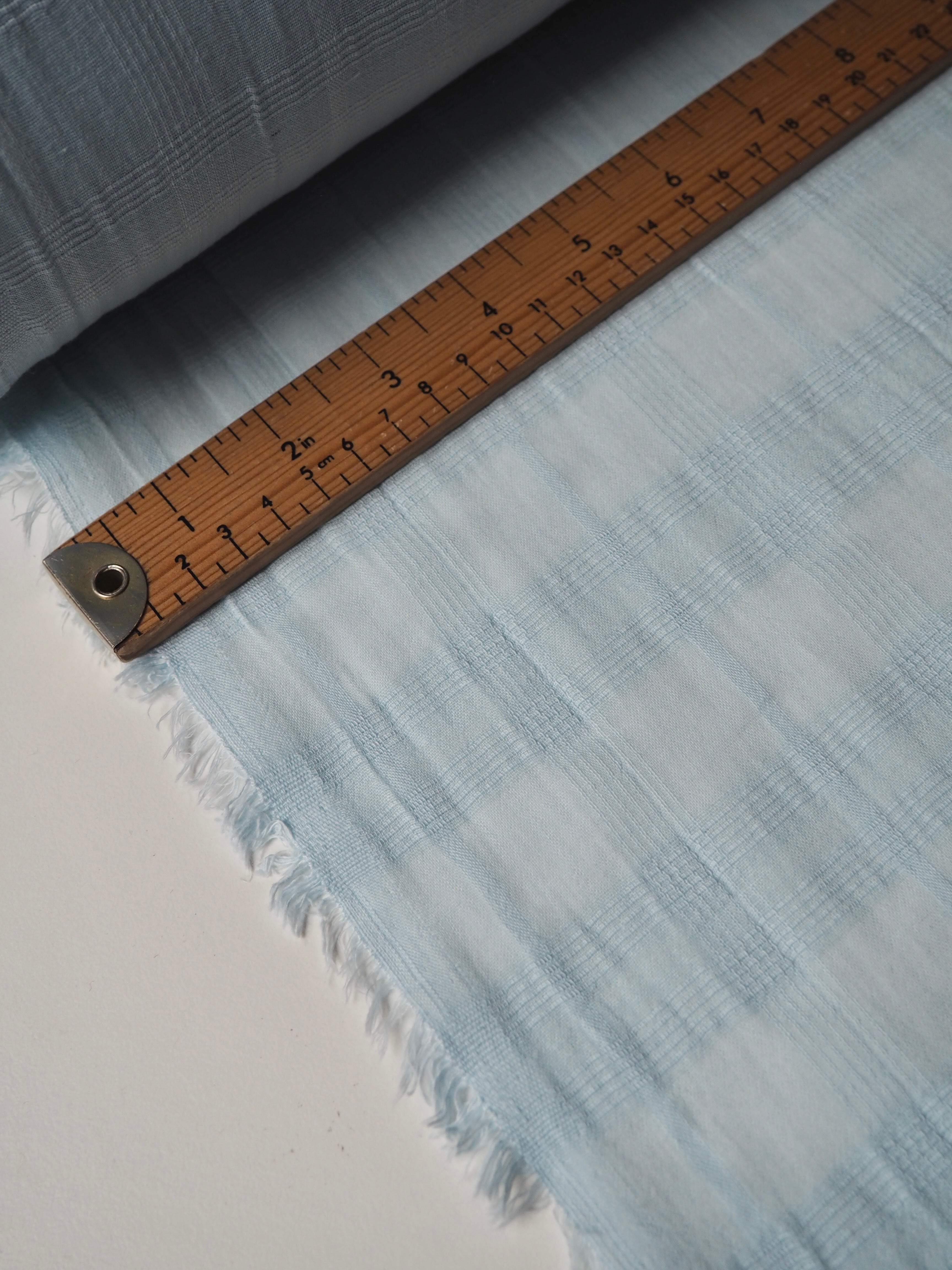 This ex-designer fabric is a cotton voile. It's a sky blue cotton voile, with a check jacquard weave. It's from a London-based brand called Beyond Nine. It has a super soft and gentle handle that's so wearable. It's a little heavier than a typical voile, but still very lightweight. Semi-sheer and drapes so beautifully! Very breathable and so soft! Lovely for our Everyday Dress/Top, or even some pyjamas! We can't wait to see what you make!