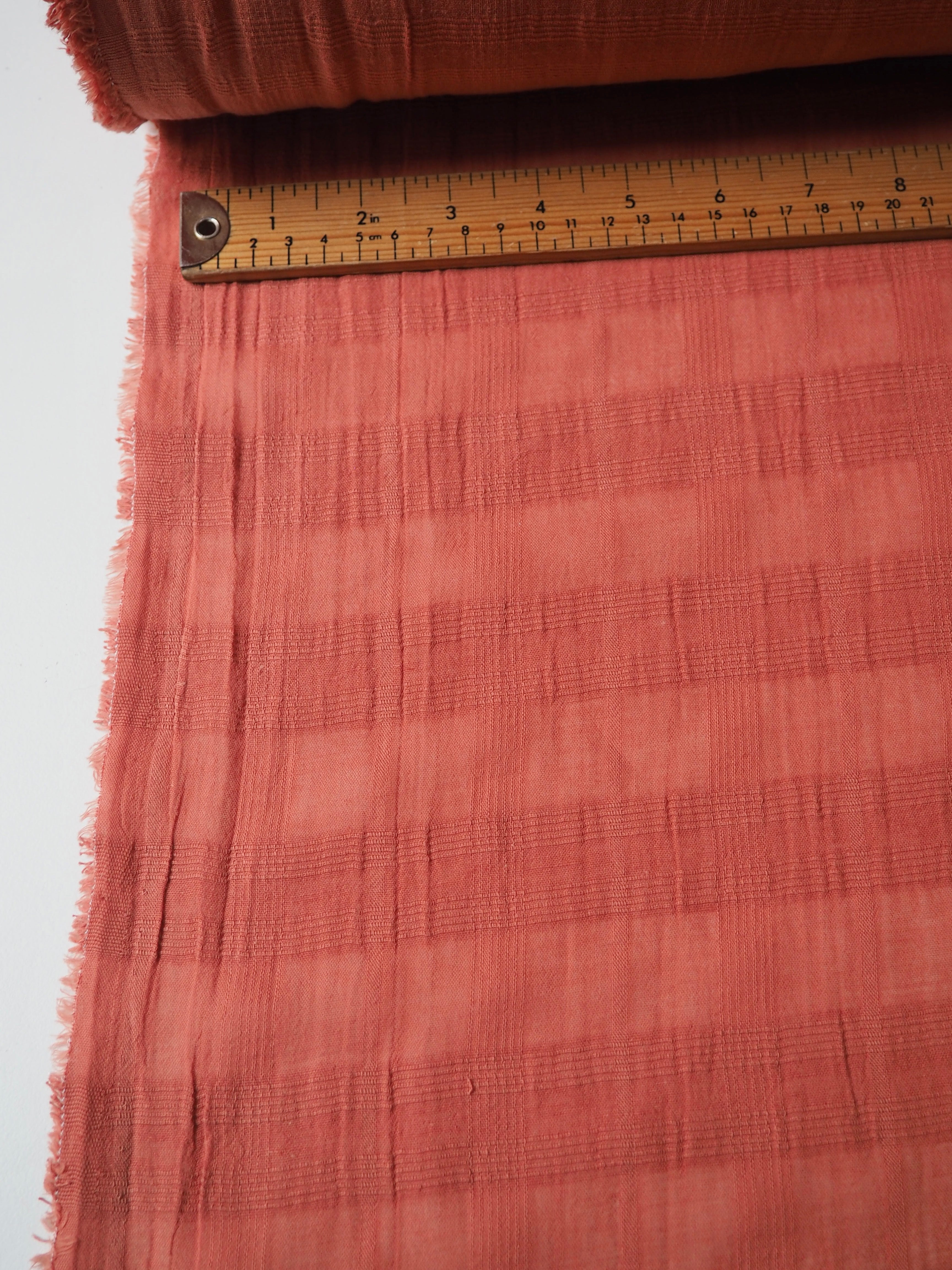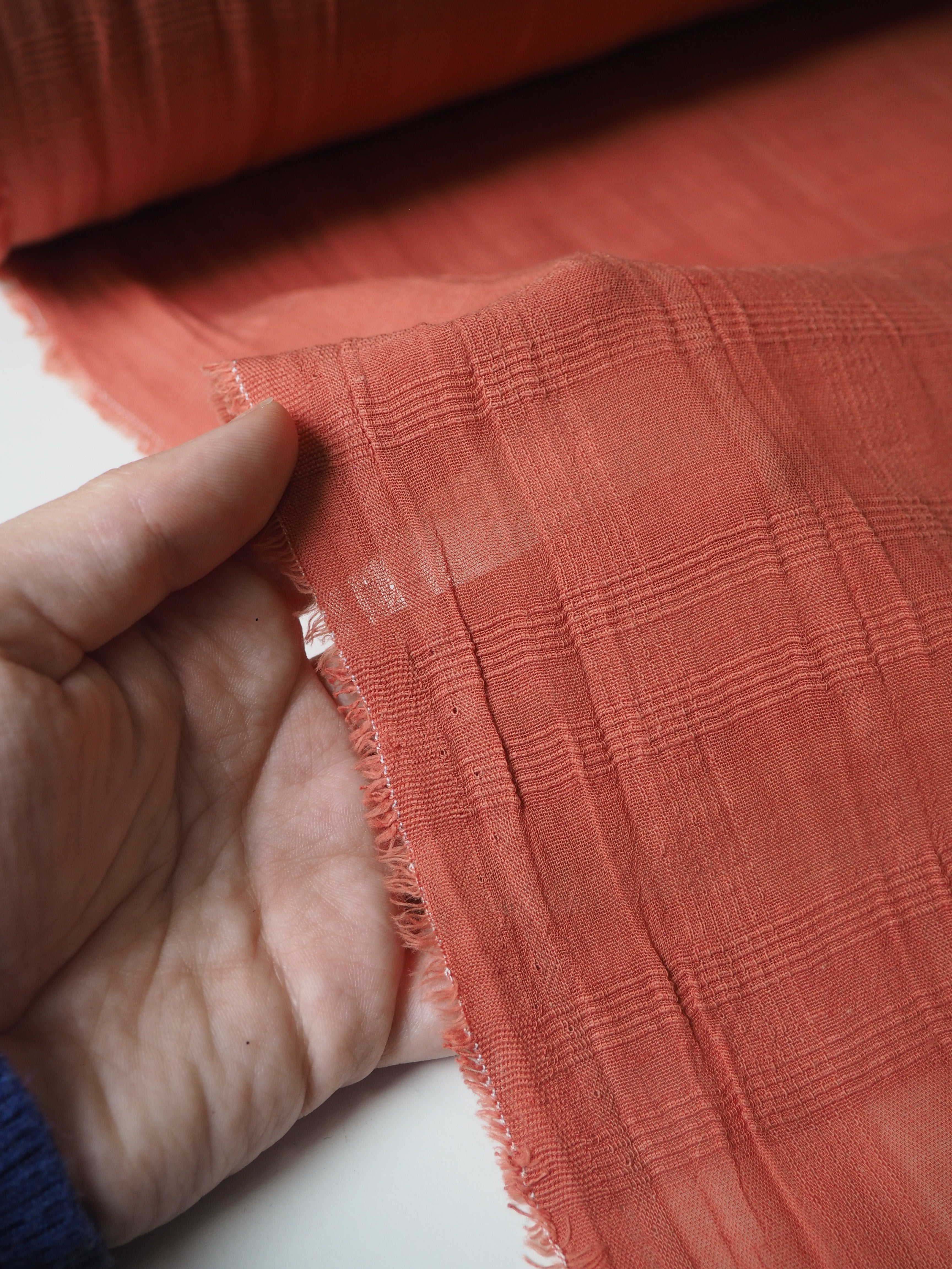 This ex-designer fabric is a cotton voile. It's a terracotta orange cotton voile, with a check jacquard weave. It's from a London-based brand called Beyond Nine. It has a super soft and gentle handle that's so wearable. It's a little heavier than a typical voile, but still very lightweight. Semi-sheer and drapes so beautifully! Very breathable and so soft! Lovely for our Everyday Dress/Top, or even some pyjamas! We can't wait to see what you make!
