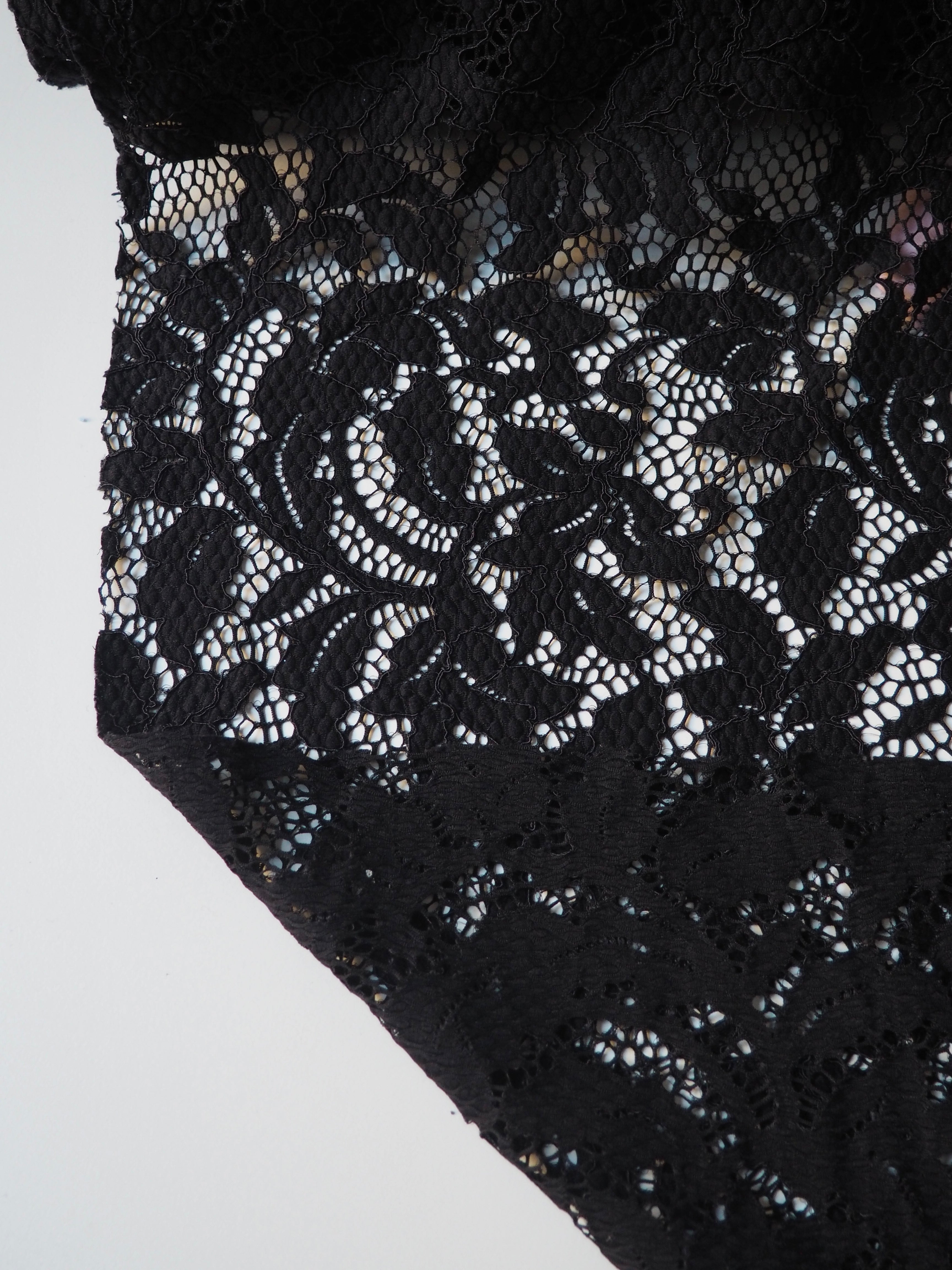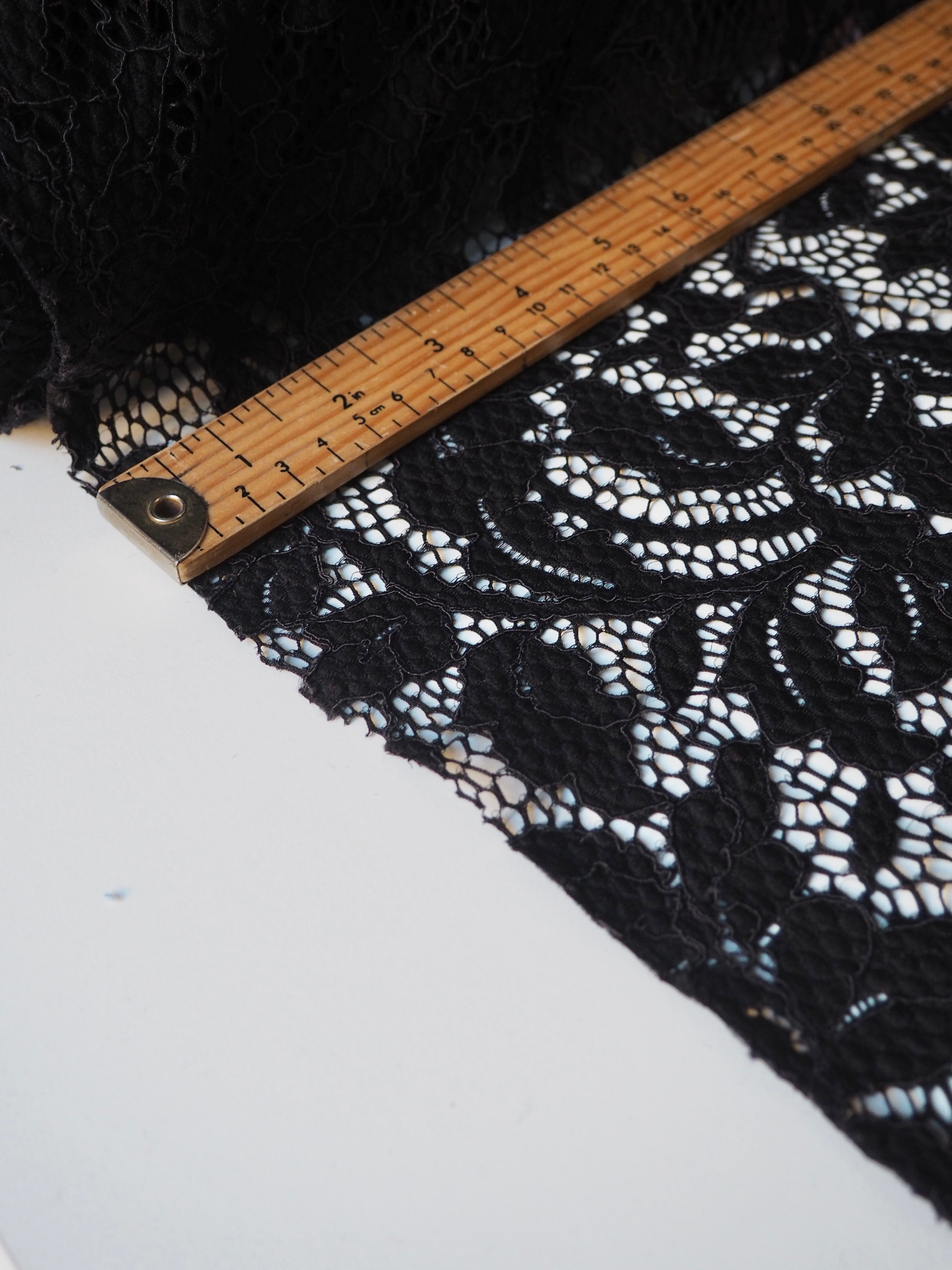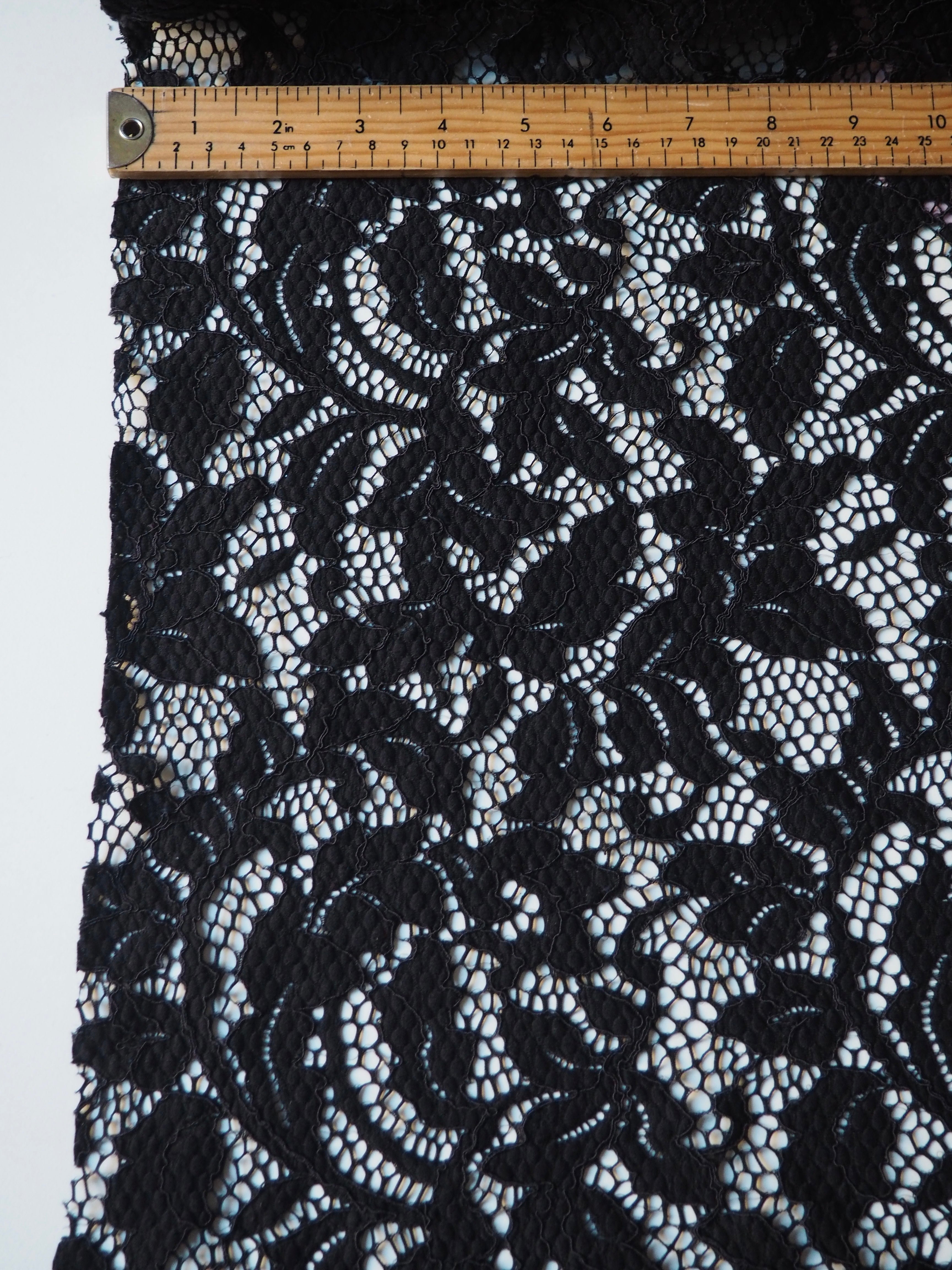 This ex-designer fabric is a corded lace. It's corded with a leafy pattern. The fabric can be used as one piece or the motifs could be cut out and appliqued on for denser coverage. Lovely medium thickness and comfortable, soft handle. A medium coverage lace design. Has about 30-40% length-ways stretch. Perfect for lingerie, or sheer tops!