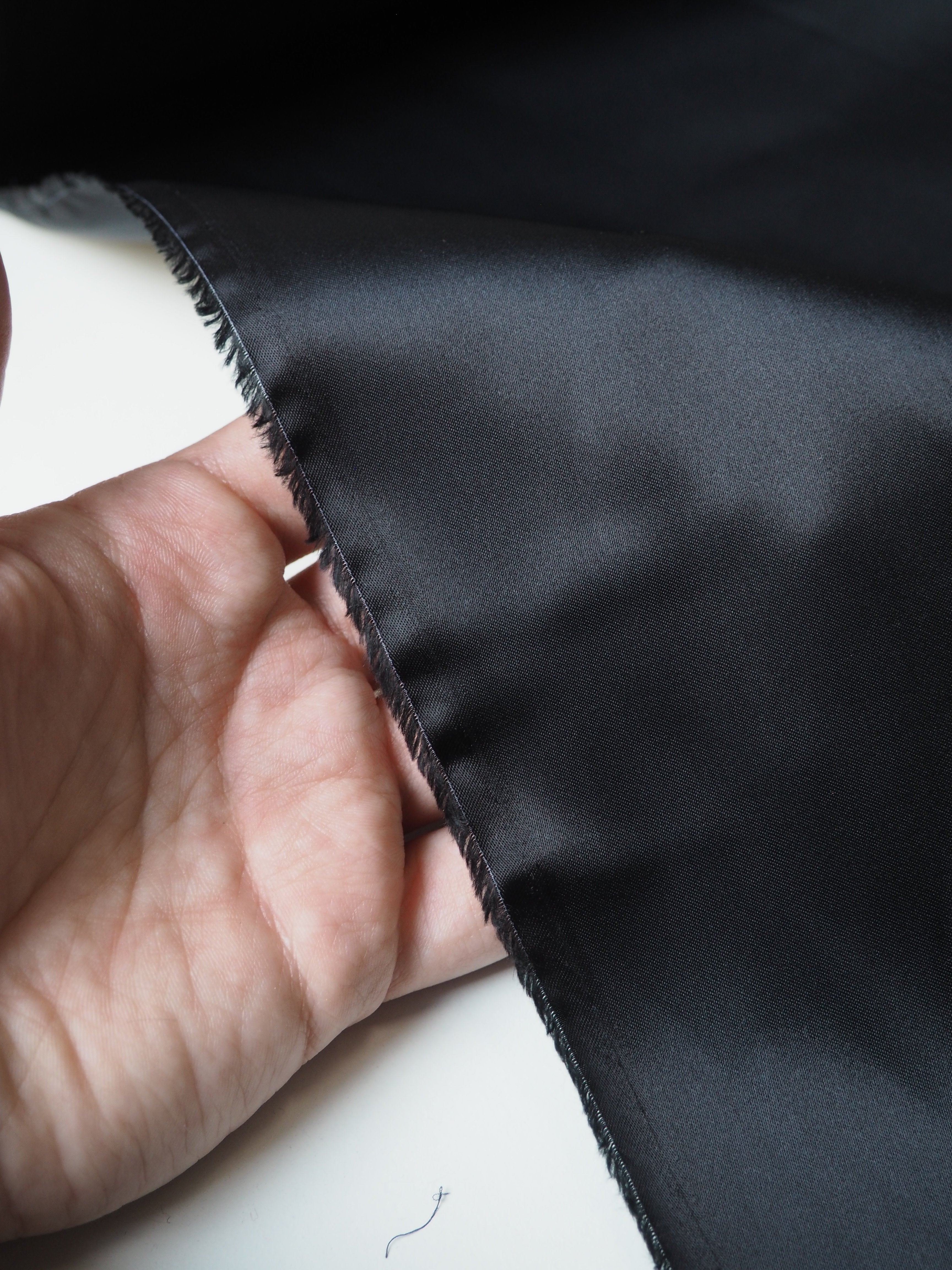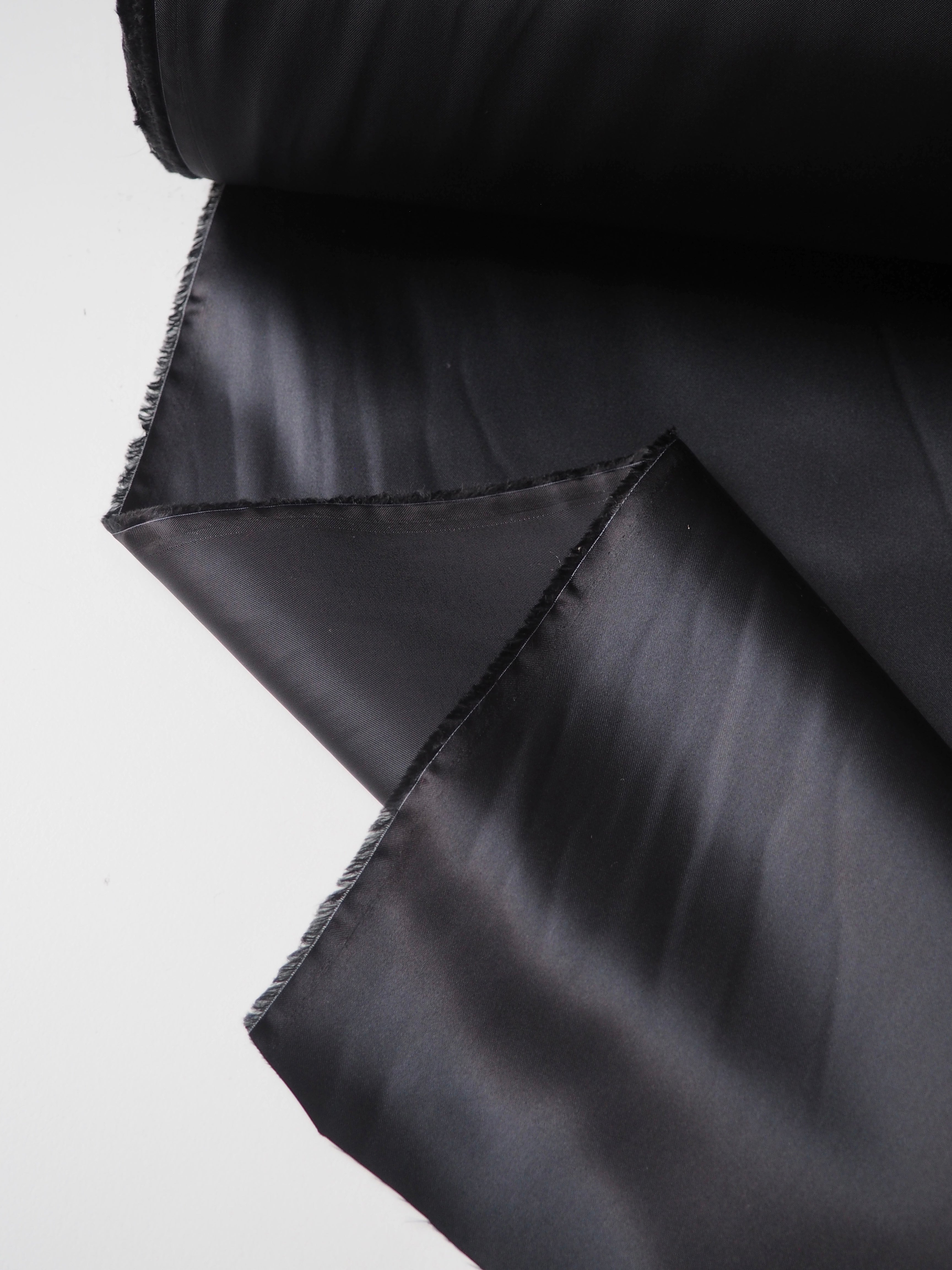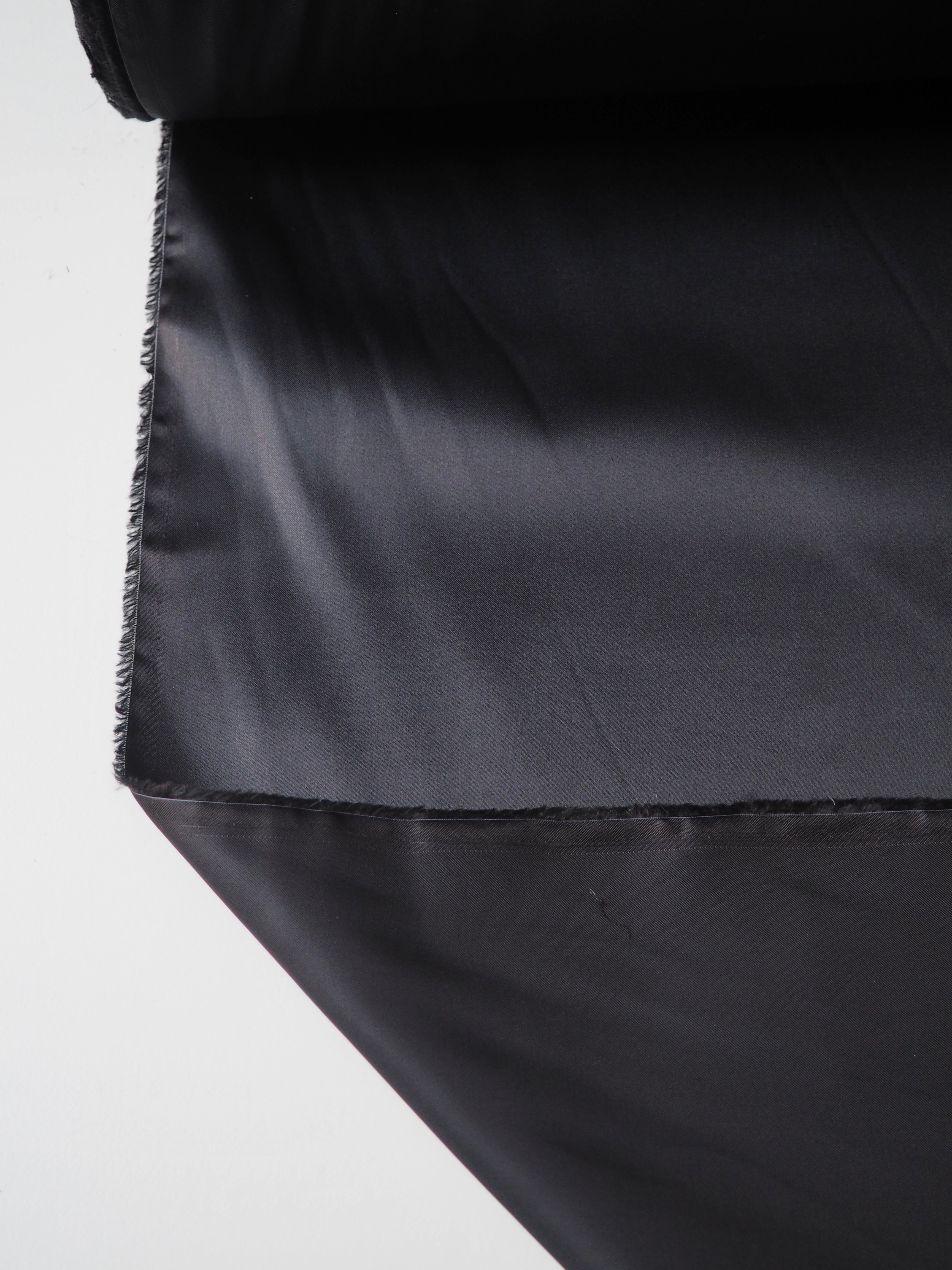 This ex-designer fabric is a lining. It has a satin weave with a gentle drape. Lightweight with beautiful movement and medium bright sheen finish. Hold shape well, has a nice light structure. Fully opaque. In a deep blueish grey shade. Ideal for lining any garment!