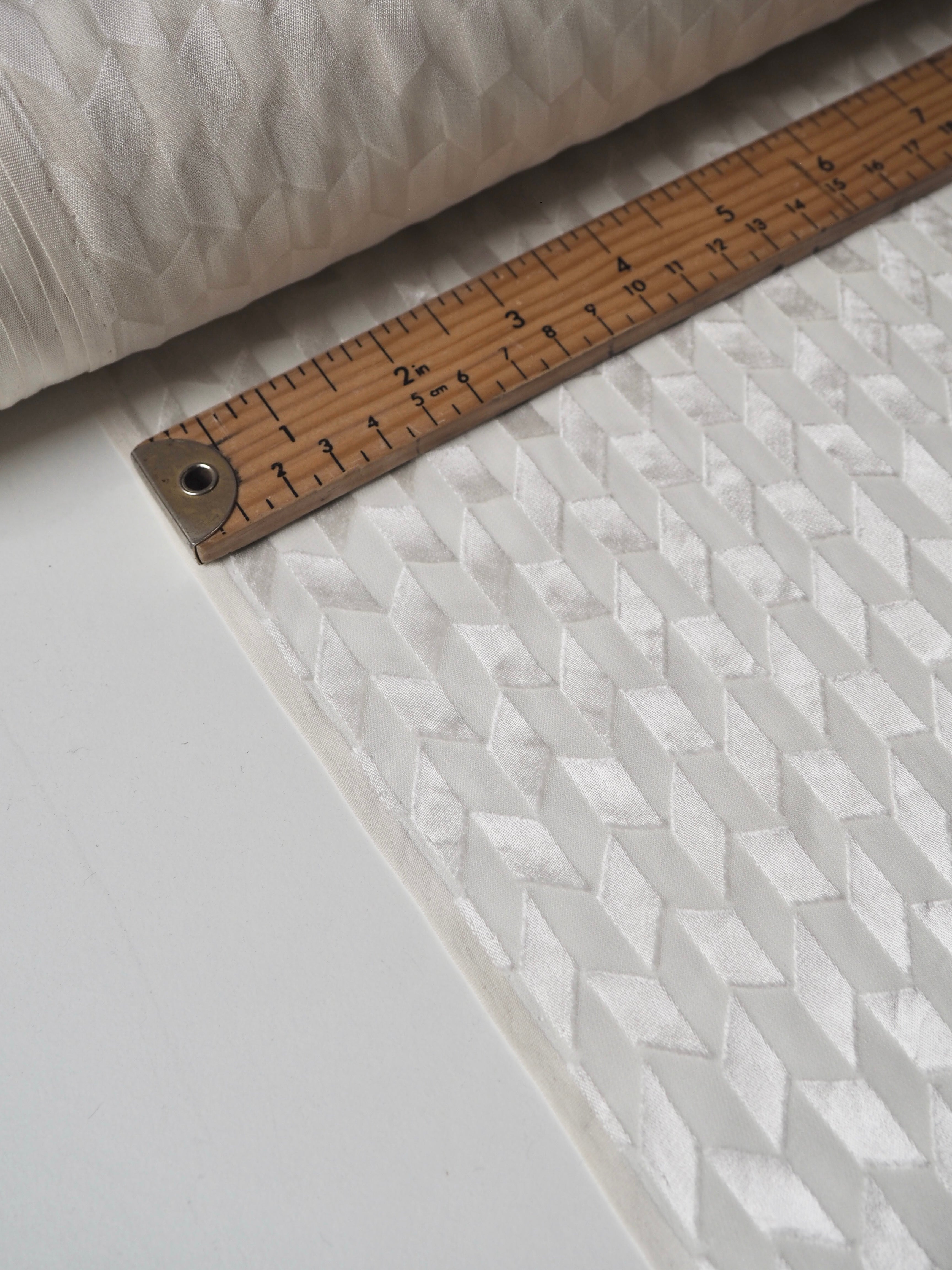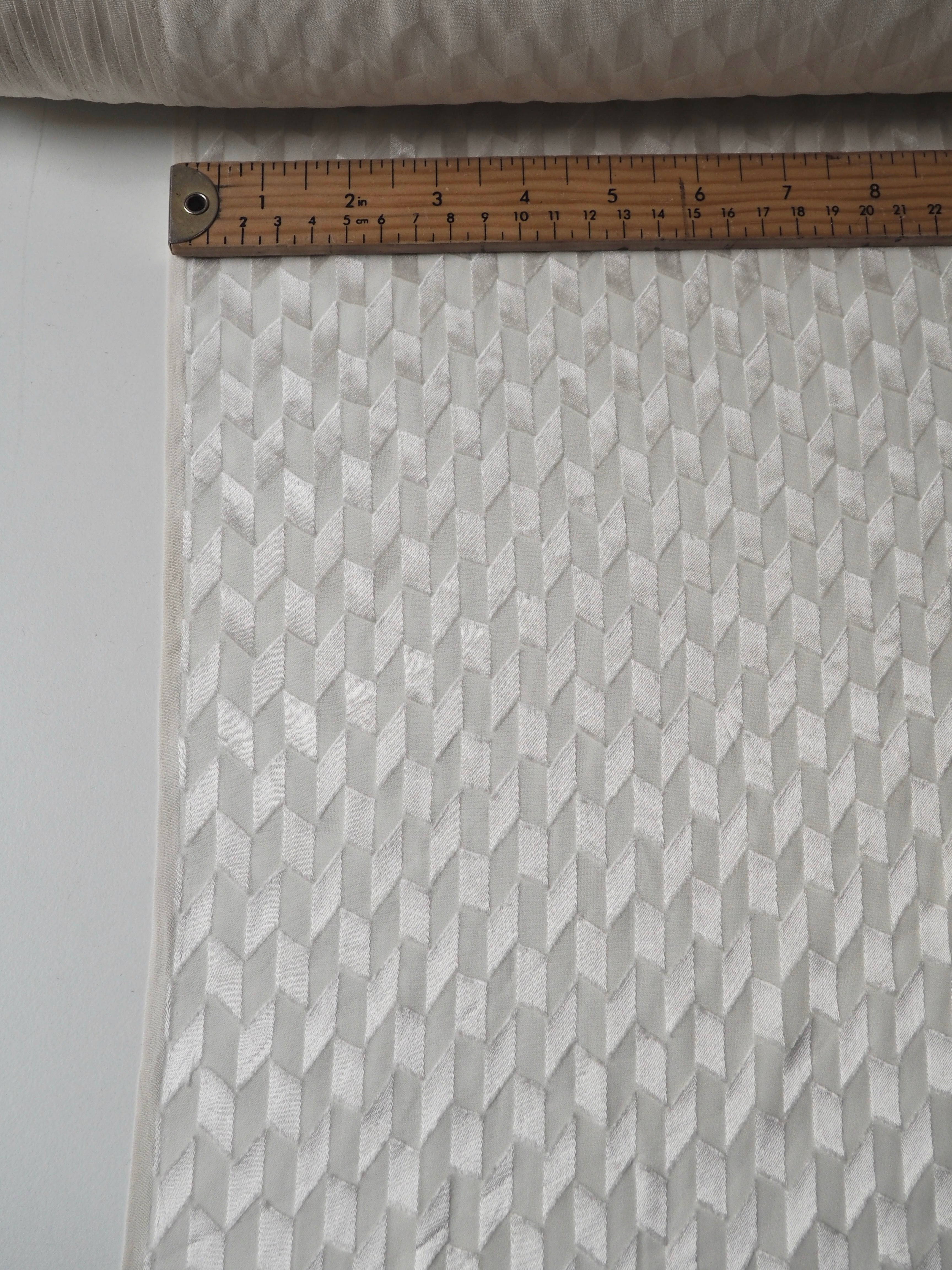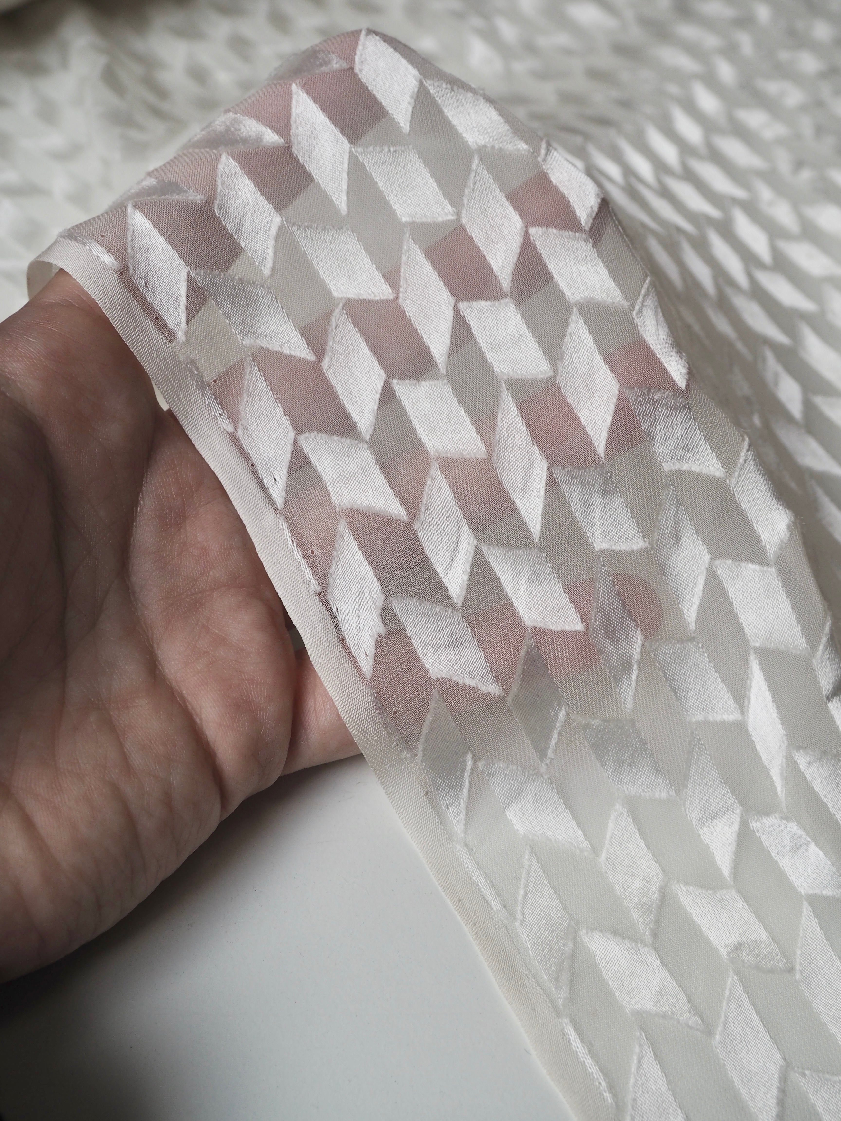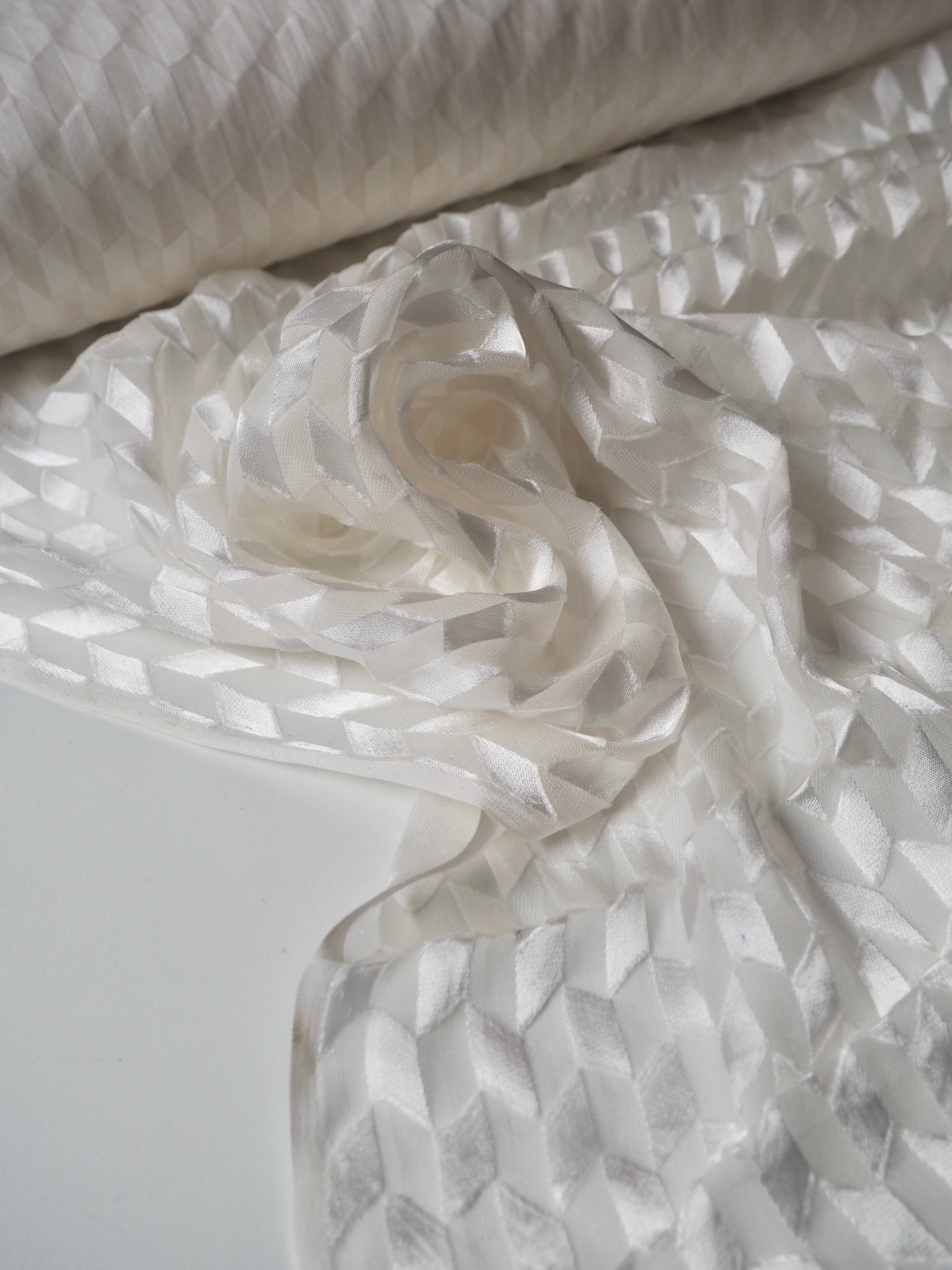 This ex-designer fabric is a beautiful burnout satin. Burnout fabrics, also known as devoré, are treated with a chemical process that burns away the pile in specific areas, in this case creating a medium scale geometric pattern. The pattern is a high shine satin whilst the burnout areas are sheer and similar to a chiffon. Lightweight with a gorgeous airy drape. Has an incredible soft silk handle. Would look amazing as a blouse or as the overlay of a dress, even for bridal!