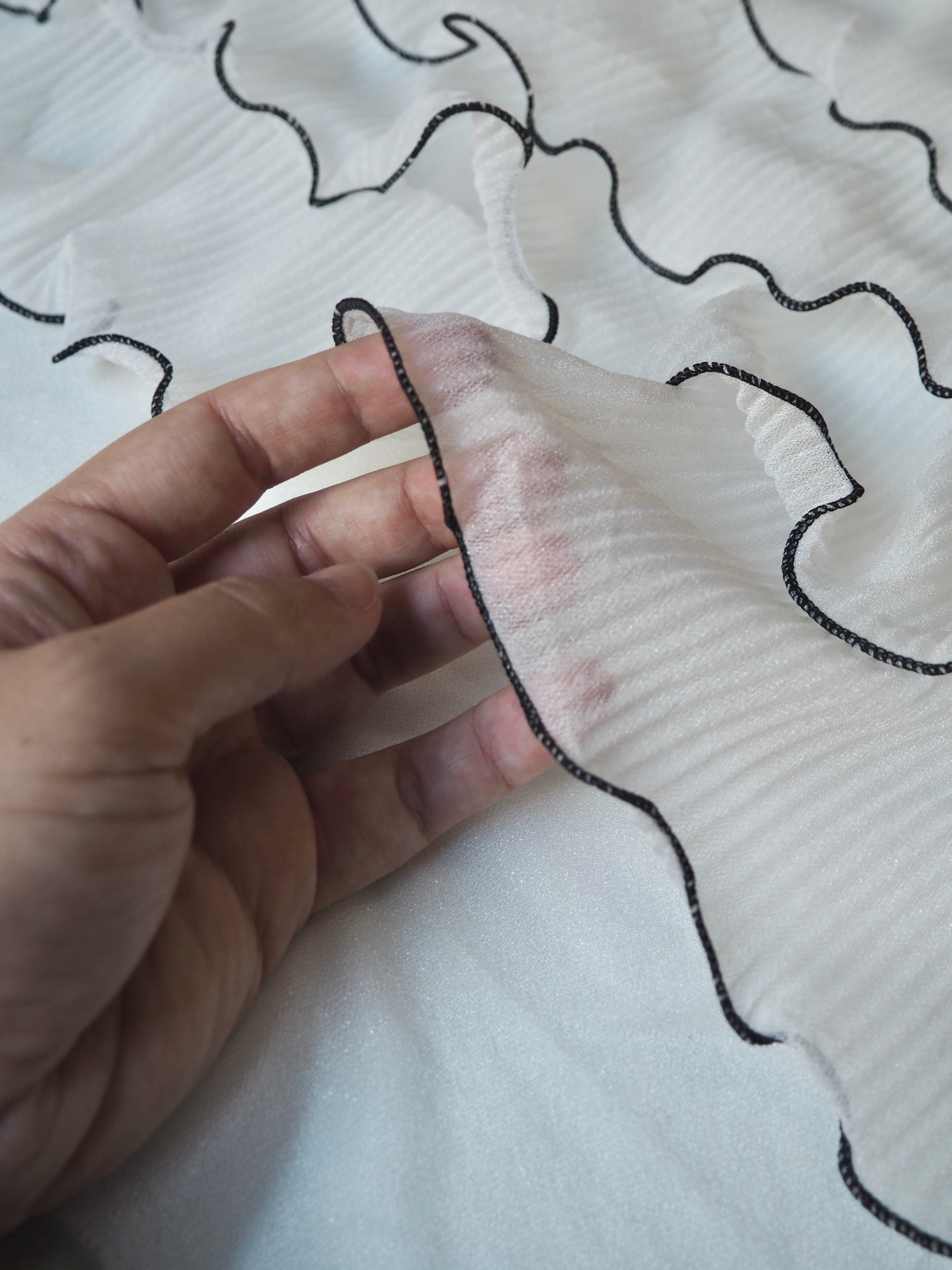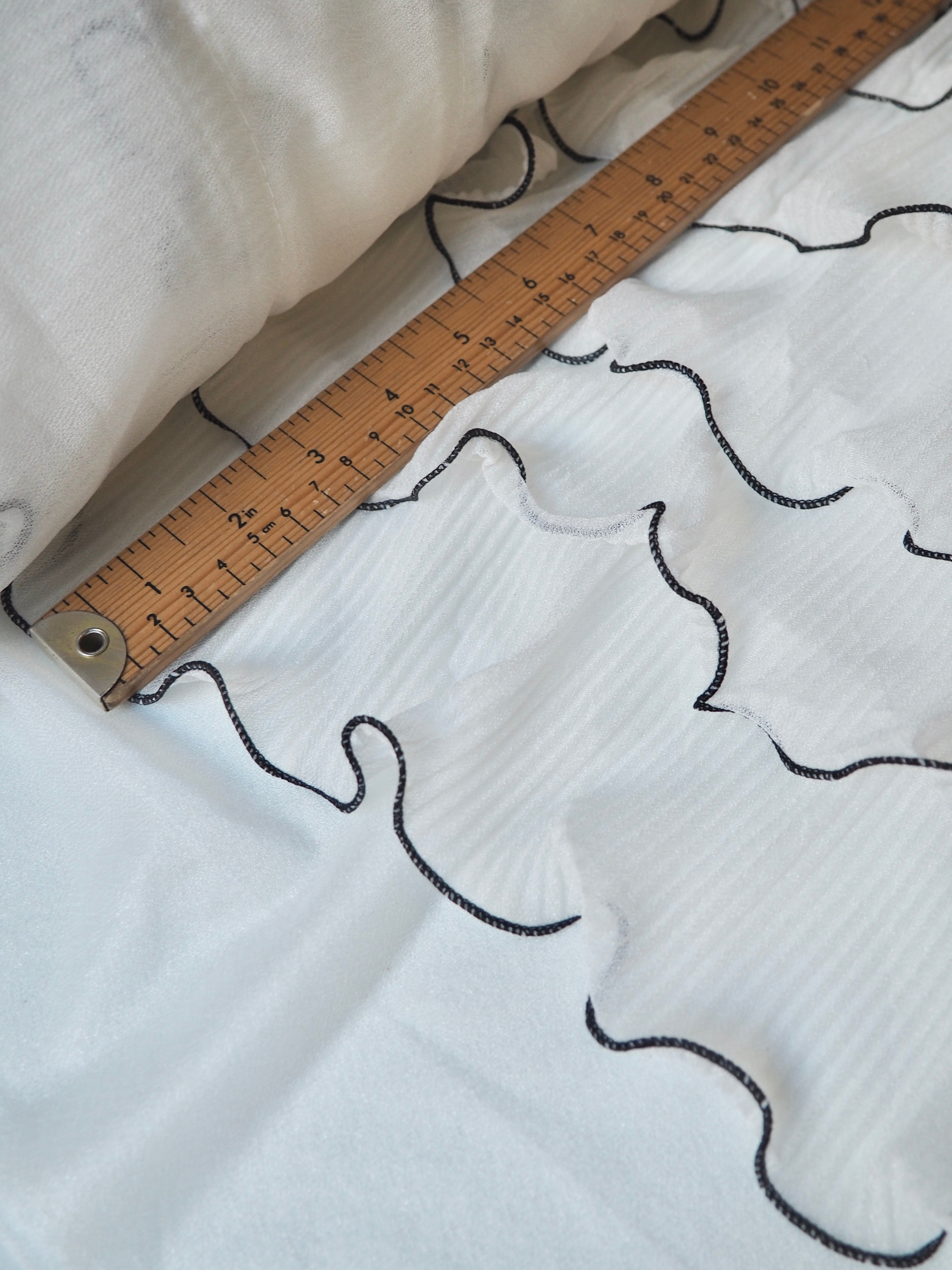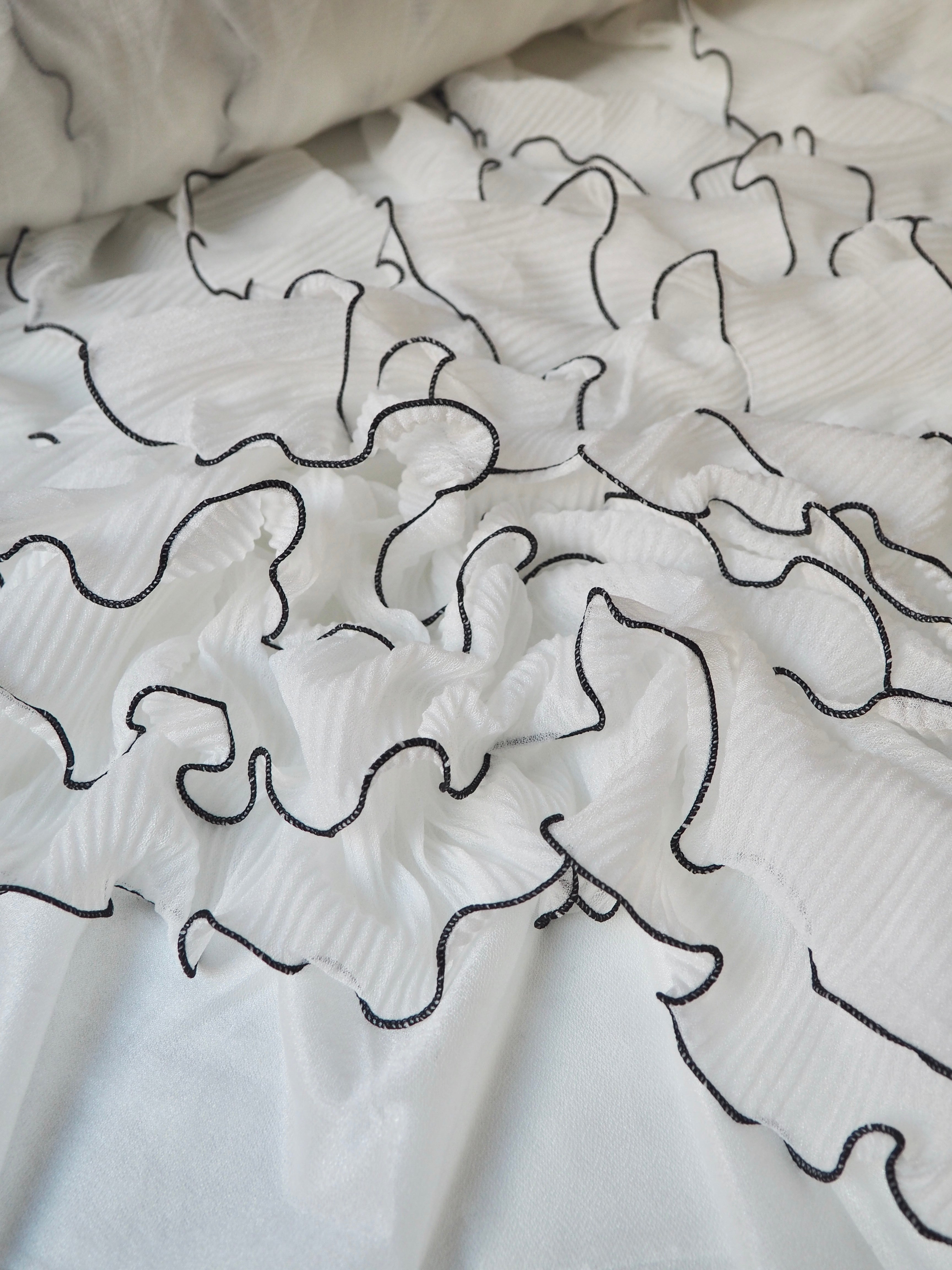 This ex-designer fabric is a plissé. It's an optic white cloth, with stitched on tiered ruffles hemmed with black thread. The ruffles have plissé pleating; small, close together pleats. It's semi-sheer and drapes and moves beautifully. It's a very unique cloth! Light to medium weight, and perfect for flouncy skirts!