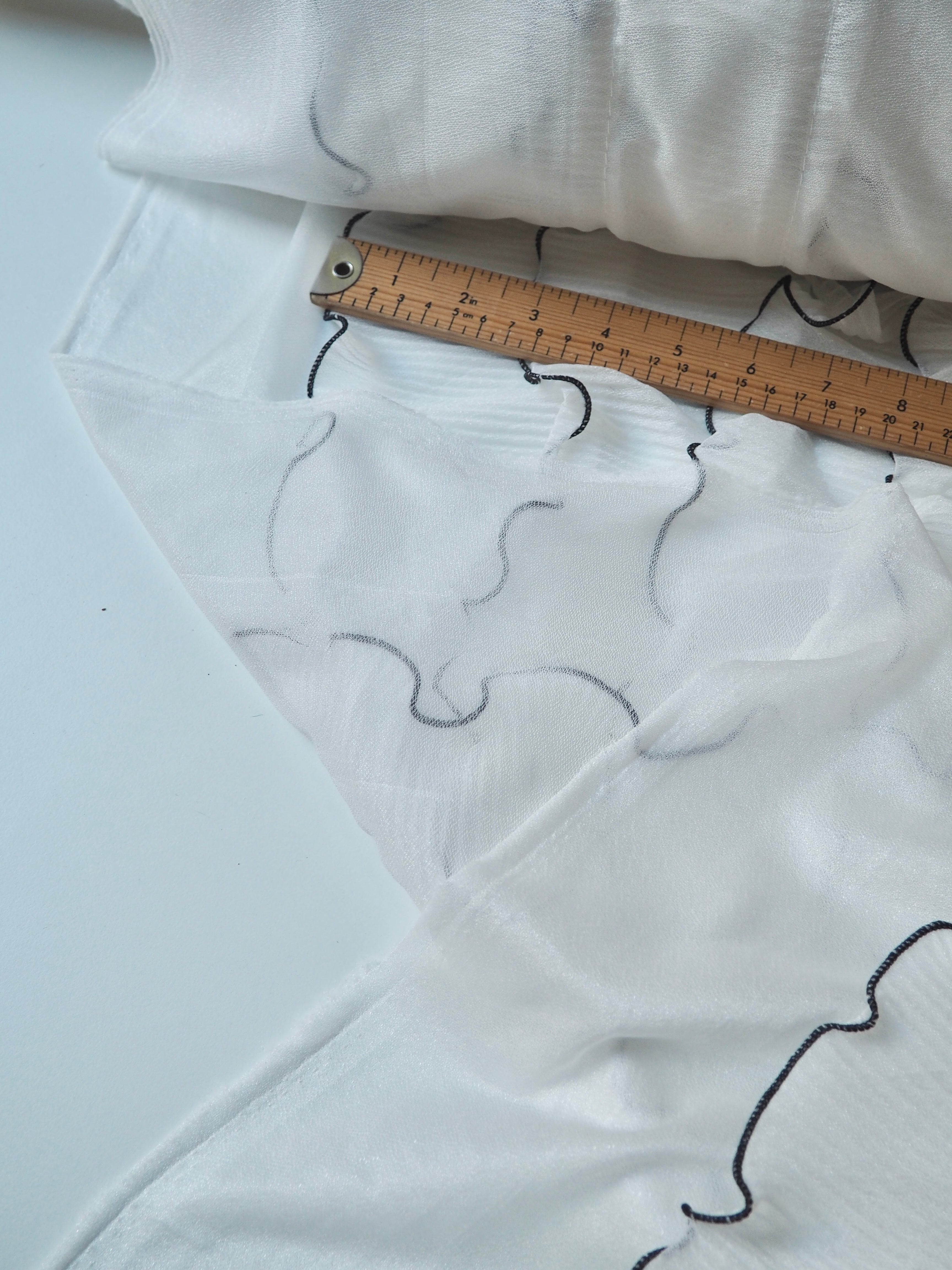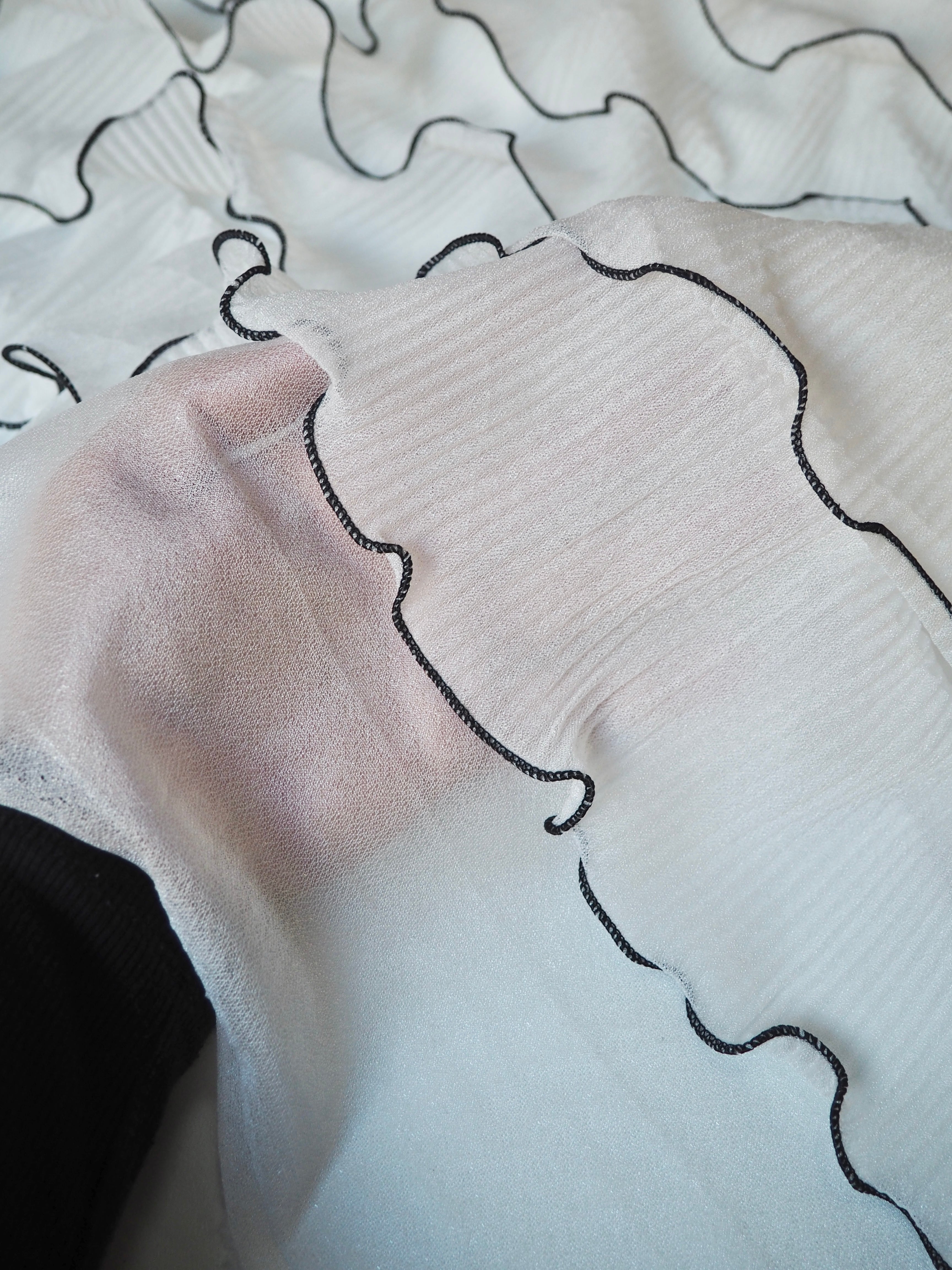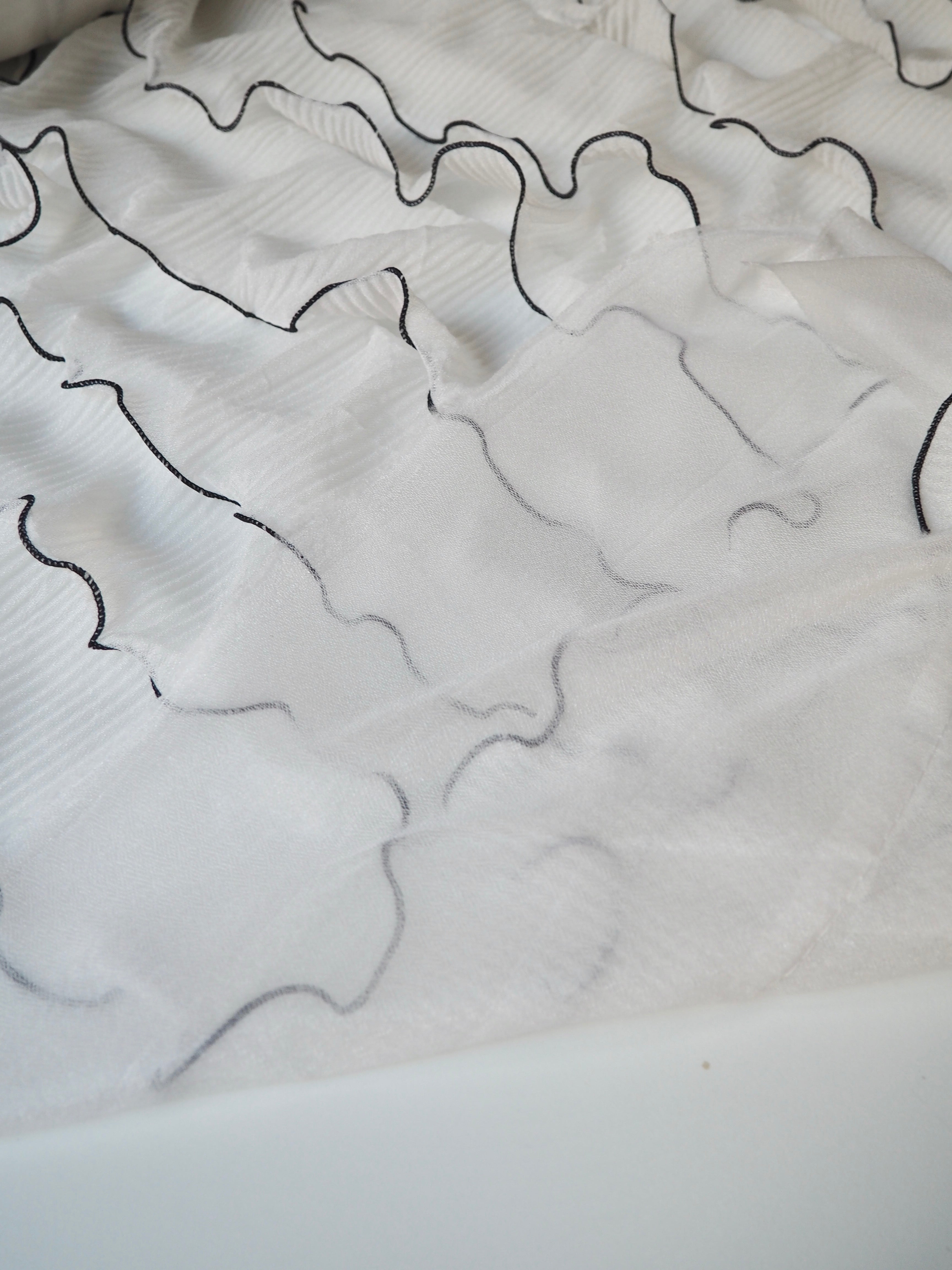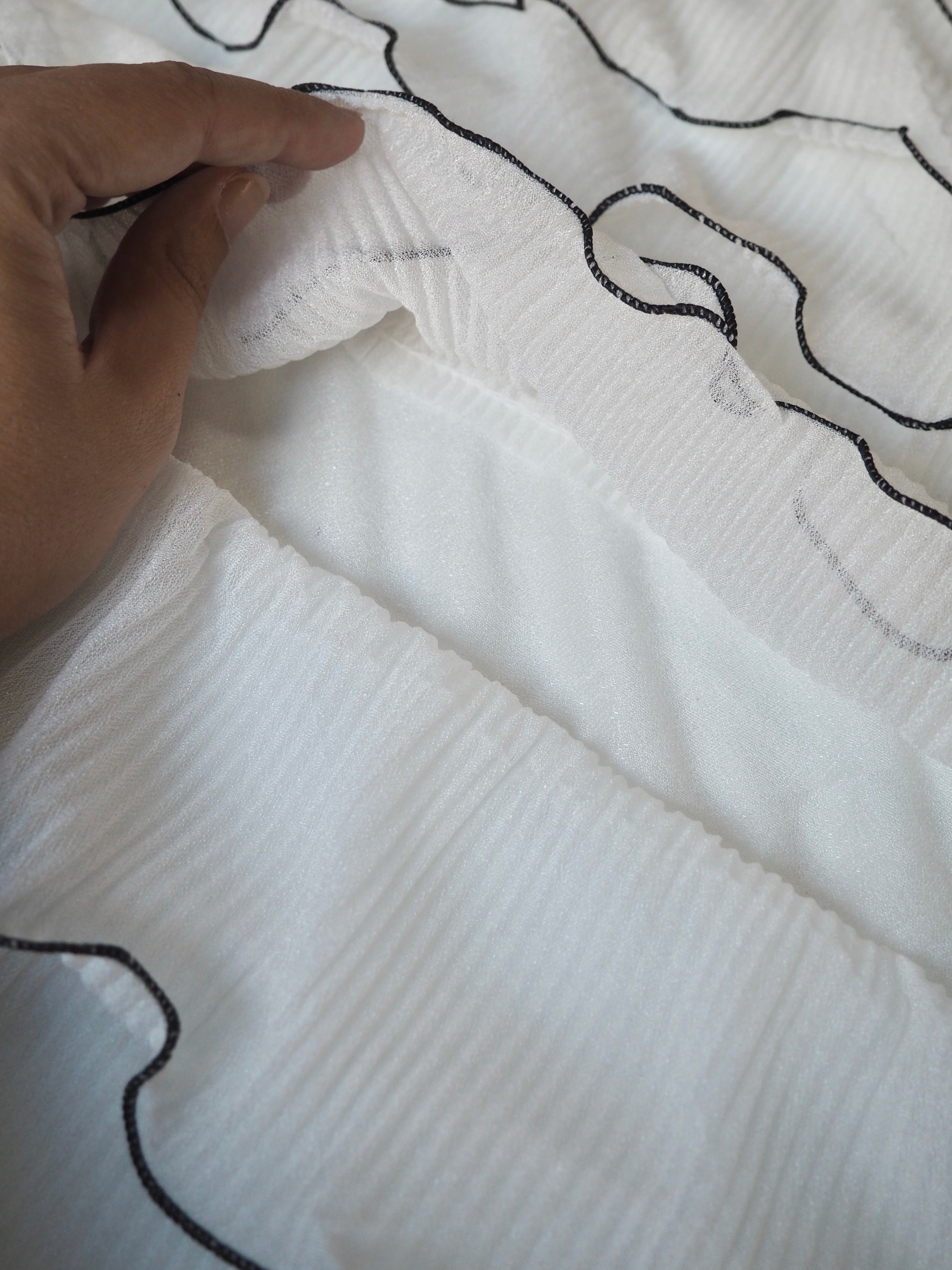 This ex-designer fabric is a plissé. It's an optic white cloth, with stitched on tiered ruffles hemmed with black thread. The ruffles have plissé pleating; small, close together pleats. It's semi-sheer and drapes and moves beautifully. It's a very unique cloth! Light to medium weight, and perfect for flouncy skirts!