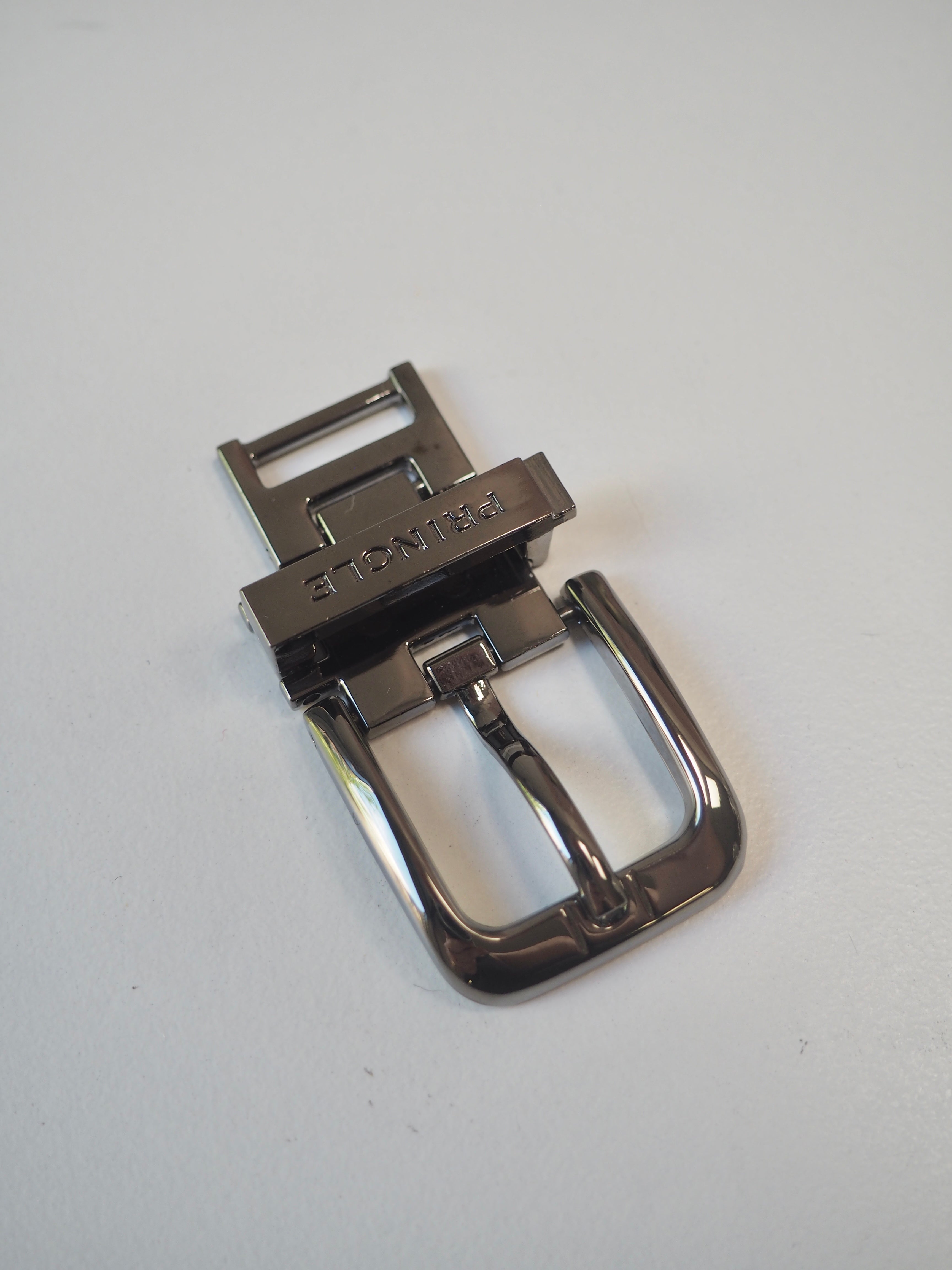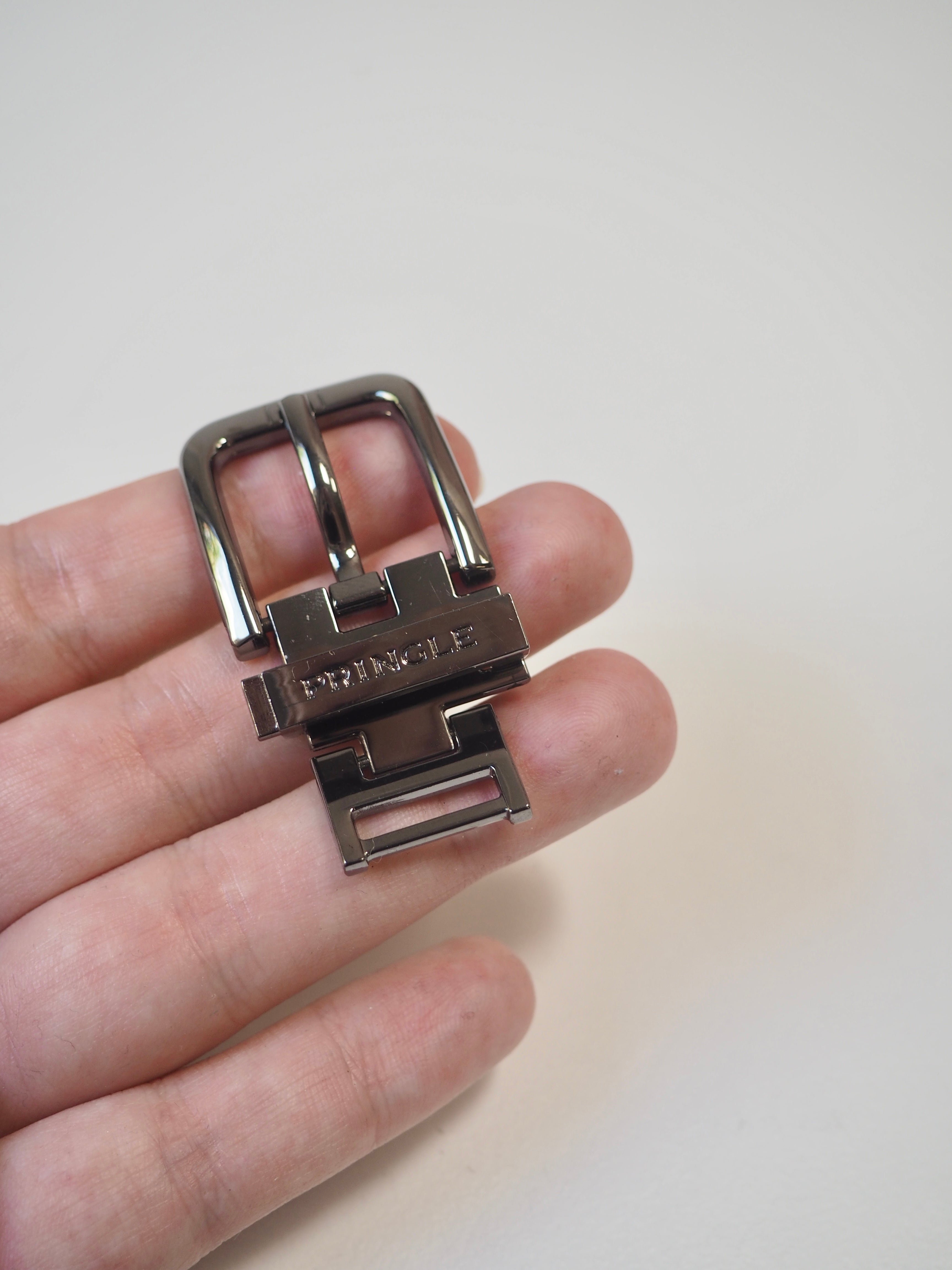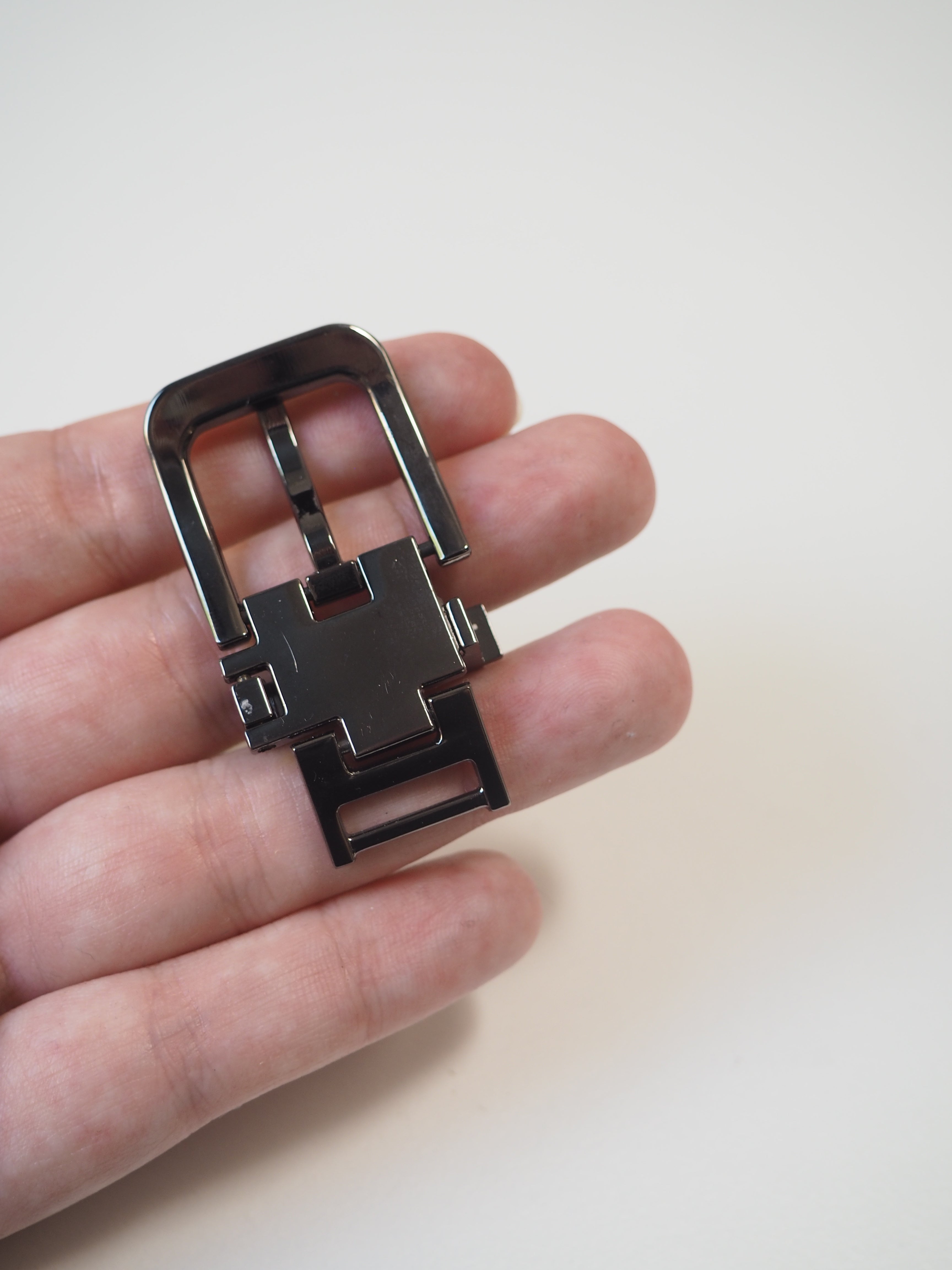 This ex-designer trim is a gunmetal buckle. Branded with the designers name. It's designed for use as a belt buckle, but could be used for bags, garments, and other accessories. Solid metal and sturdy. Shiny and medium weight.