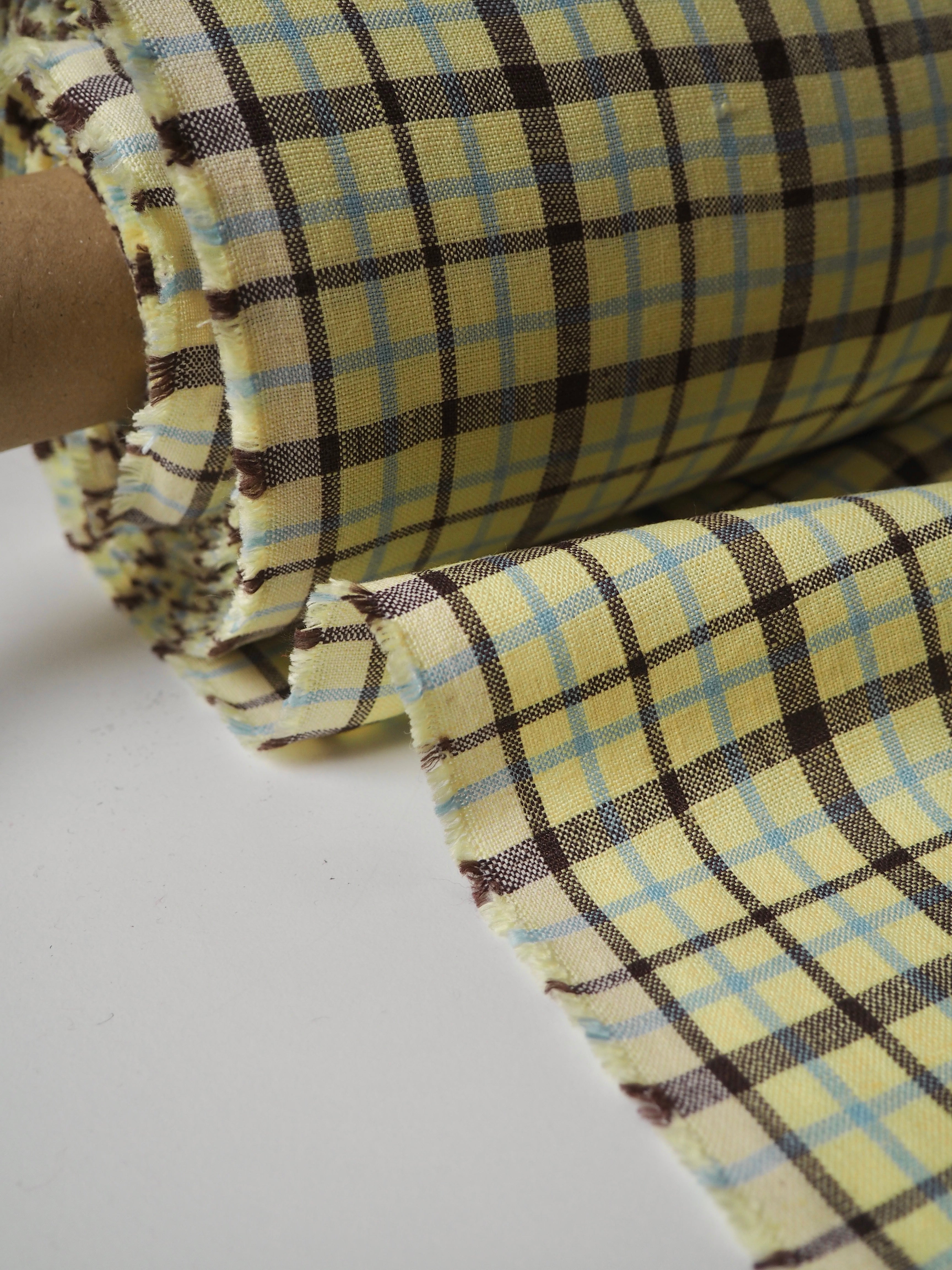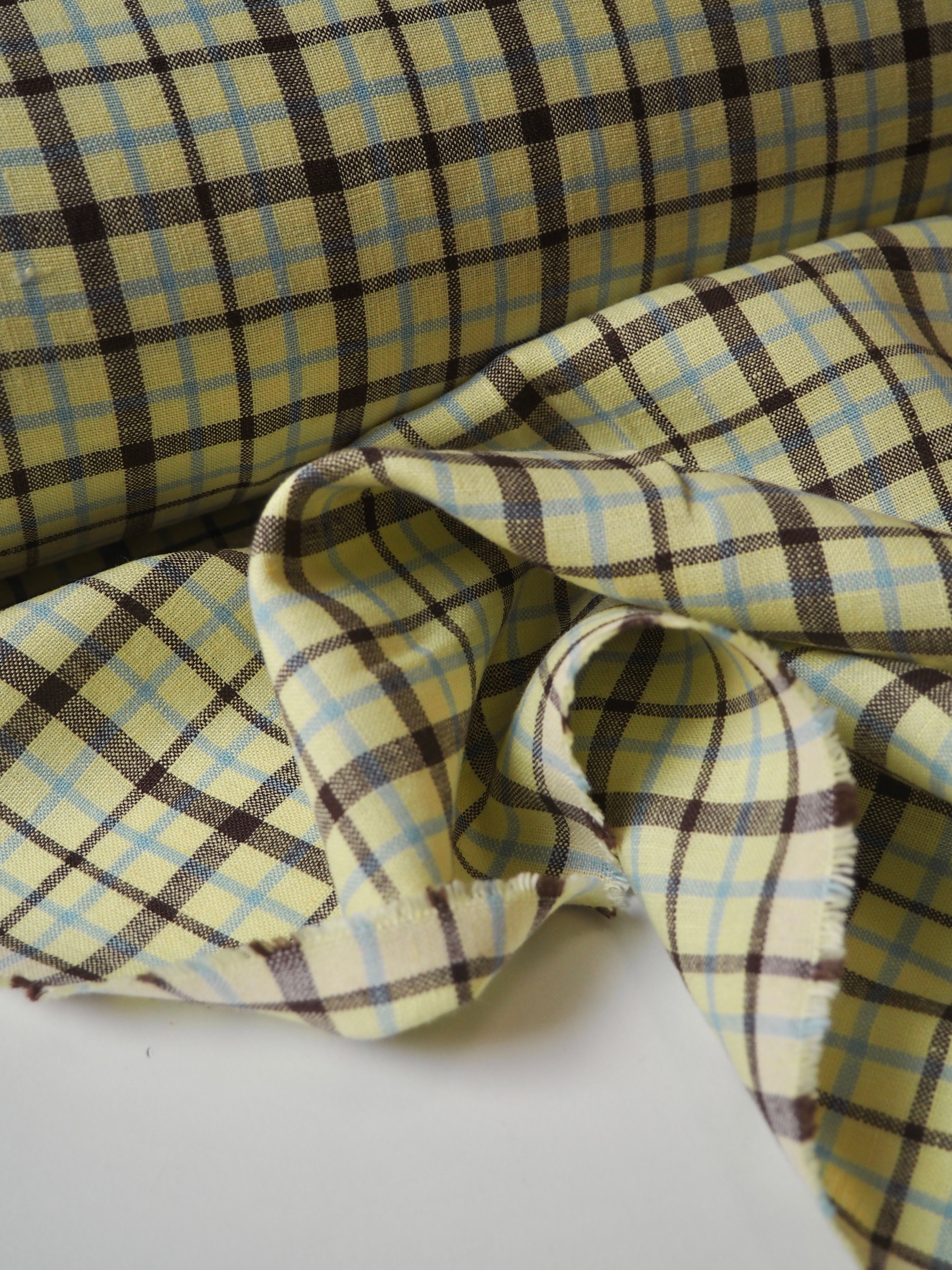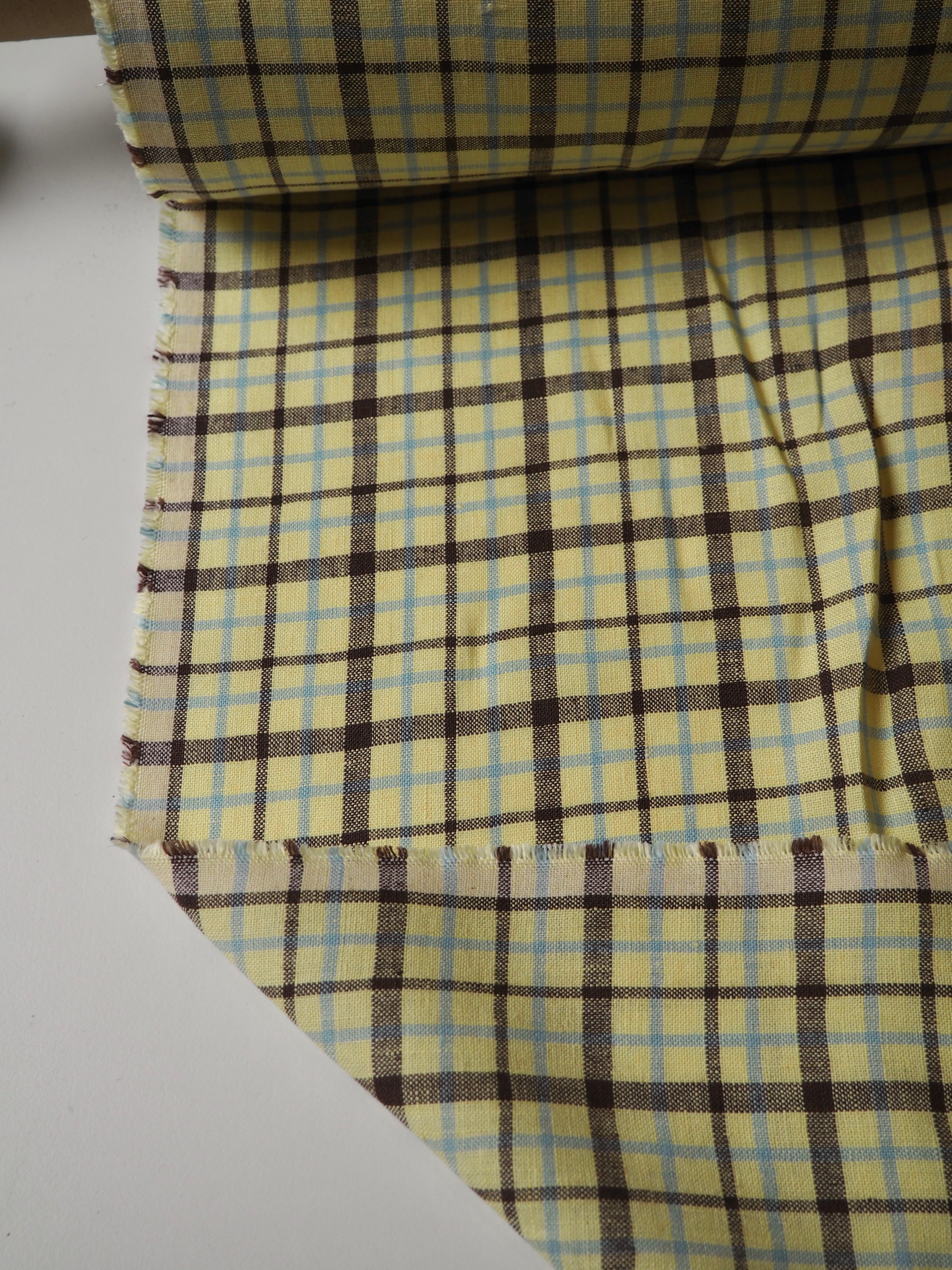 This ex-designer fabric is a lovely linen. It's a light, buttery yellow, light blue, and brown colourway, in a check. It has a soft and gentle linen weave with a typical linen texture, and a brilliant handle that's so wearable. Lightweight with a gentle structured drape, and fully opaque. From popular London-based brand Beyond Nine. Lovely for a bias dress of skirt, summer tops or Everyday Trousers!