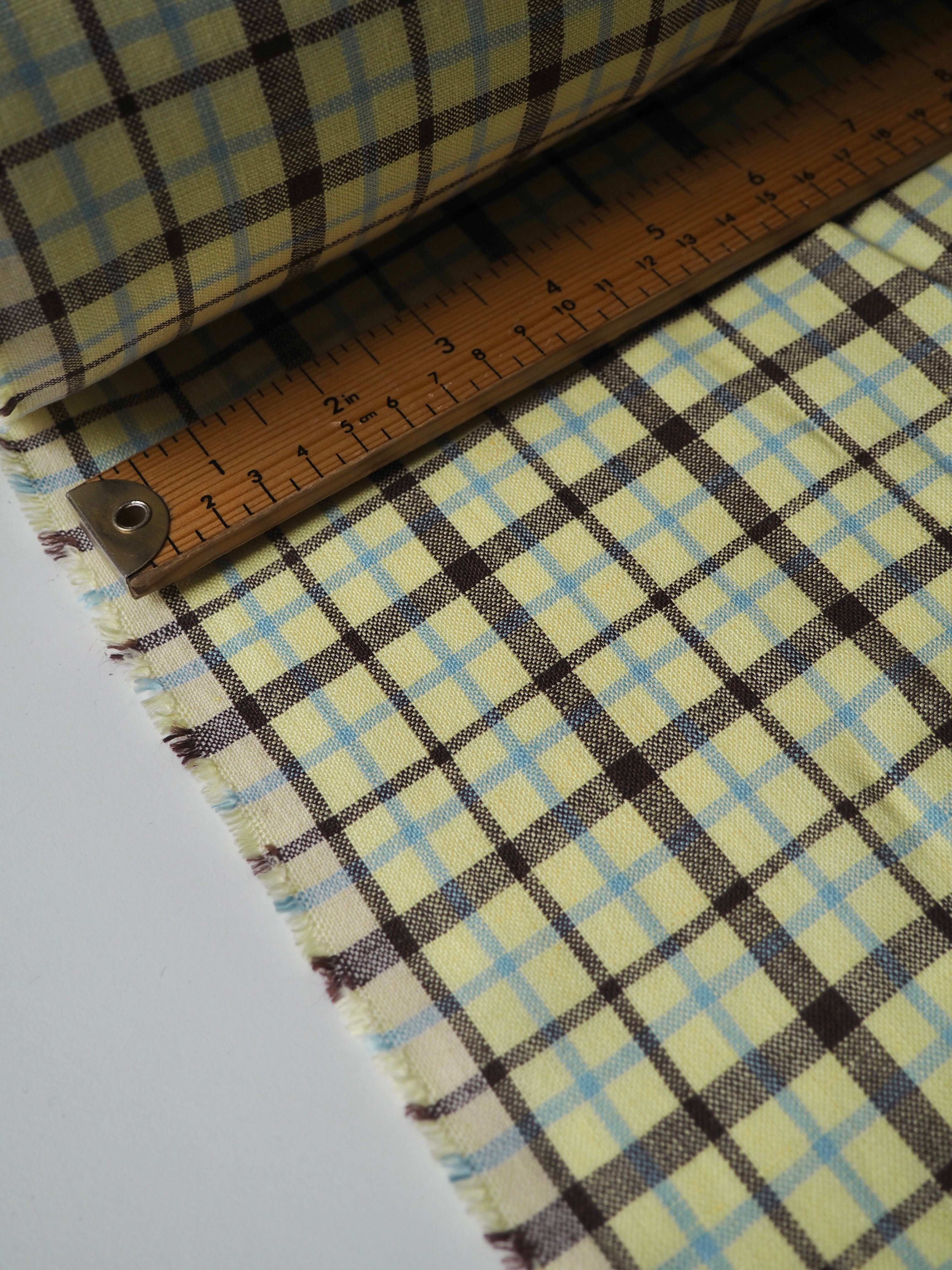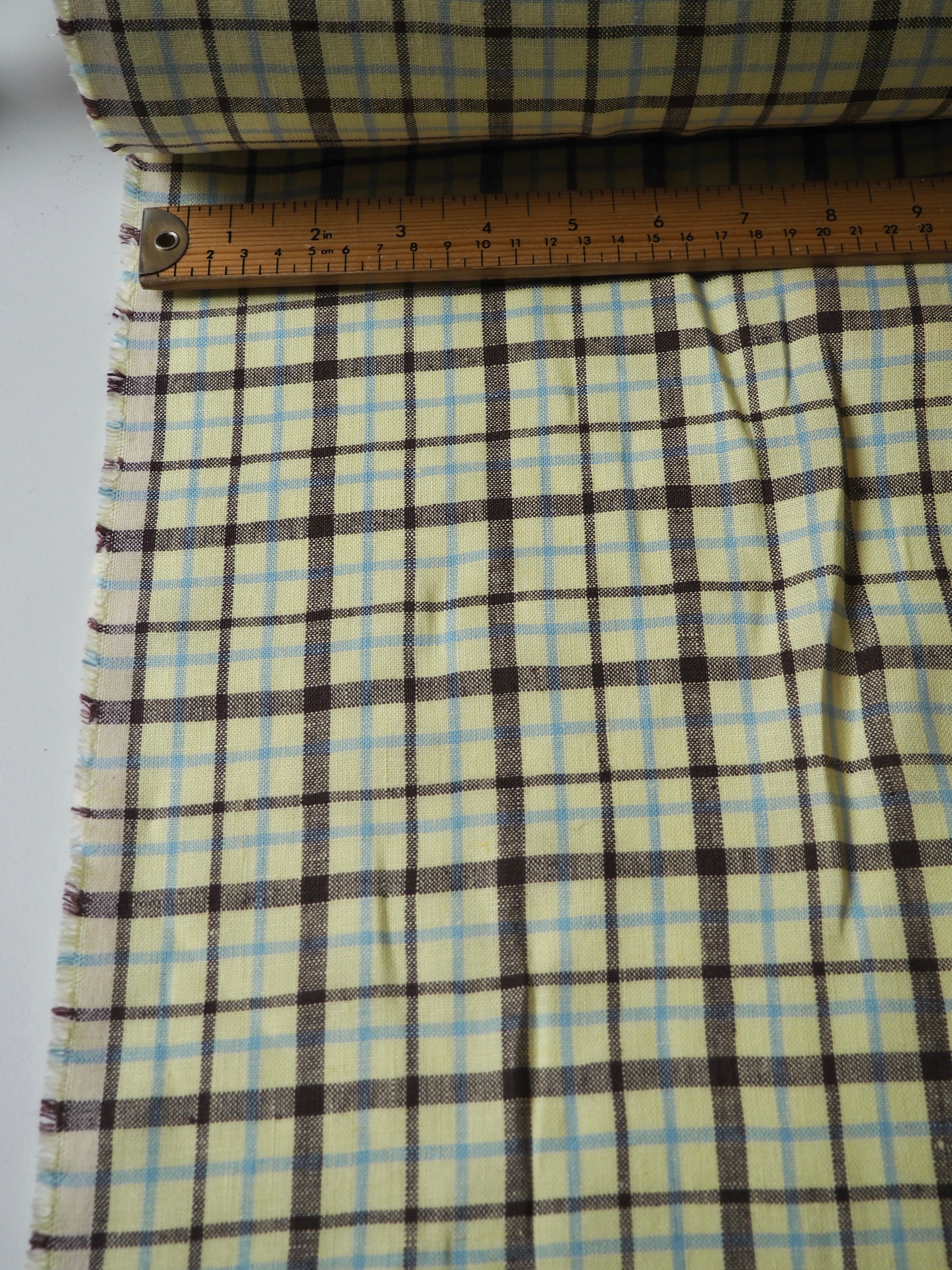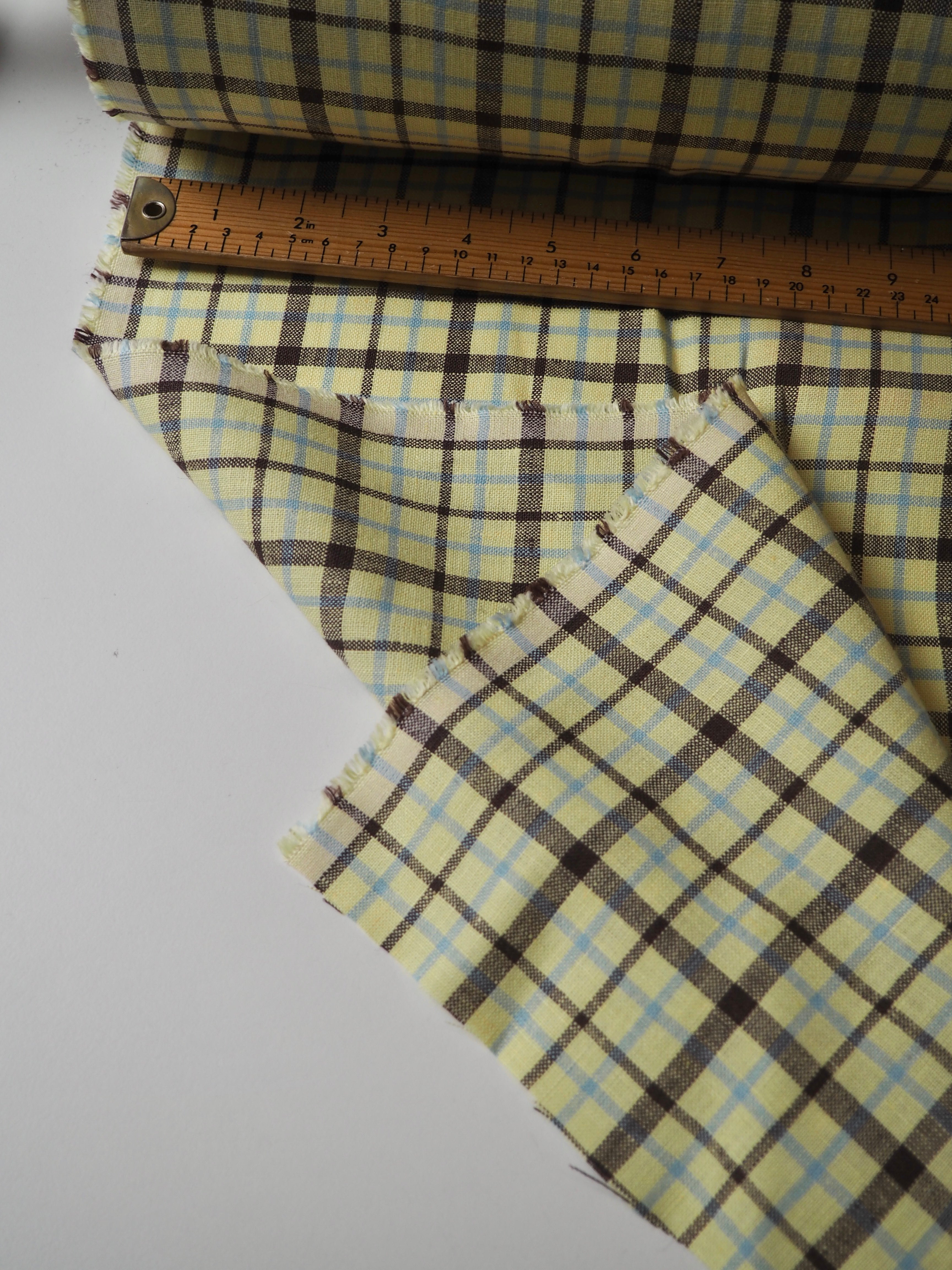 This ex-designer fabric is a lovely linen. It's a light, buttery yellow, light blue, and brown colourway, in a check. It has a soft and gentle linen weave with a typical linen texture, and a brilliant handle that's so wearable. Lightweight with a gentle structured drape, and fully opaque. From popular London-based brand Beyond Nine. Lovely for a bias dress of skirt, summer tops or Everyday Trousers!