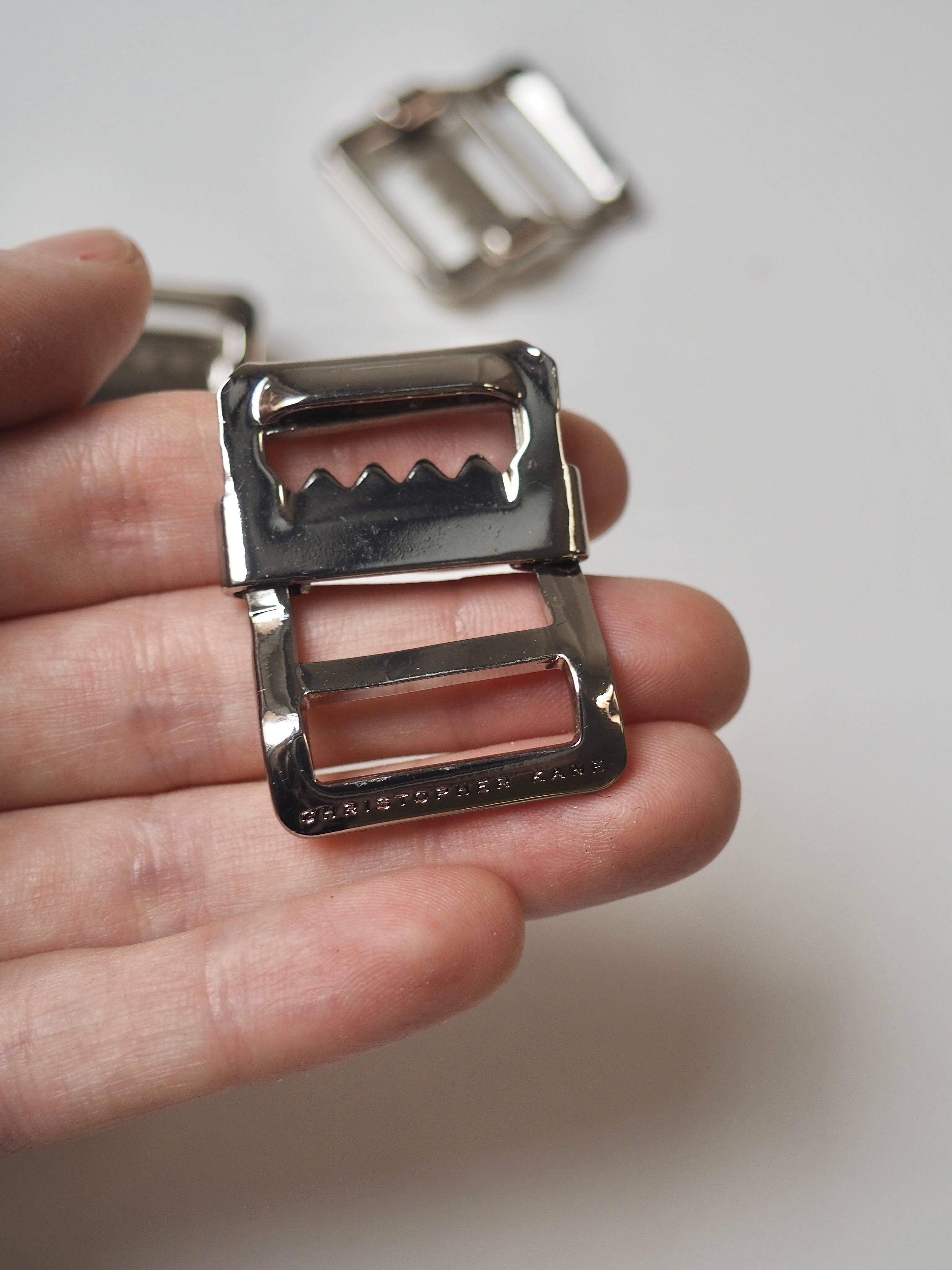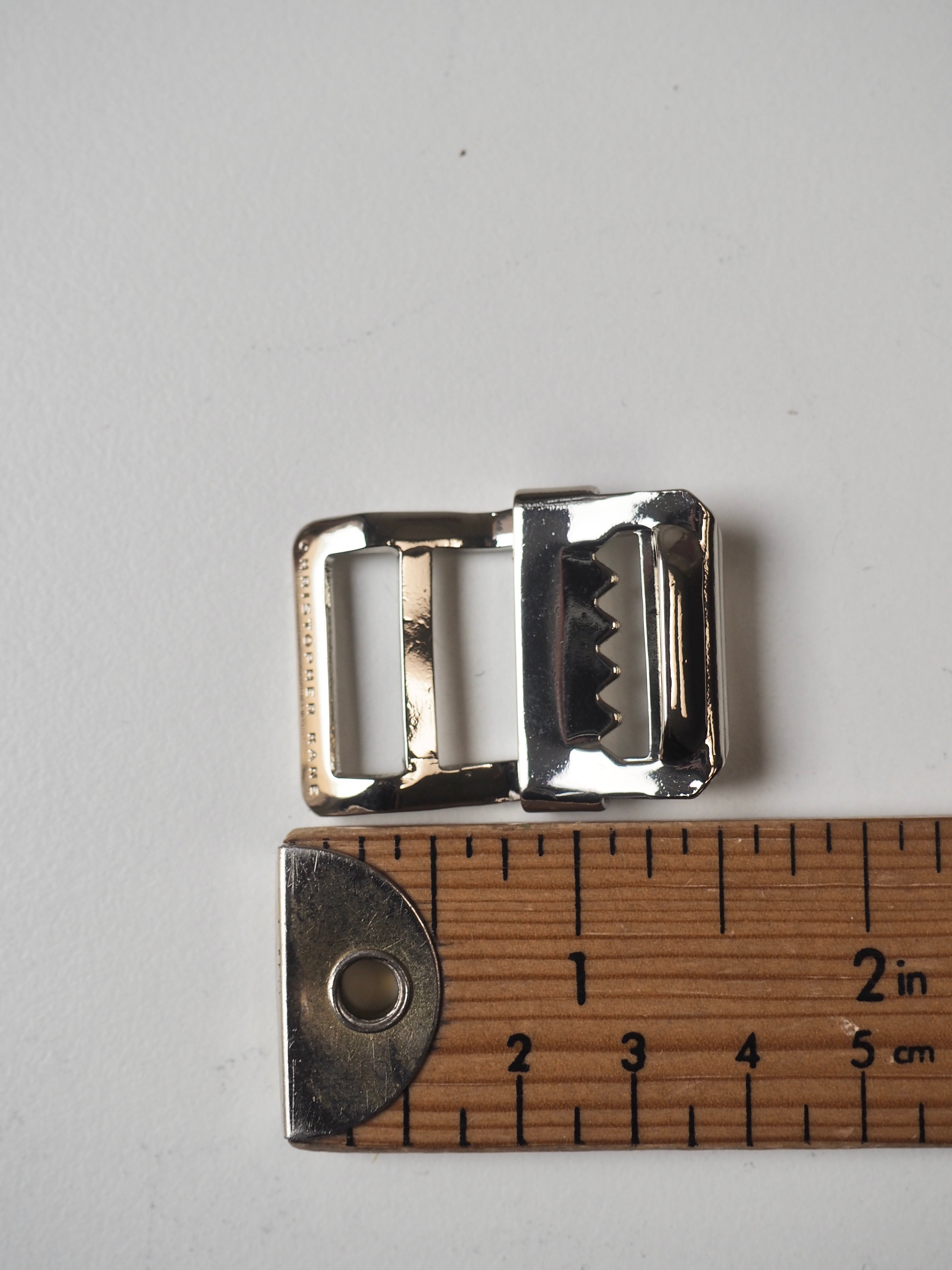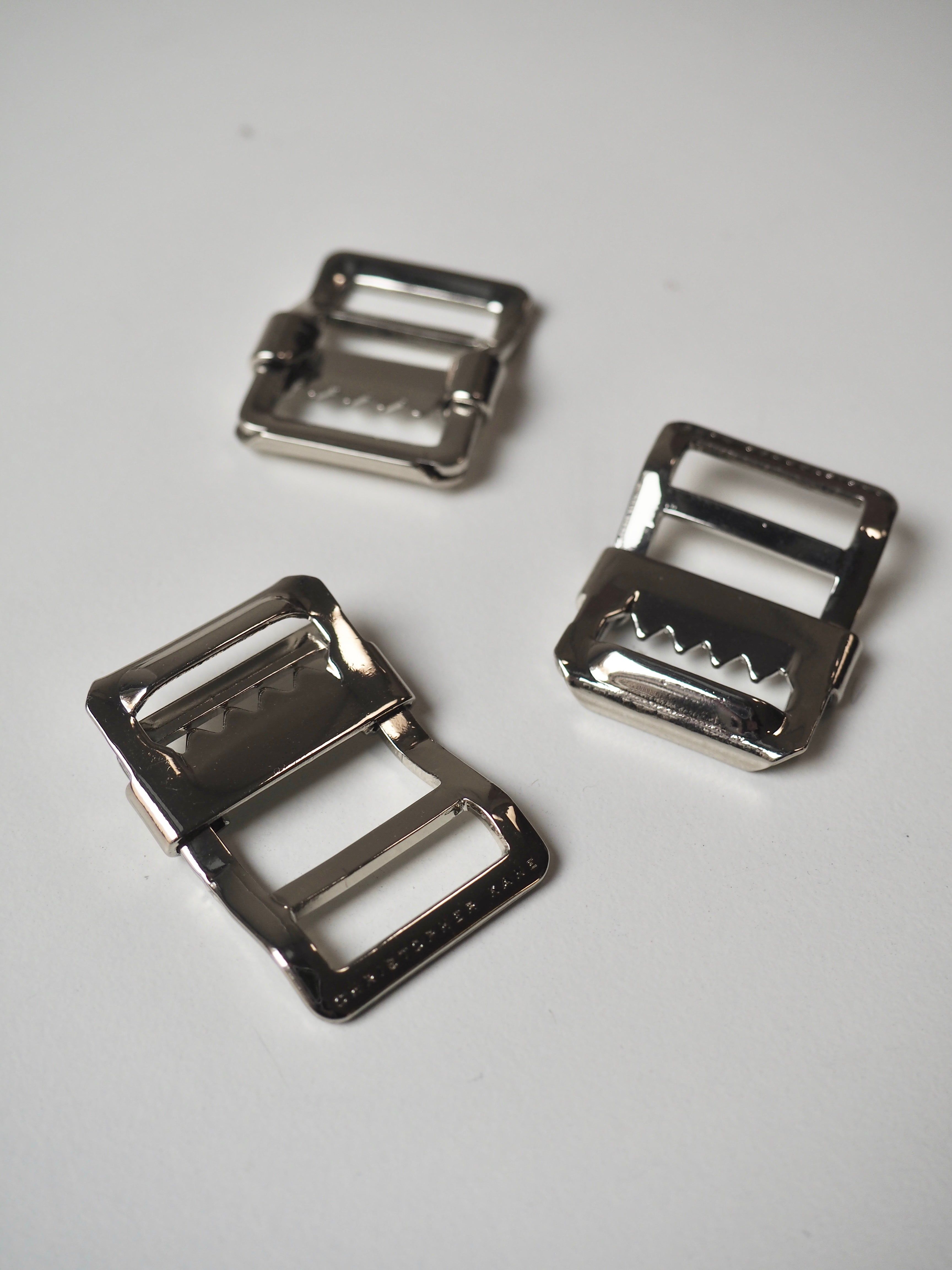 This ex-designer trim is a strap adjuster. It has an angled back and slider with teeth for weight and grip on a bag strap. One edge is engraved with a brand name and it has a shiny finish. Great for bag making and garment accessorizing!