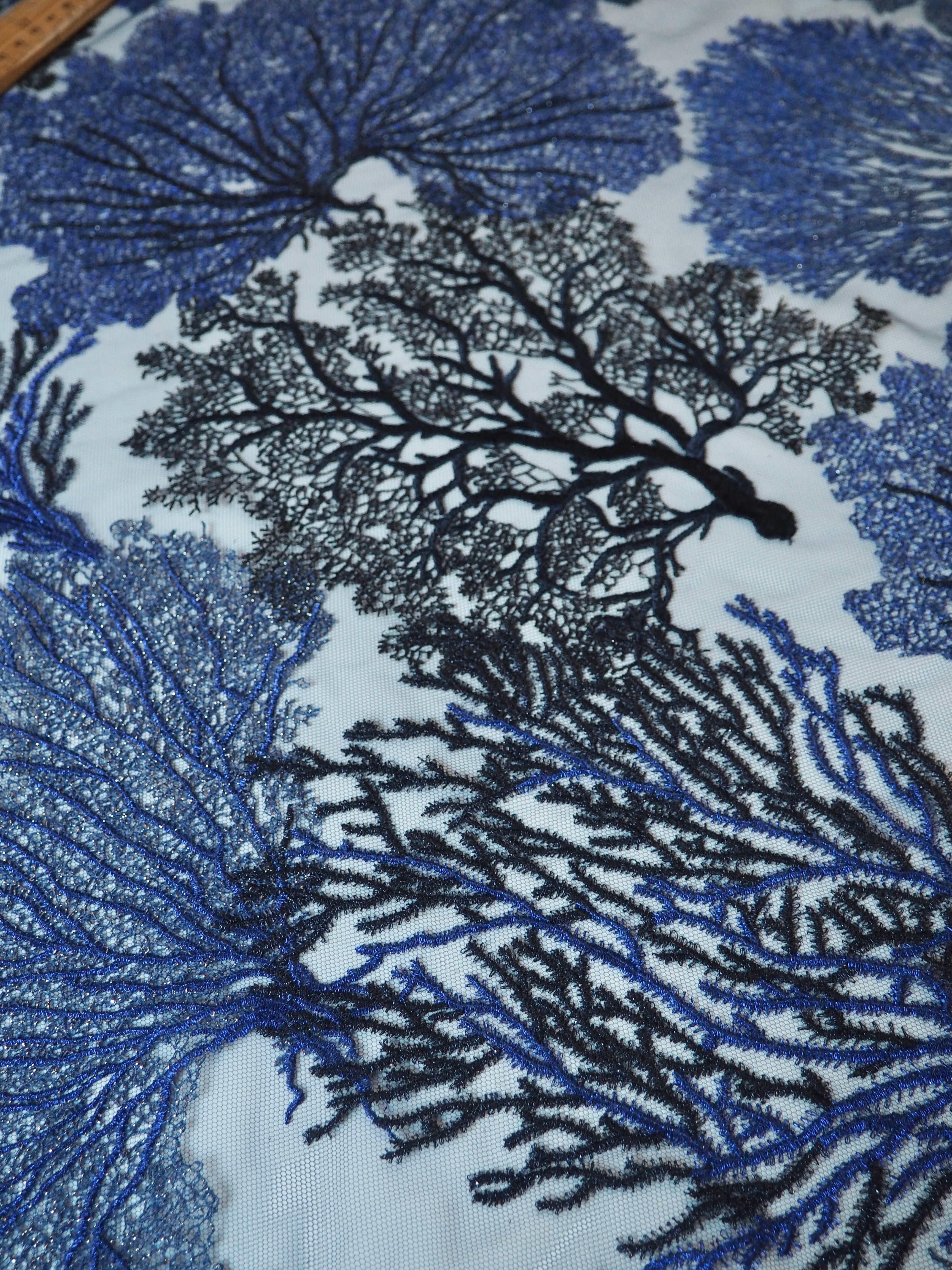 This ex-designer fabric is a gorgeous tulle. Rich purple and blue coral reef designs are embroidered into this midnight blue tulle in medium coverage. Has a soft handle, lovely movement, and a romantic swishy feel. Lightweight and semi-sheer. The cloth could be cut out and reapplied, or be used as is for lingerie, evening wear, or an exquisite dress or top!