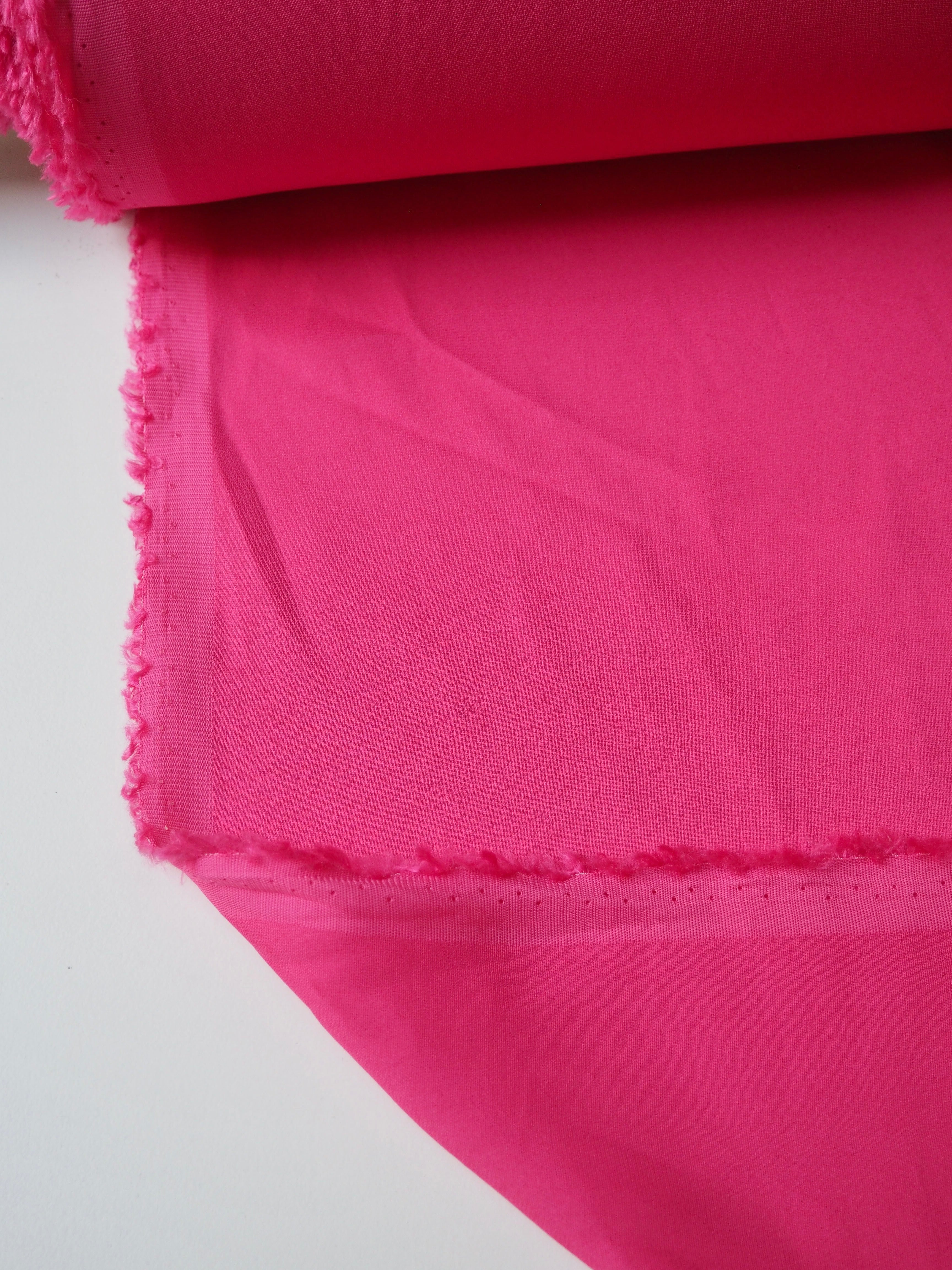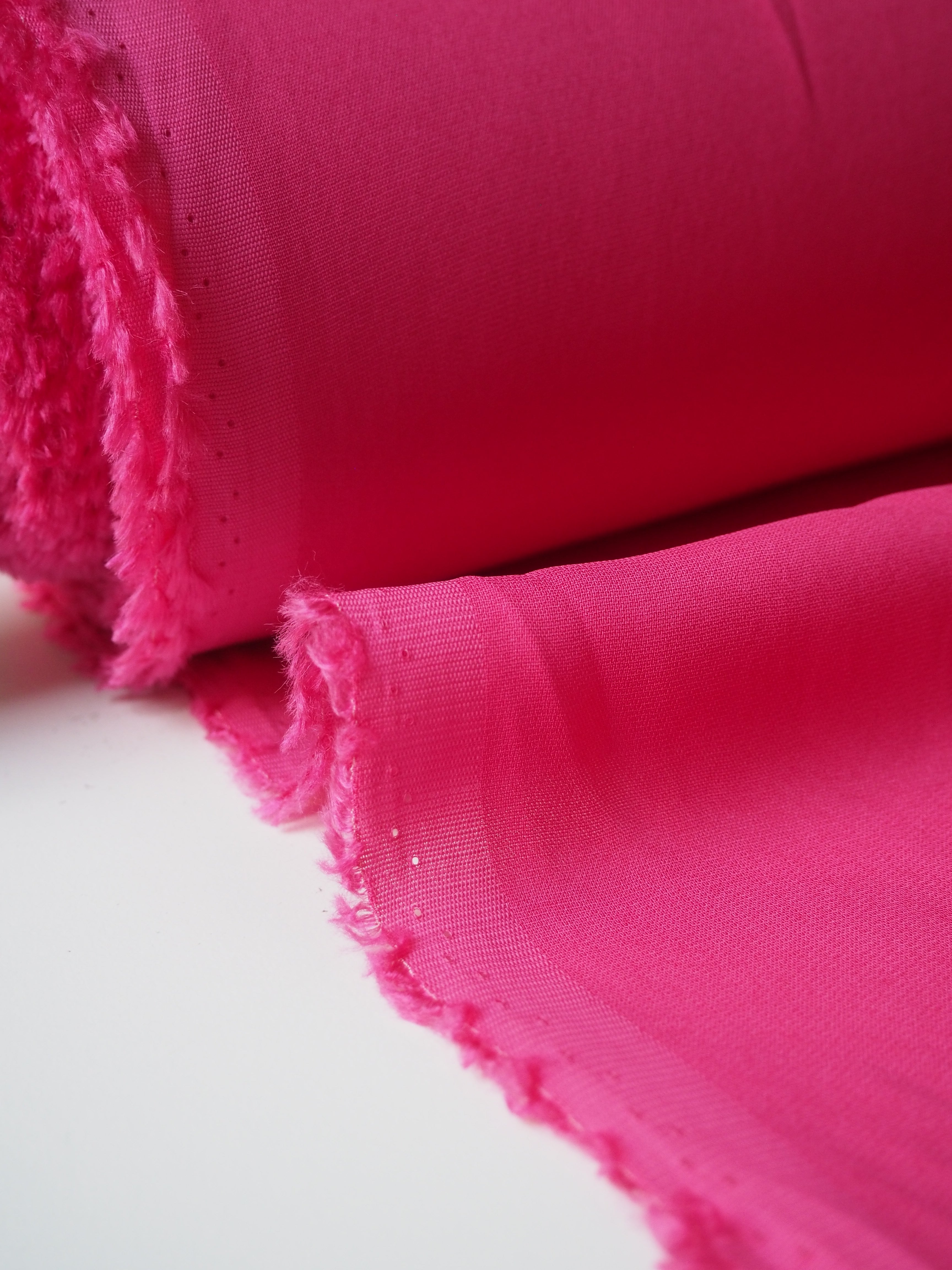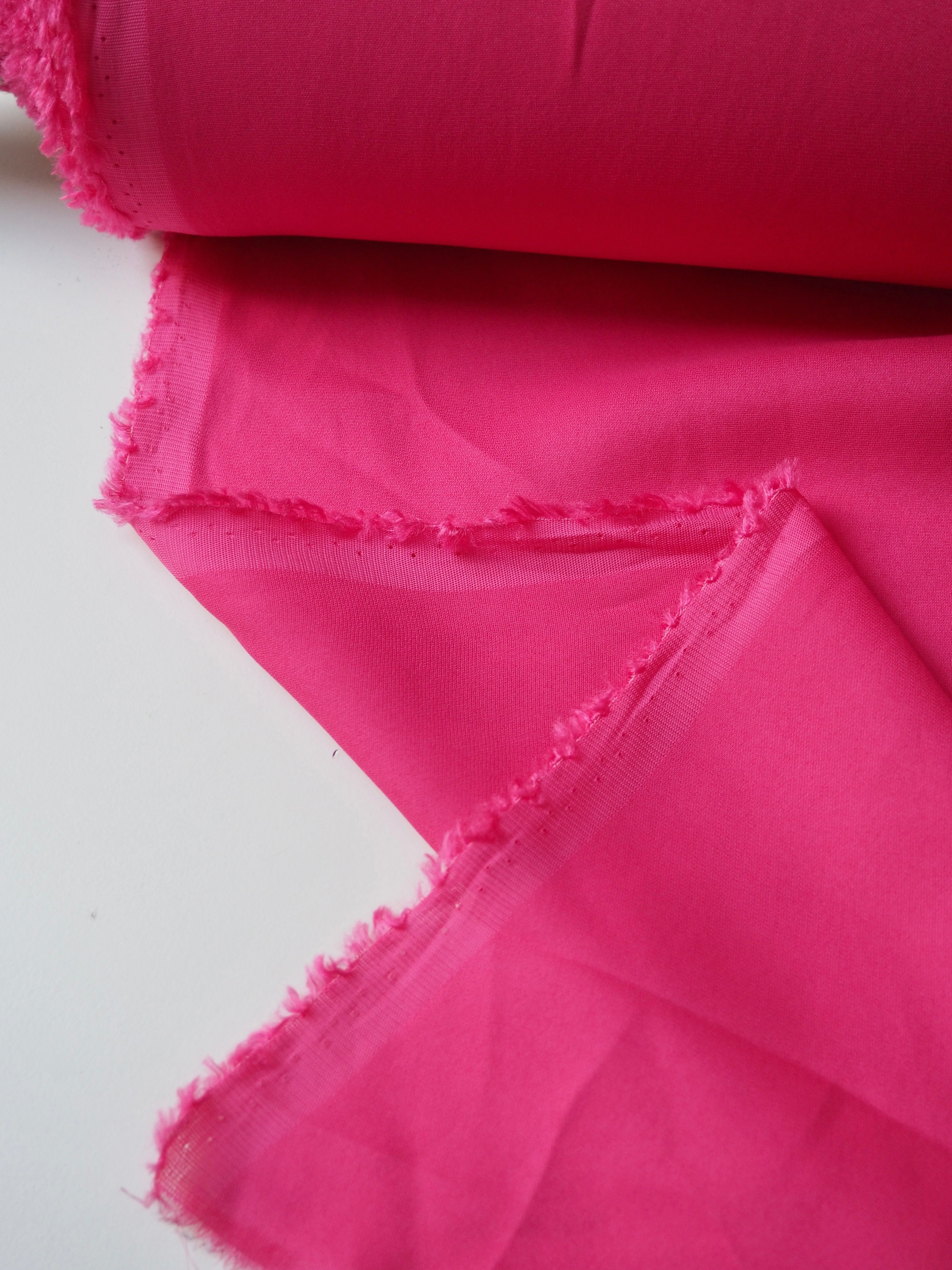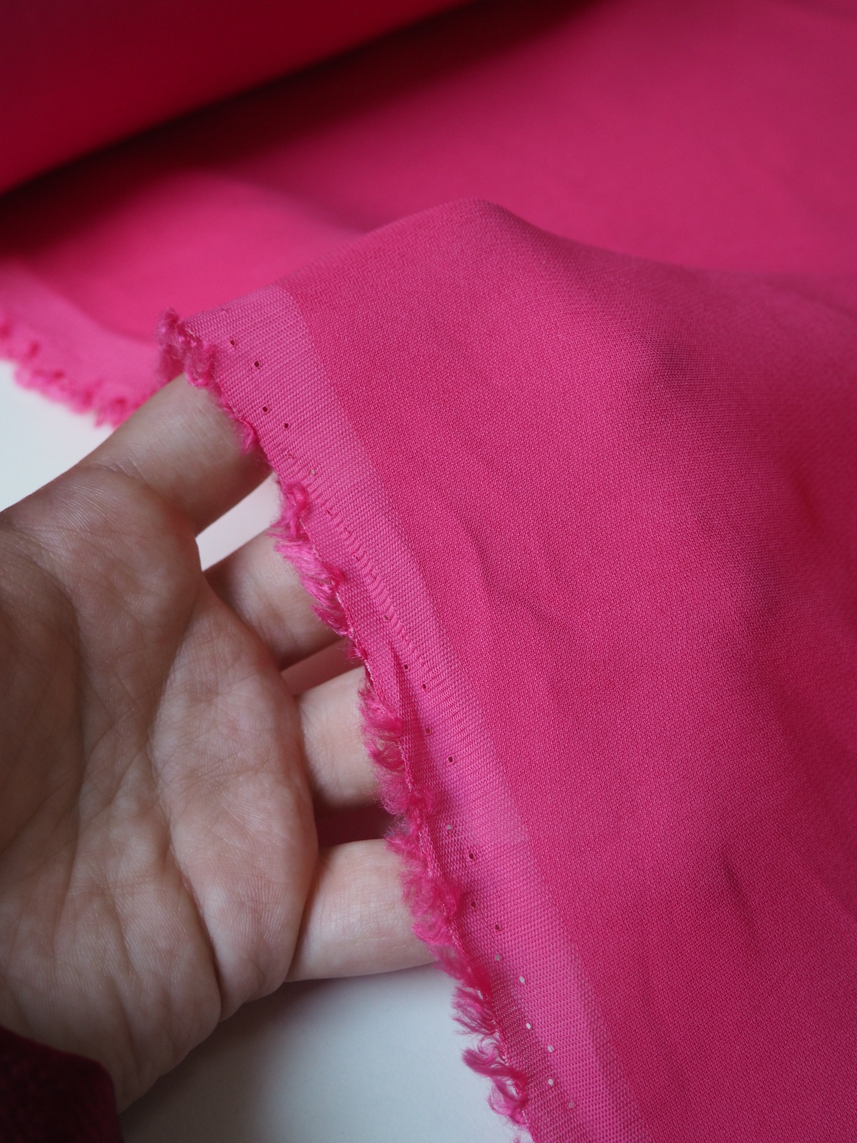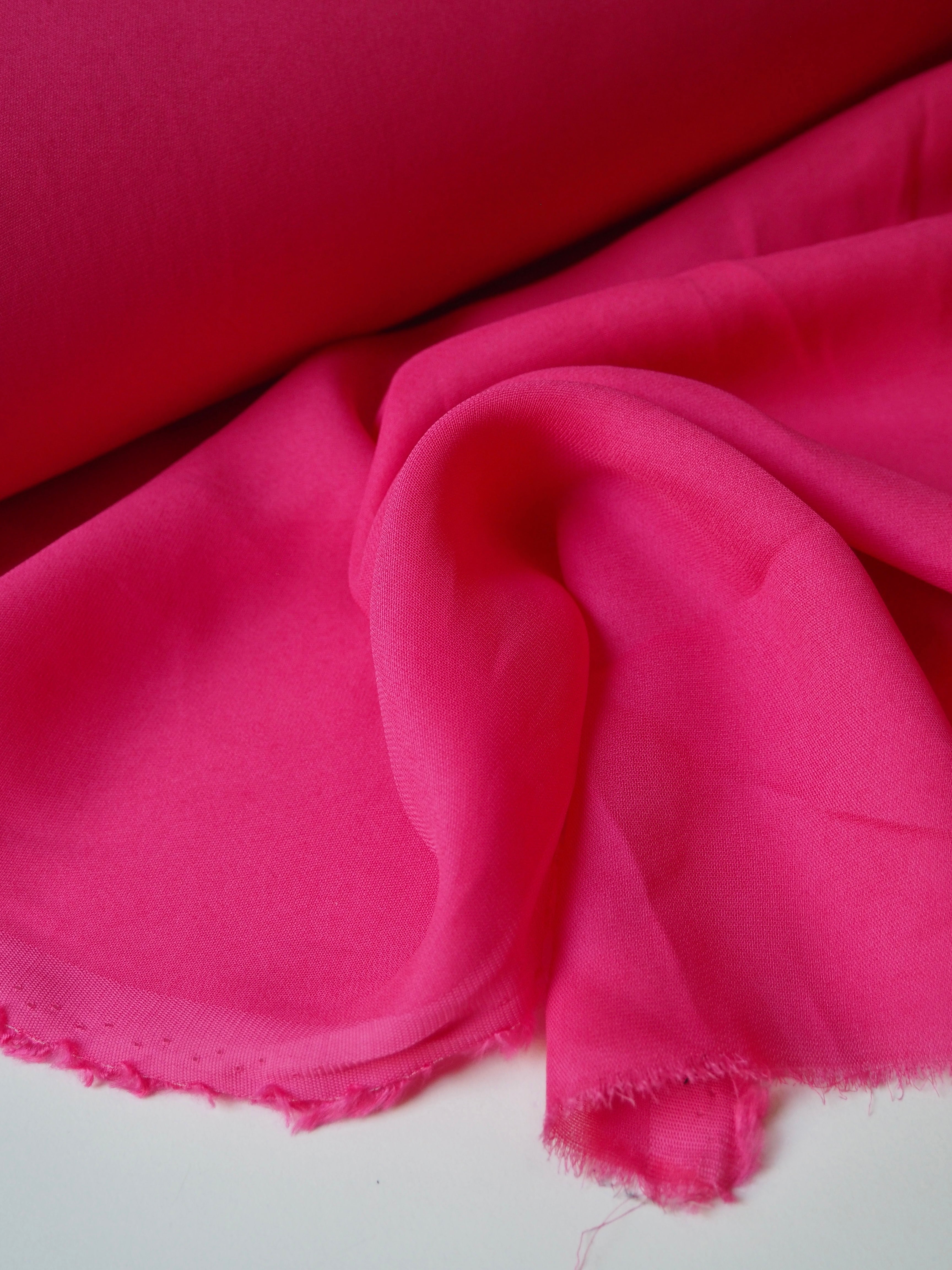 This ex-designer fabric is a crepe. It's in a hot pink colour. It has a light weight and such a lovely drape, and incredible movement. Opaque, but lets a little light through due to the lighter weight. Has a smoother crepe handle. Perfect for so many projects, would look lovely in a dress or top!