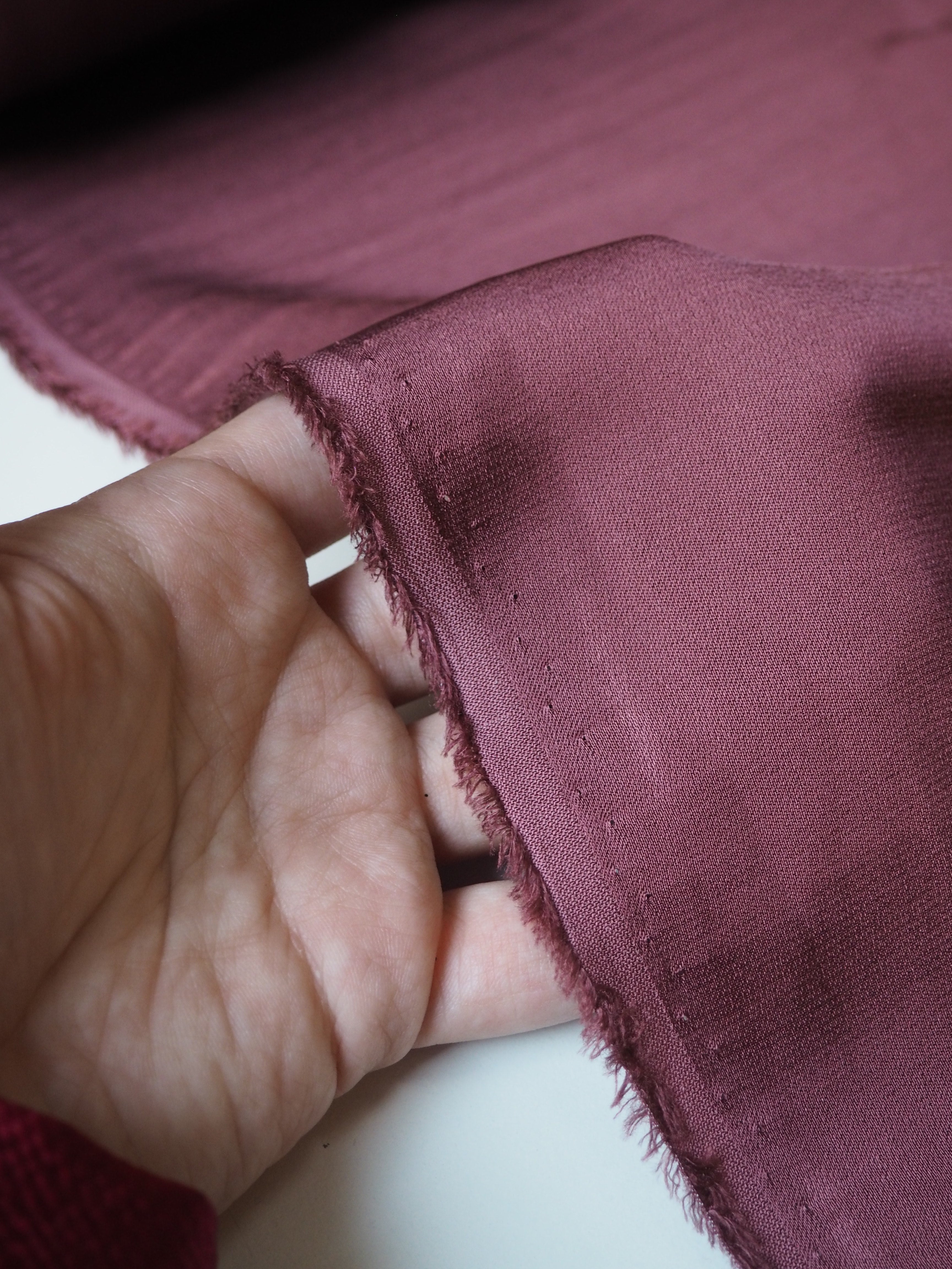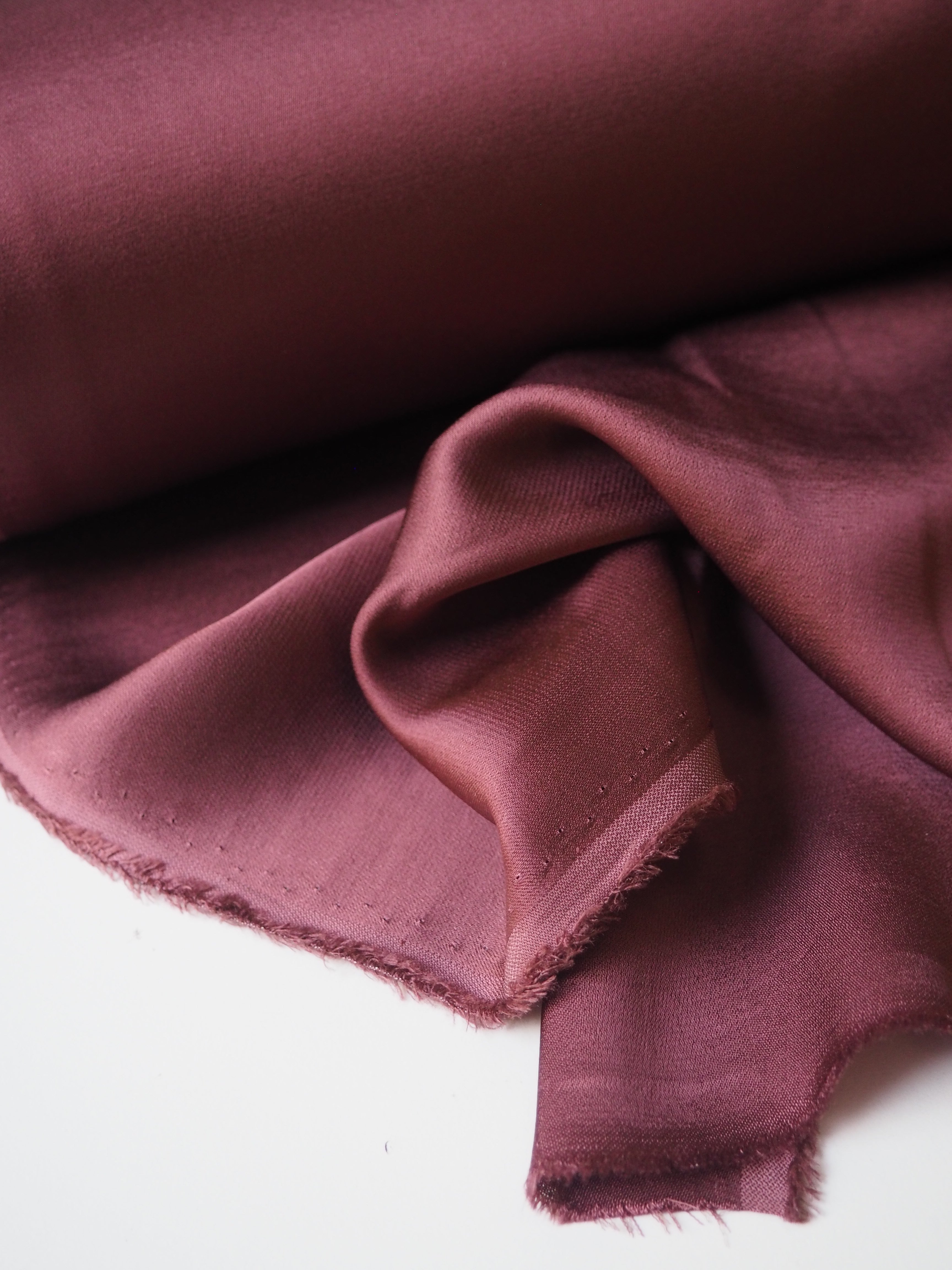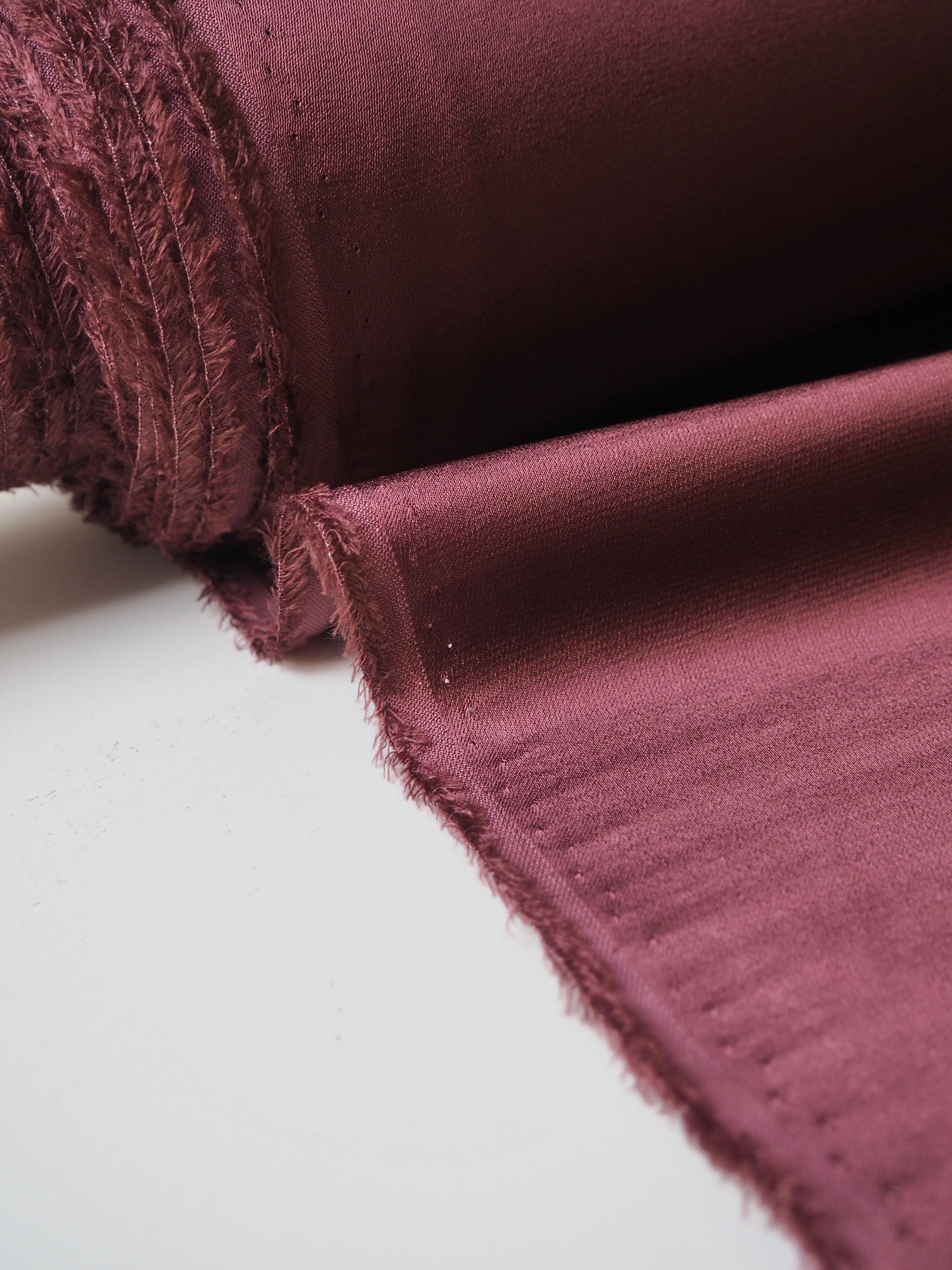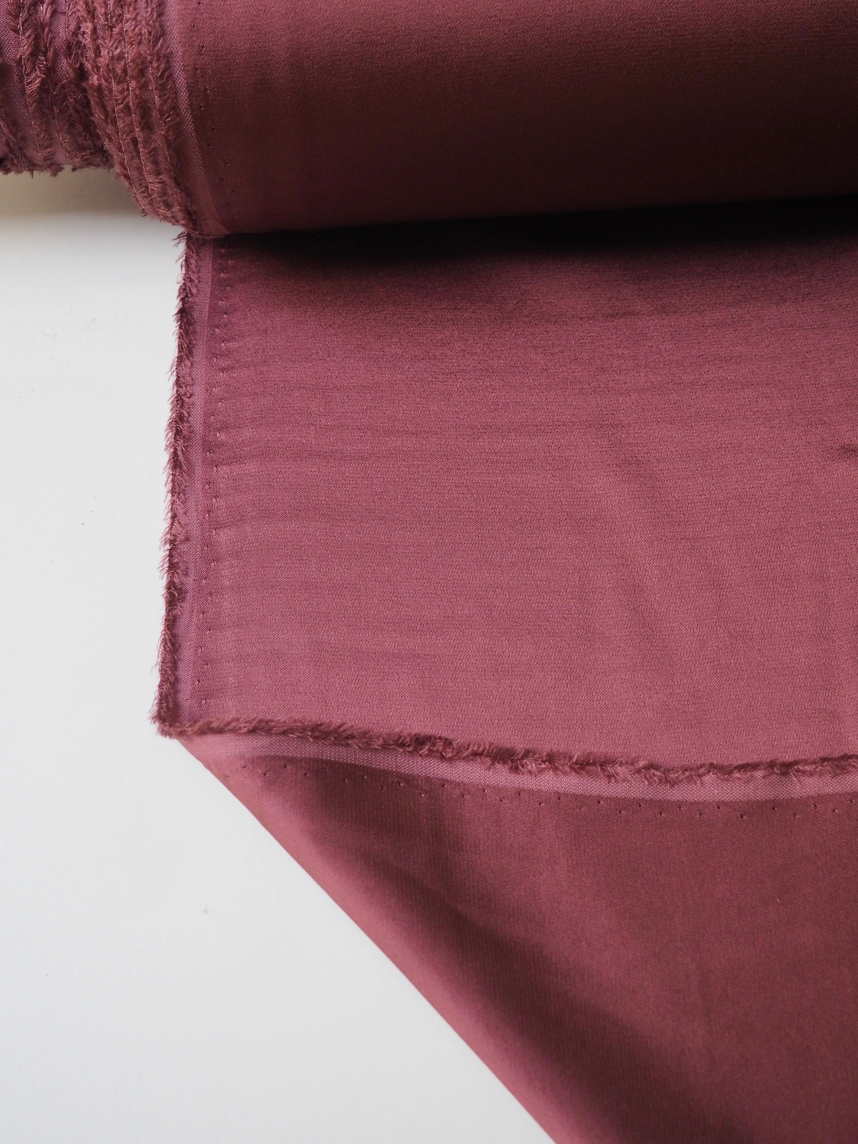 This ex-designer fabric is a crepe satin. It's in a rosewood pink shade, with a light weight. It has a very smooth handle, slinky feel, and great movement and drape. Has a lovely satin sheen on the topside, with a gentle crepe reverse. The sides could be used interchangeably. Has such a lovely handle, and is fully opaque. Perfect for dresses or swishy trousers!