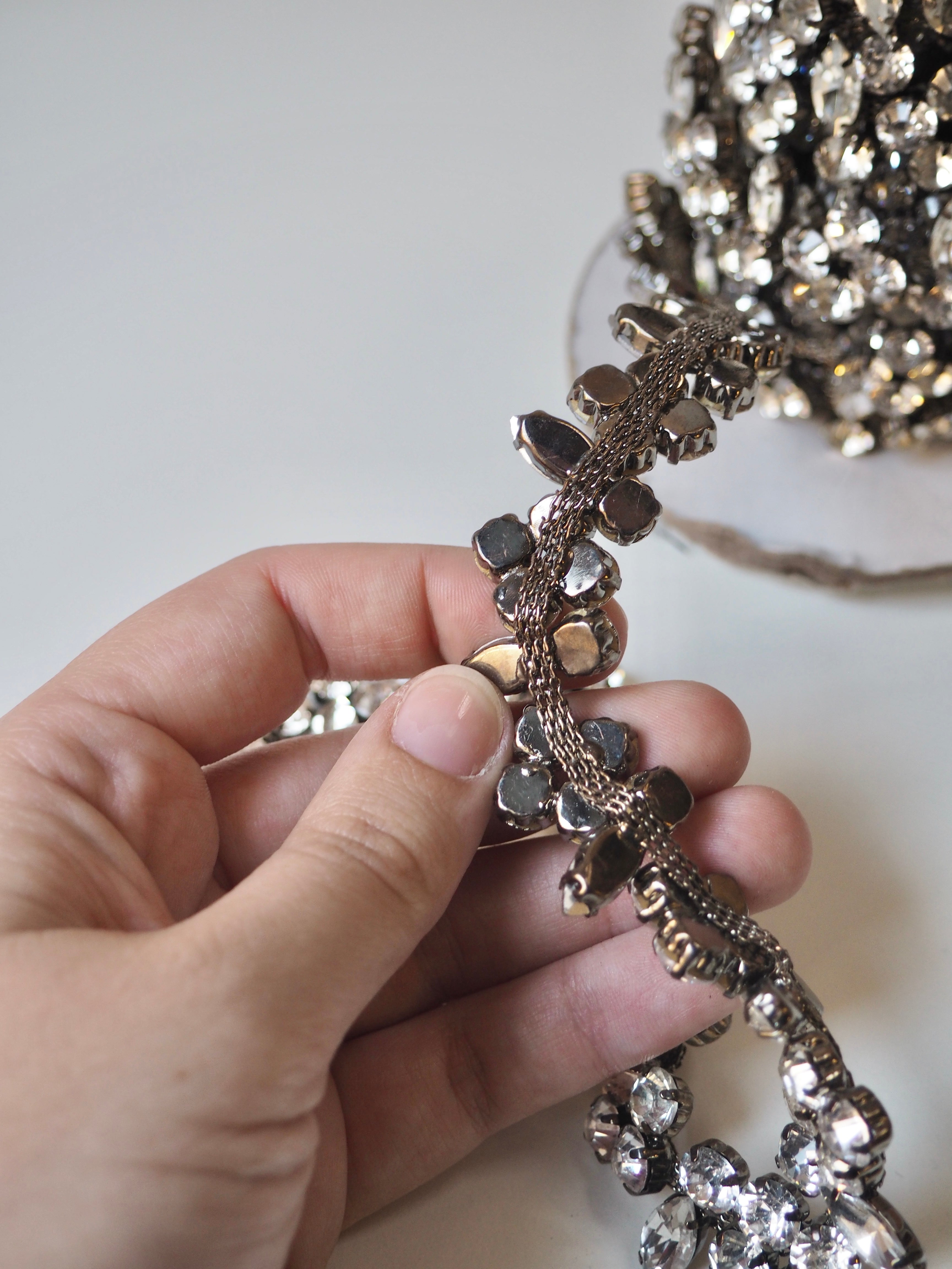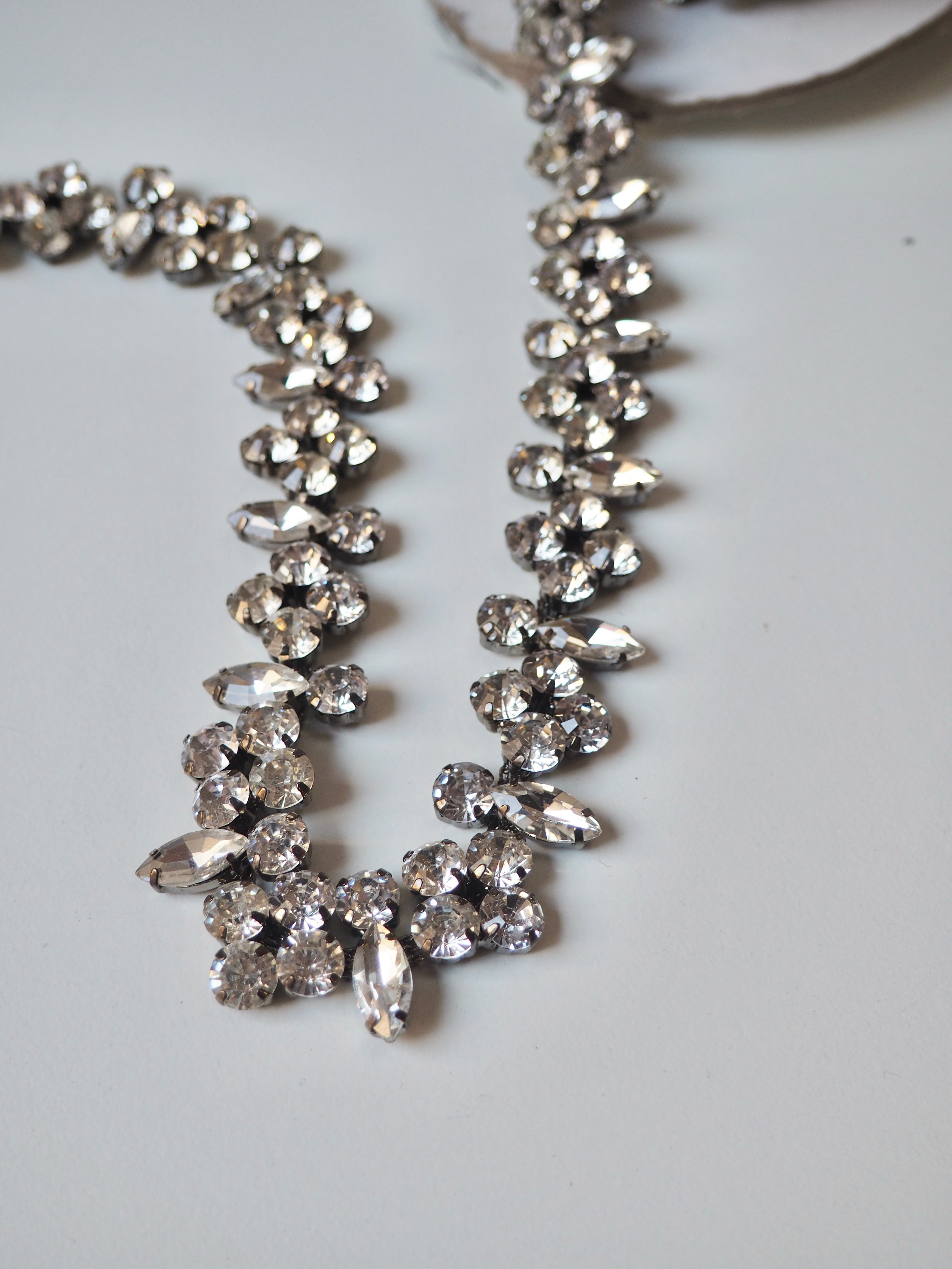 This ex-designer trim is made up of crystal stones. They are set into prong settings and are a repeating design on a metal chain. The crystals really sparkle when they catch the light! Medium weight with beautiful movement! Perfect for jazzing up a bridal look or special piece! This trim has one or two stones missing from the setting, this is reflected in the price.