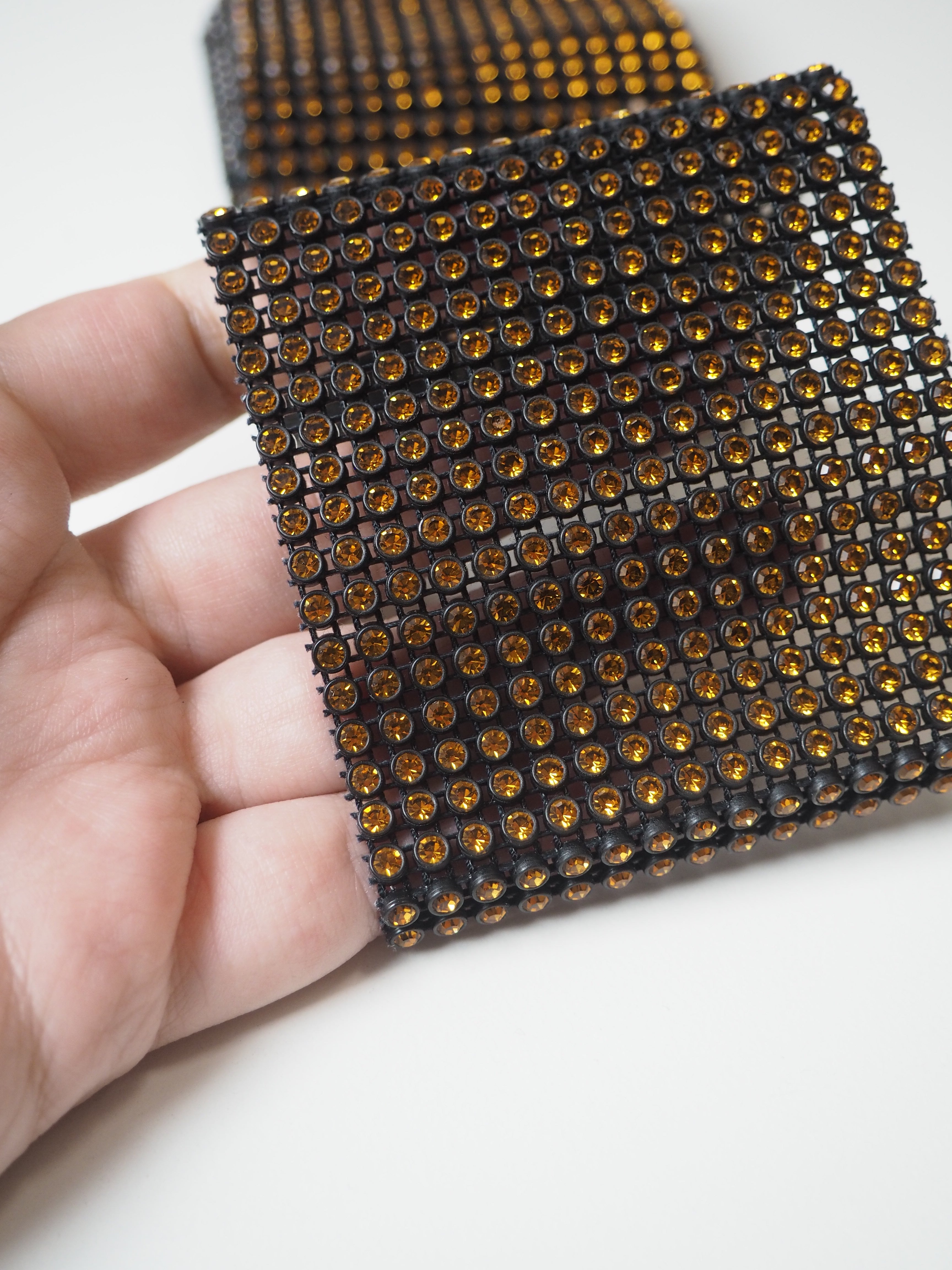 This ex-designer trim is a sparkly diamante trim. Preciosa is a top-quality Czech trim supplier, similar to Swarovski. Made up of crystals in a black setting, chained together in a gridded weave. The crystals are super high quality and really sparkle when they catch the light! Medium weight with decent movement, and easy to cut! Could be used for cuffs, jewellery, accents, and so many other fun projects!