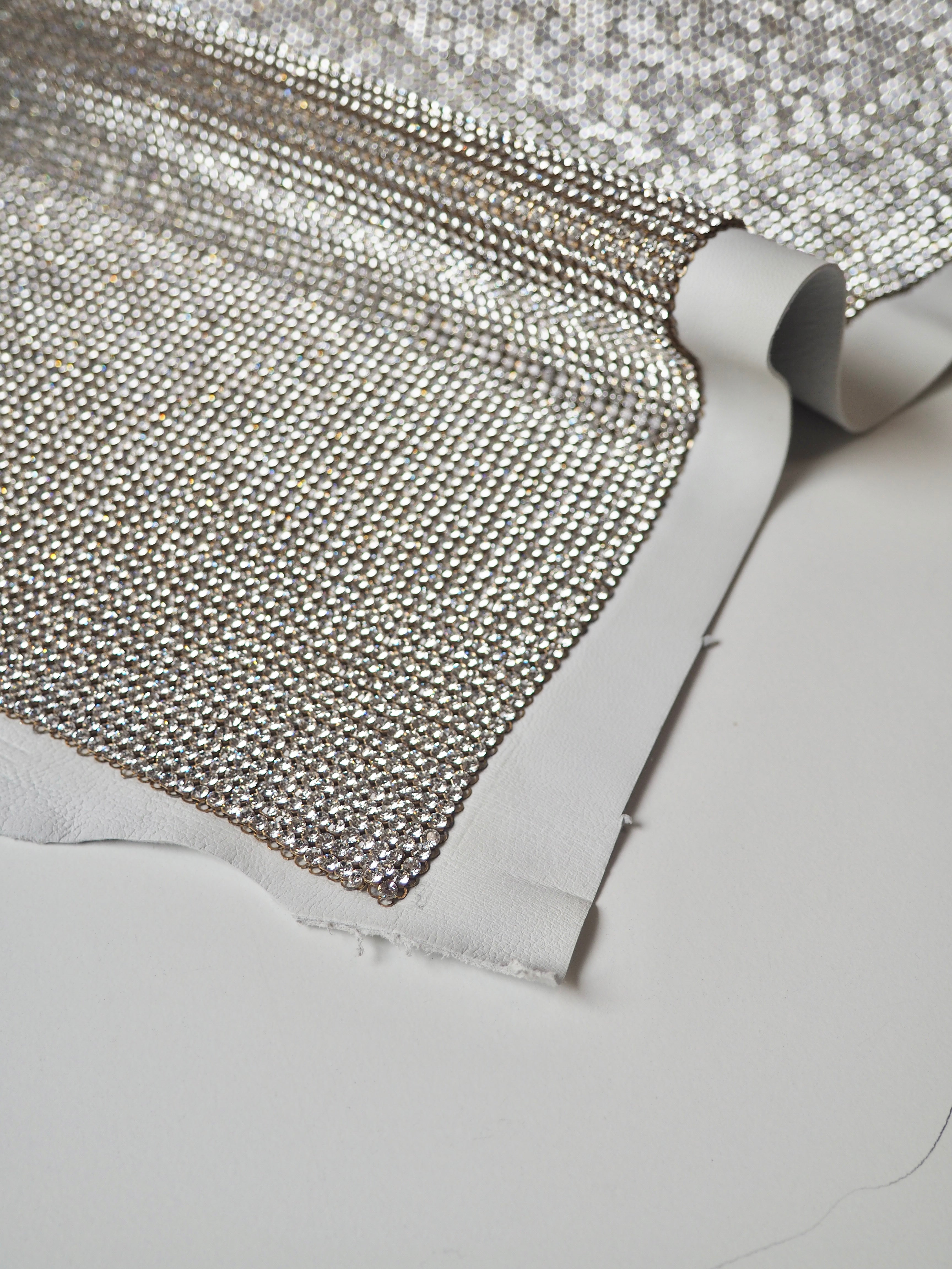 This ex-designer trim is a chainmail. It's a top-quality Swarovski chainmail that has been fused to a white leather piece. It's a bag ready to be made up! It's so sparkly, medium weight, with a soft white lambskin to give it shape and longevity.