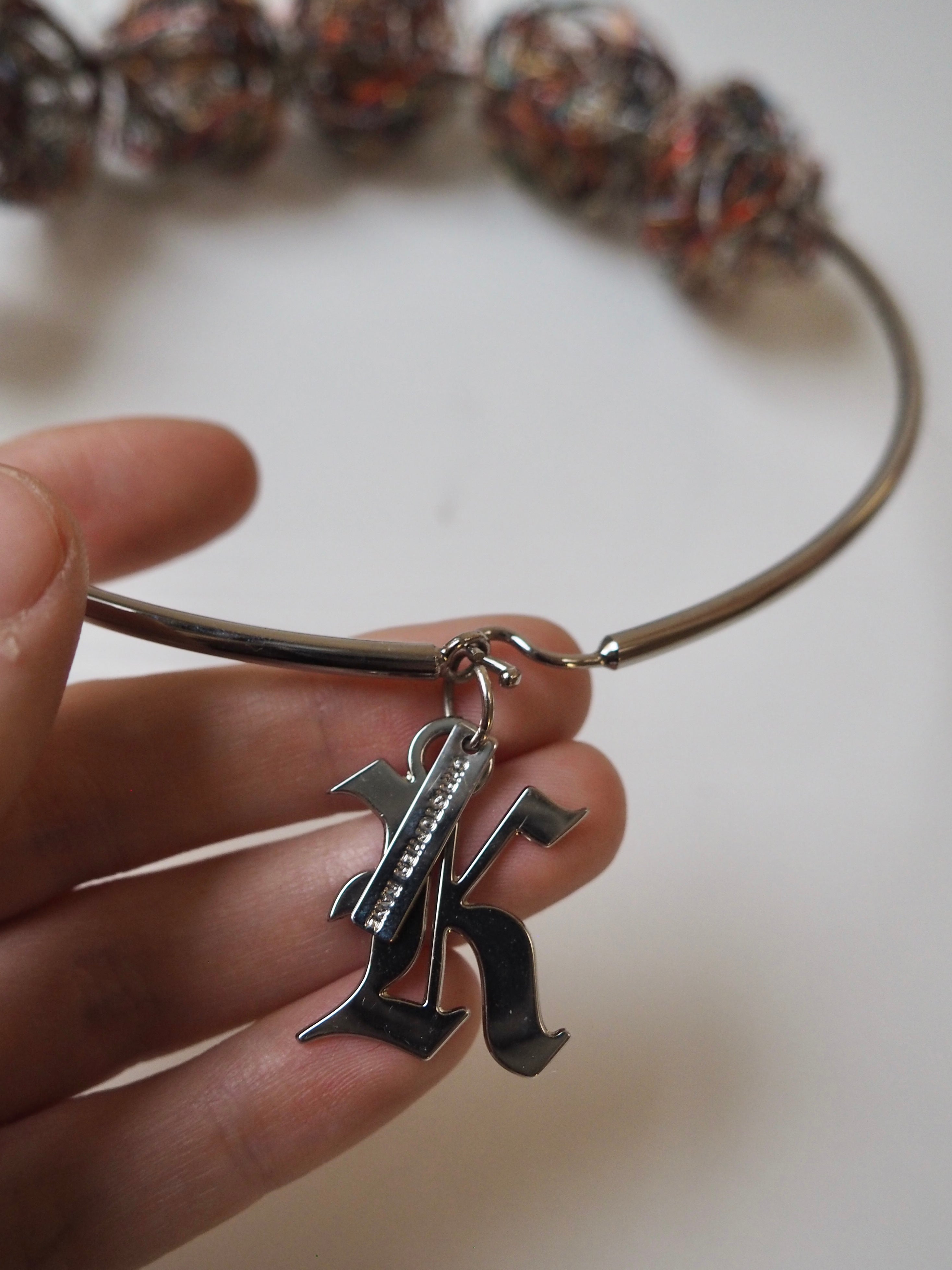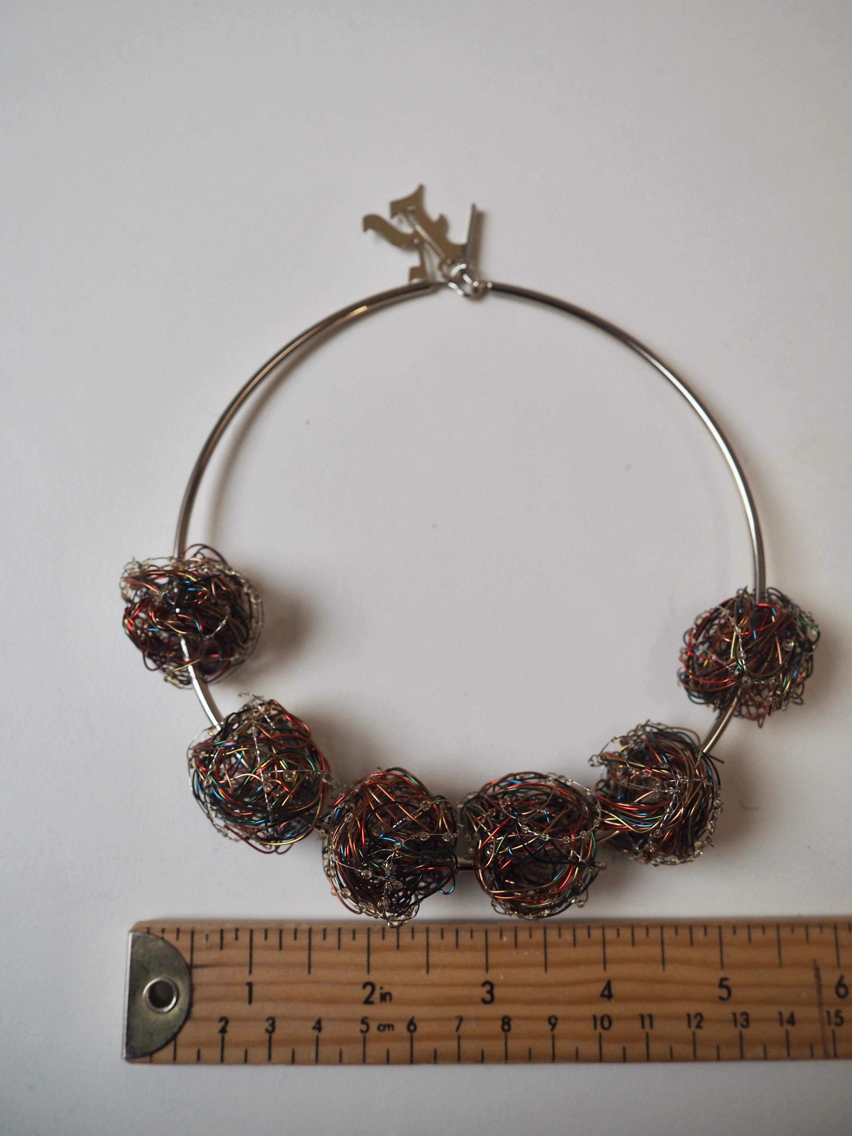 This ex-designer jewellery is a unique designer necklace. It's multi-colour wrapped wire nest like bead balls sit on a solid structured silver ring. It has a hook and loop secure closure with a branded tag attached.