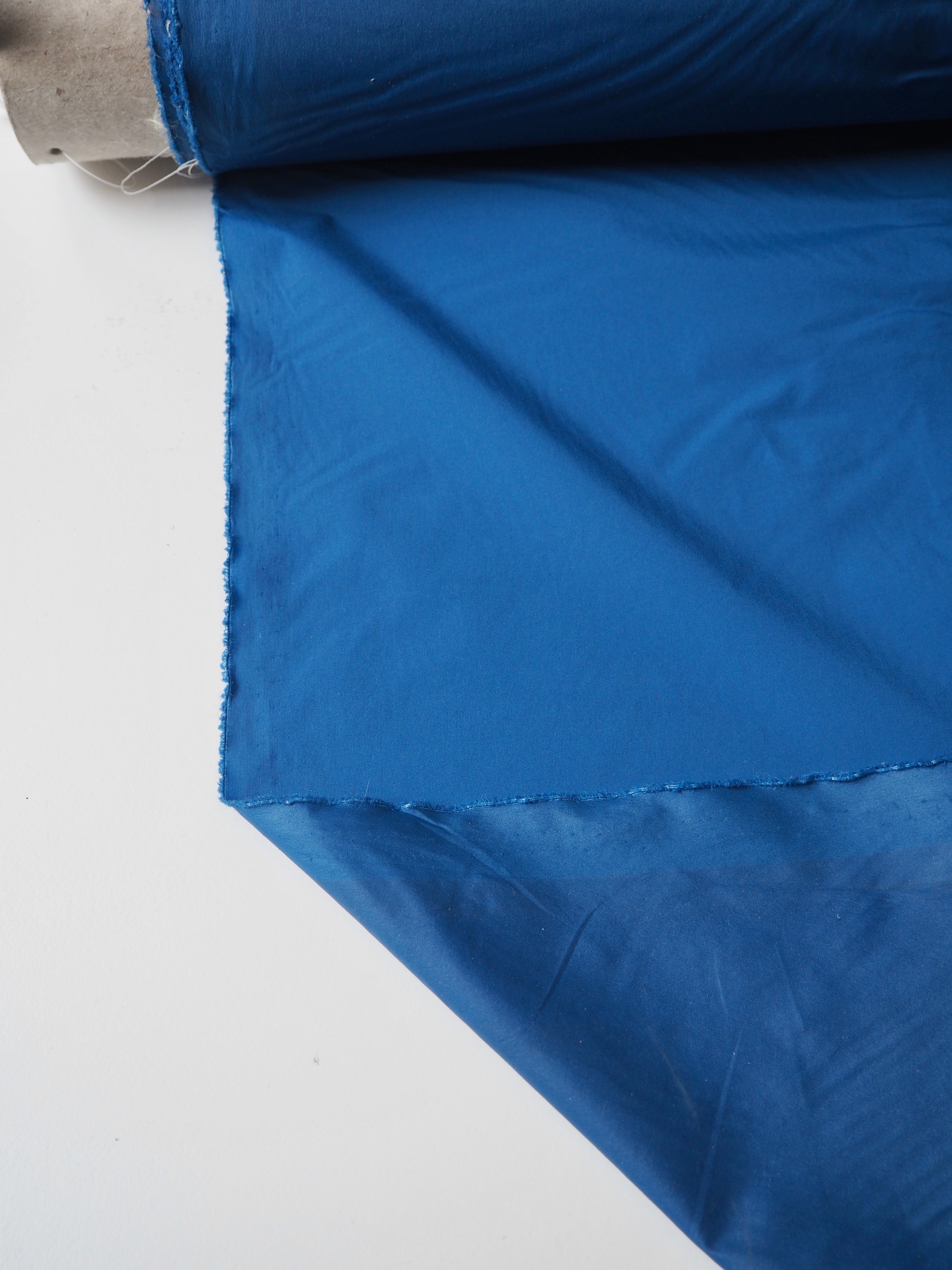 This ex-designer fabric is a nylon. It's a super thin blue nylon, that is paper thin and fully opaque. It has about 20% width-ways stretch, and it's quite crispy. It drapes so well and is quite versatile. Great for a technical projects!