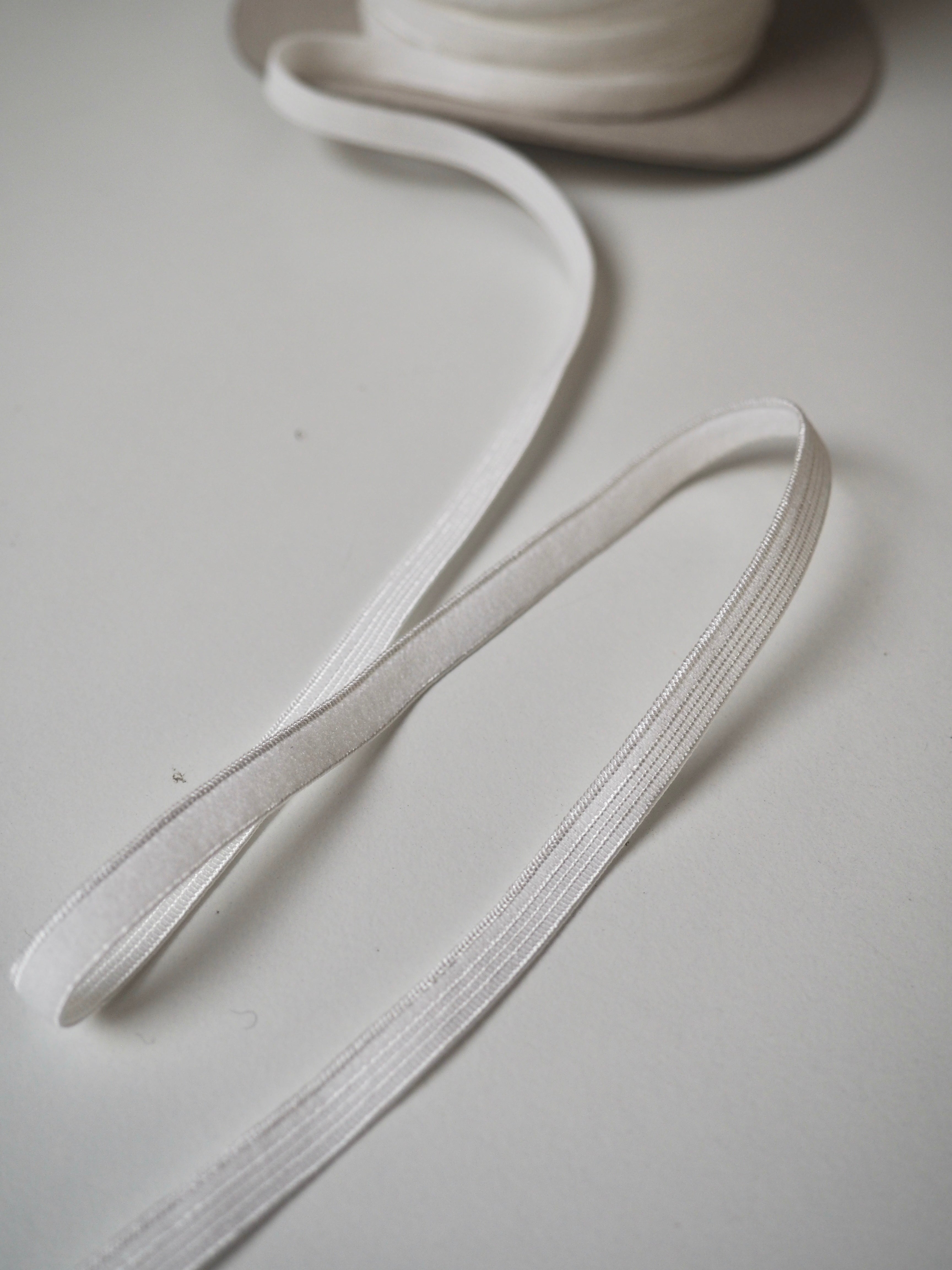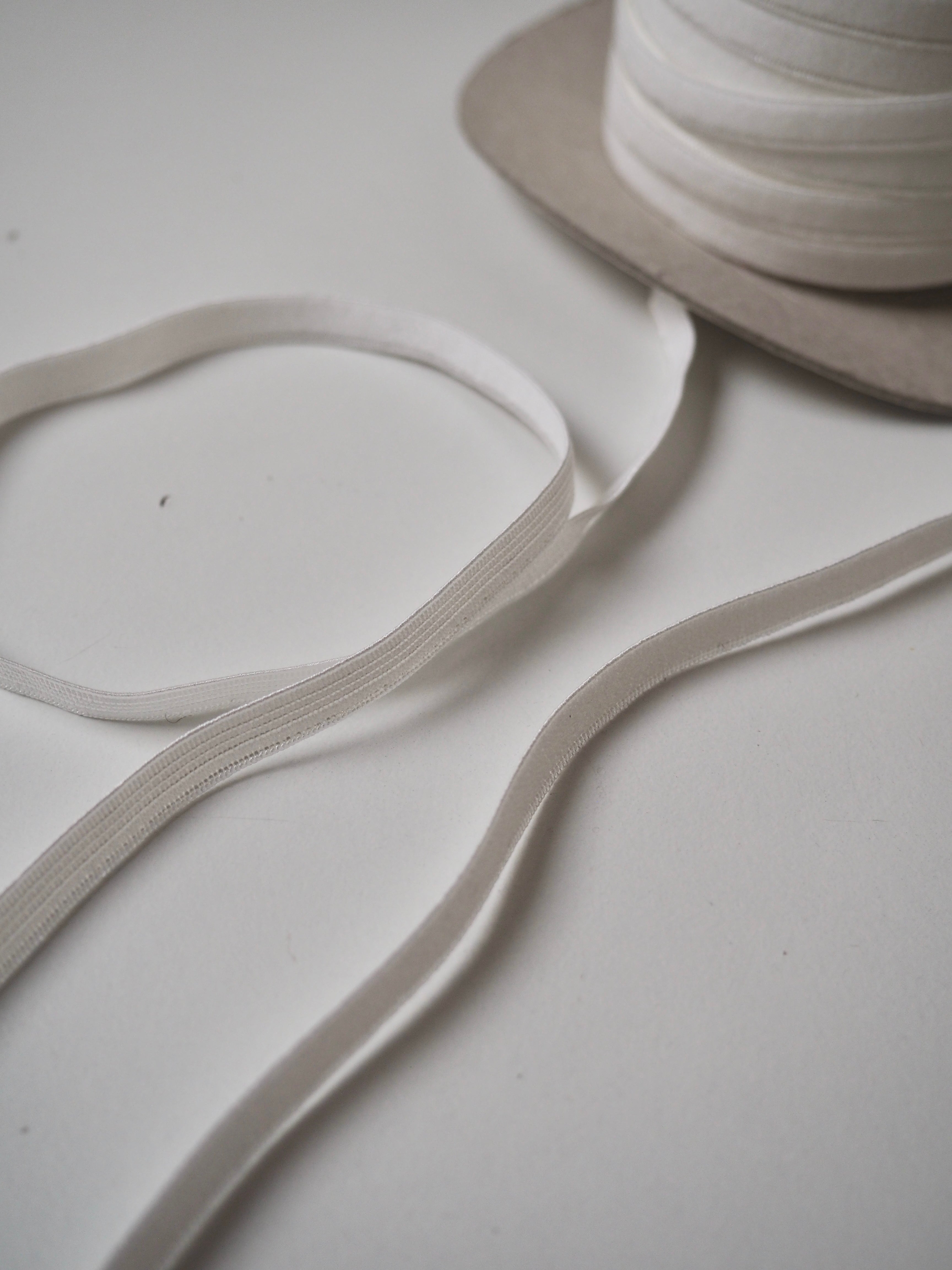 This ex-designer trim is a whire elastic. One side is a typical textured elastic feel, and the other a plush with a soft feel. Great stretch and recovery. Good for smaller casings on trousers and tops, and even lingerie straps. Lingerie patterns here!