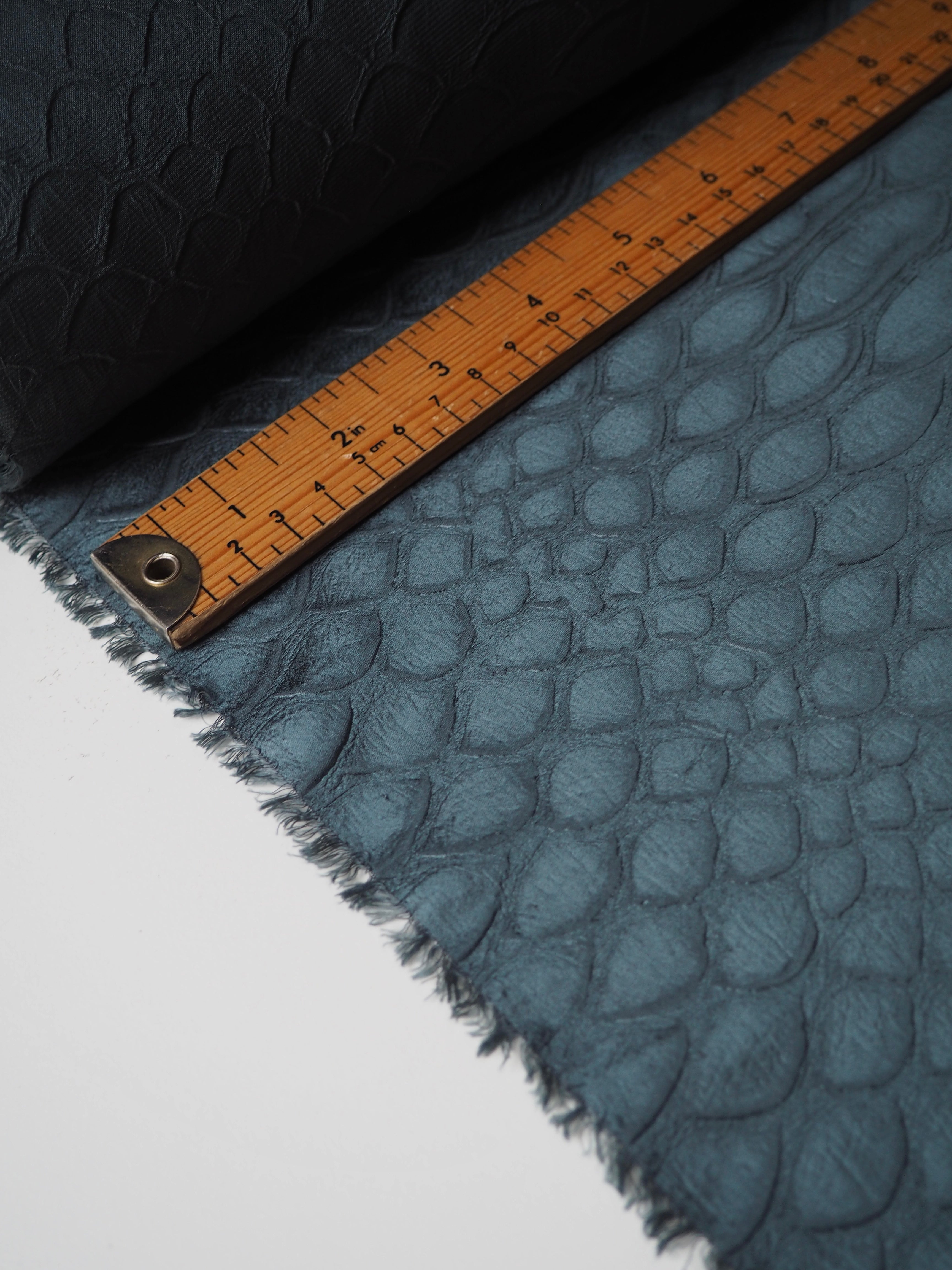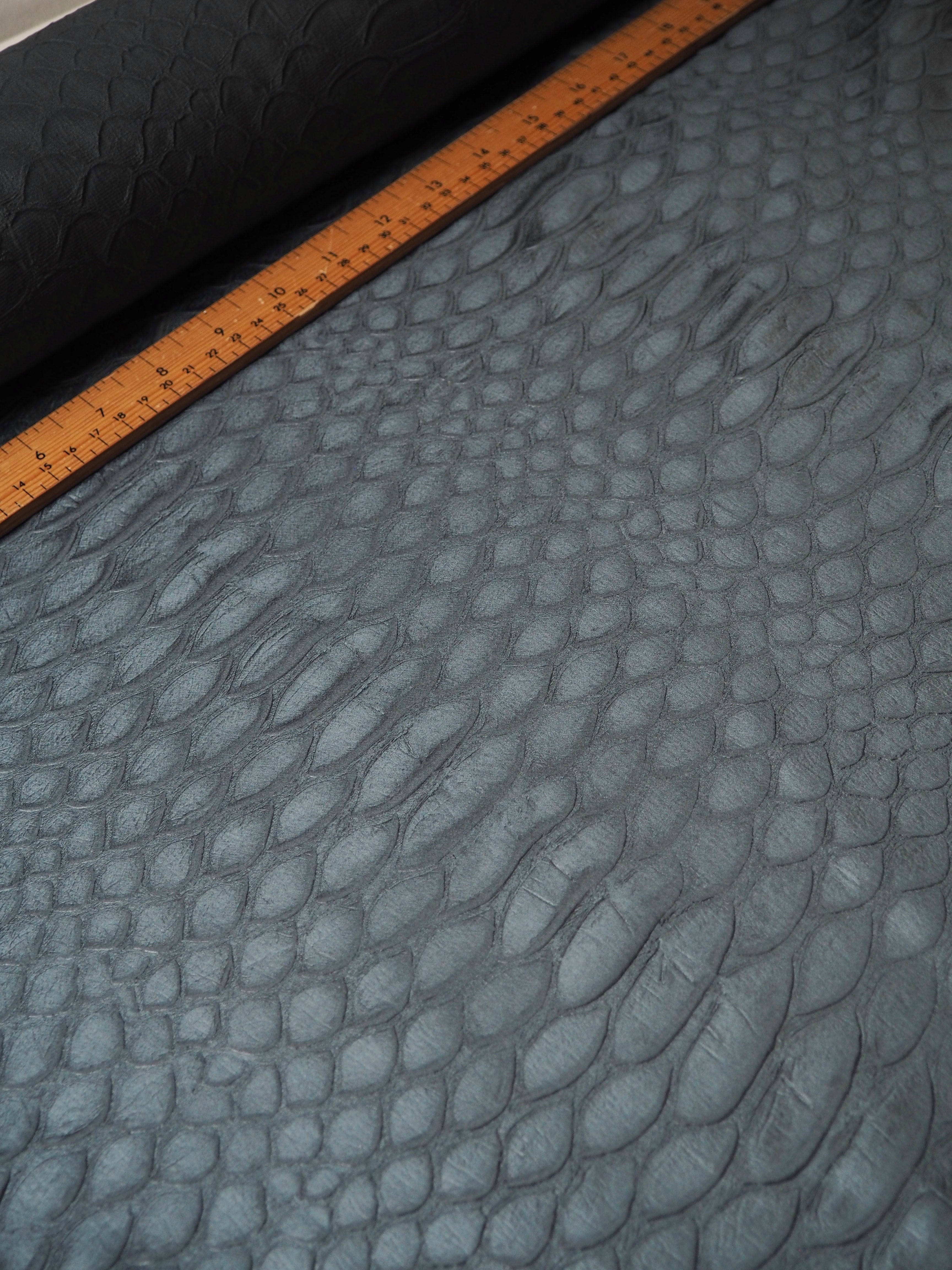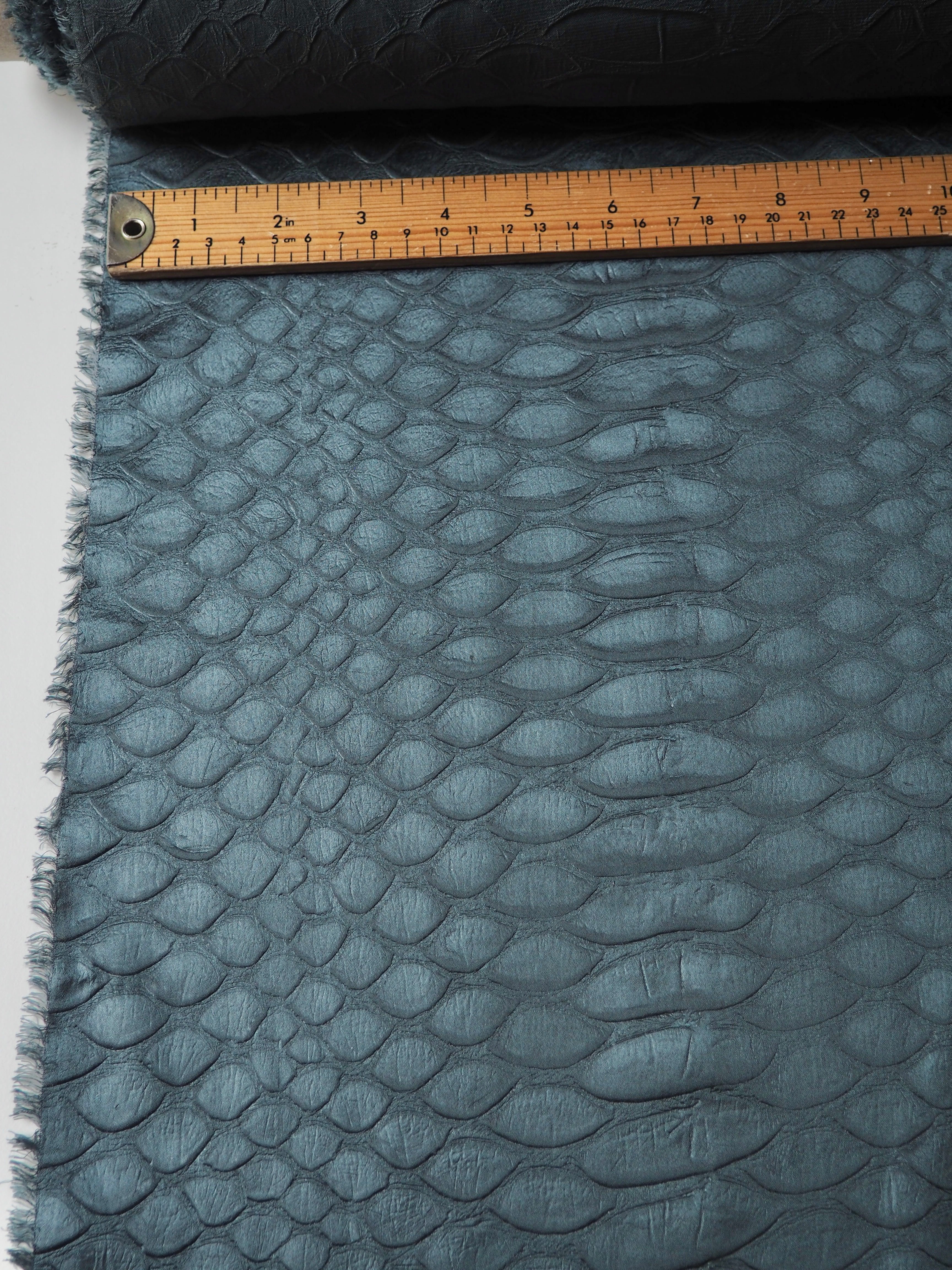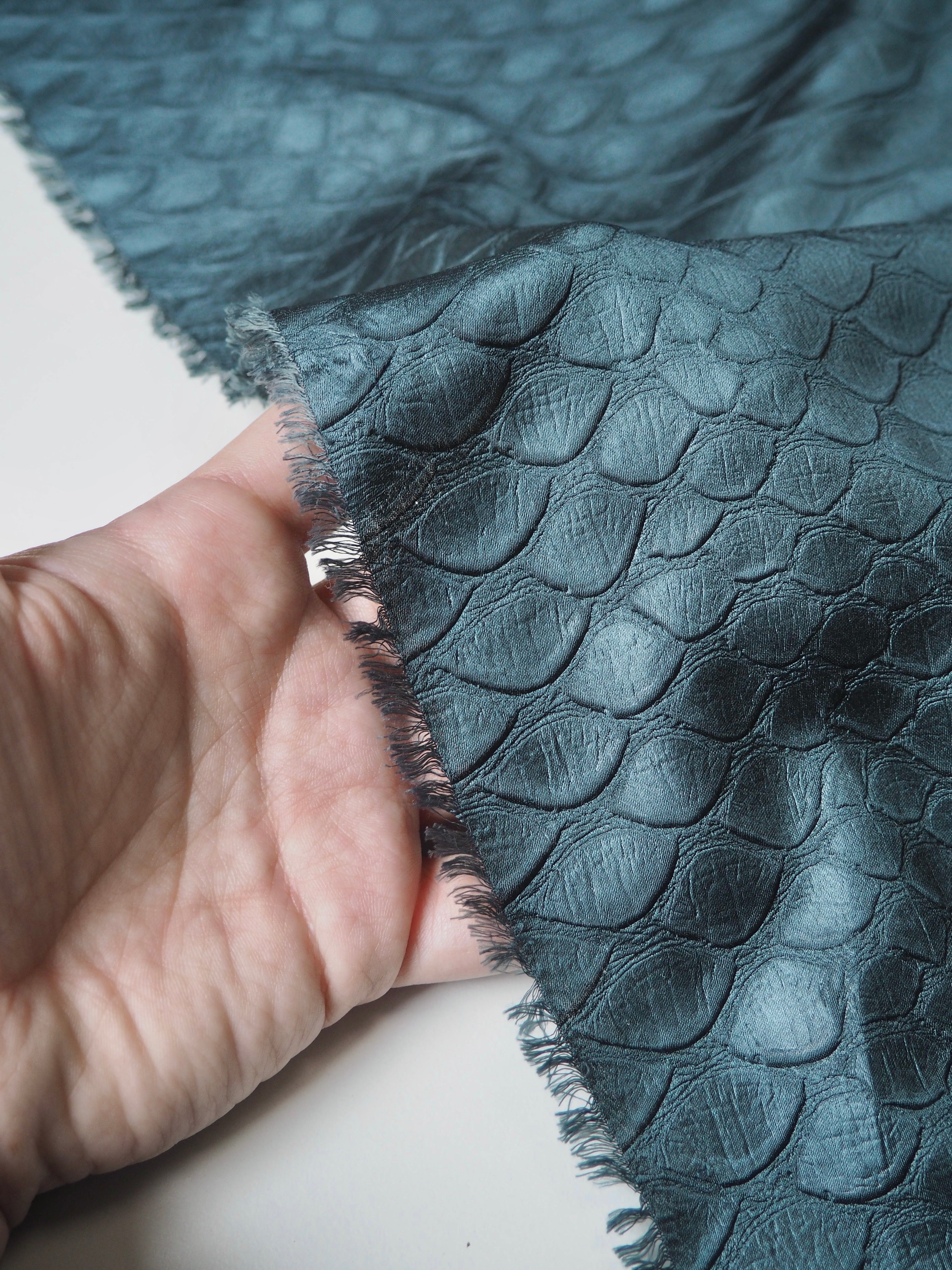 This ex-designer fabric is a unique cloth! It's a green polyester, with an armadillo embossed texture in repeating pattern. It has a medium shine, with a fantastic texture. Has a soft handle and great drape. Opaque and super lightweight. Perfect for a top or dress!