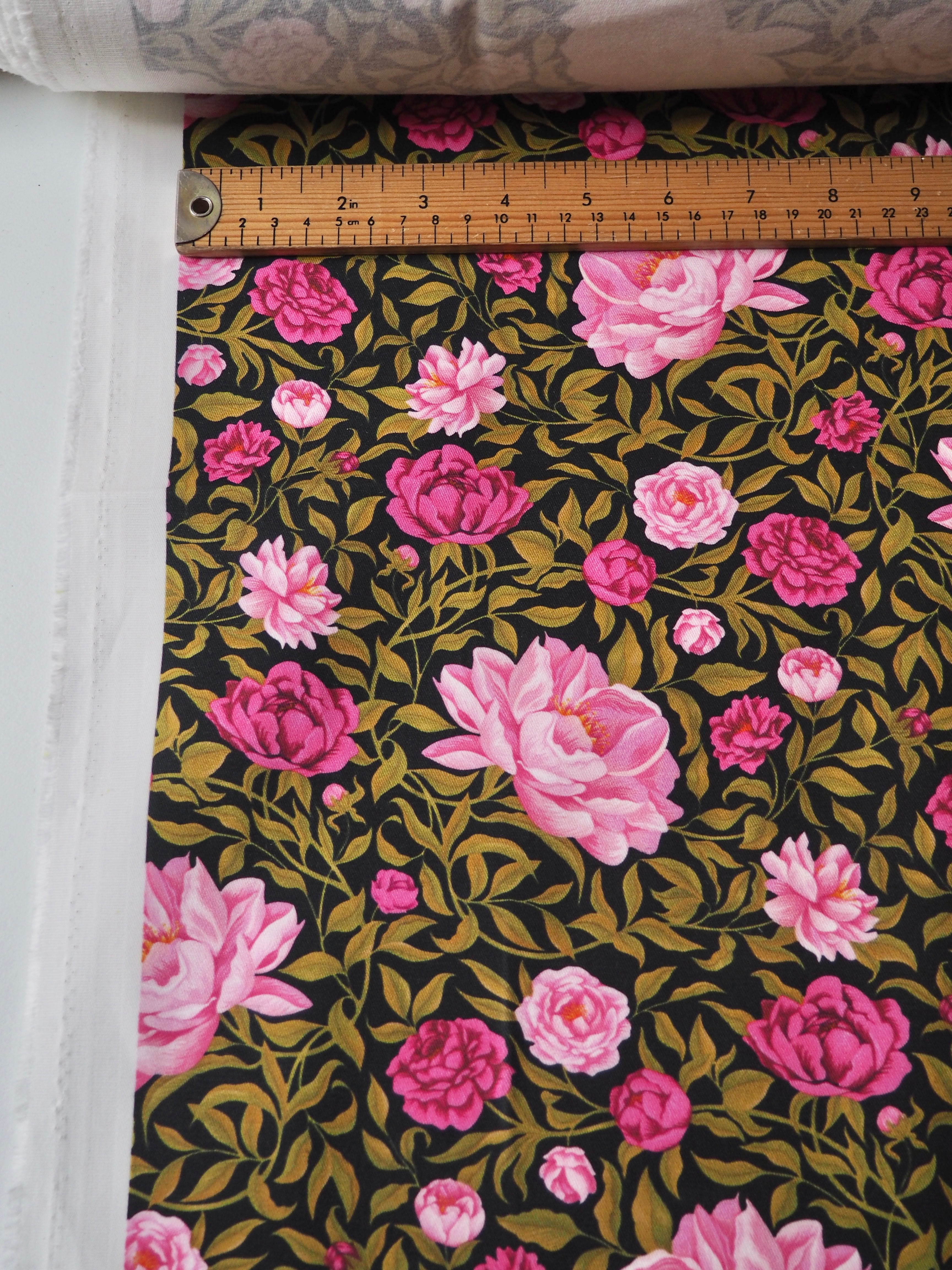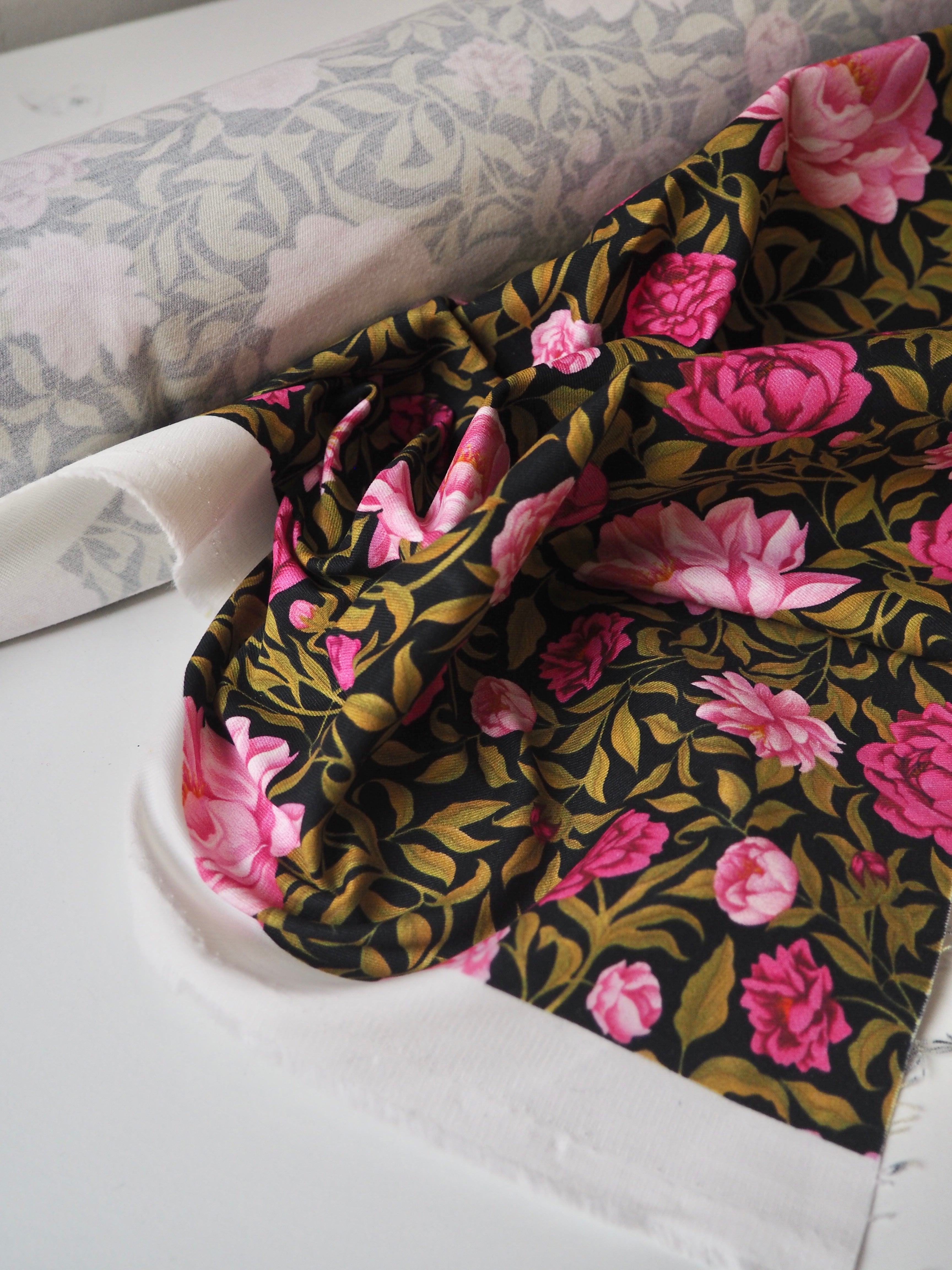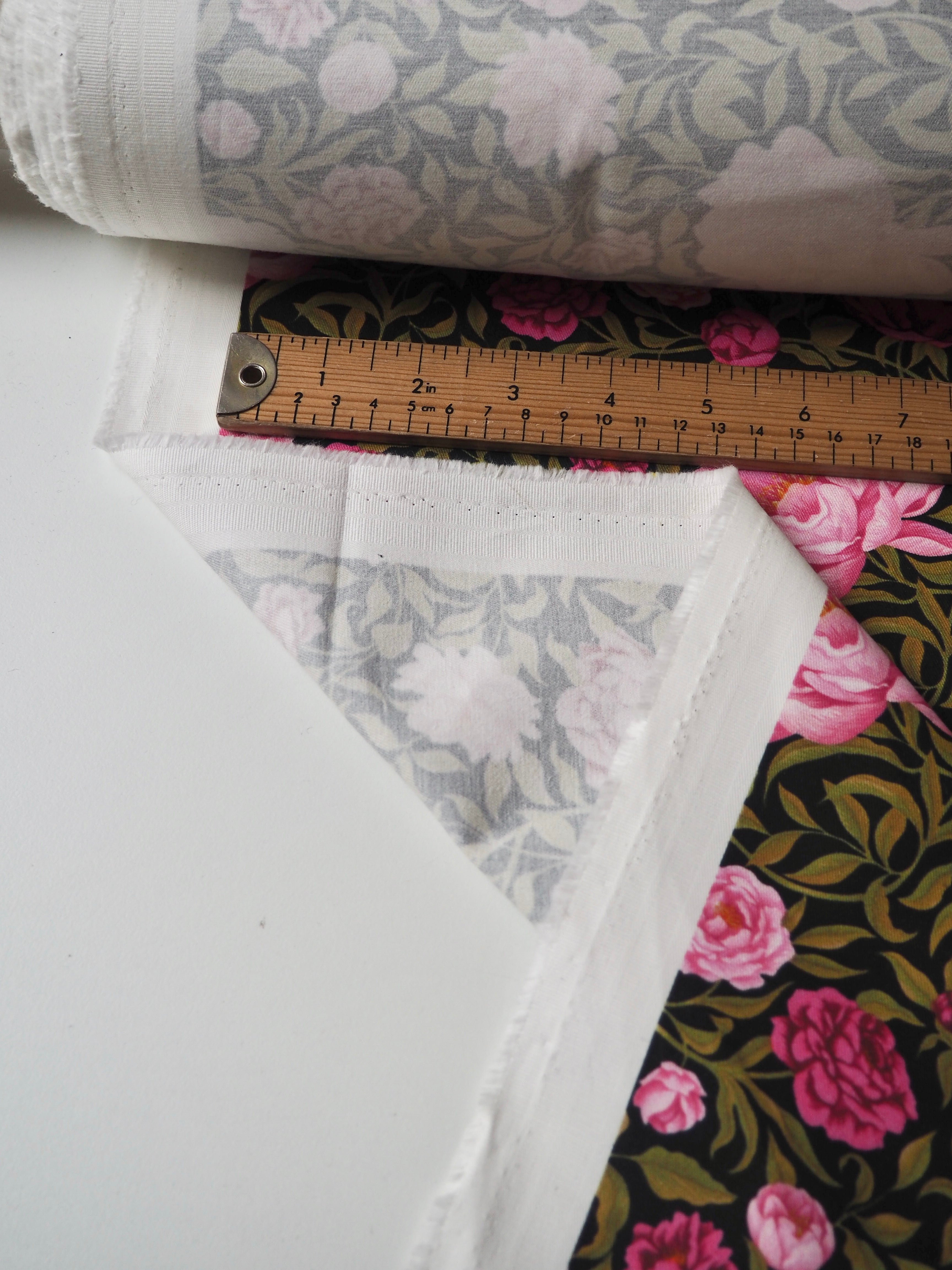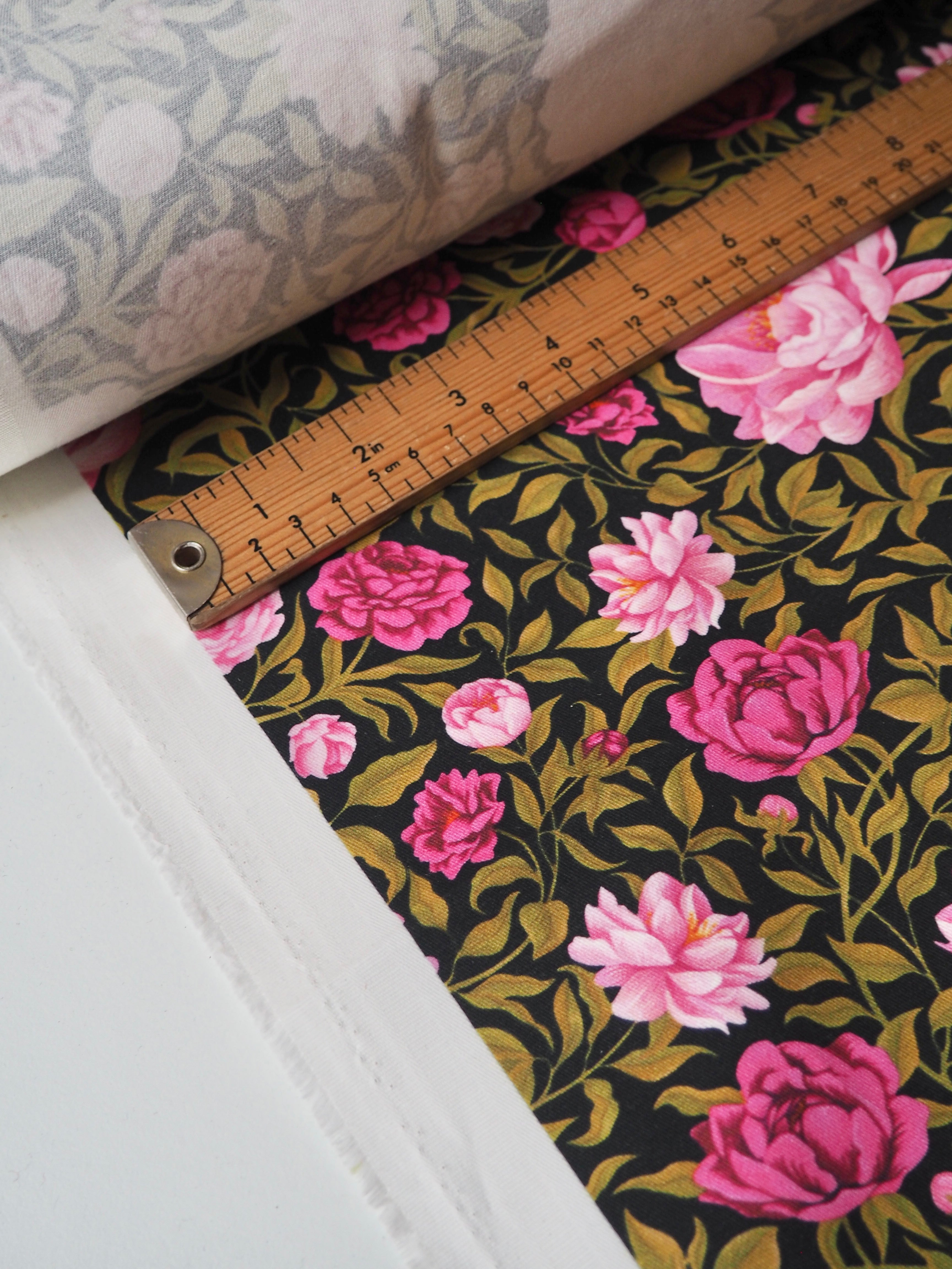This ex-designer fabric is a Liberty cotton twill. It's in their Carla floral print, and not typically available to buy by the meter! It's a medium weight with a super soft brushed-finish topside. The colours are rich vibrant and beautifully printed. There is a nice 5% ease stretch for trousers or jumpsuits! So soft and fully opaque. Has a lovely structure that's easy to play with. Beautiful quality typical of Liberty. Would love to see dungarees, jackets, or trousers!