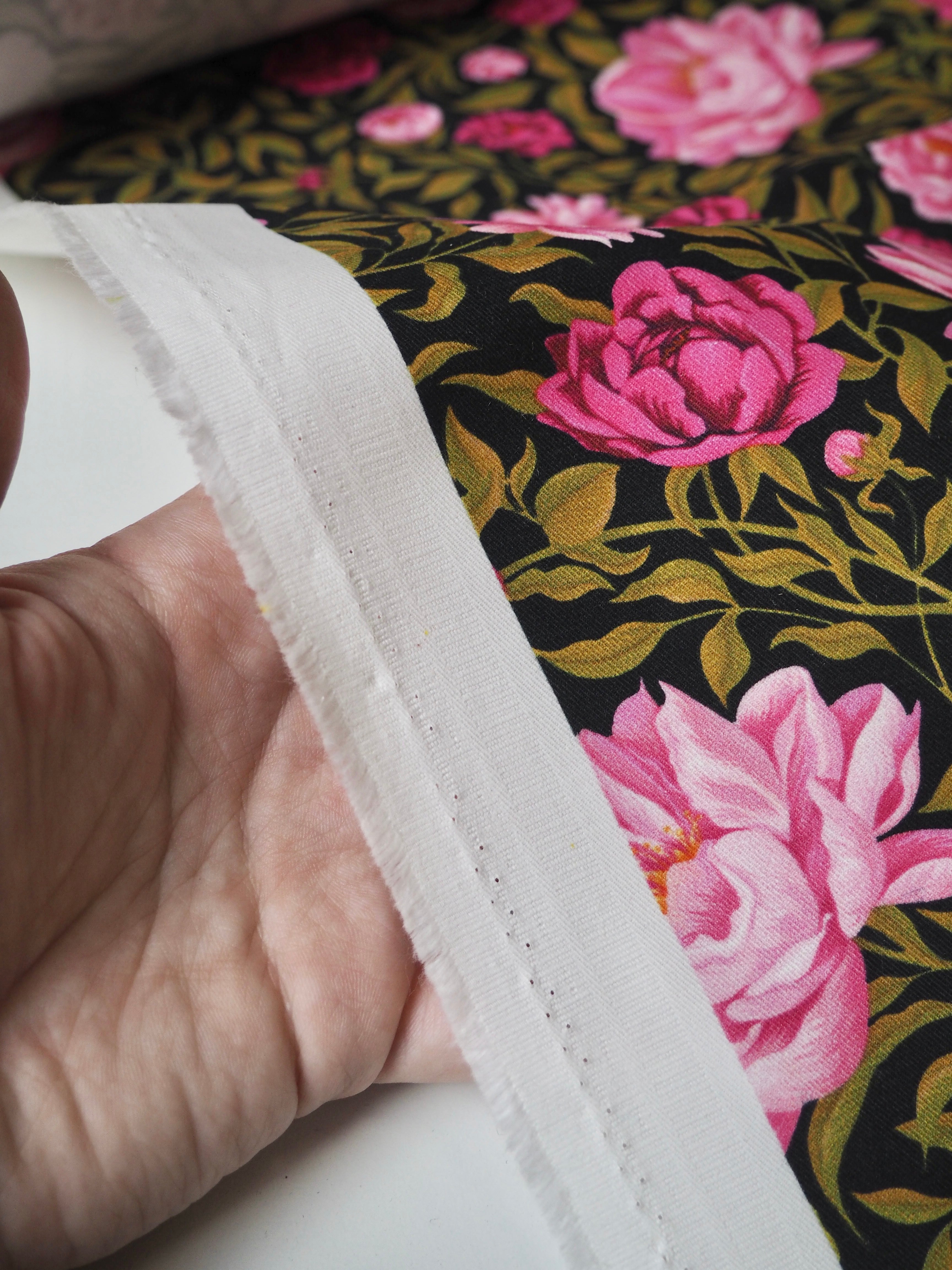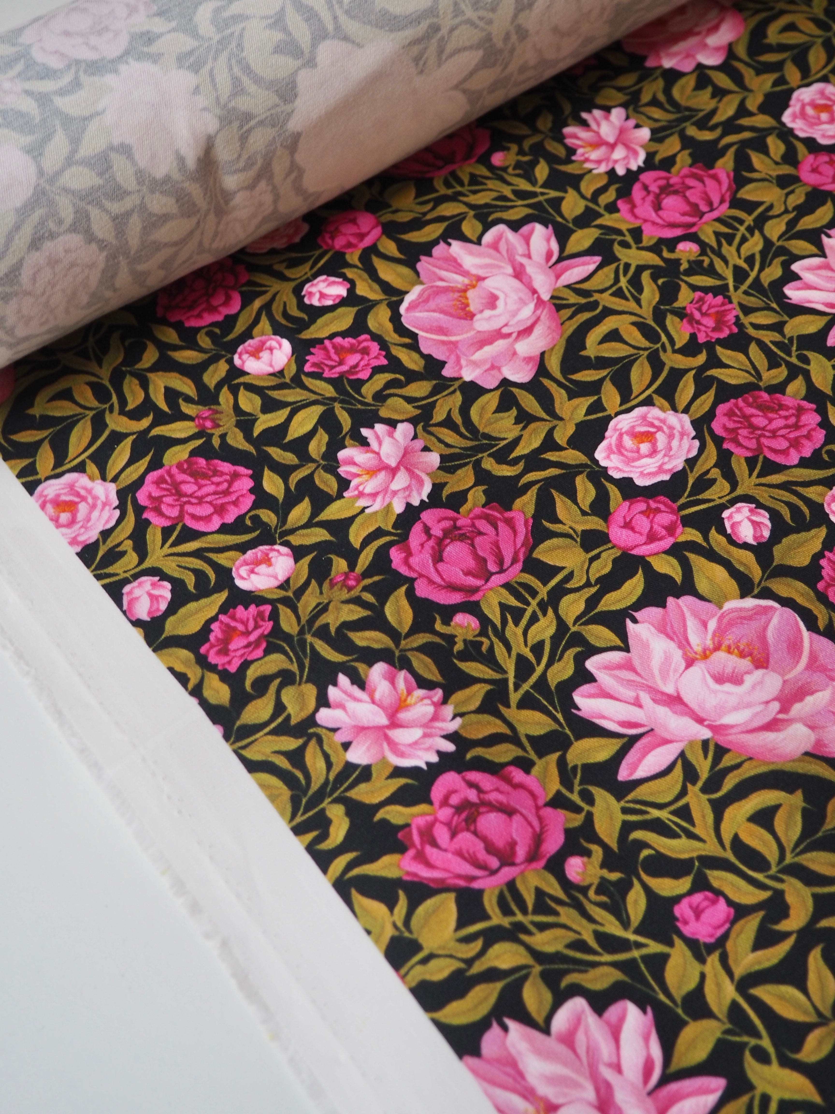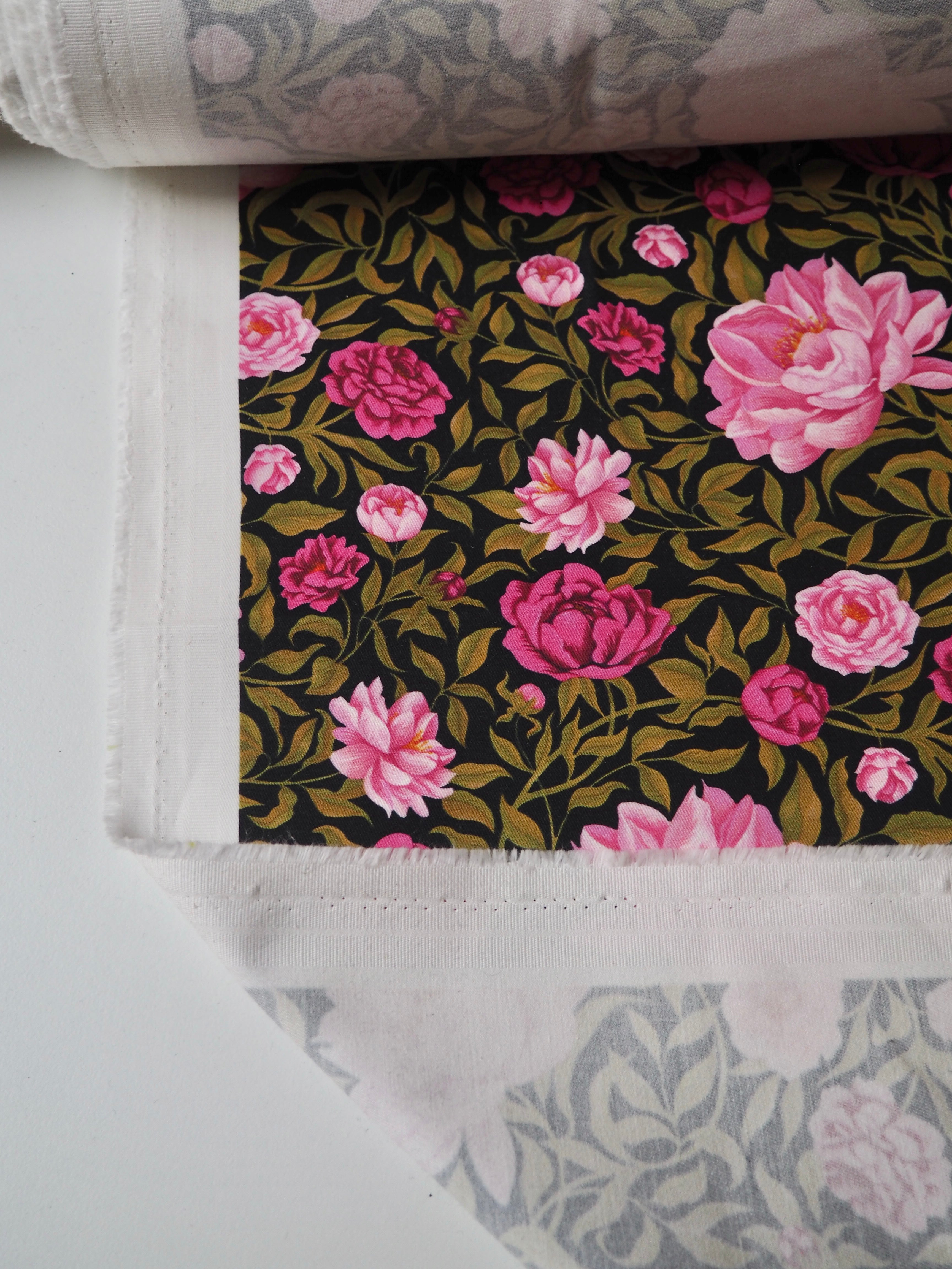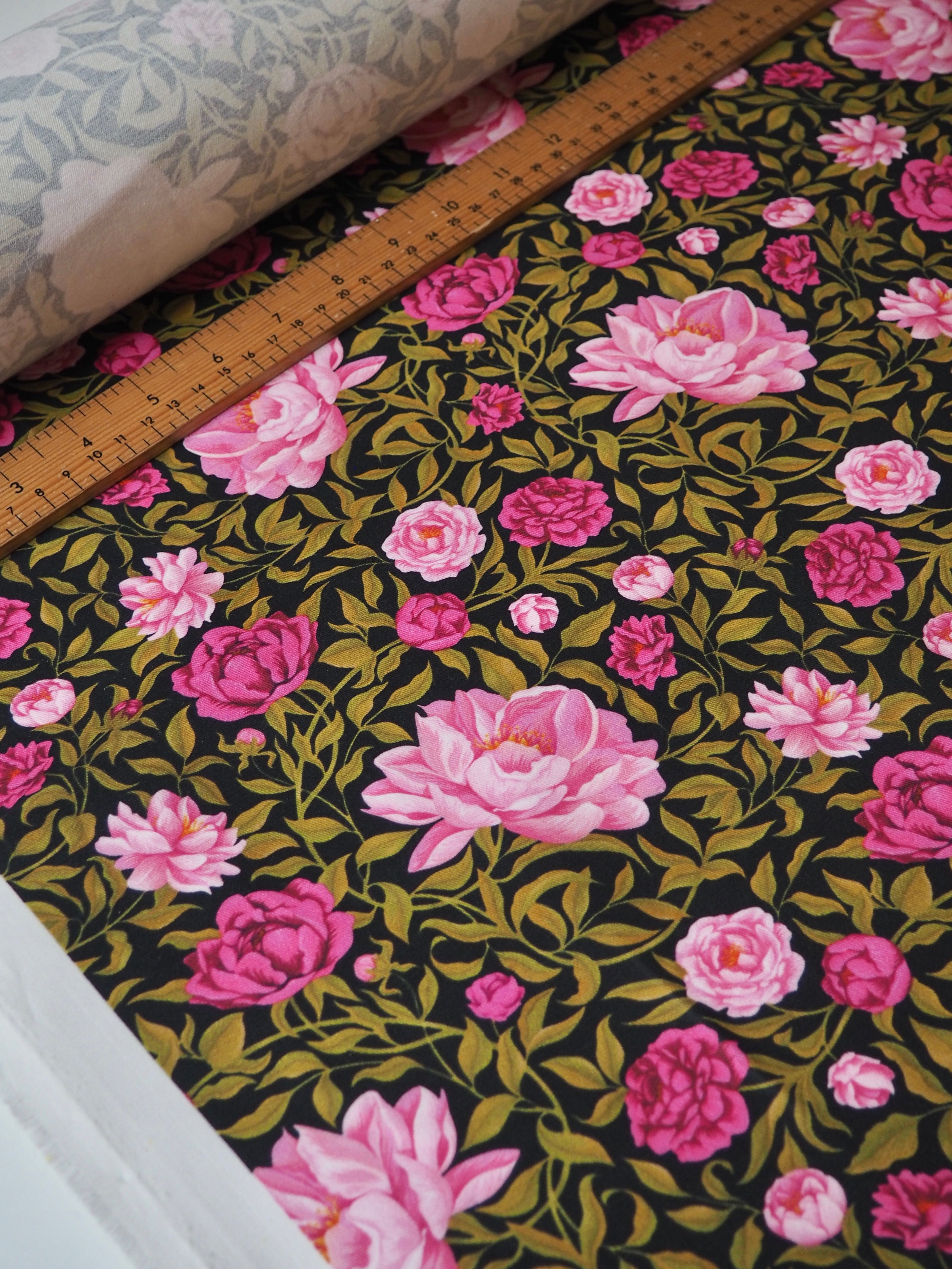 This ex-designer fabric is a Liberty cotton twill. It's in their Carla floral print, and not typically available to buy by the meter! It's a medium weight with a super soft brushed-finish topside. The colours are rich vibrant and beautifully printed. There is a nice 5% ease stretch for trousers or jumpsuits! So soft and fully opaque. Has a lovely structure that's easy to play with. Beautiful quality typical of Liberty. Would love to see dungarees, jackets, or trousers!