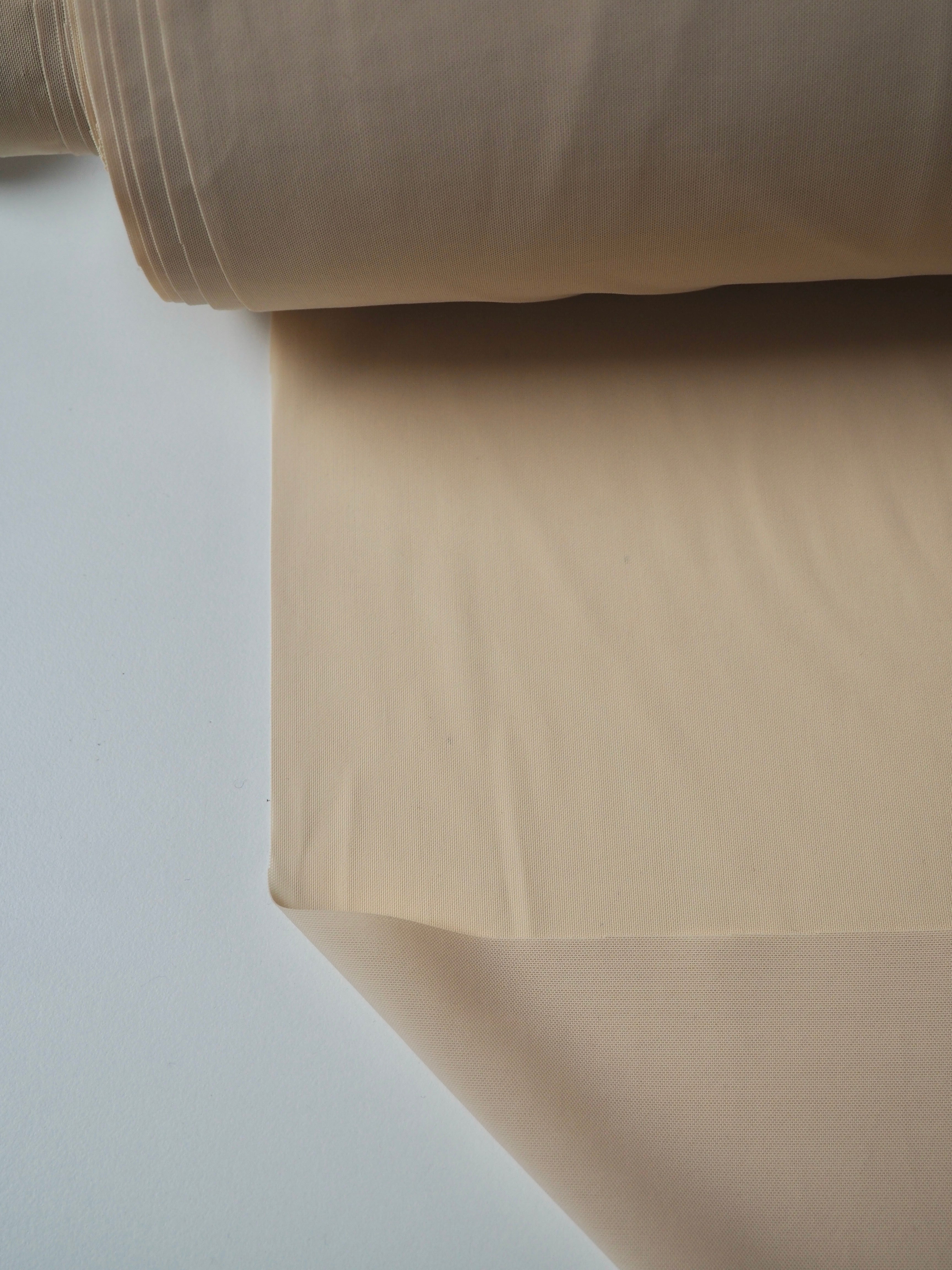 This ex-designer fabric is a stretch powernet. Powernet is a high-stretch fuller coverage mesh, with excellent recovery and great breathability. It's common for performance wear and undergarments. It's lightweight and has great support with its dense structure, but still slight sheerness when stretched. It's soft and comfy! Pairs so well with lingerie, swim, and activewear! Perfect for our lingerie patterns, and we even have bra finding kits!
