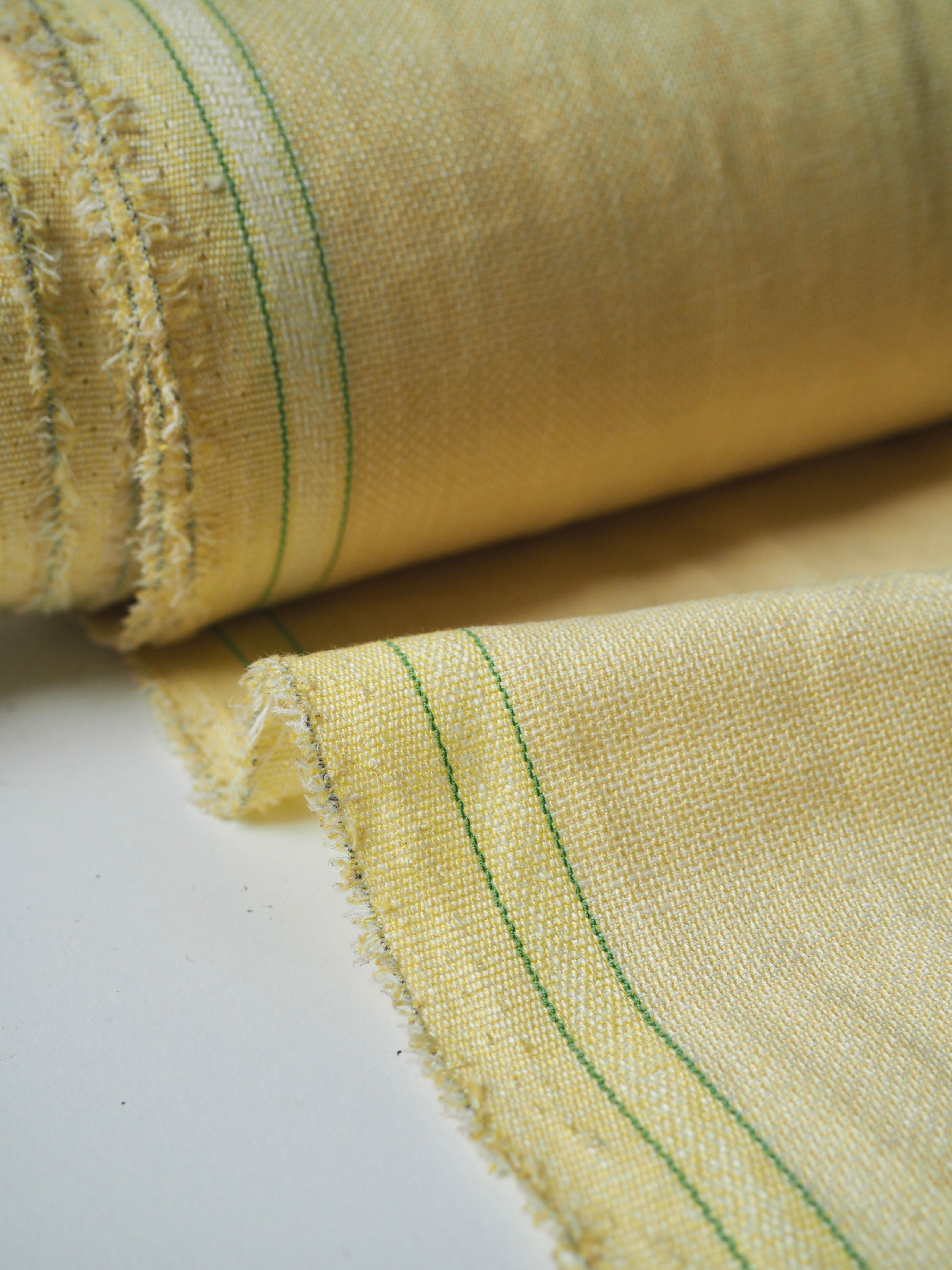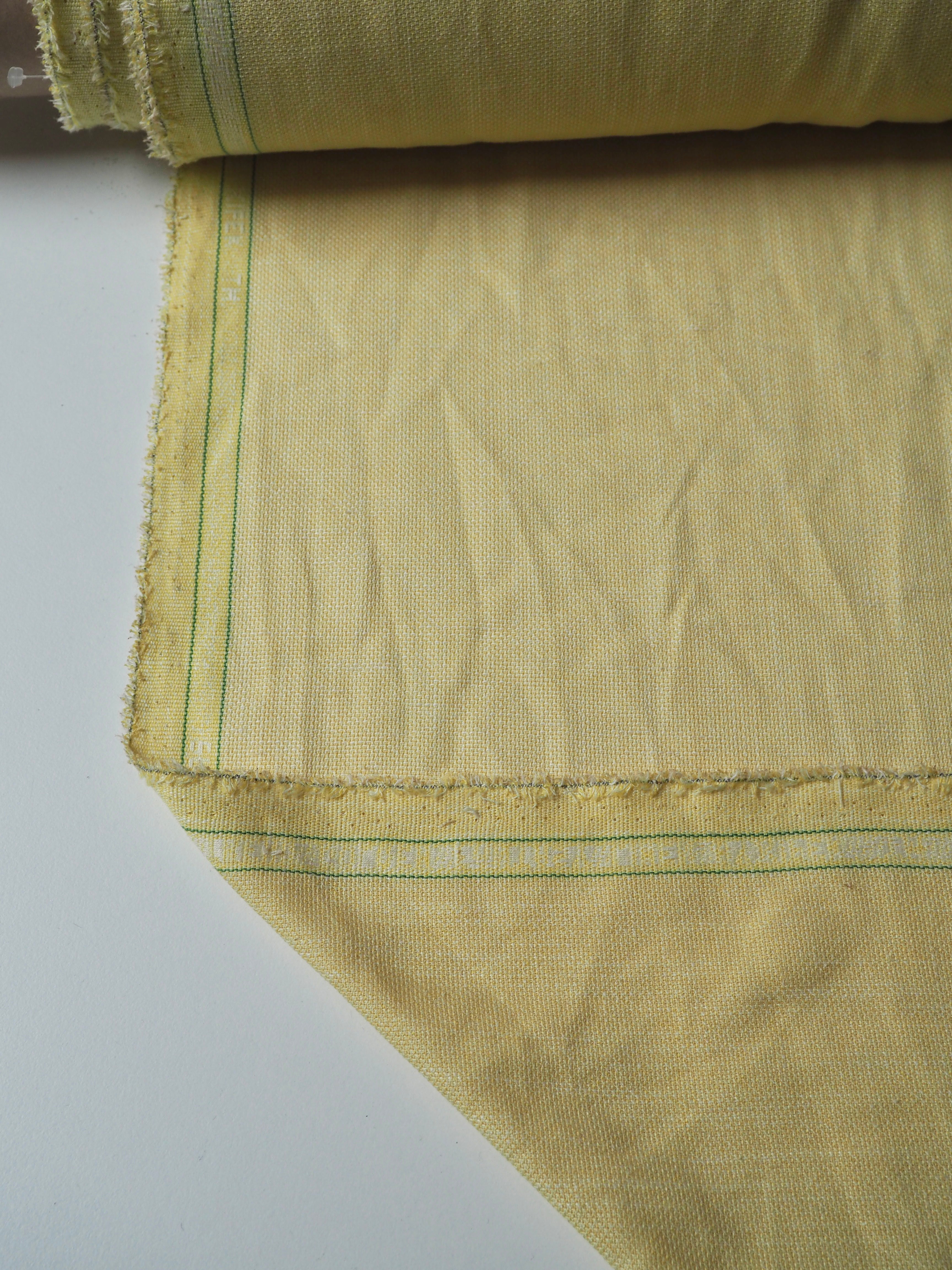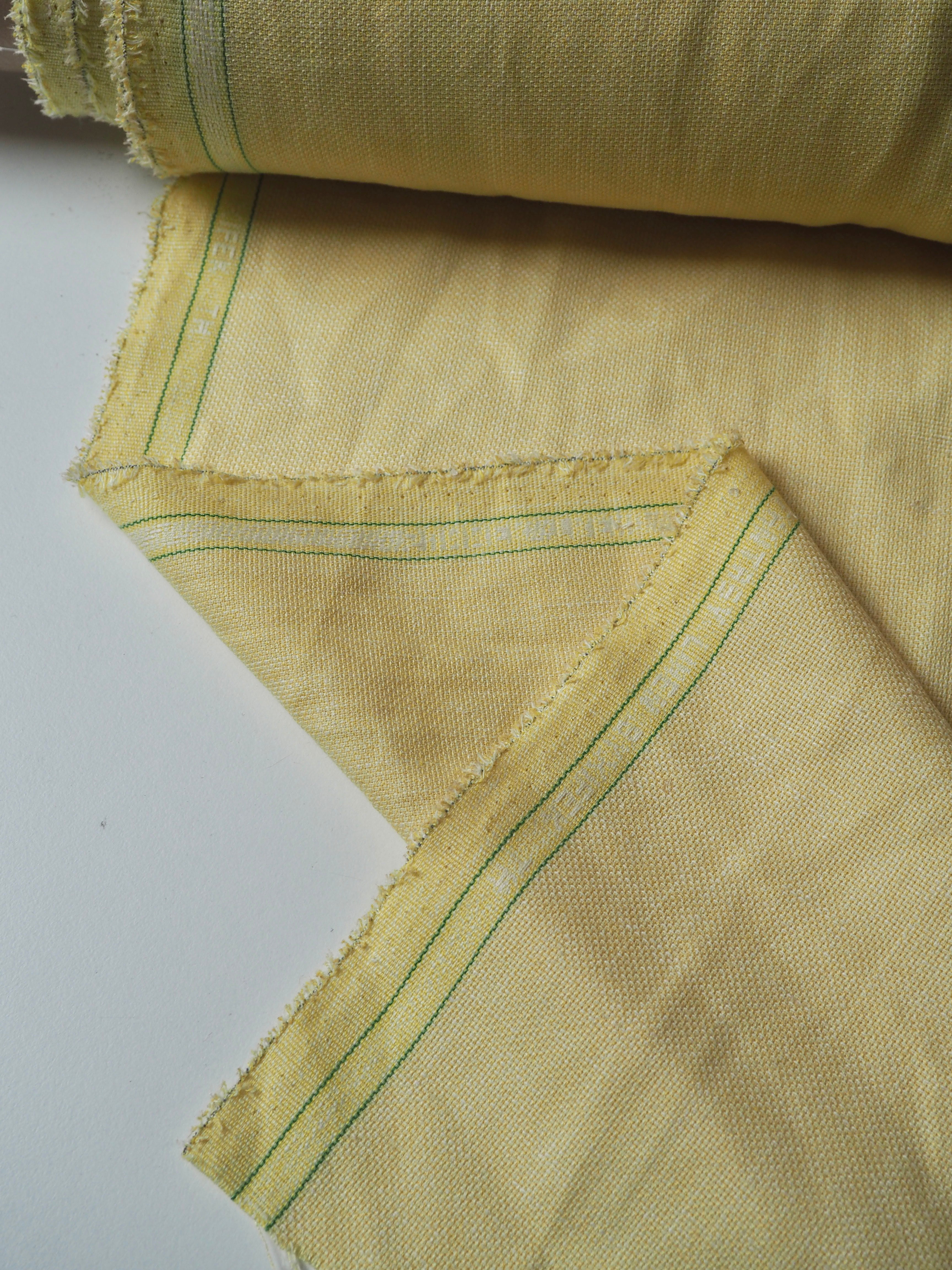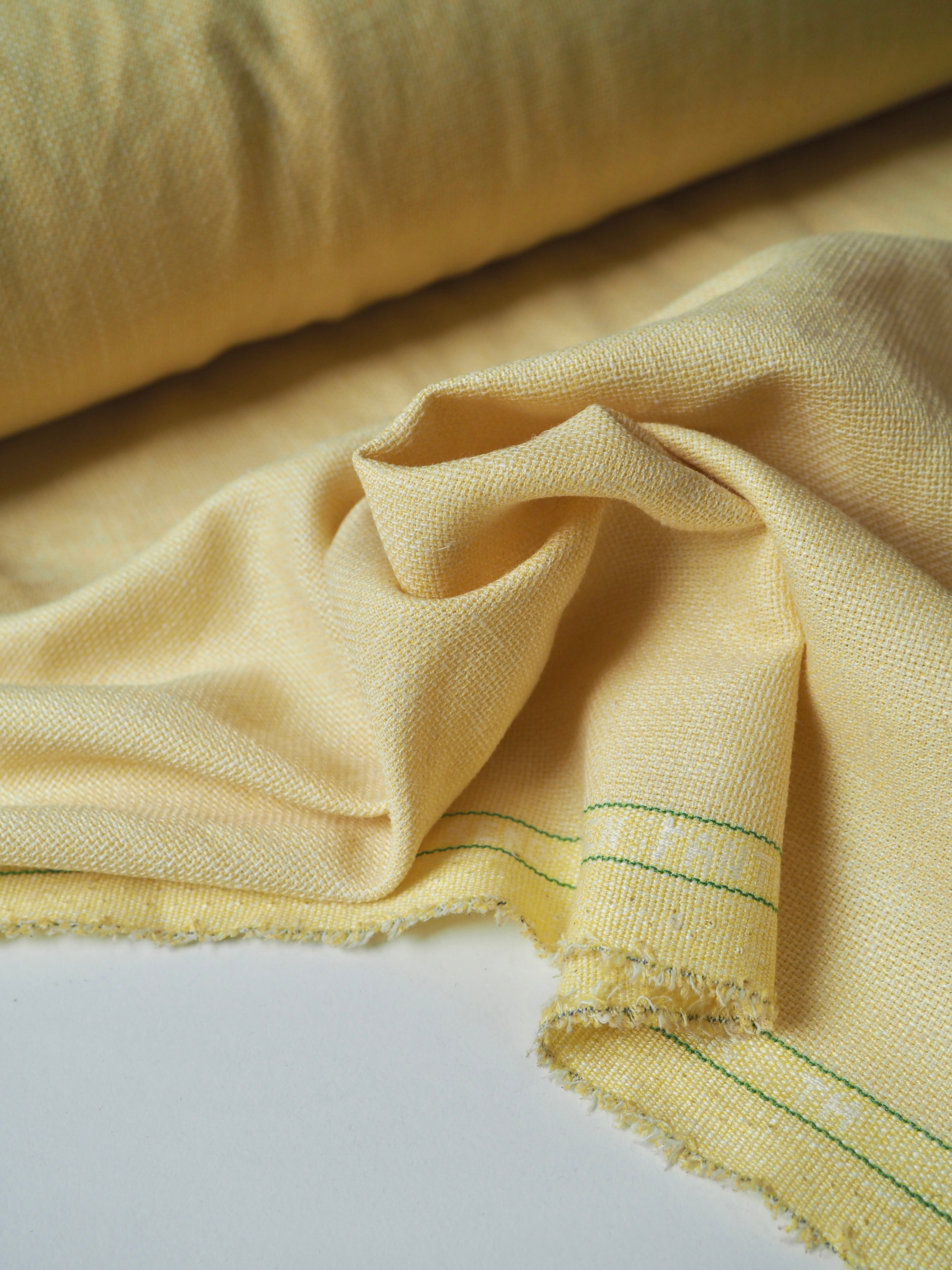 This ex-designer fabric is a suiting. It's in a yellow and white looser weave suiting. It's a linen, polyester, and viscose blend, which gives it a lovely balance of softness, drape, and breathability. Lightweight, with a nice drape and lovely handle. Has a slight sheen finish. Mostly opaque, a little sheer. Perfect for a relaxed blazer, top, or trousers for warmer climates!