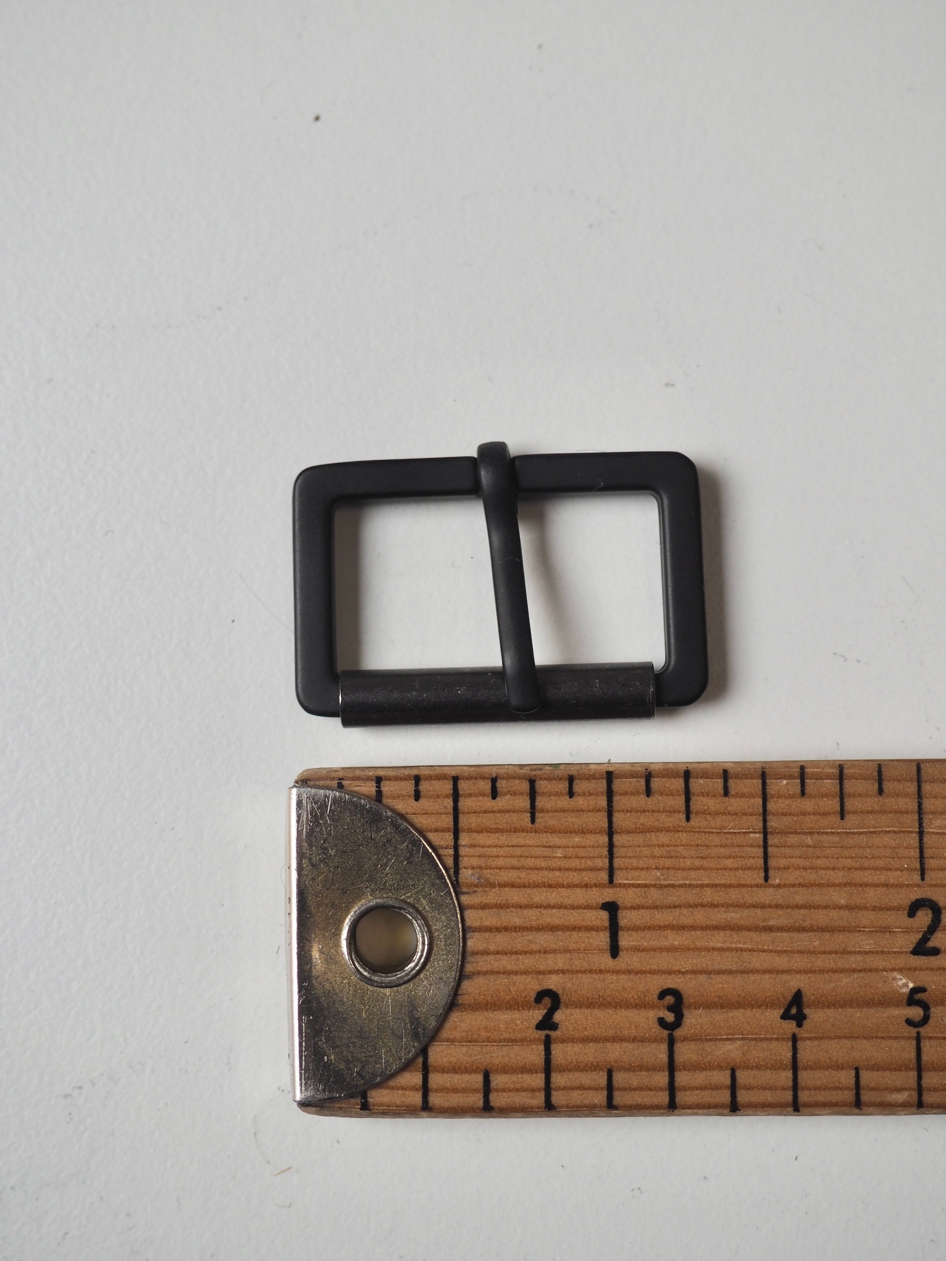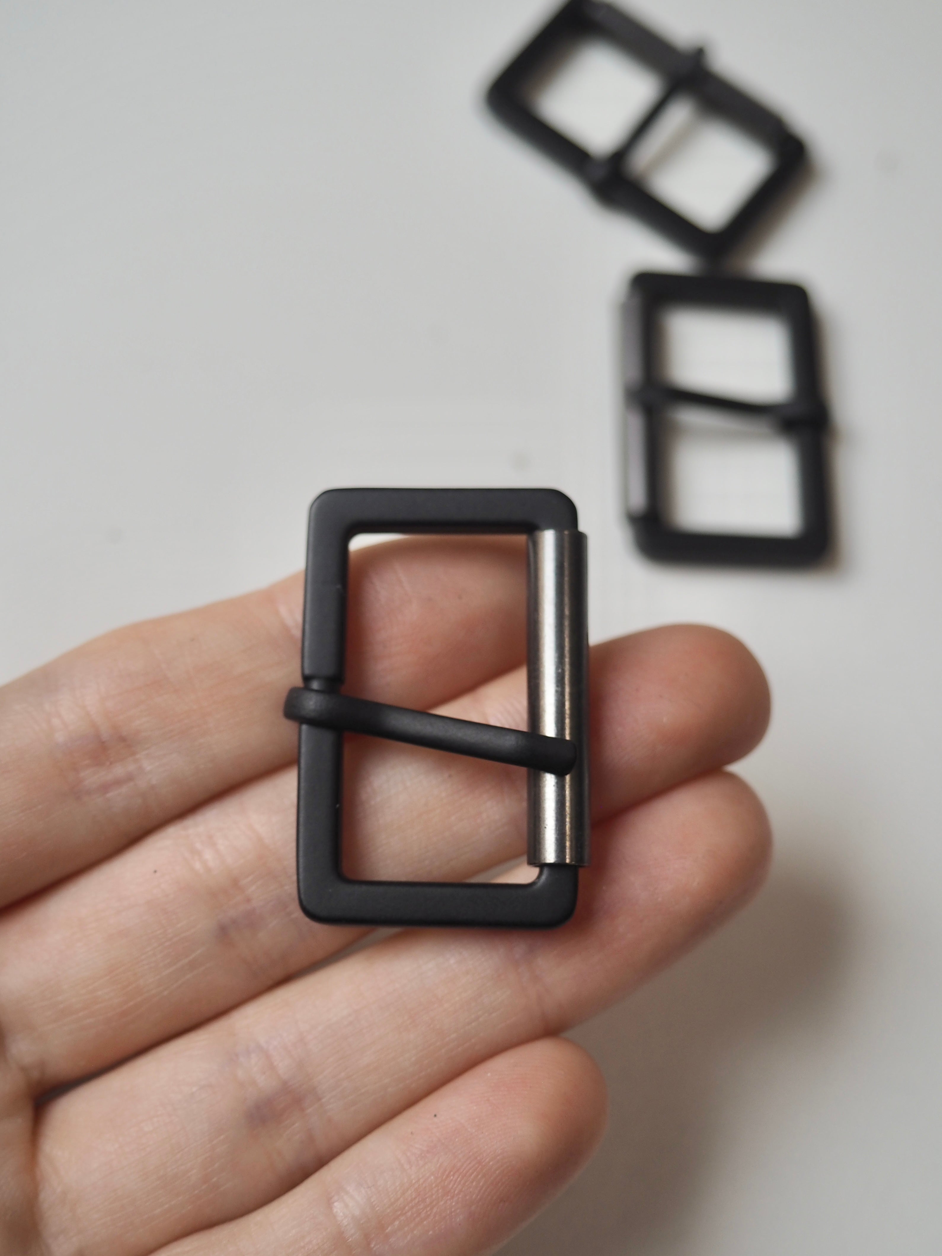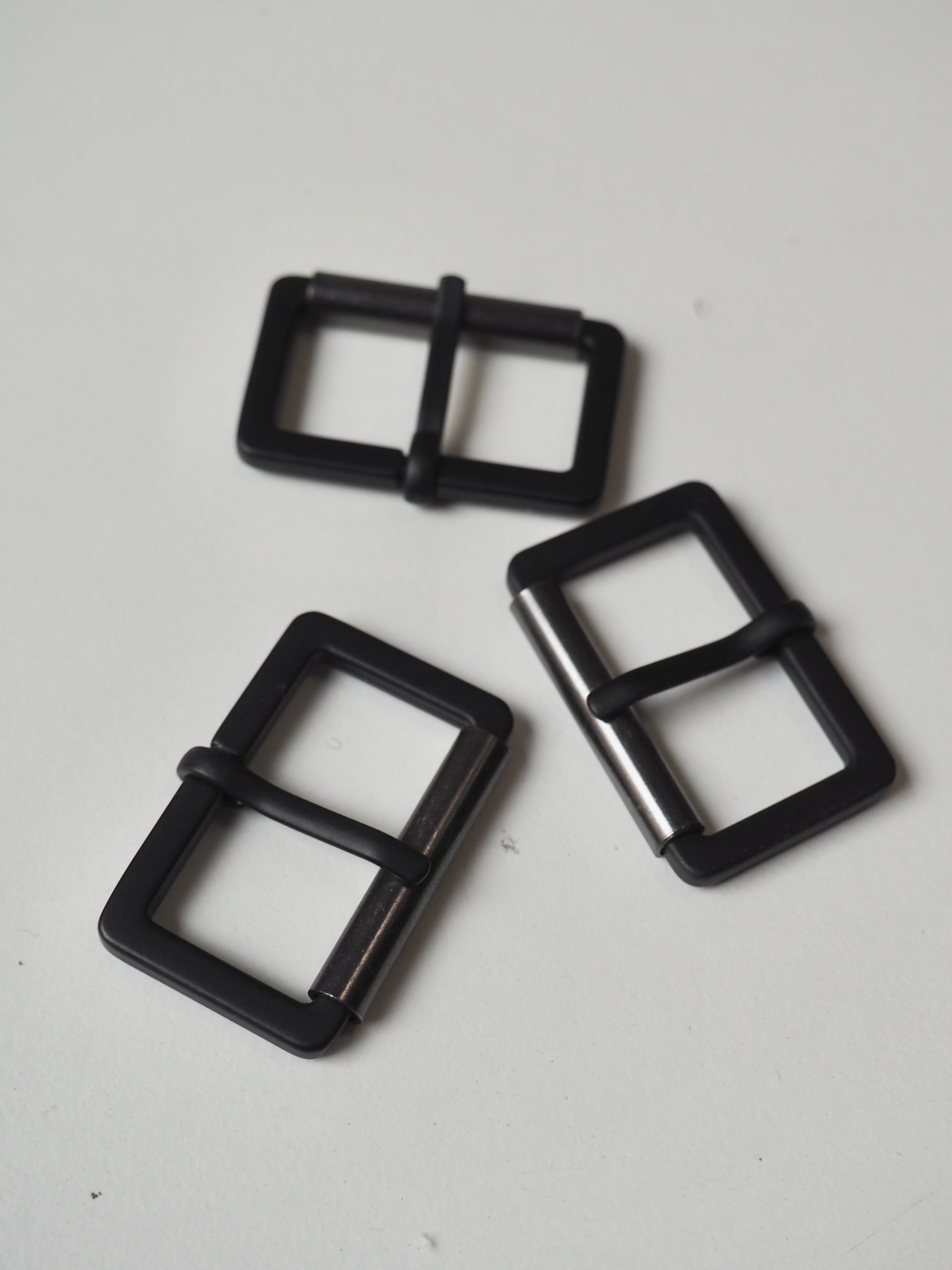 This ex-designer hardware is a buckle. These buckles are perfect for adding to garments or accessories. They are medium weight and have a black matte finish, with a slightly shiny gunmetal roller.