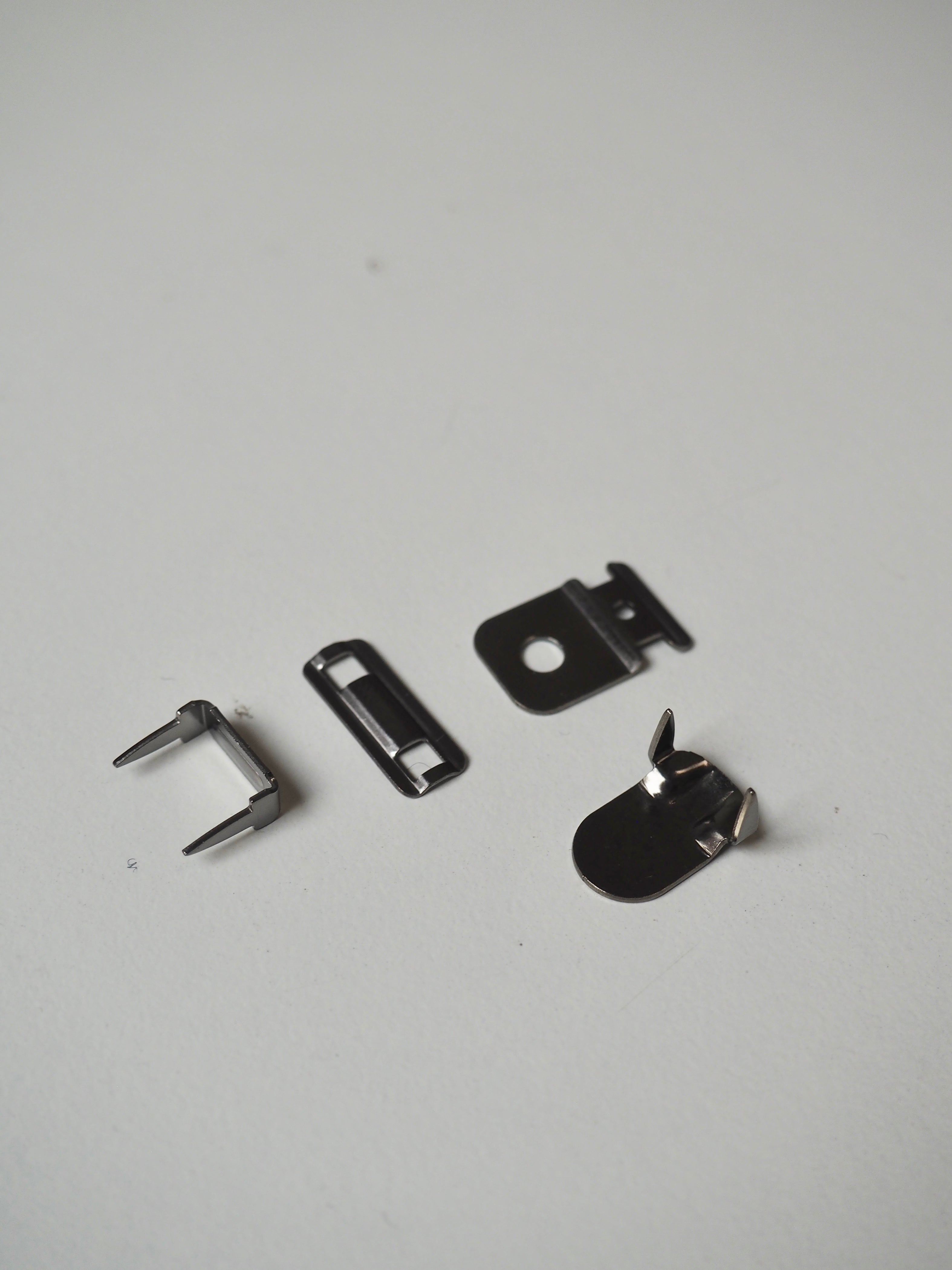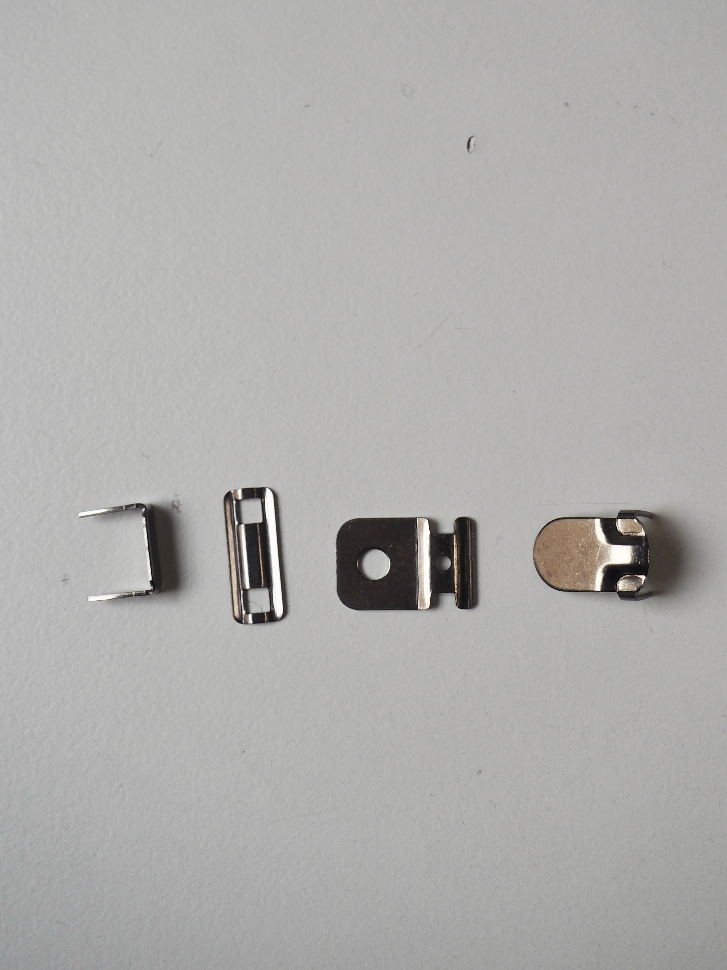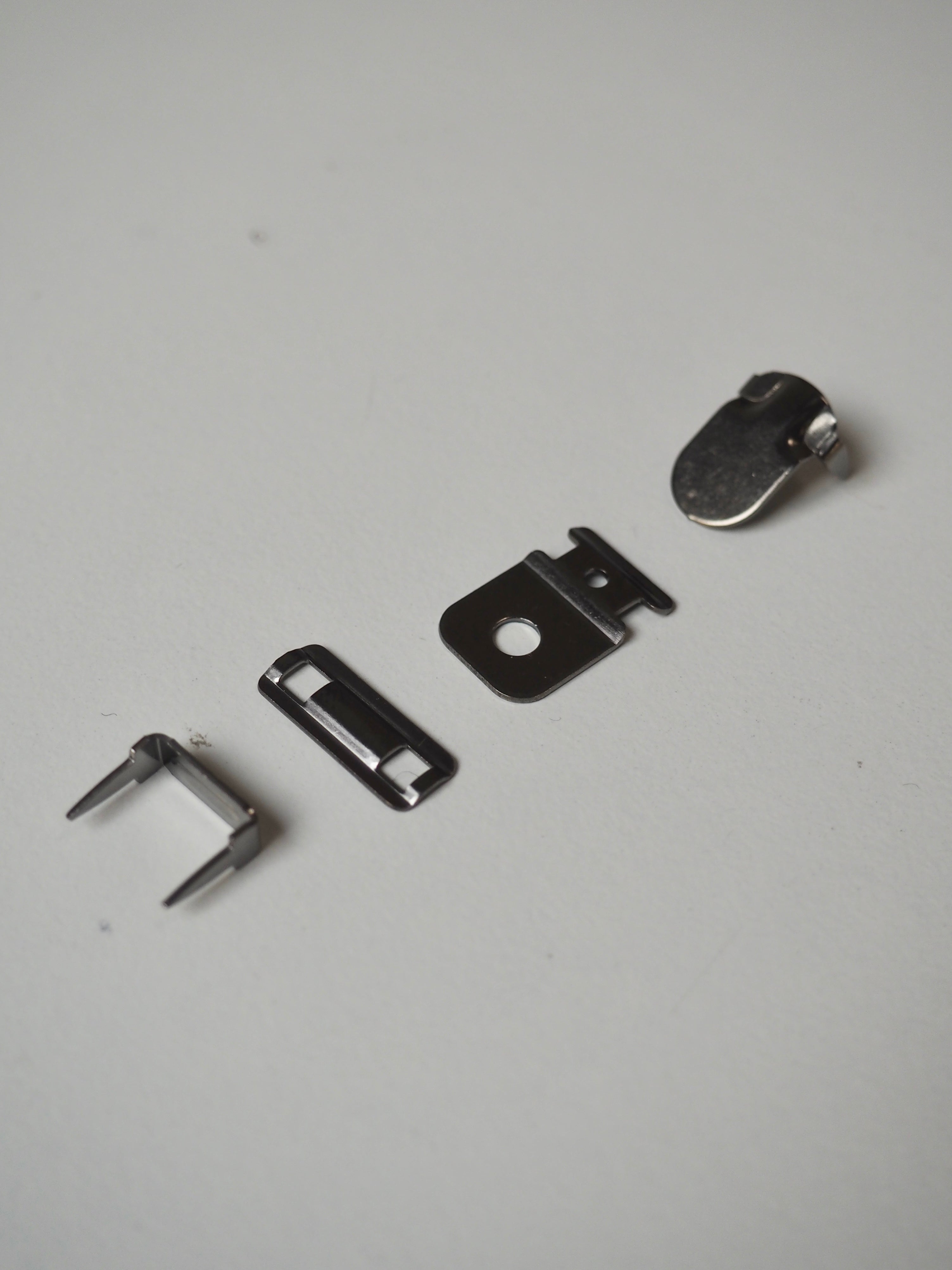 This deadstock hardware is a classic hook and bar in silver. These don't require any sewing, they are attached with teeth that pierce through the fabric and secure around a metal plate. The perfect fastening for elevating me-made trousers and skirts!
