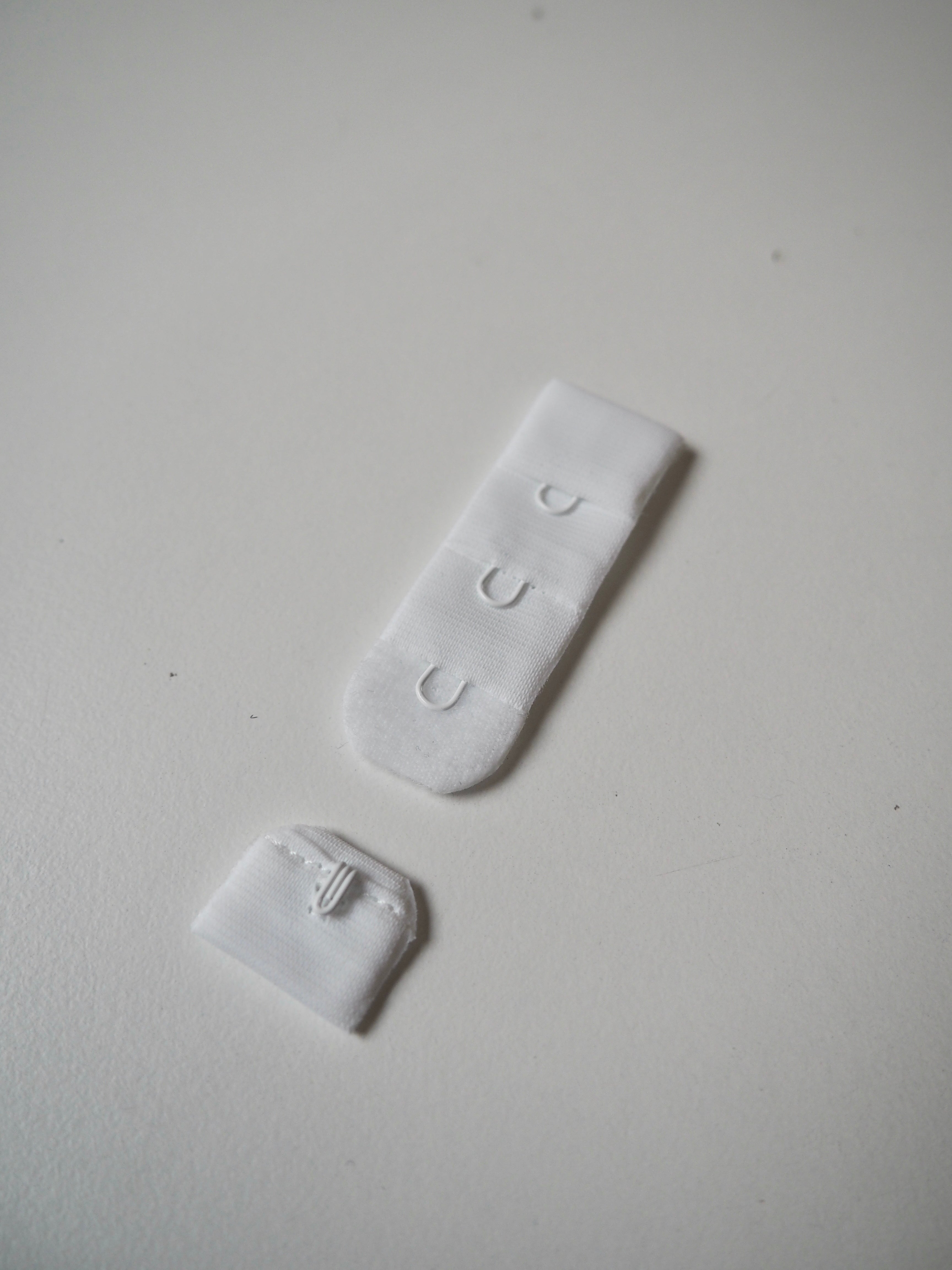Bra hook and eye fastener. Plush material, soft to the touch. Three single hook and eyes give 4cm of adjustable length. One hook to three eyes. Perfect for bra making!