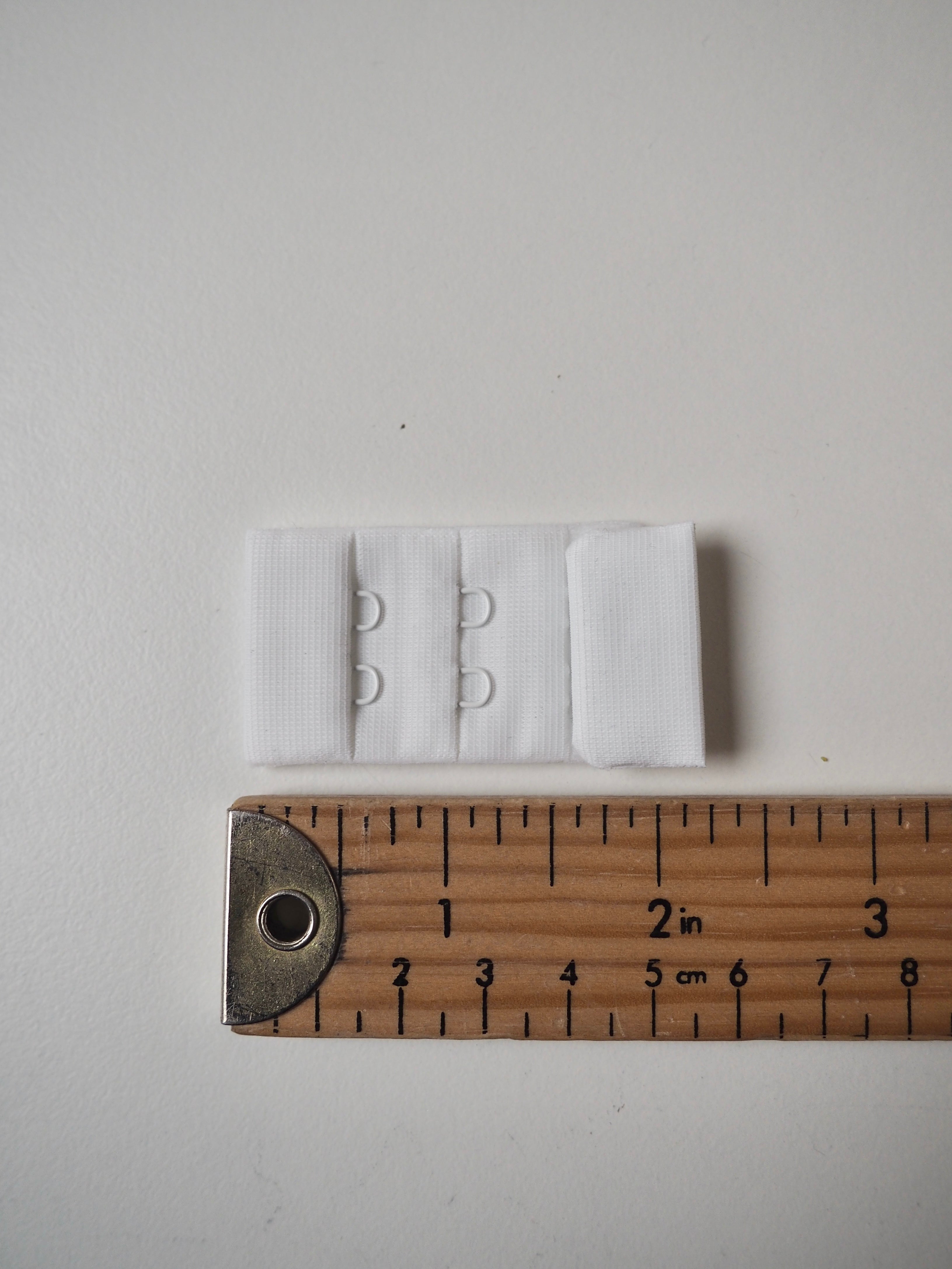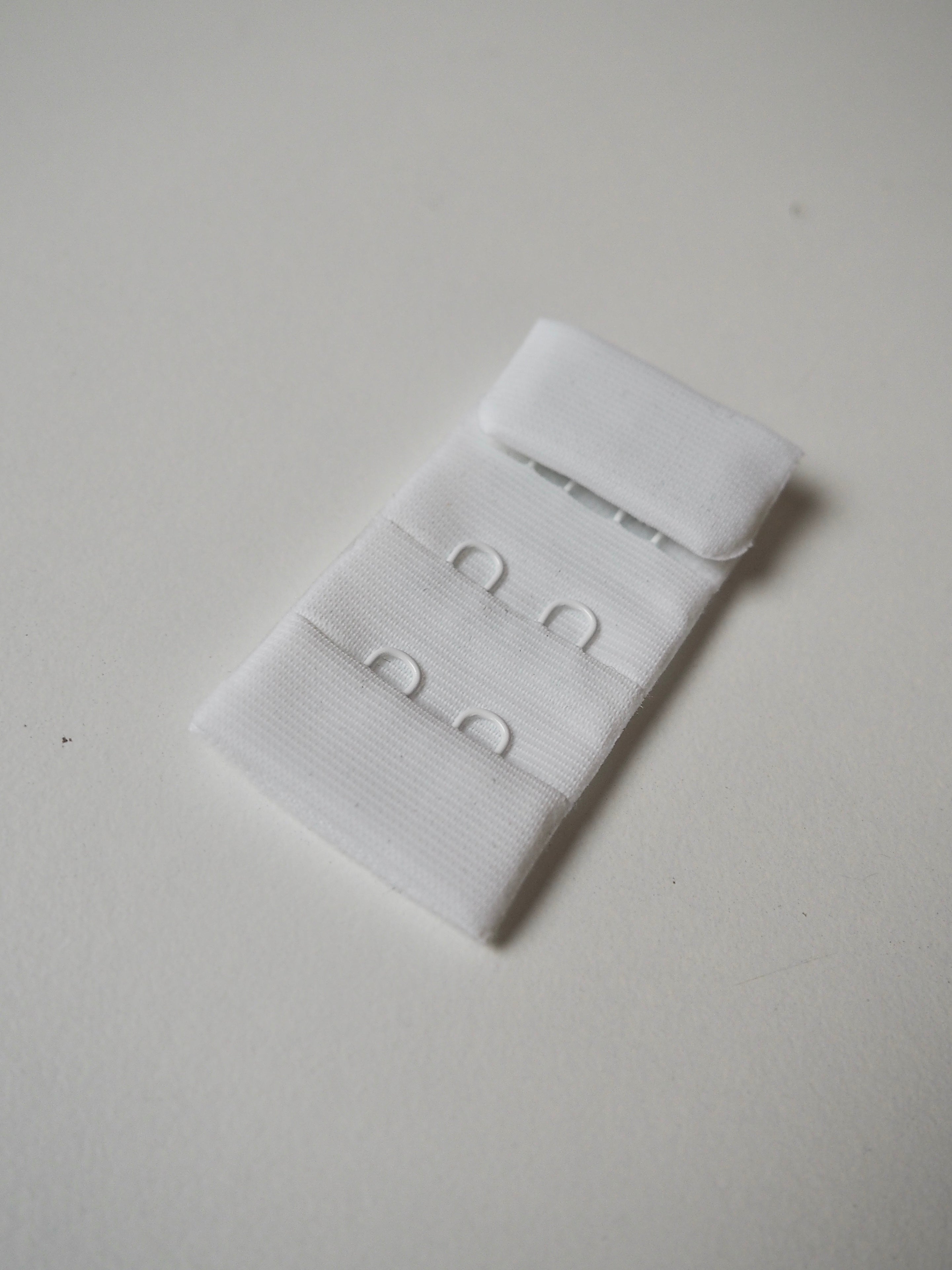 Bra hook and eye fastener. Plush material, soft to the touch. Three double hook and eyes give 4cm of adjustable length. One hook to three sets of eyes. Perfect for bra making!
