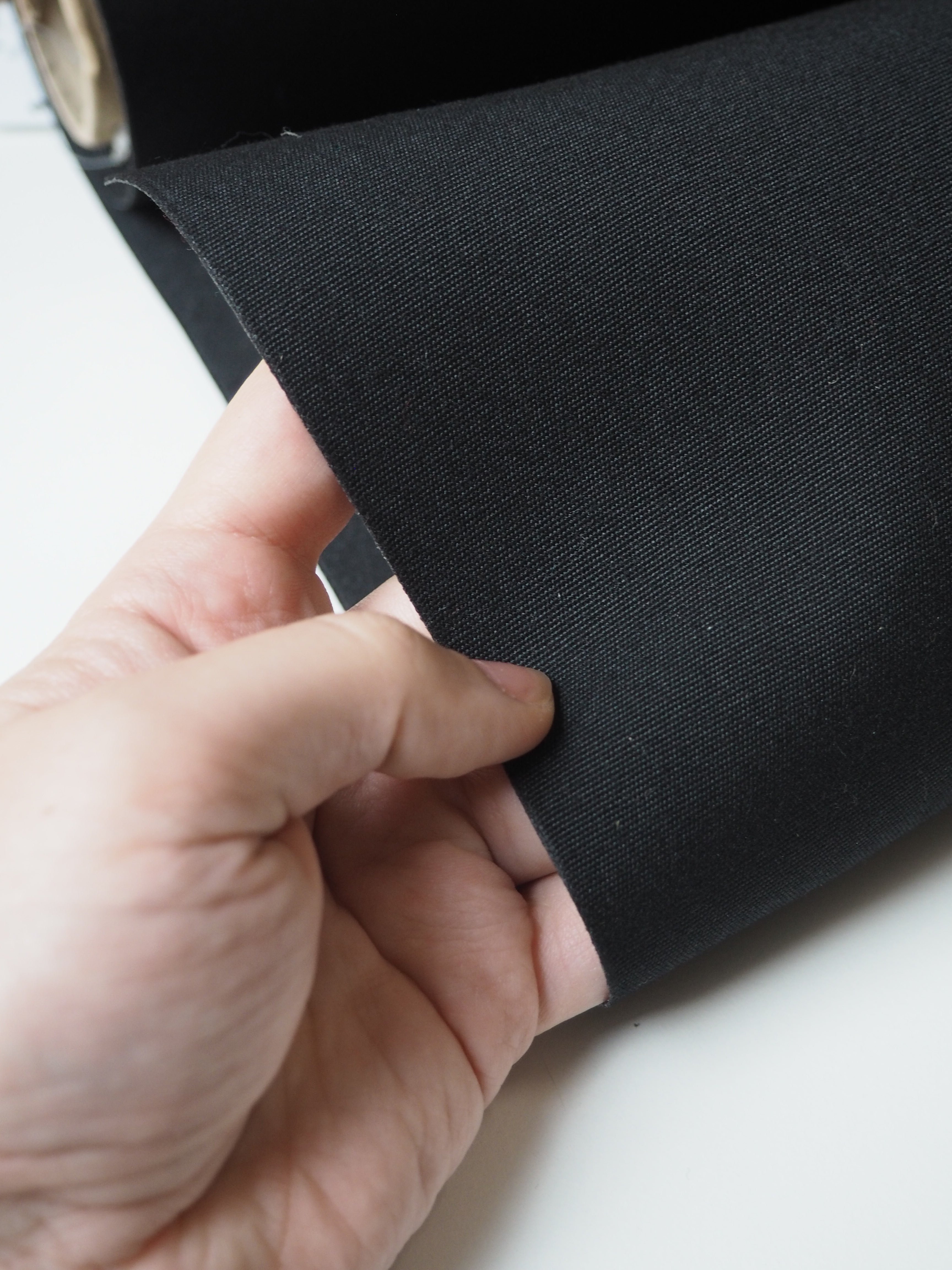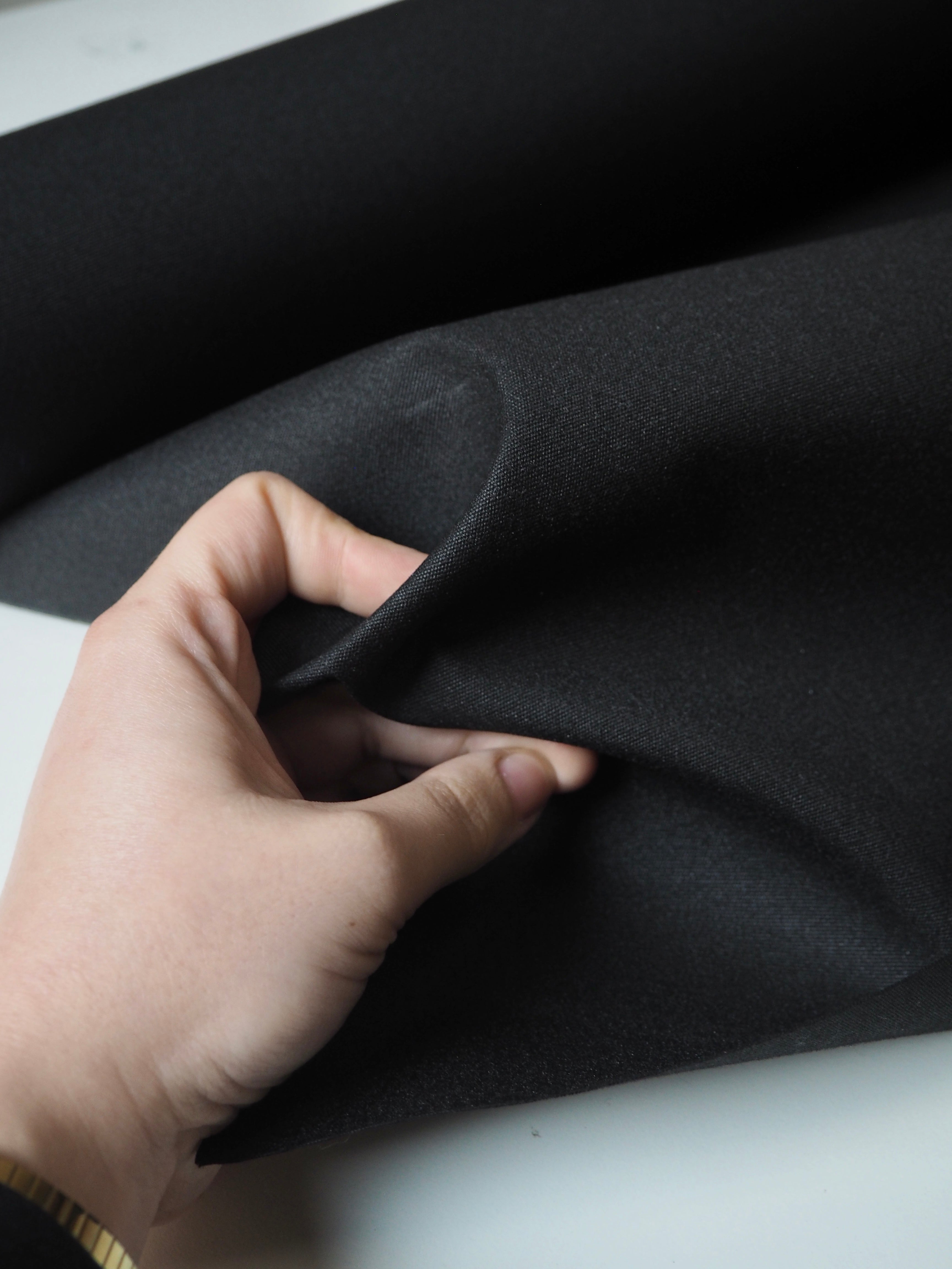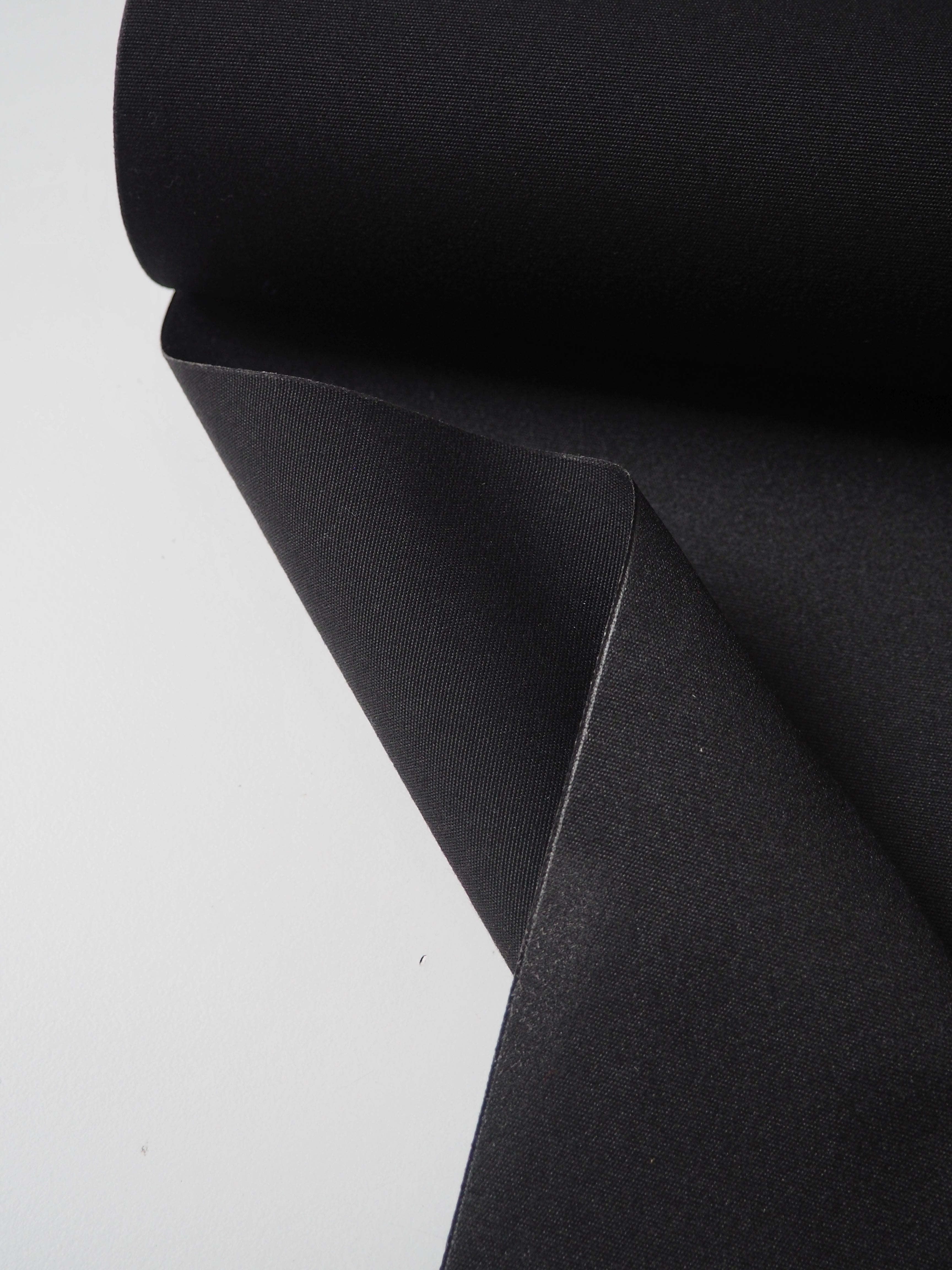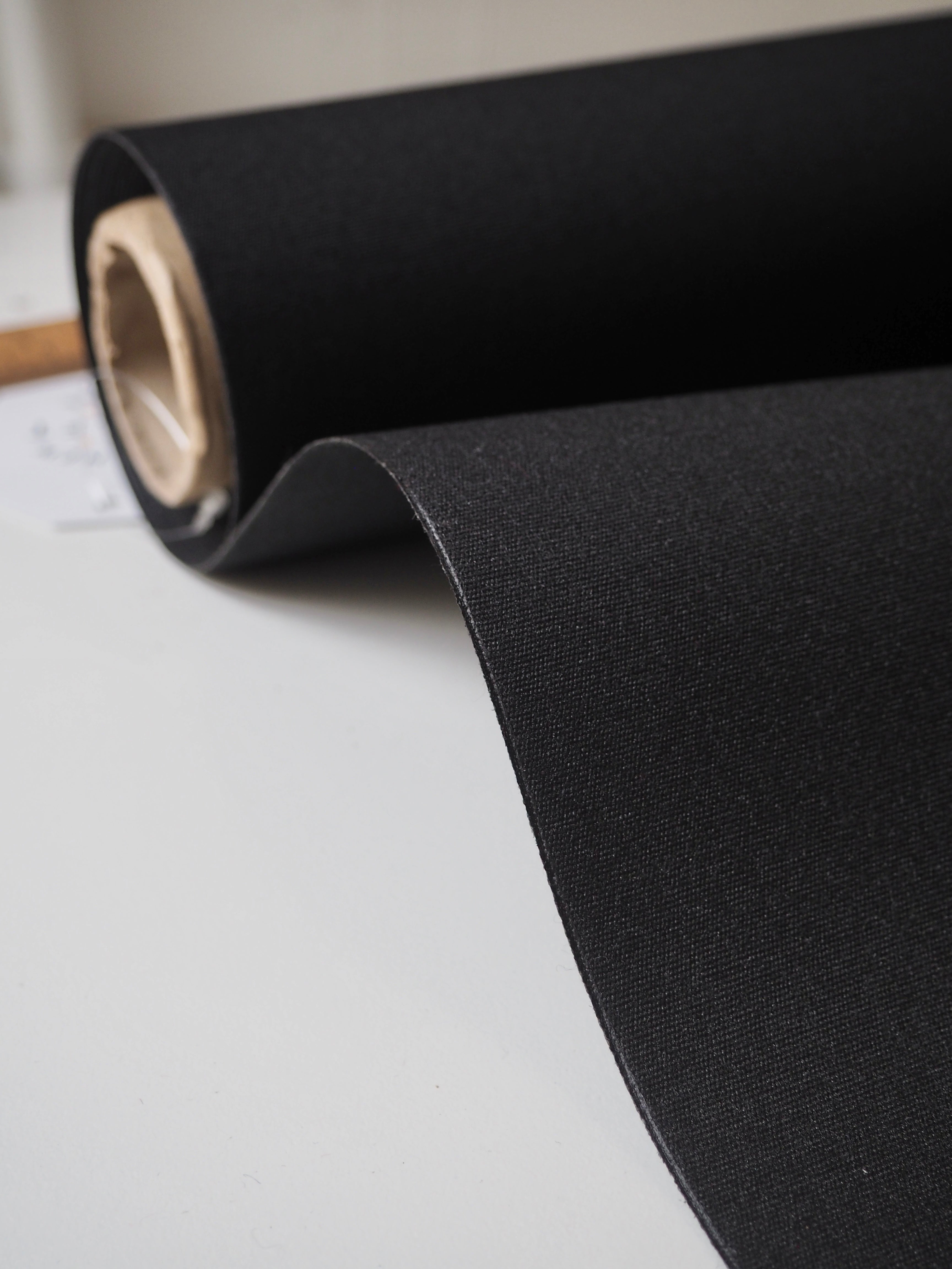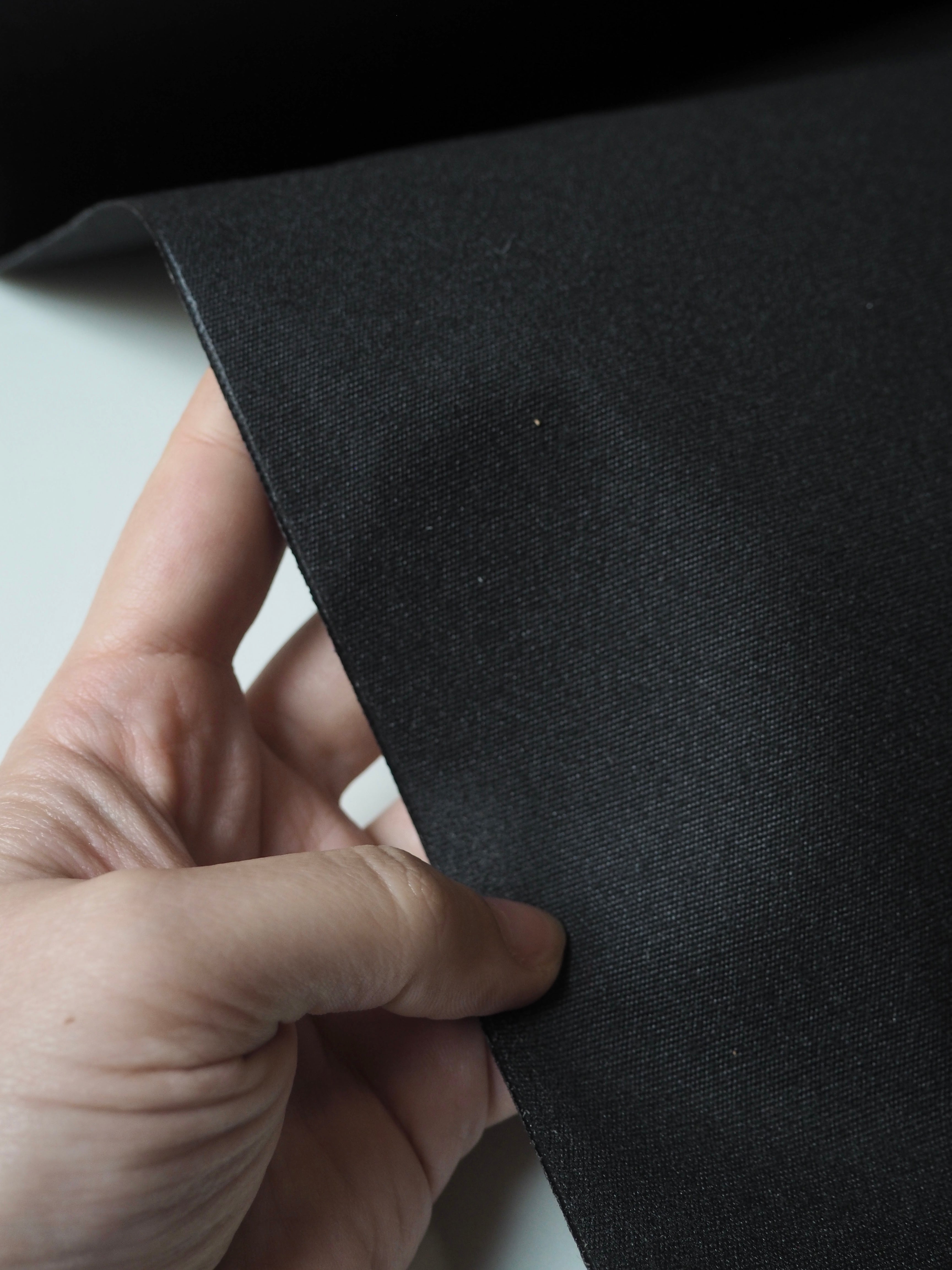 This ex-designer fabric is a canvas. It's black with a coated backing. Lightweight with a typical canvas weave and sturdy handle. It's a very structured canvas made for furnishing projects, but can be used as you like!