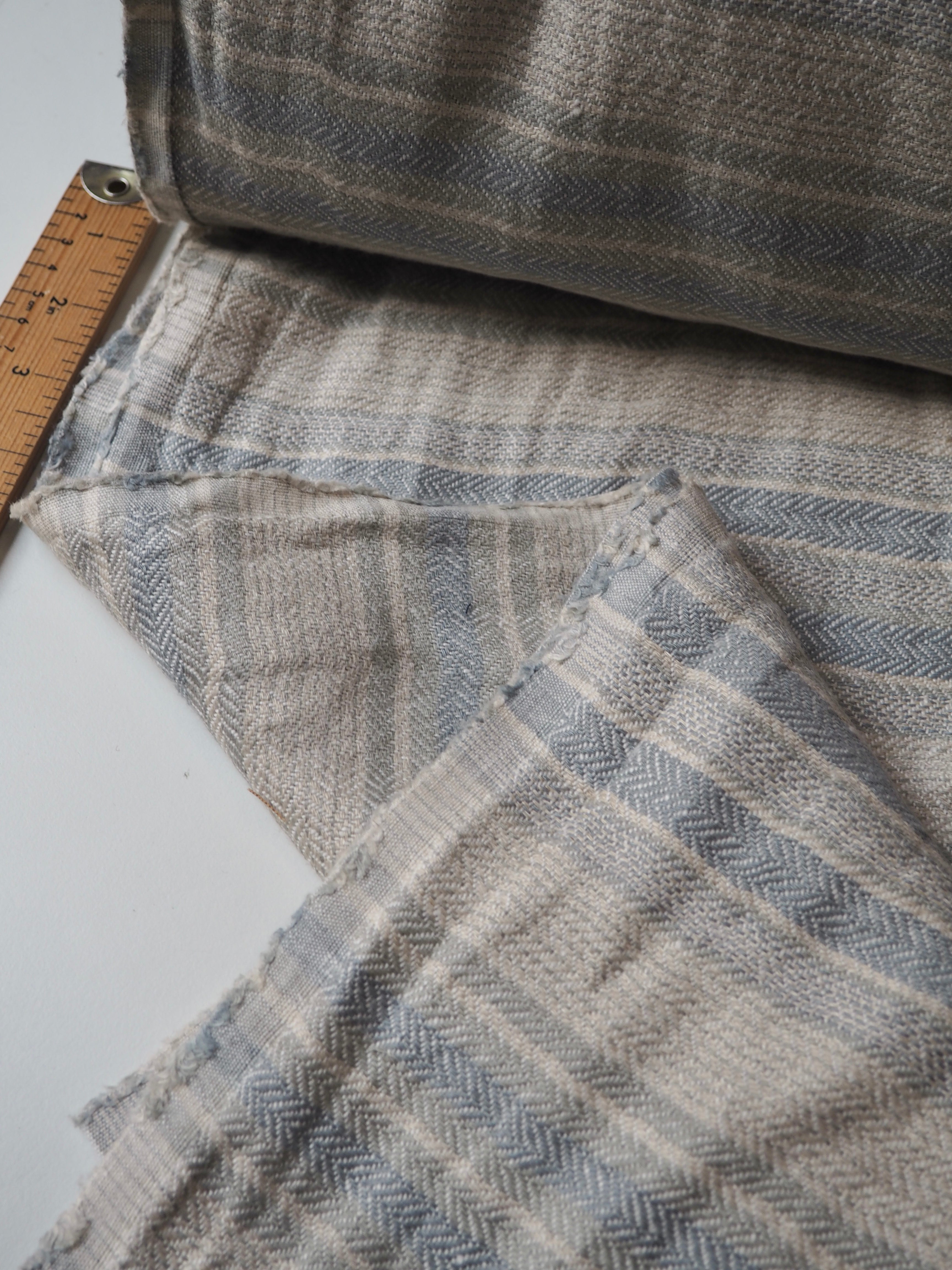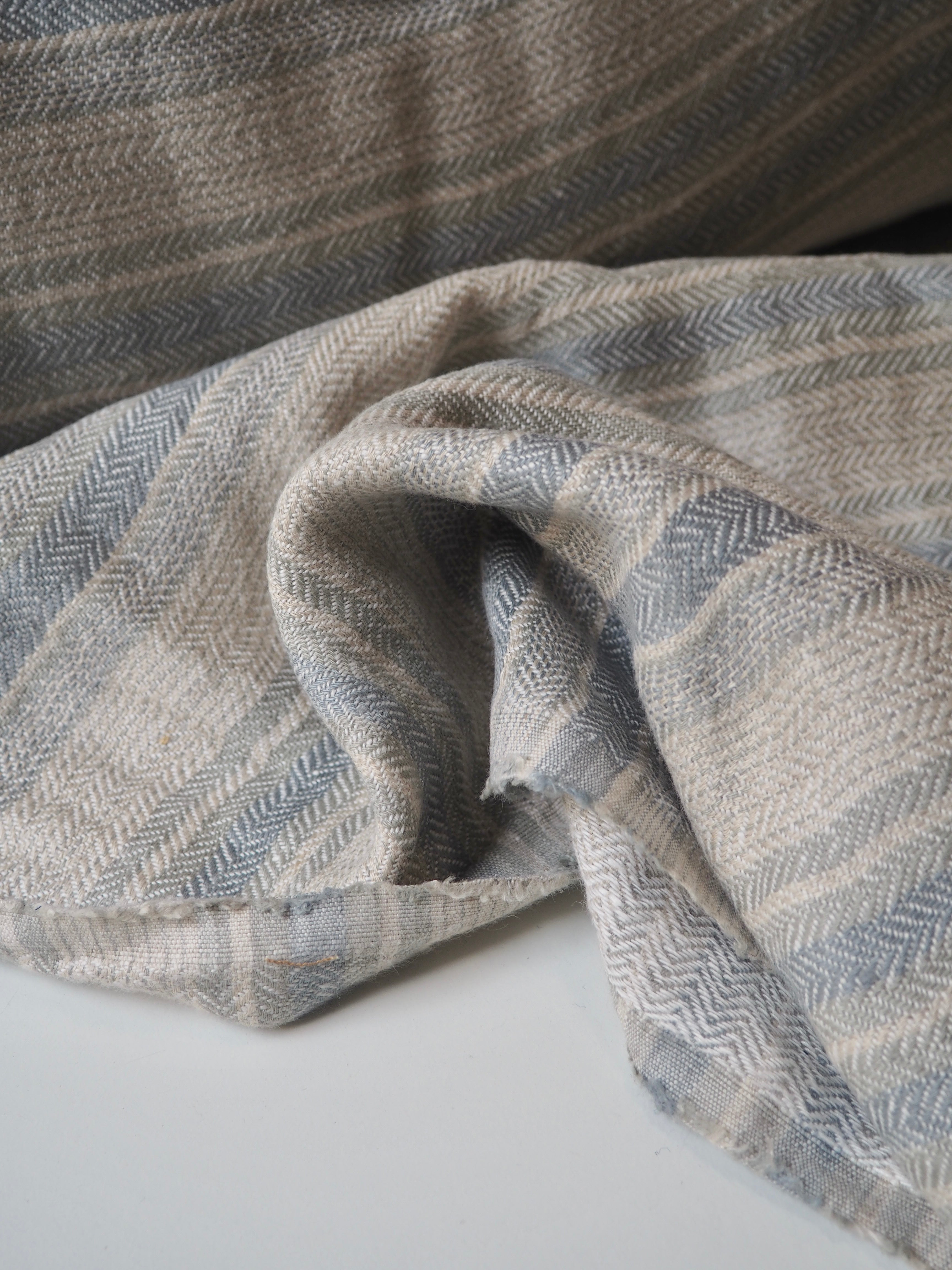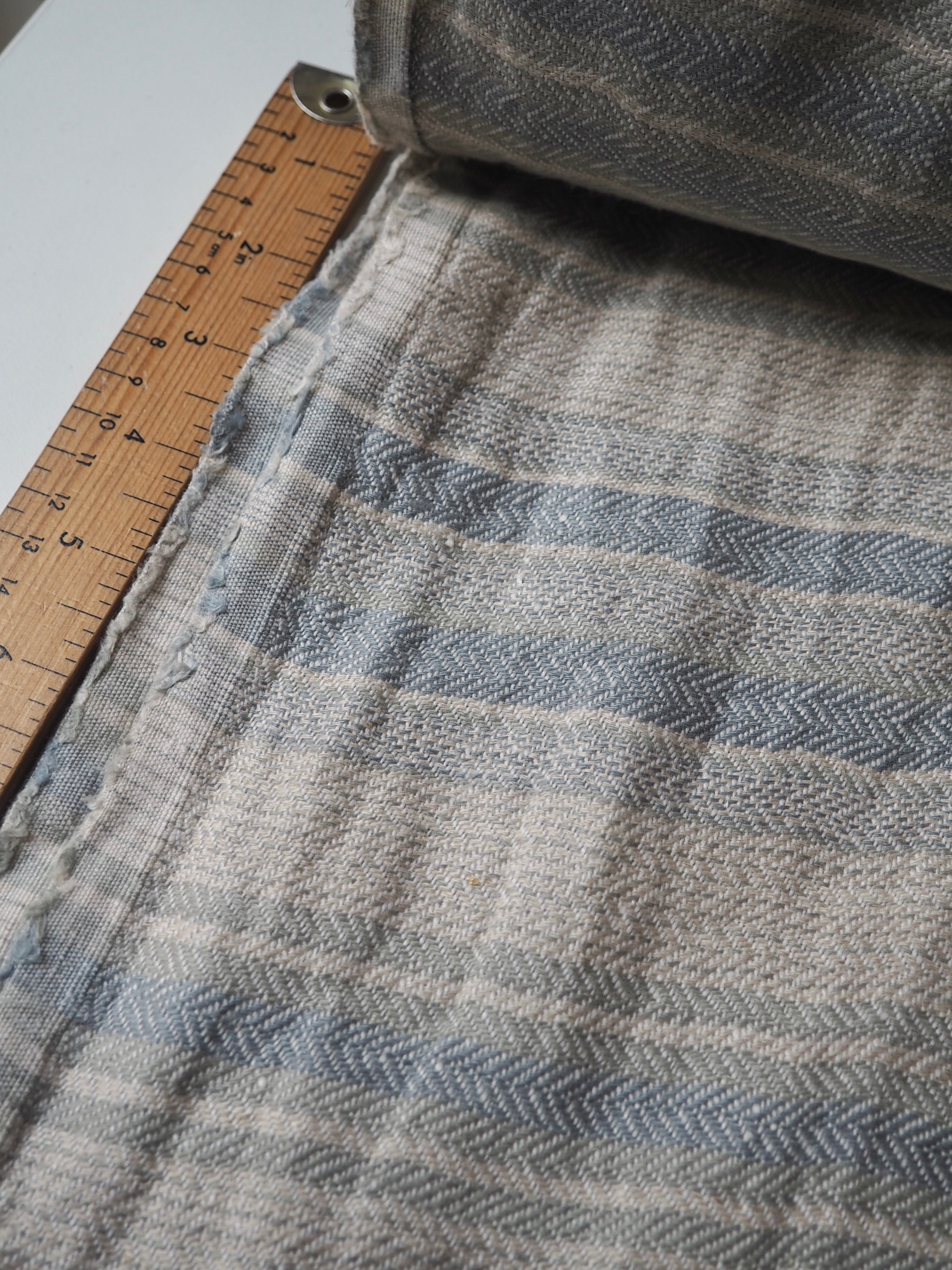 This ex-designer fabric is an extra wide linen. It has a sturdy but not heavy weave, with a visual texture and subtle herringbone-like texture in a medium weight. Stripes weave down the weft. Has a washed-like handle and a worn-in look. Very soft and fully opaque, and beautiful quality. Has a soft structure, but still drapes nicely. From a home interiors company. Perfect for drapes!