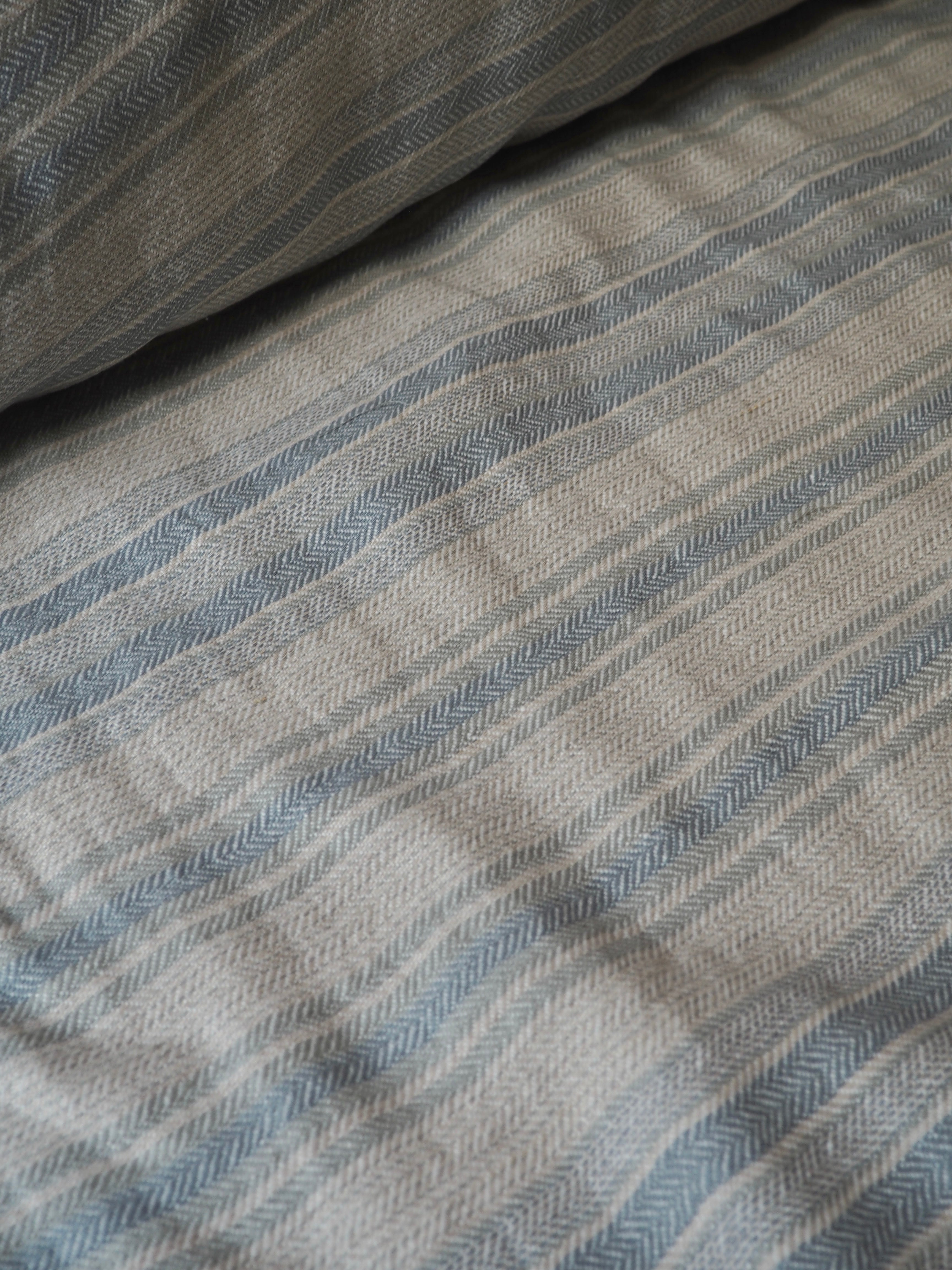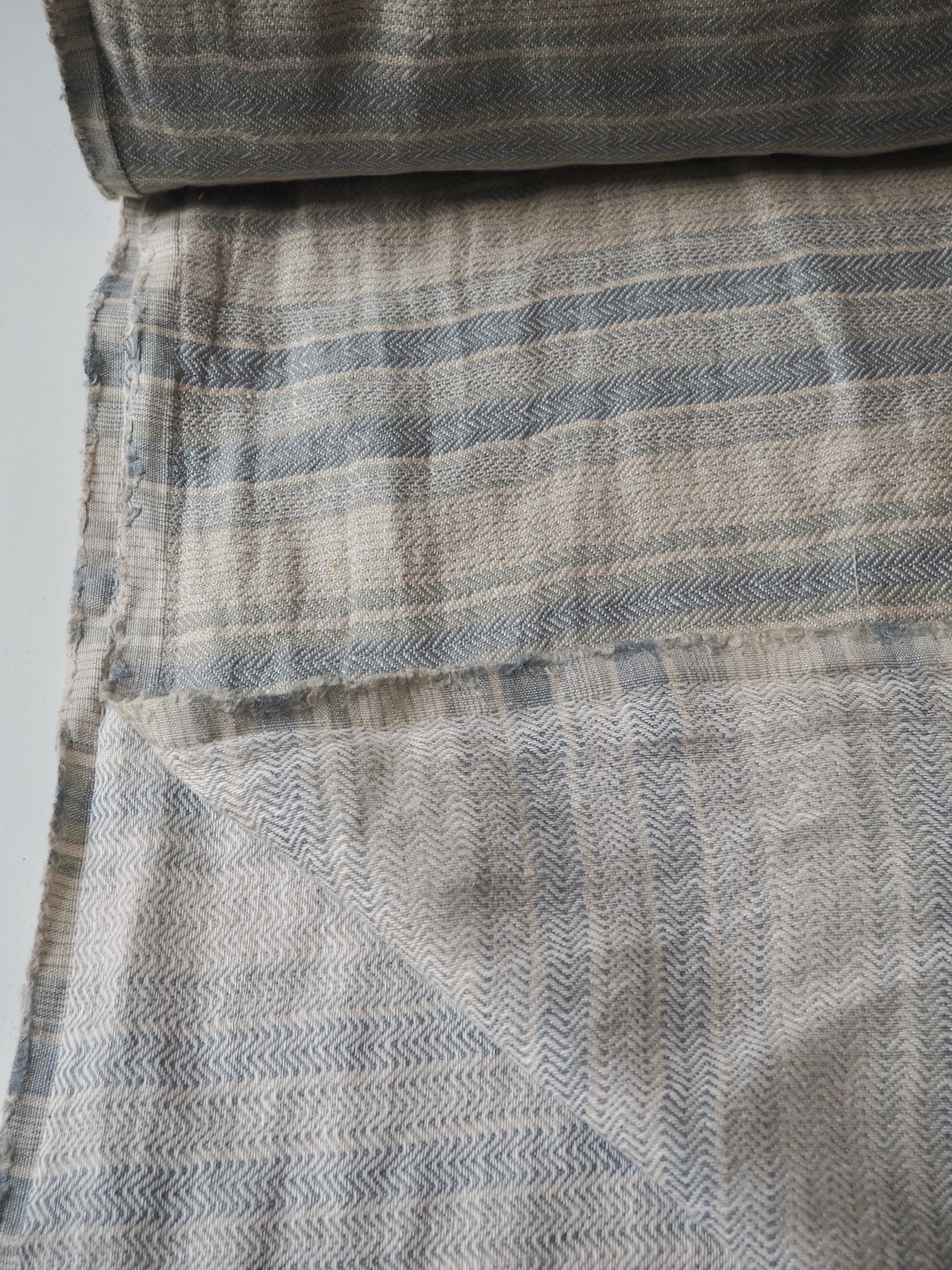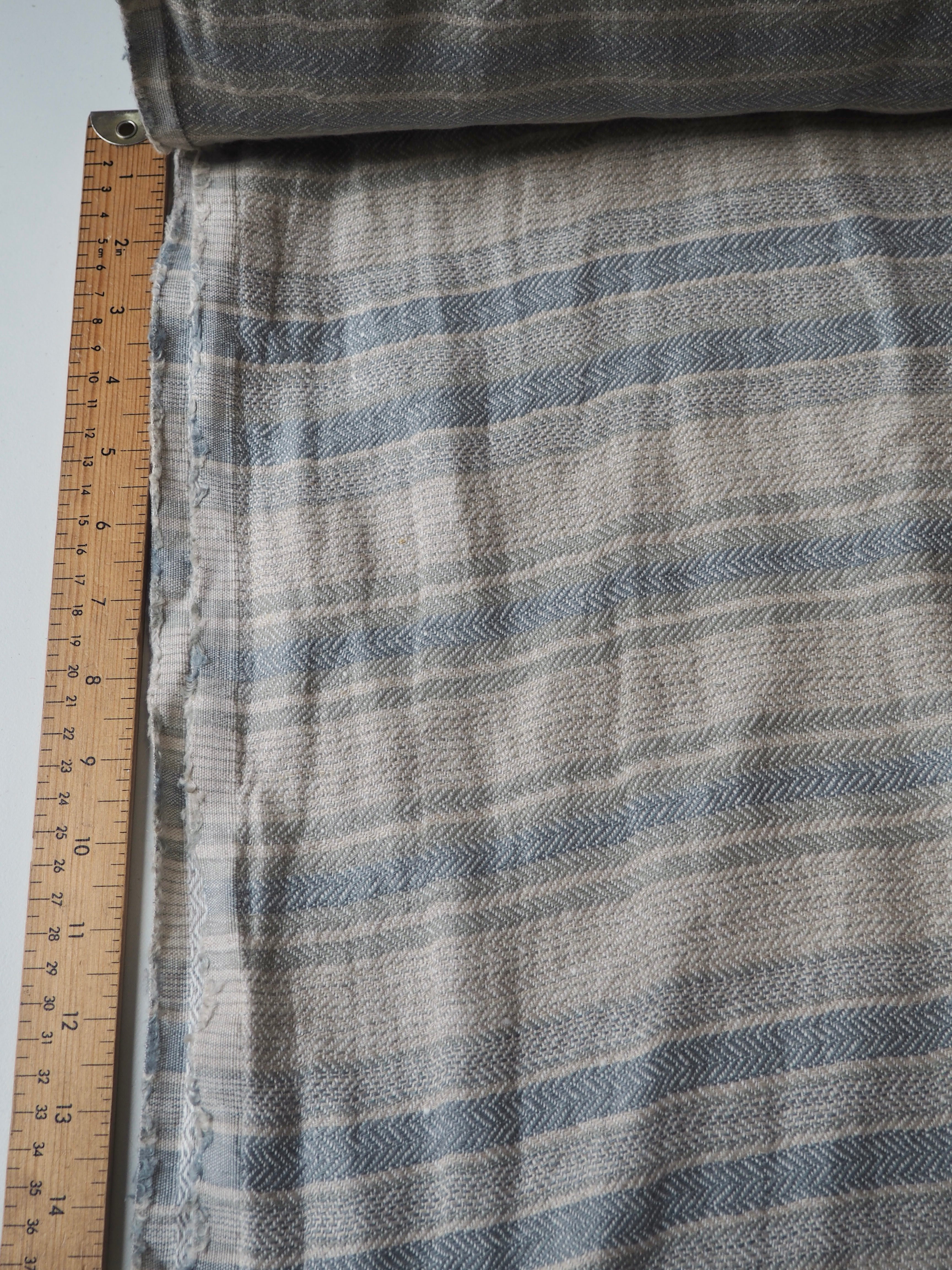 This ex-designer fabric is an extra wide linen. It has a sturdy but not heavy weave, with a visual texture and subtle herringbone-like texture in a medium weight. Stripes weave down the weft. Has a washed-like handle and a worn-in look. Very soft and fully opaque, and beautiful quality. Has a soft structure, but still drapes nicely. From a home interiors company. Perfect for drapes!