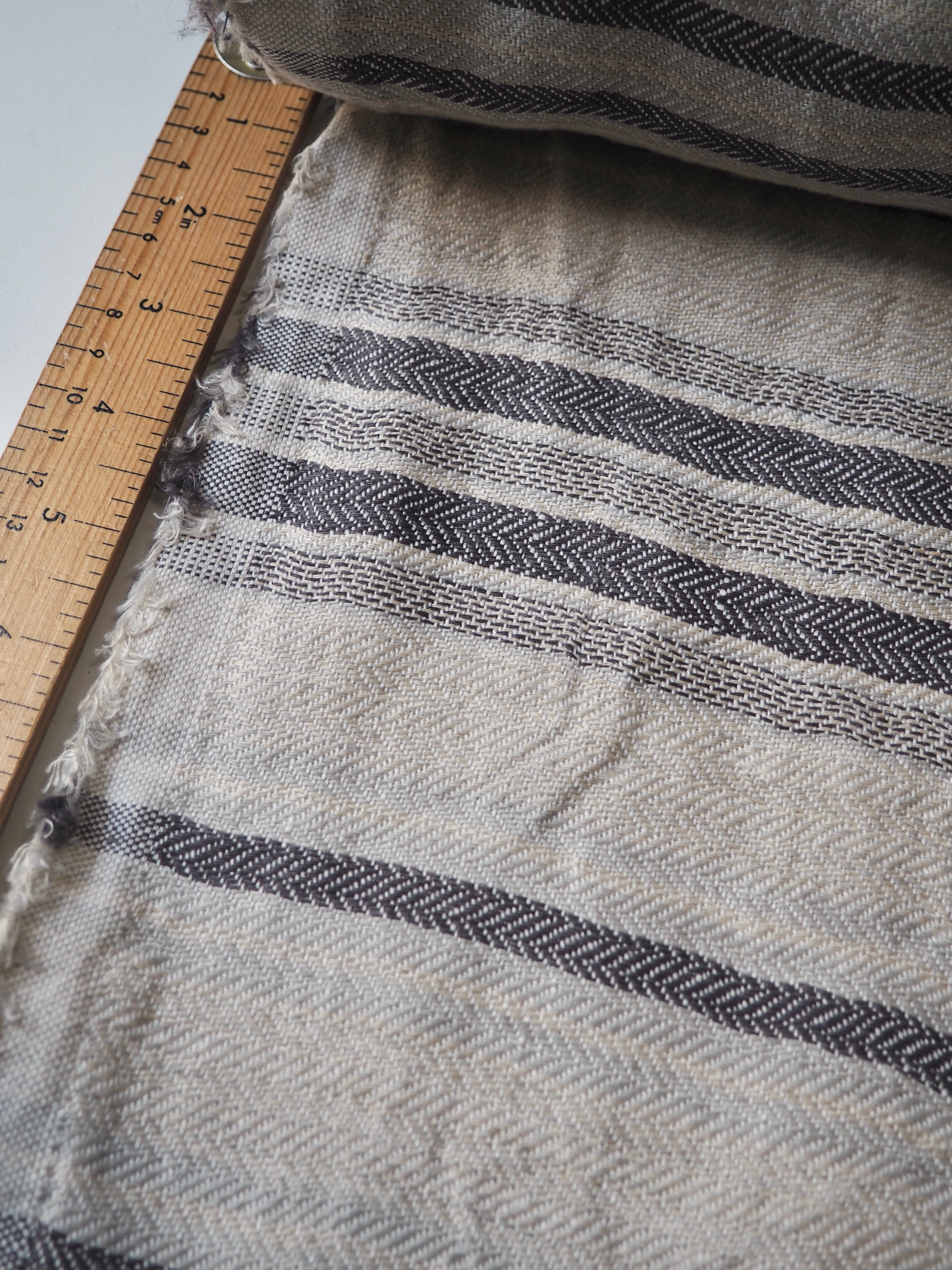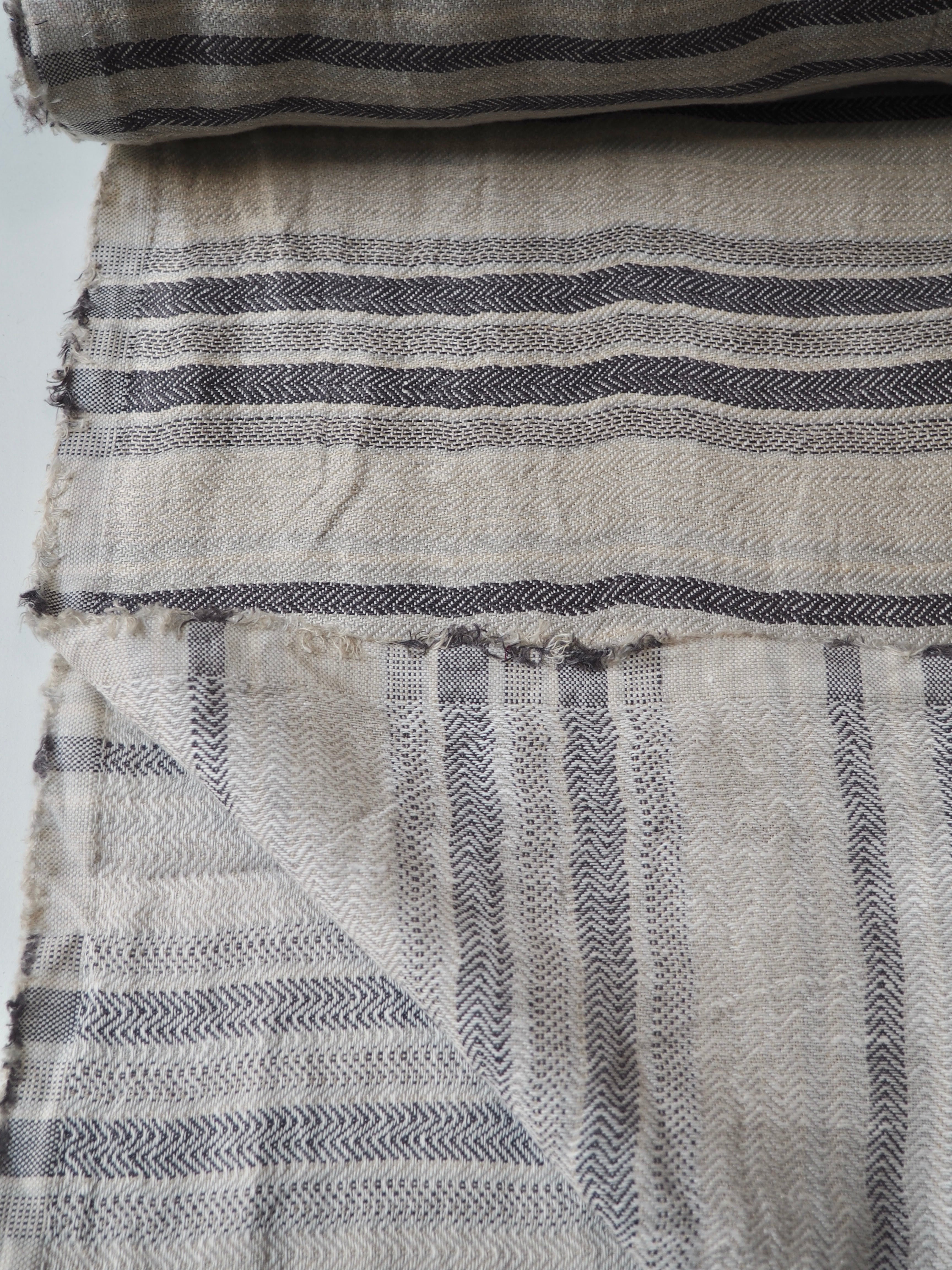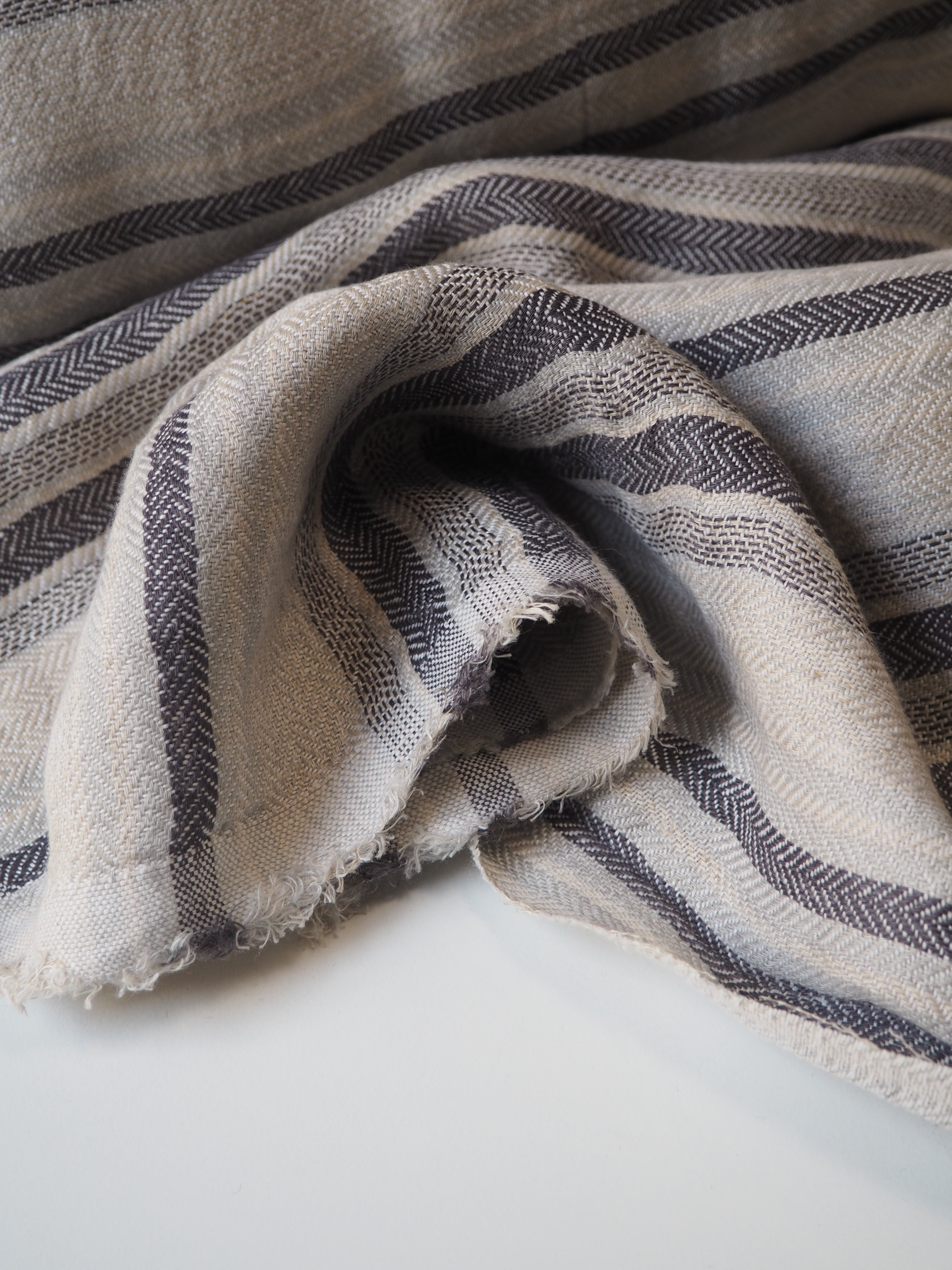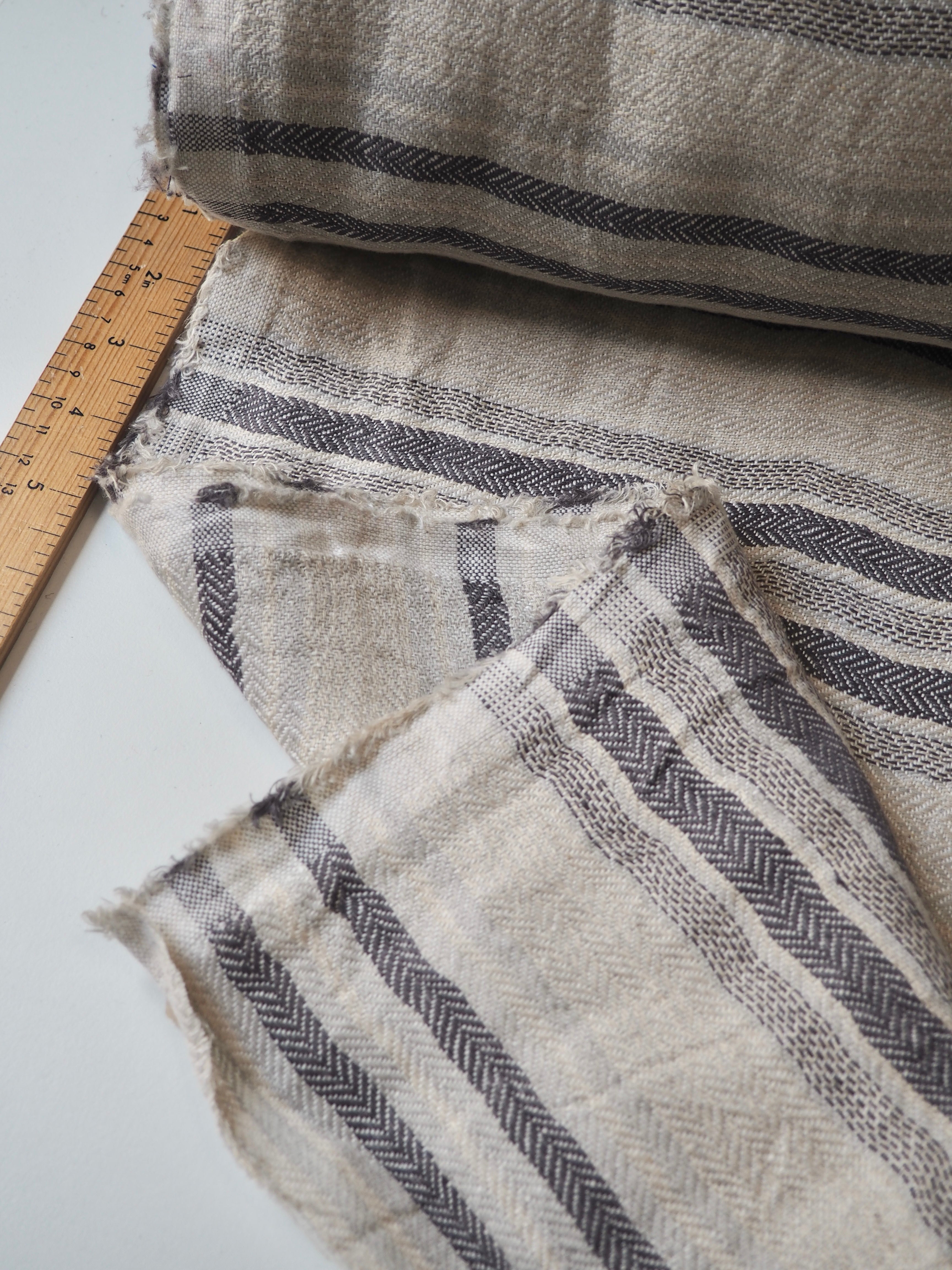This ex-designer fabric is an extra wide linen. It has a sturdy but not heavy weave, with a visual texture and subtle herringbone-like texture in a medium weight. Stripes weave down the weft. Has a washed-like handle and a worn-in look. Very soft and fully opaque, and beautiful quality. Has a soft structure, but still drapes nicely. From a home interiors company. Perfect for drapes!