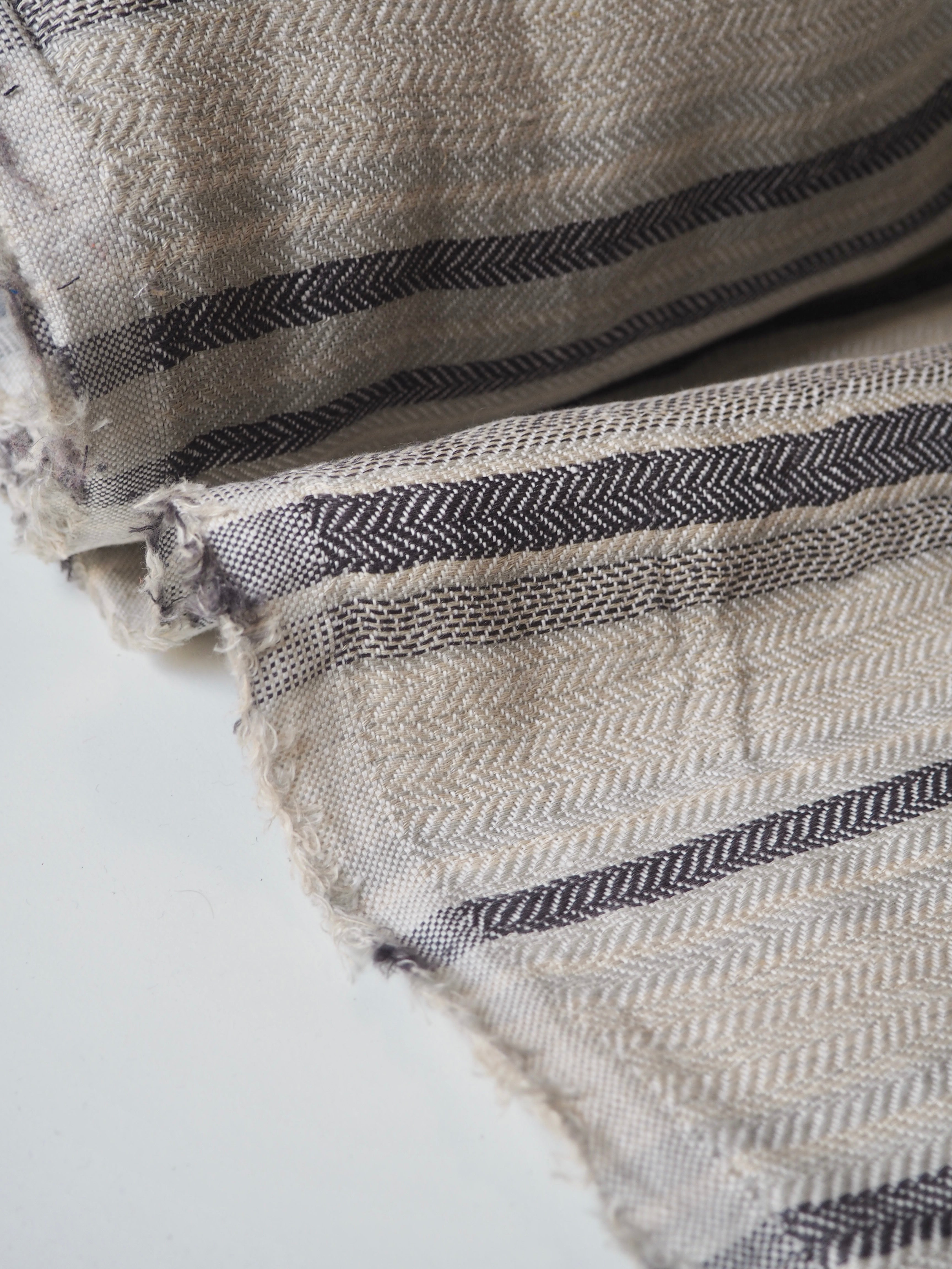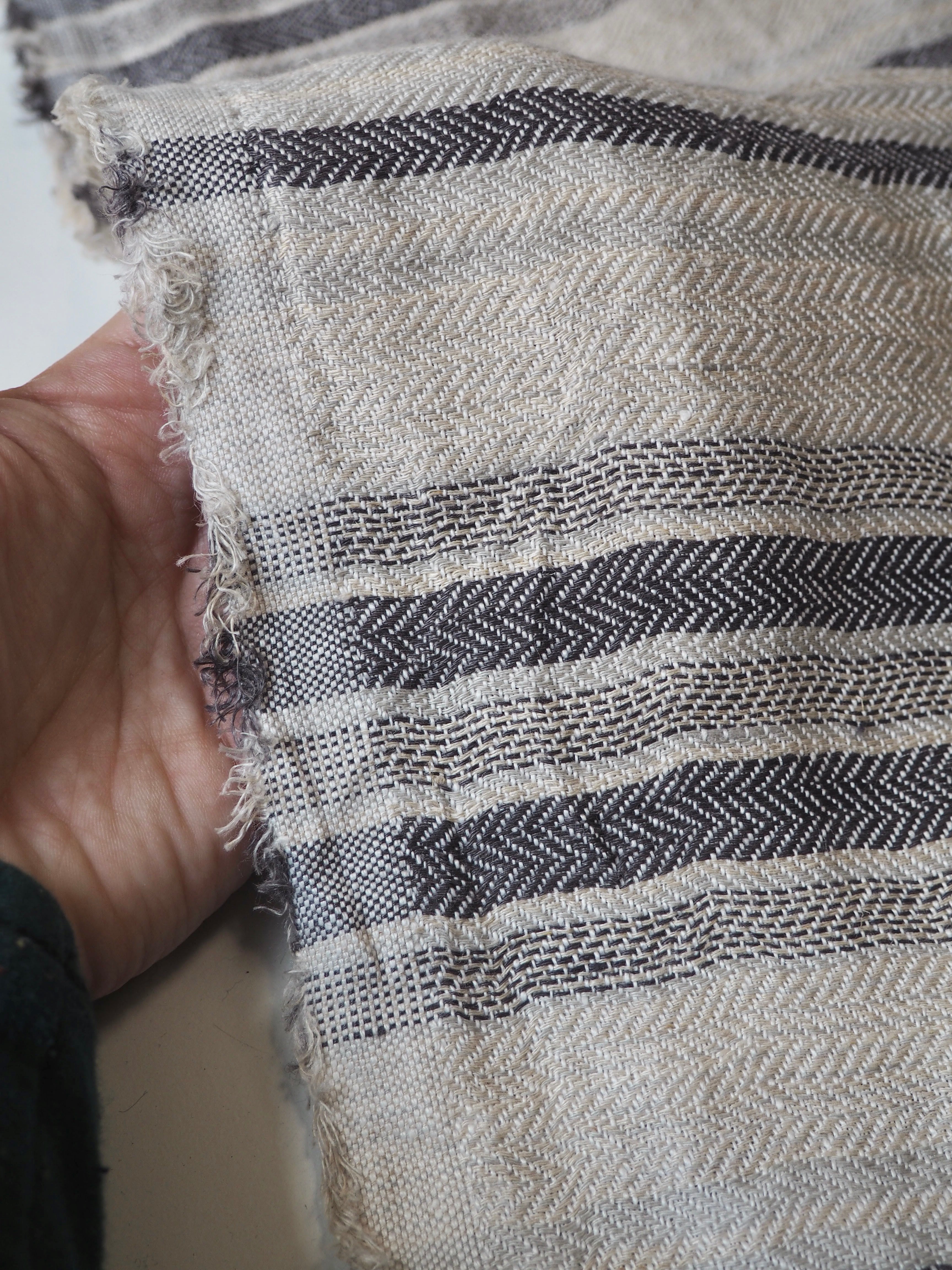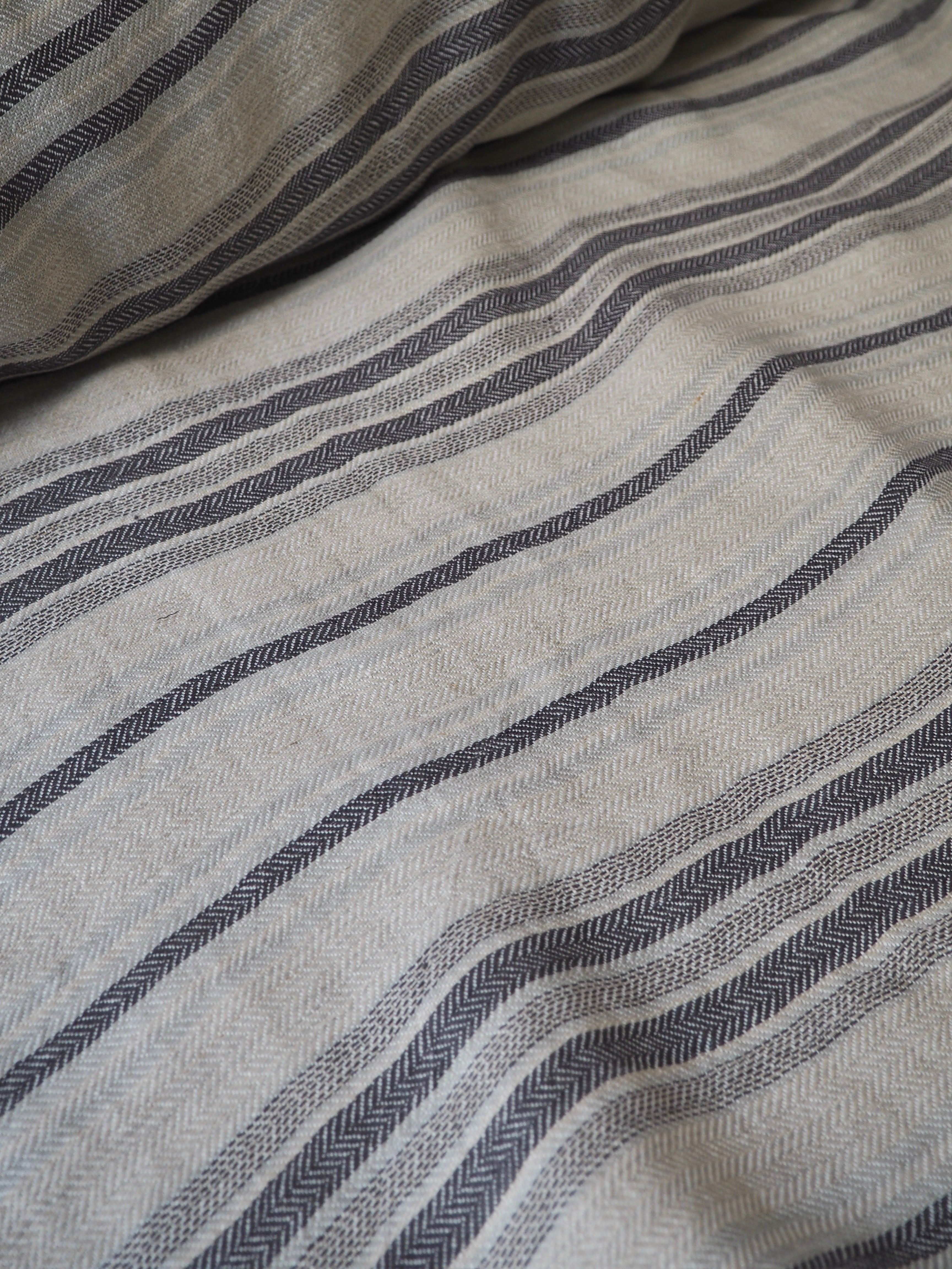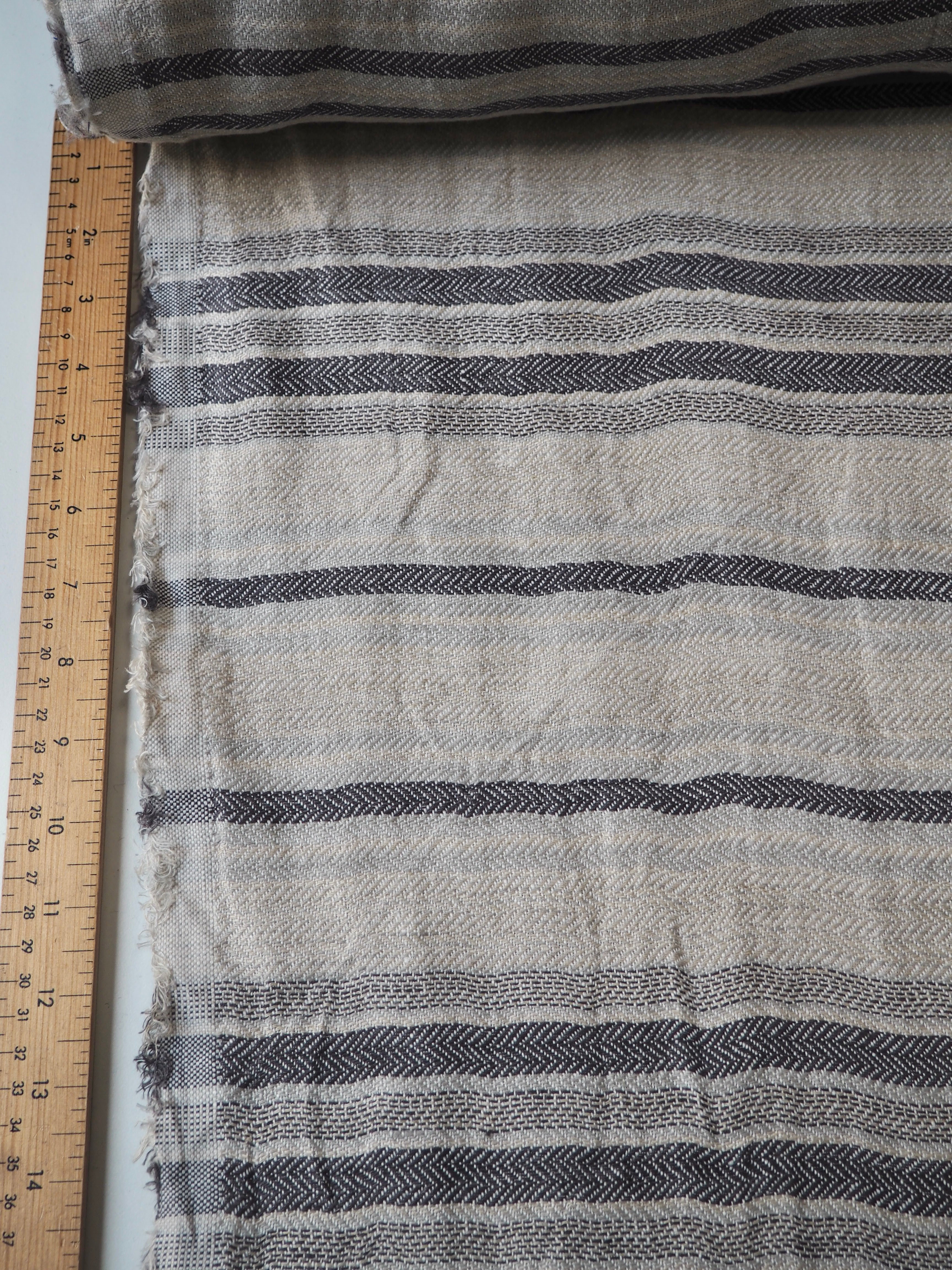 This ex-designer fabric is an extra wide linen. It has a sturdy but not heavy weave, with a visual texture and subtle herringbone-like texture in a medium weight. Stripes weave down the weft. Has a washed-like handle and a worn-in look. Very soft and fully opaque, and beautiful quality. Has a soft structure, but still drapes nicely. From a home interiors company. Perfect for drapes!