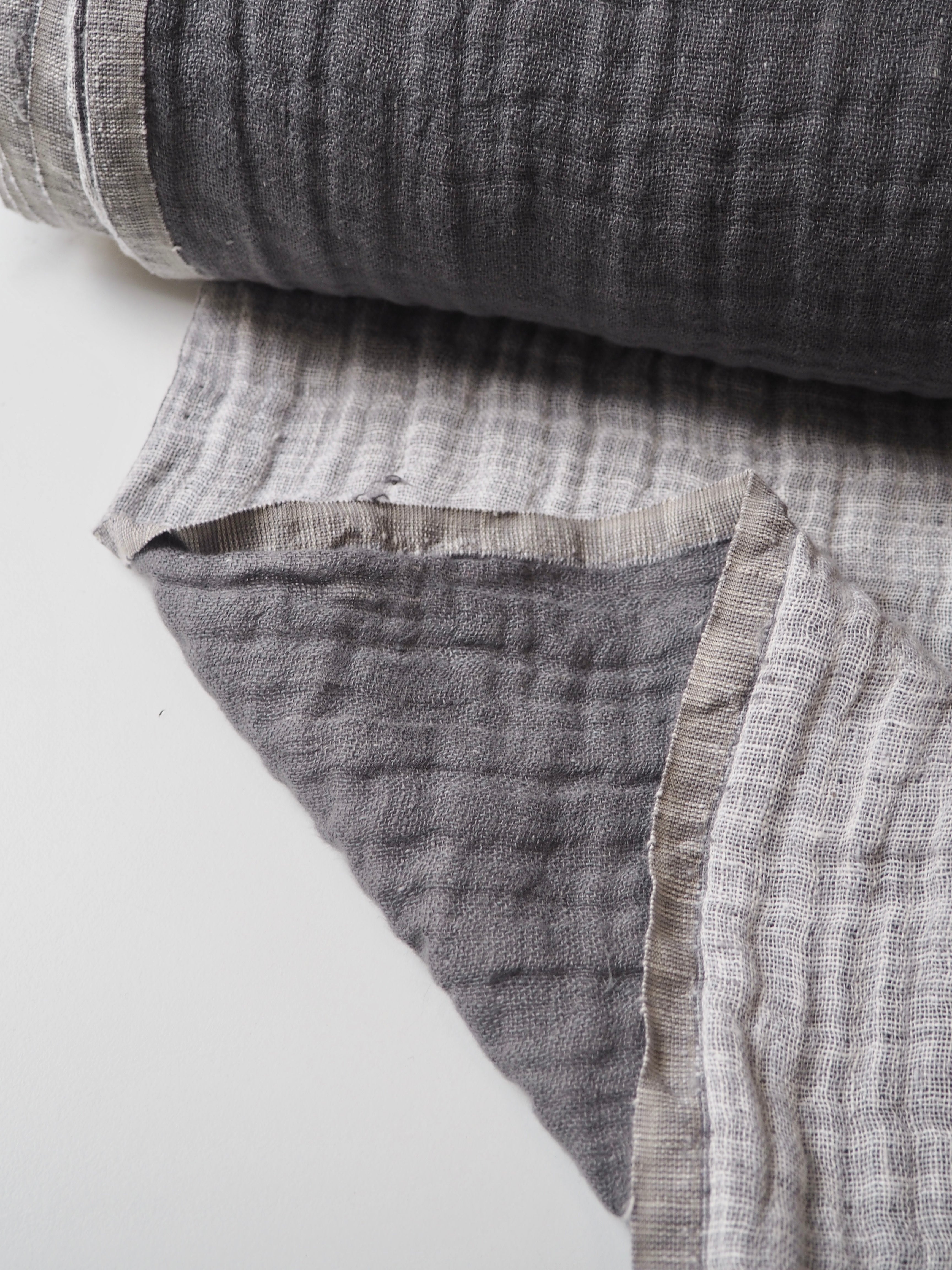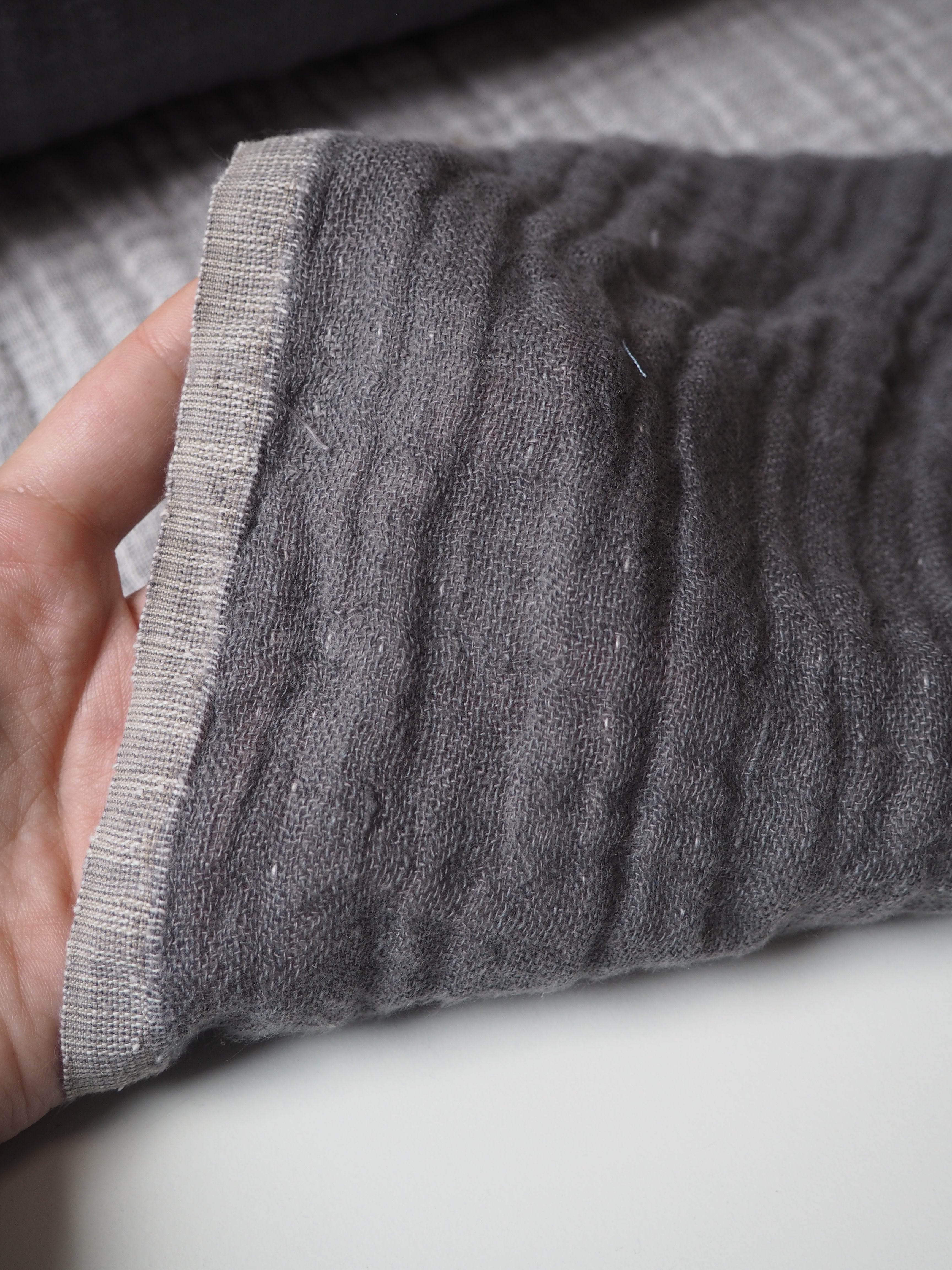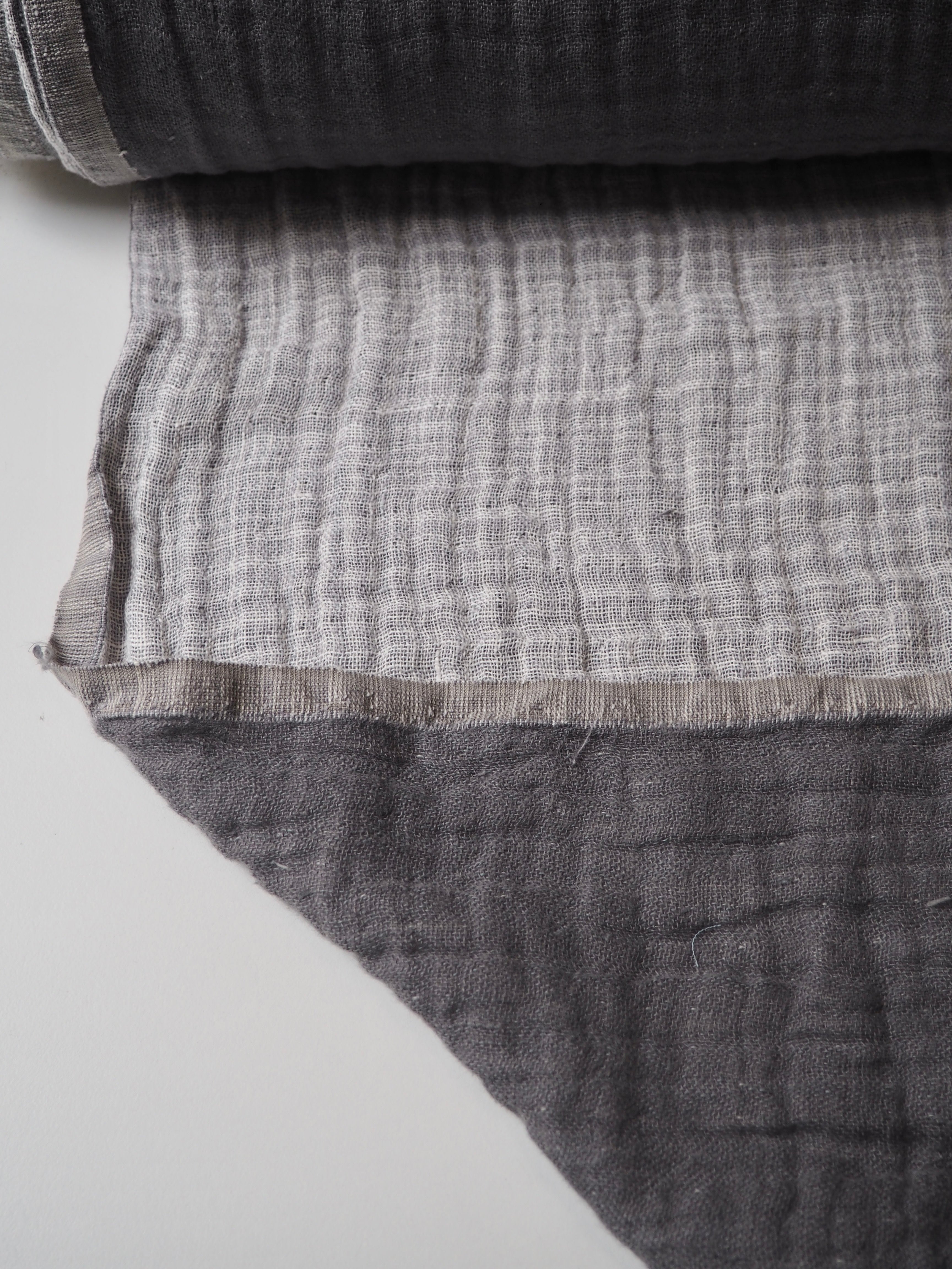This ex-designer fabric is a double linen. It has a looser weave, with a lovely gauze-like texture in a medium weight. It's two layers, grey and white, woven together gently. Very soft and fully opaque, and beautiful quality. Has a soft structure, but still drapes nicely. From a home interiors company. Great for cushions, a light jacket, or as a throw!