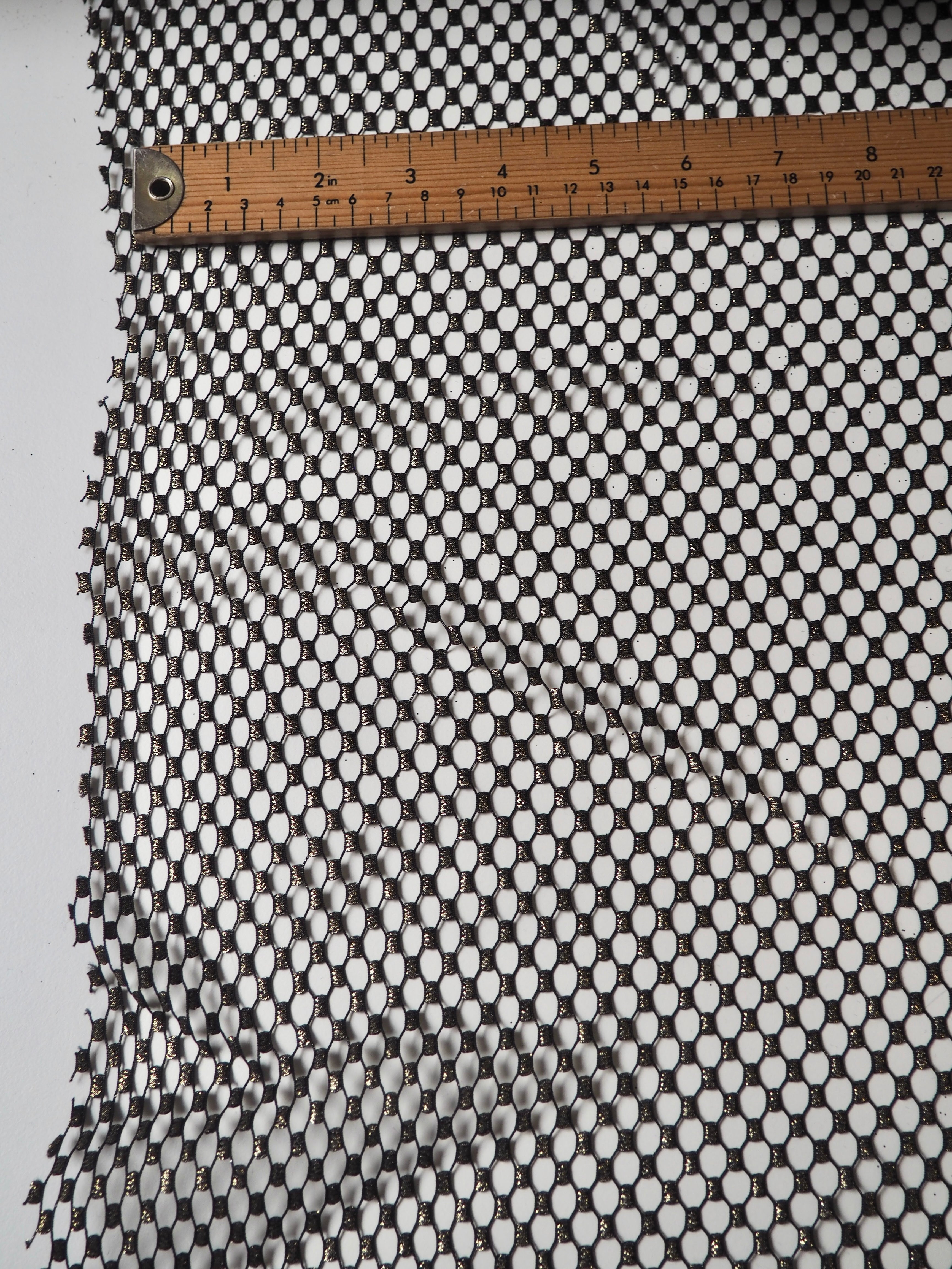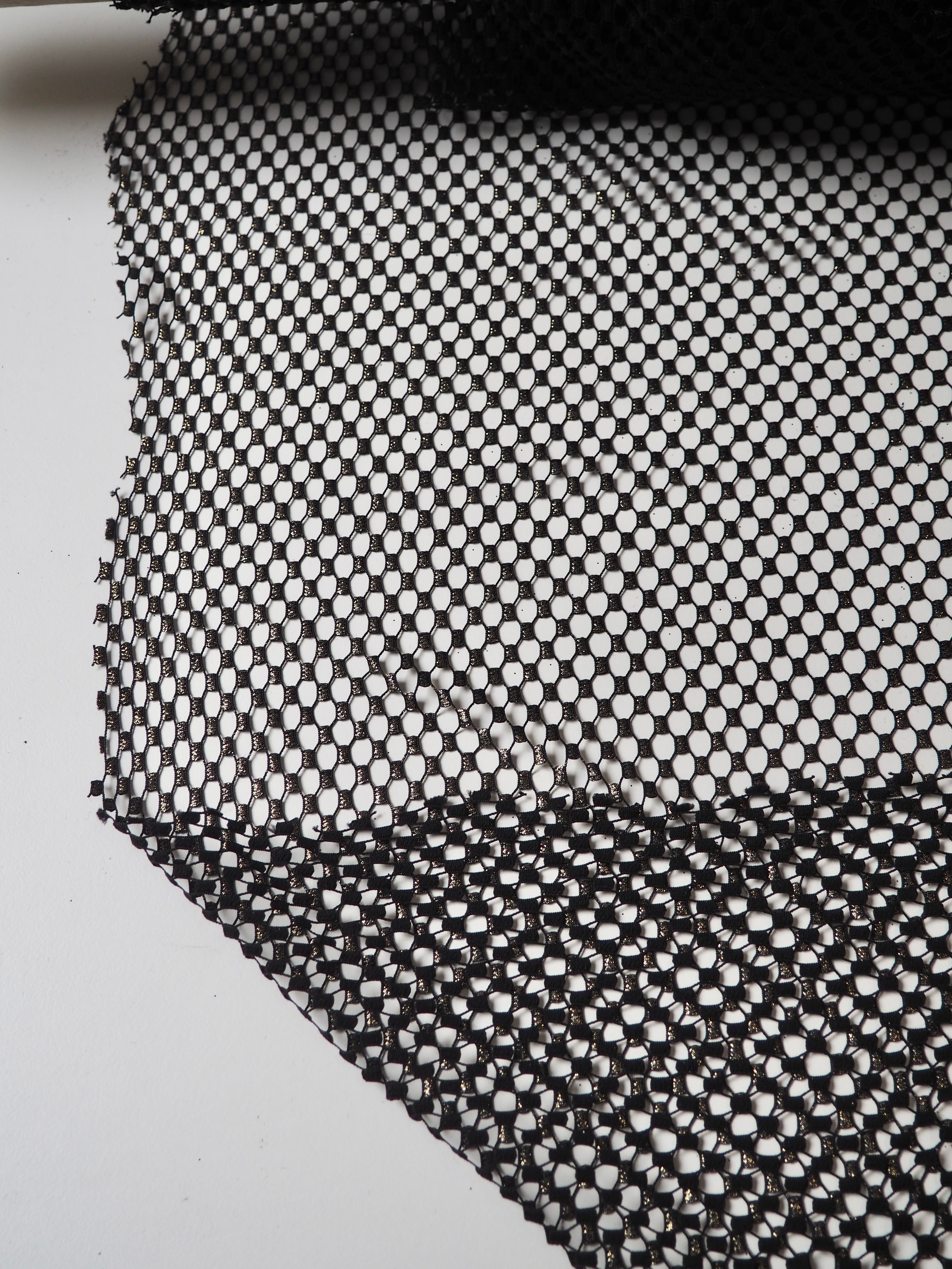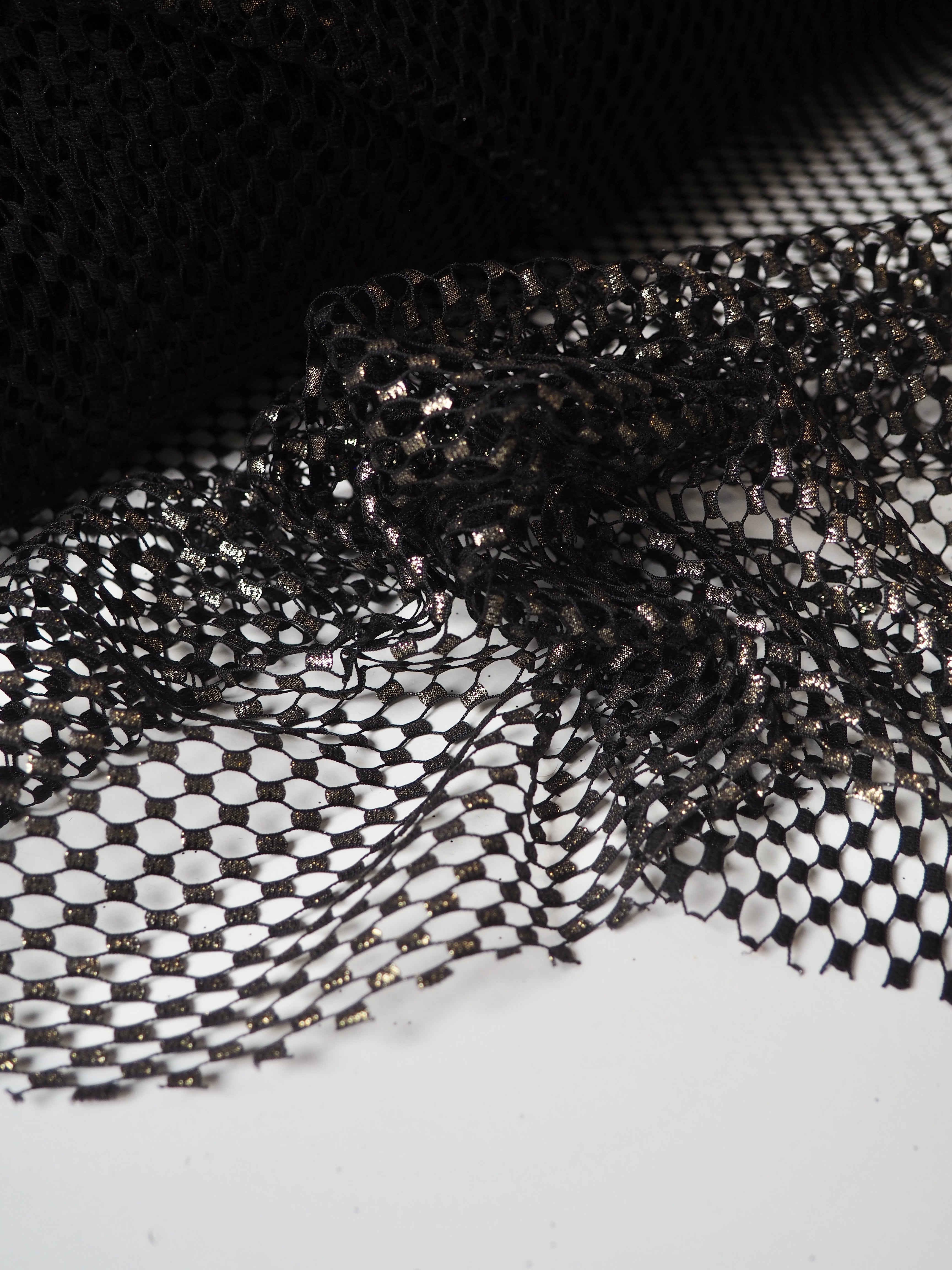 This ex-designer fabric is a fishnet. It's black with a gold metallic finish on the dotted weave. It's sheer and so eye-catching! Drapes well and has a only a little natural ease. It Would look great as an overlay on a garment, and even for hats and veils!