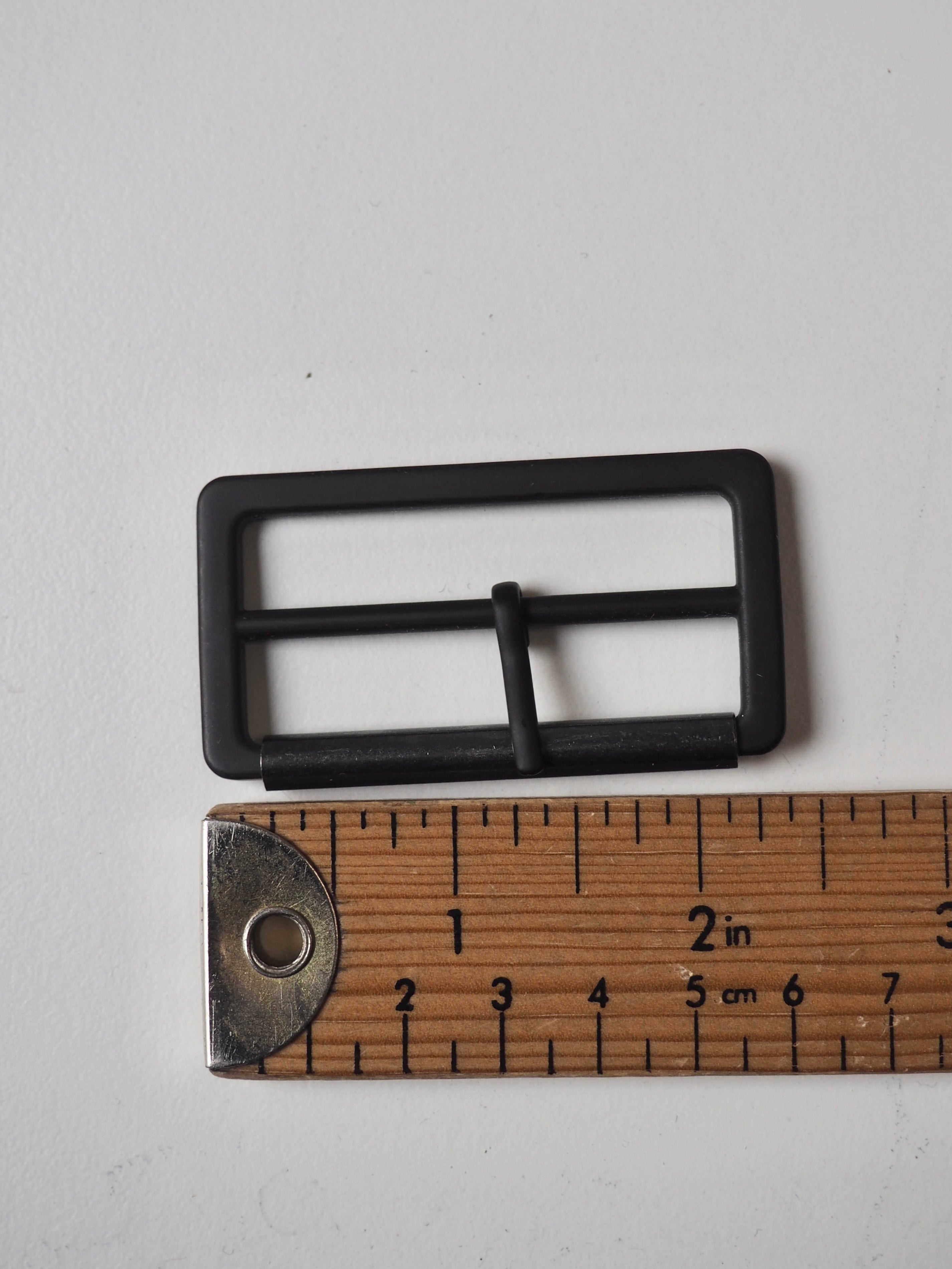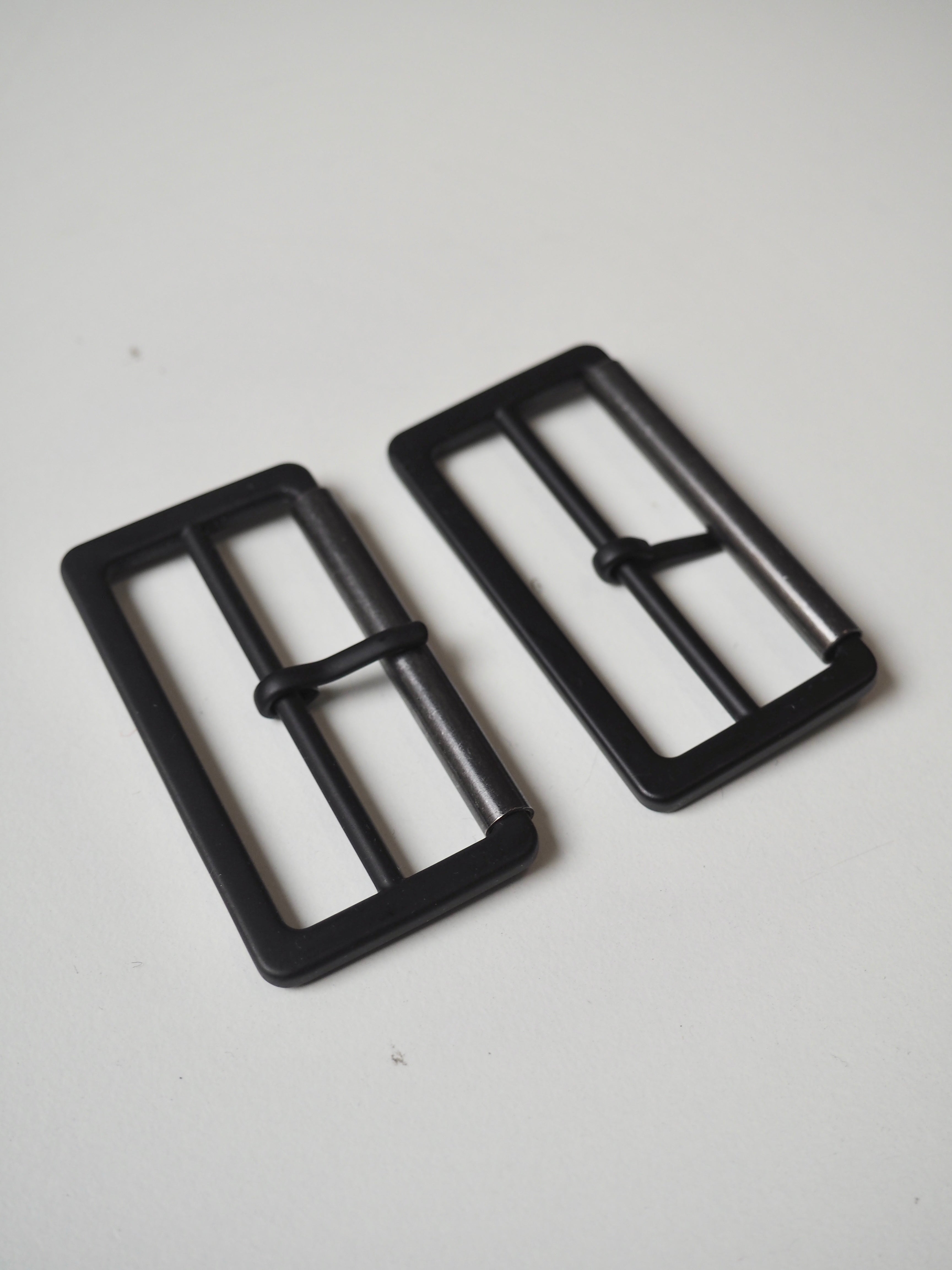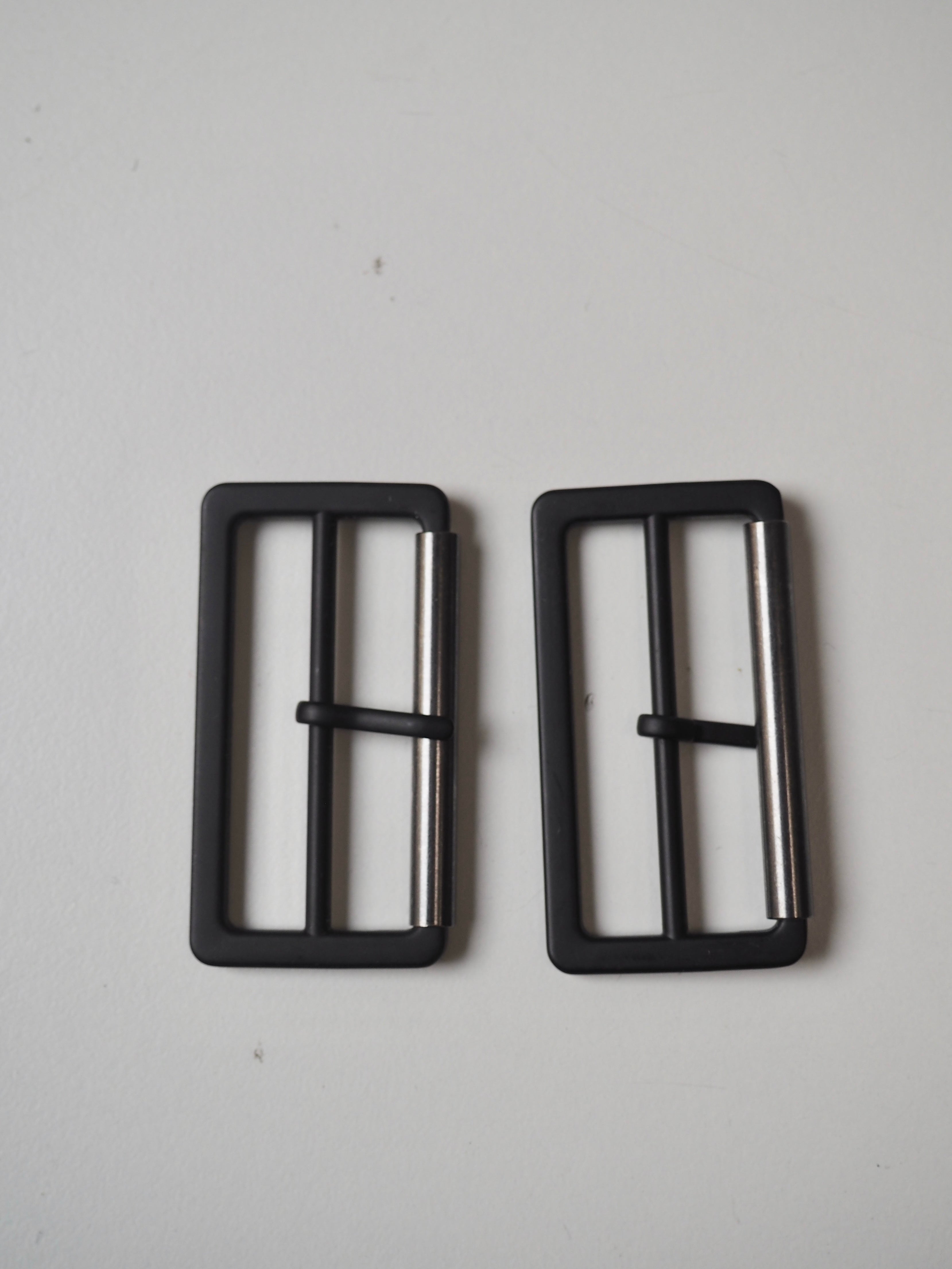 This ex-designer hardware is a buckle. Perfect for adding to garments or accessories. It has a matte black finished and has a sliding prong on the central bar with a shiny gunmetal roller.