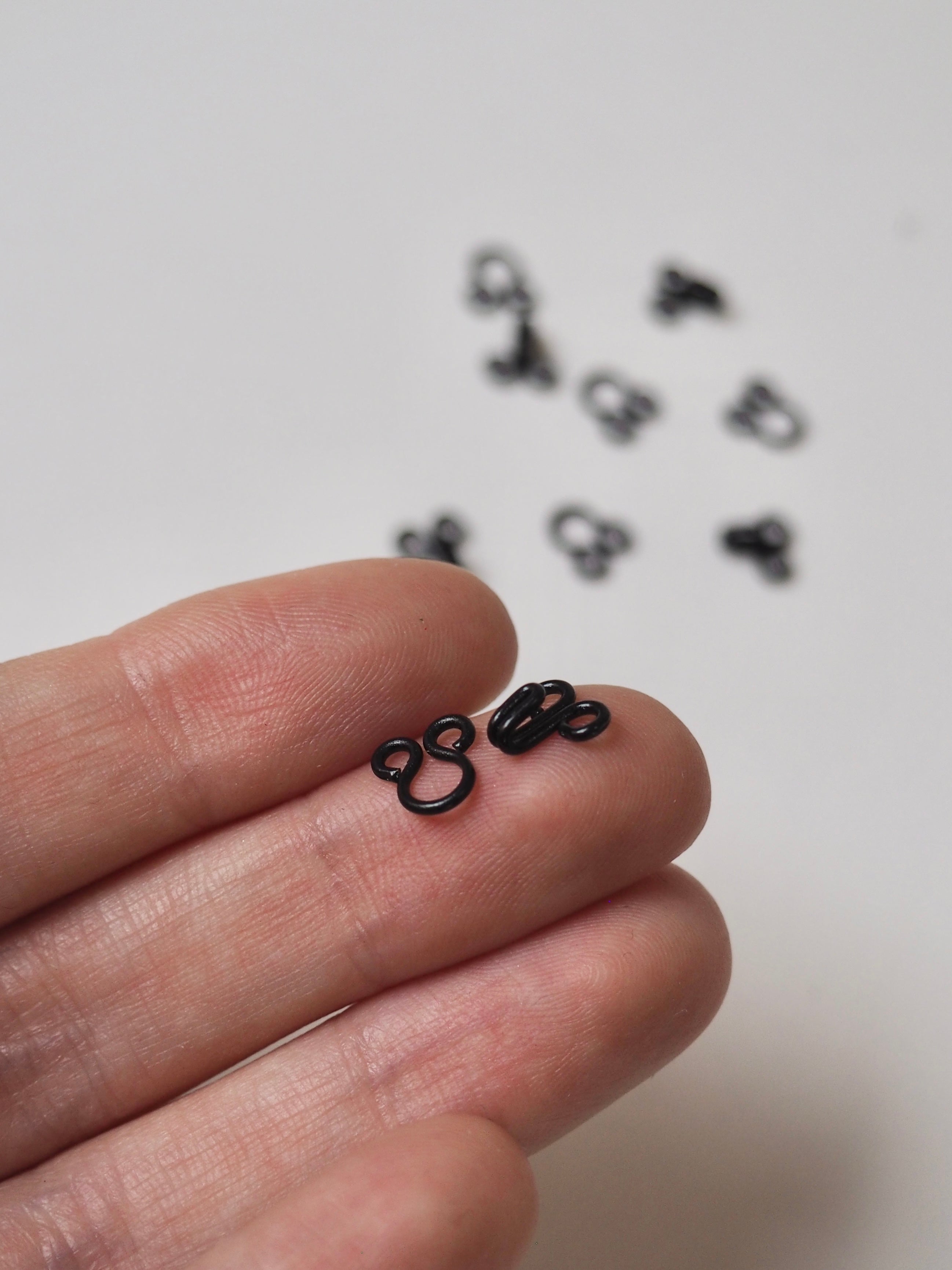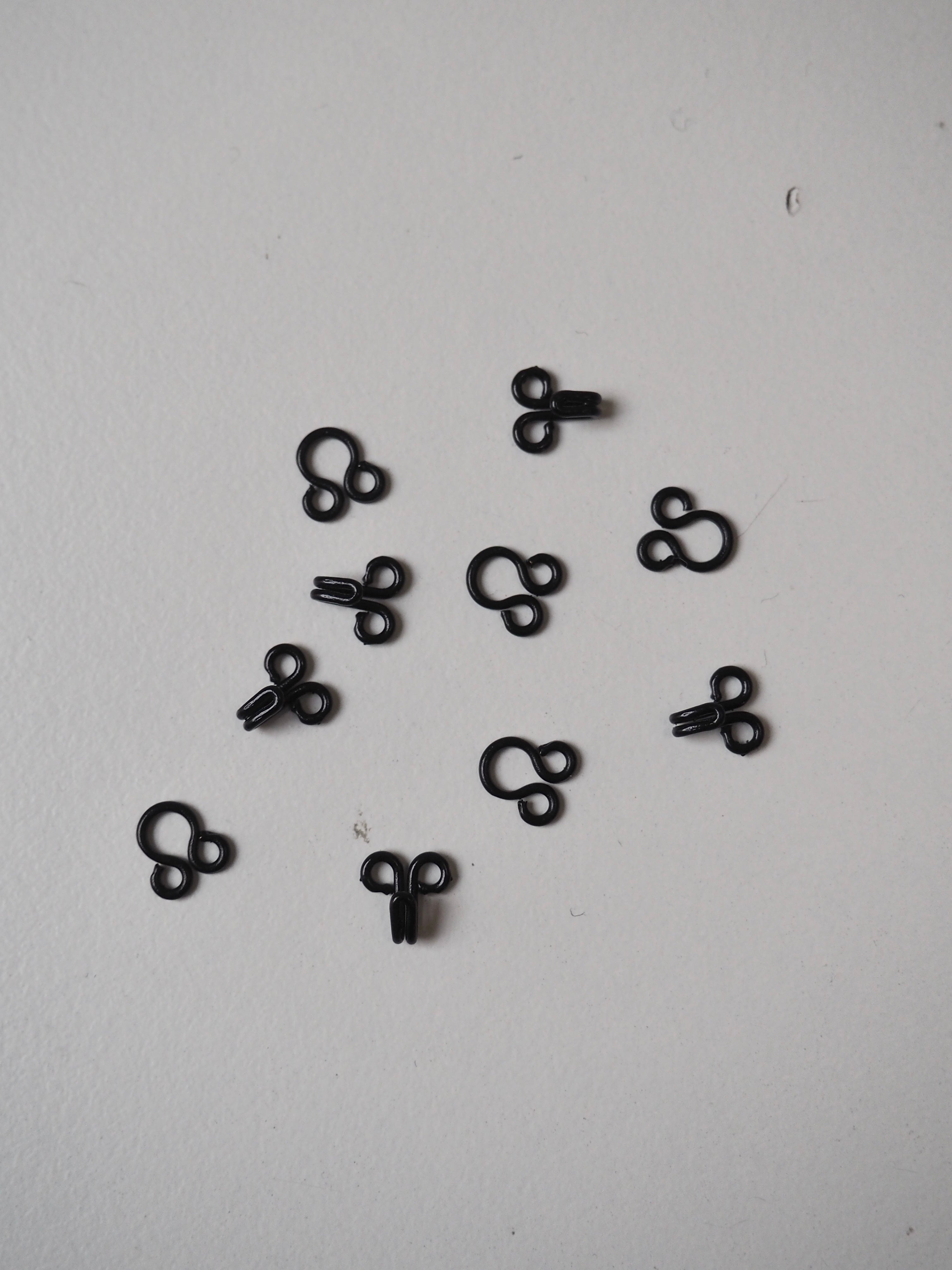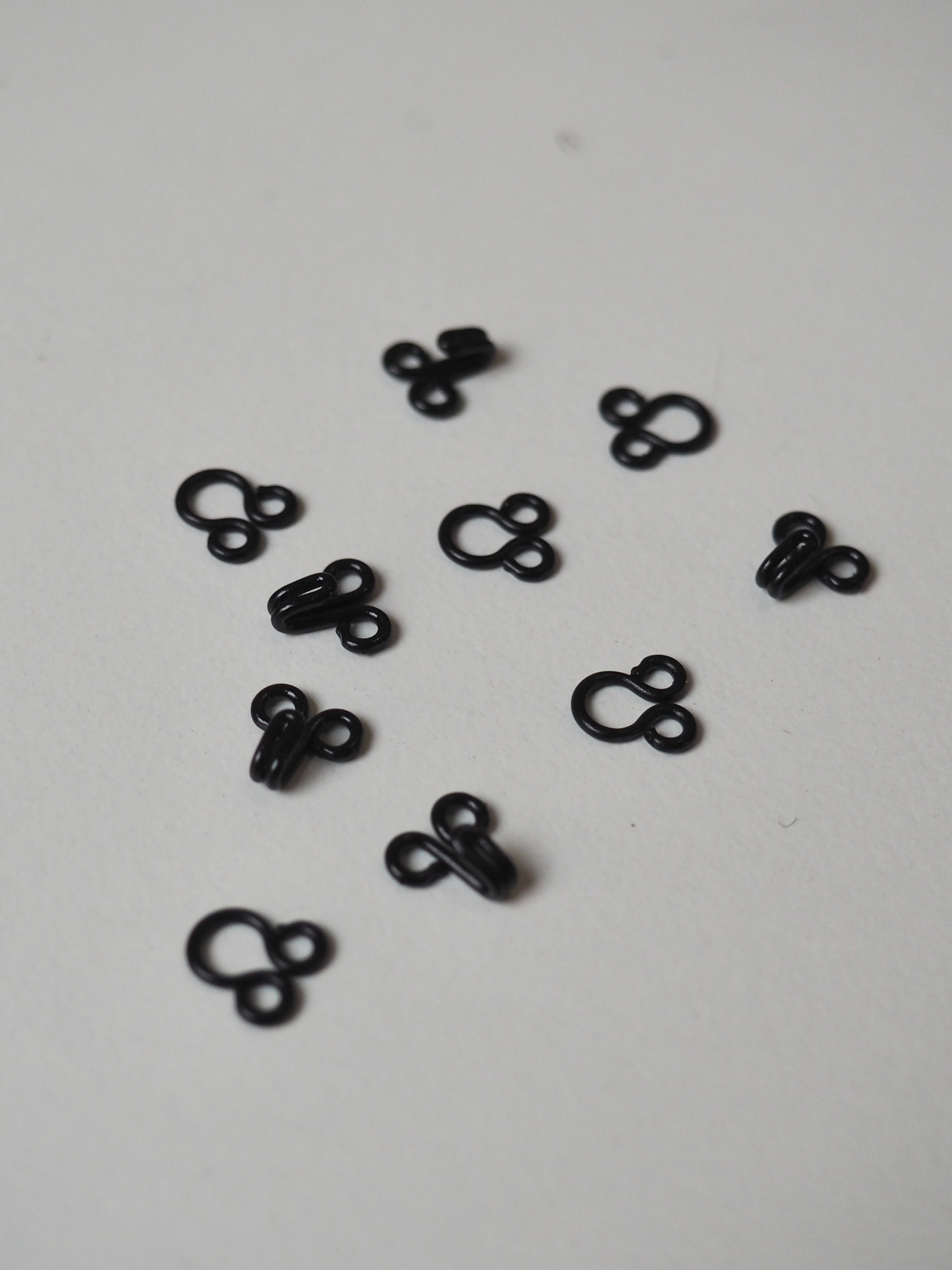 Classic hook and eye fastening in black. Perfect for using on a back neck opening or at the top of a zip! All our trim is deadstock left over from when a designer has finished sampling their collection.