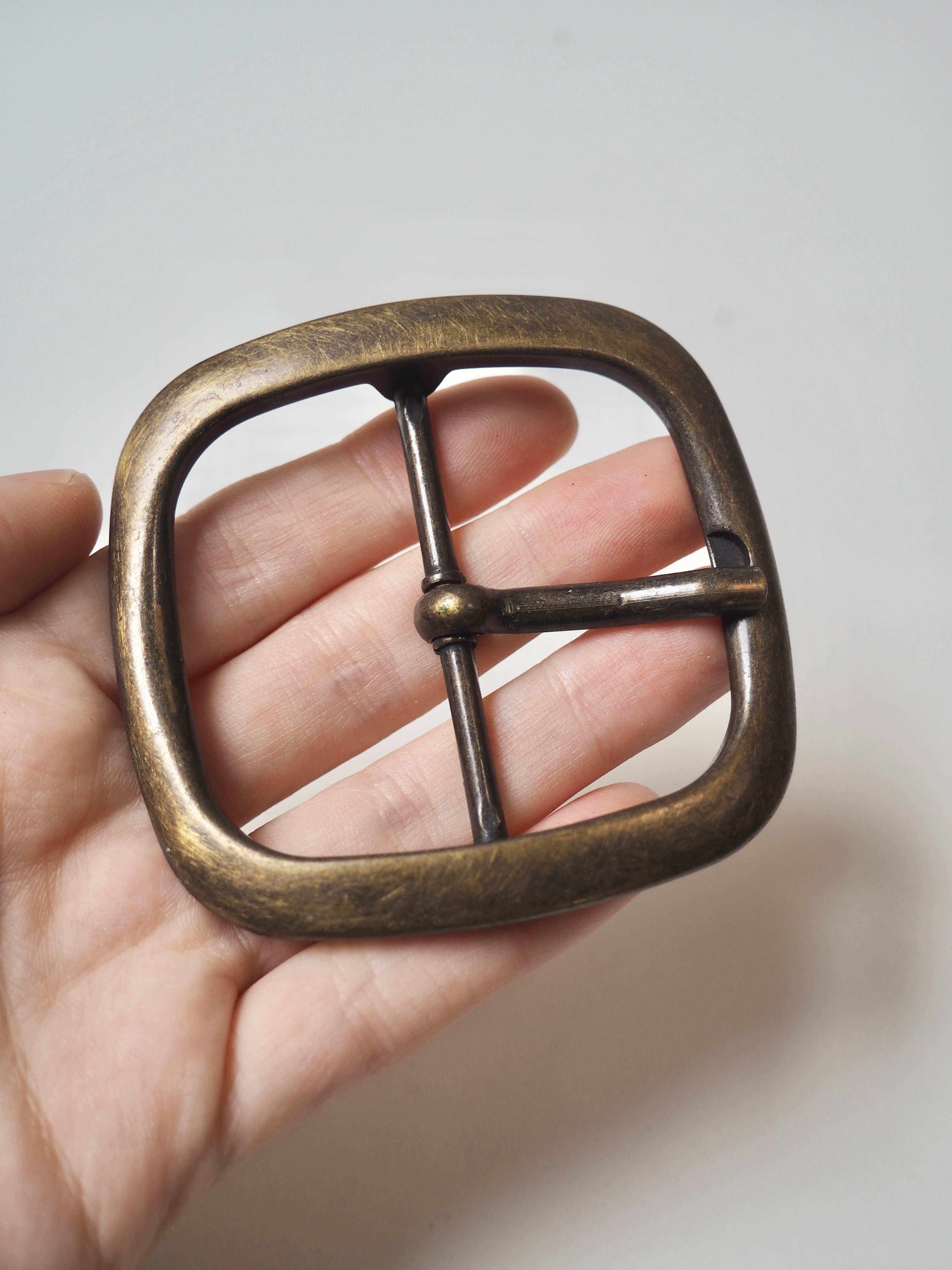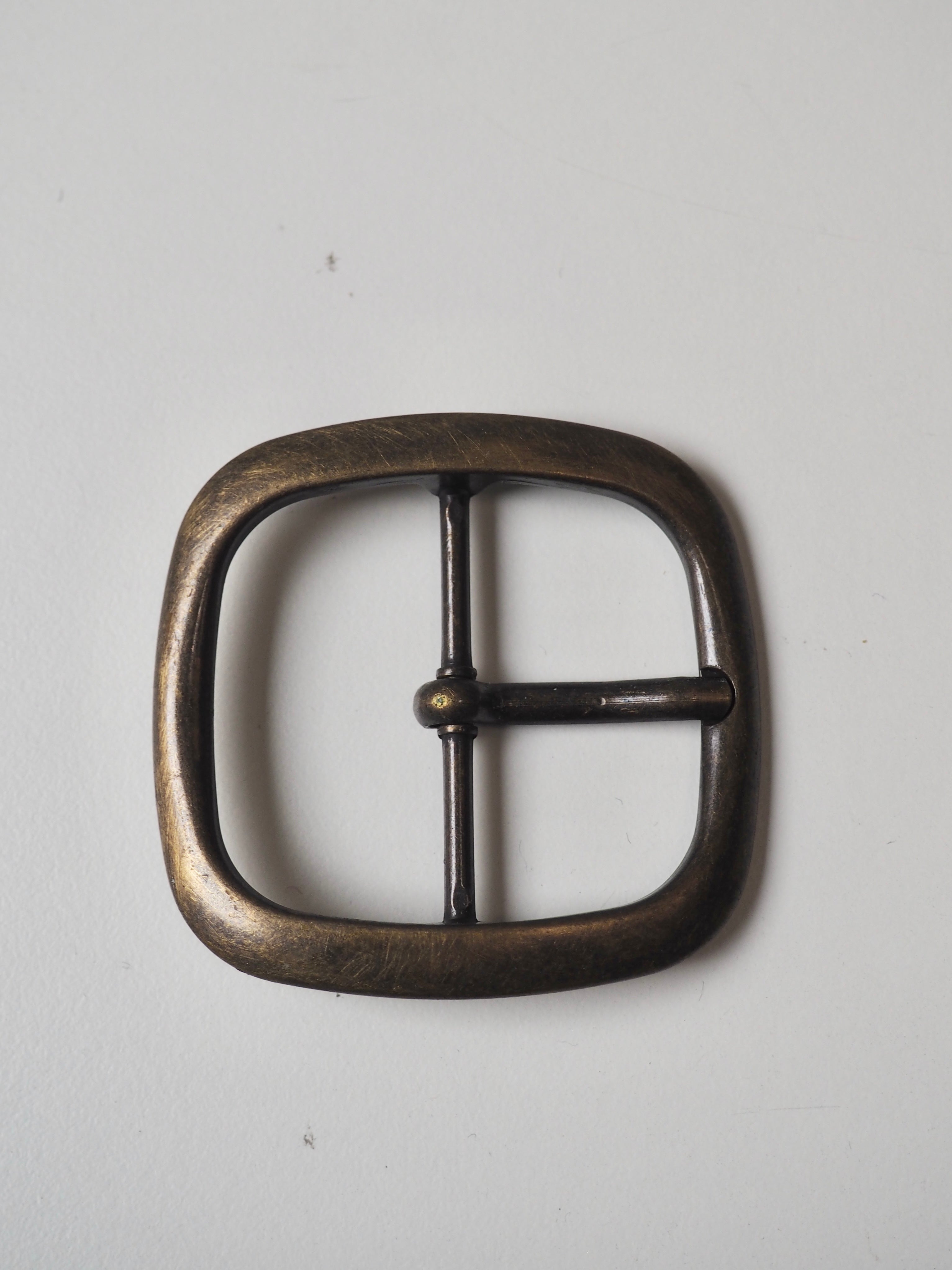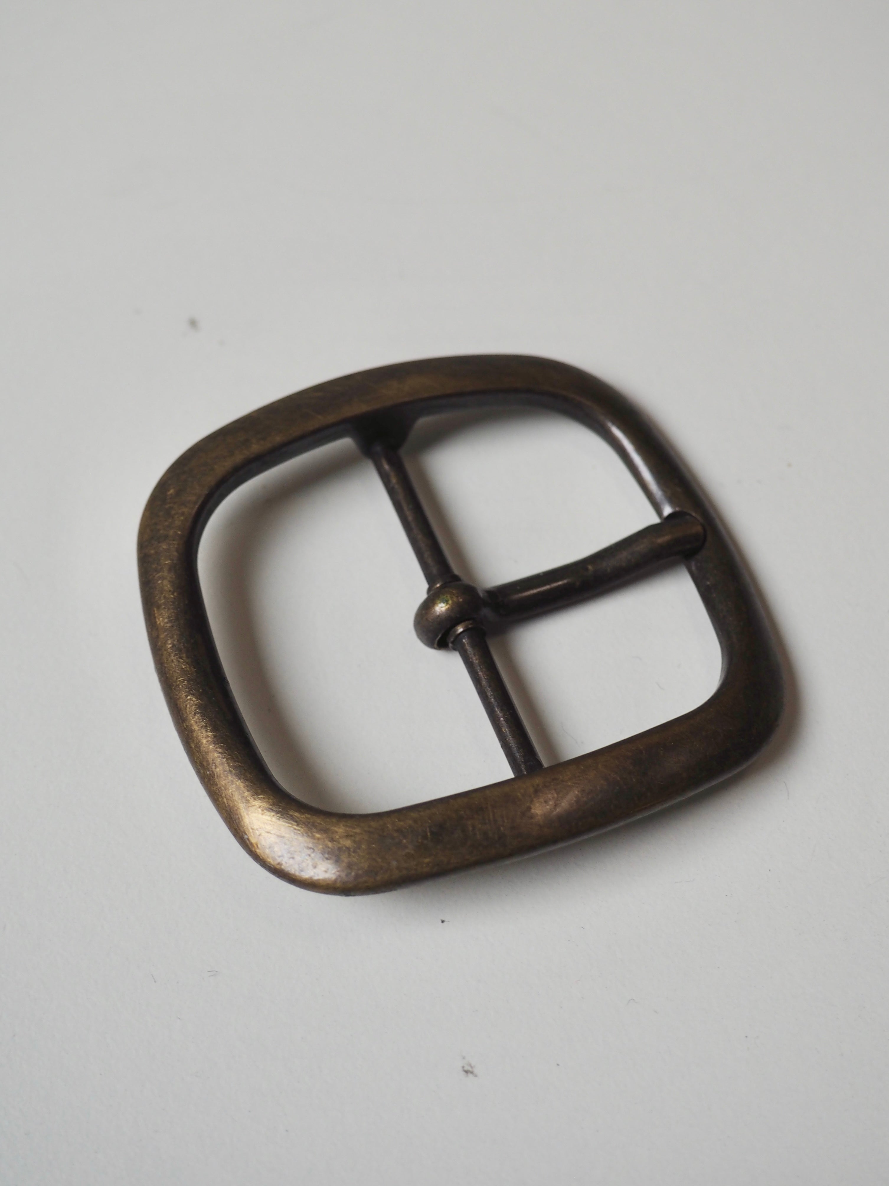 This ex-designer hardware is a buckle. These brass buckles are perfect for adding to garments or accessories. They have a antique brushed brass finish, with a fixed arm and indentation to hold it..