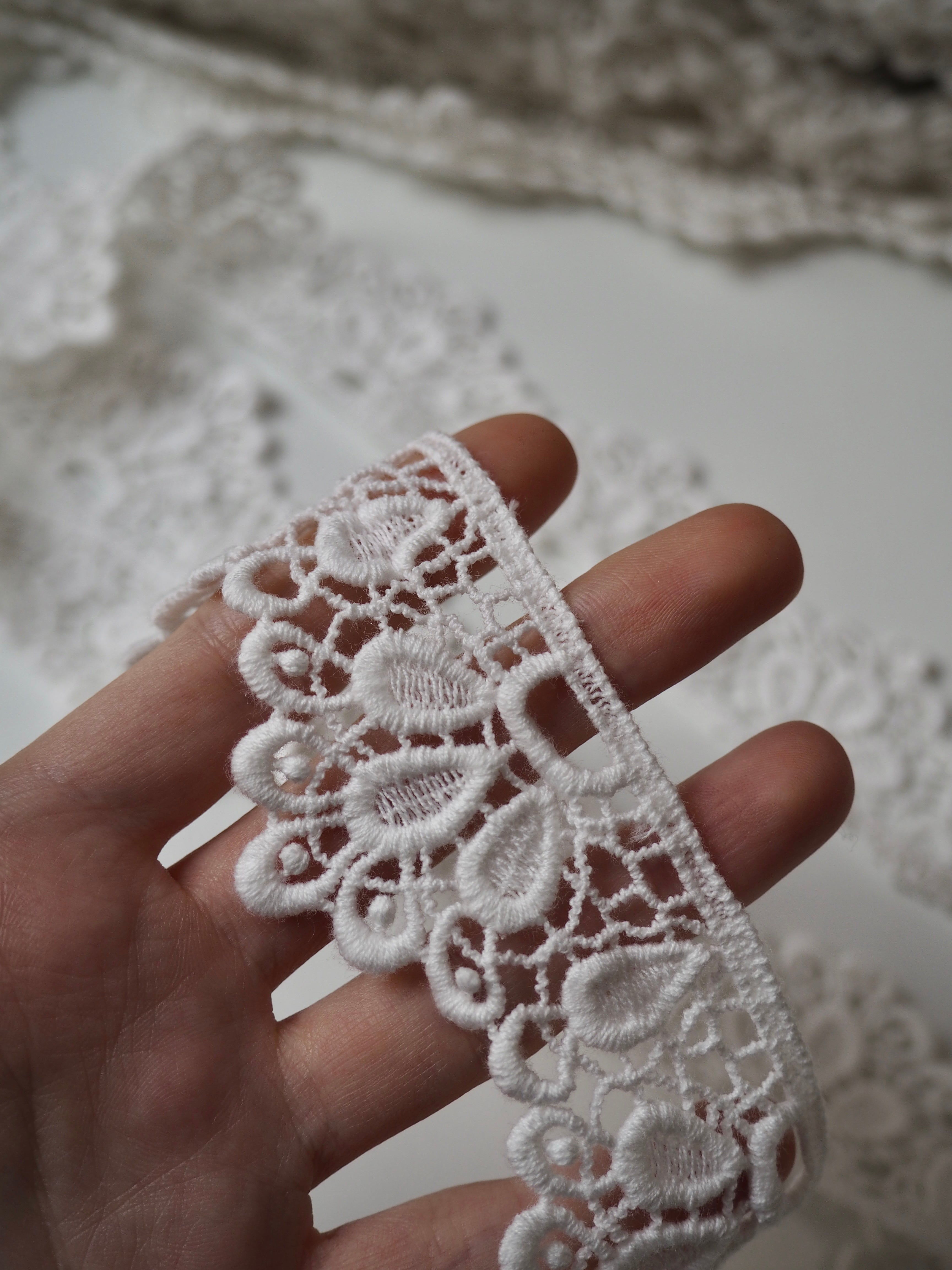 This is a cotton one edge scalloped trim with a beautiful petal, leaf or teardrop like motif that fans into a scalloped design. Would look great as an inlay or could be appliquéd on. Perfect for garments or lingerie, particularly bridal! All our trim is deadstock left over from when a designer has finished sampling their collection.