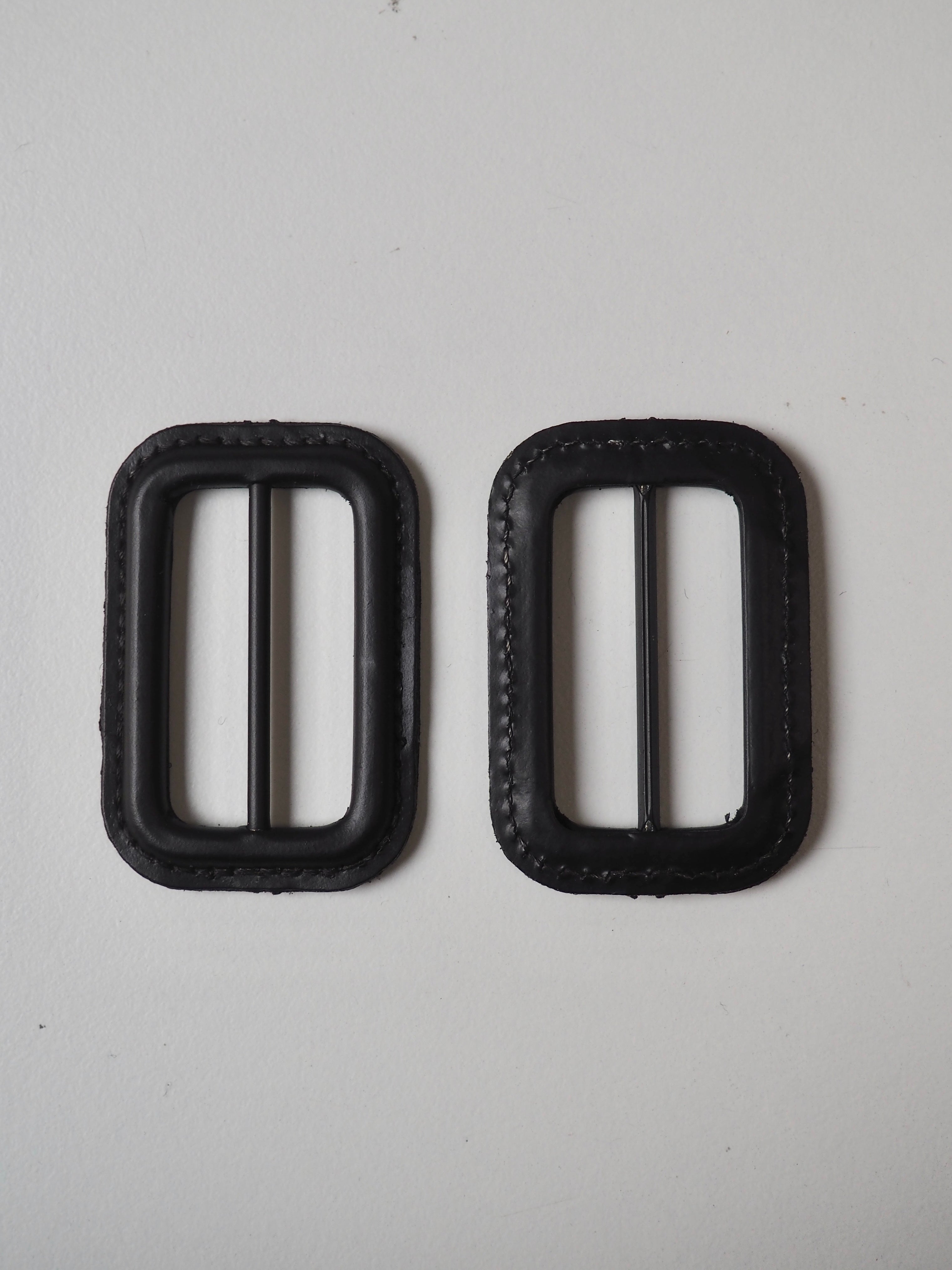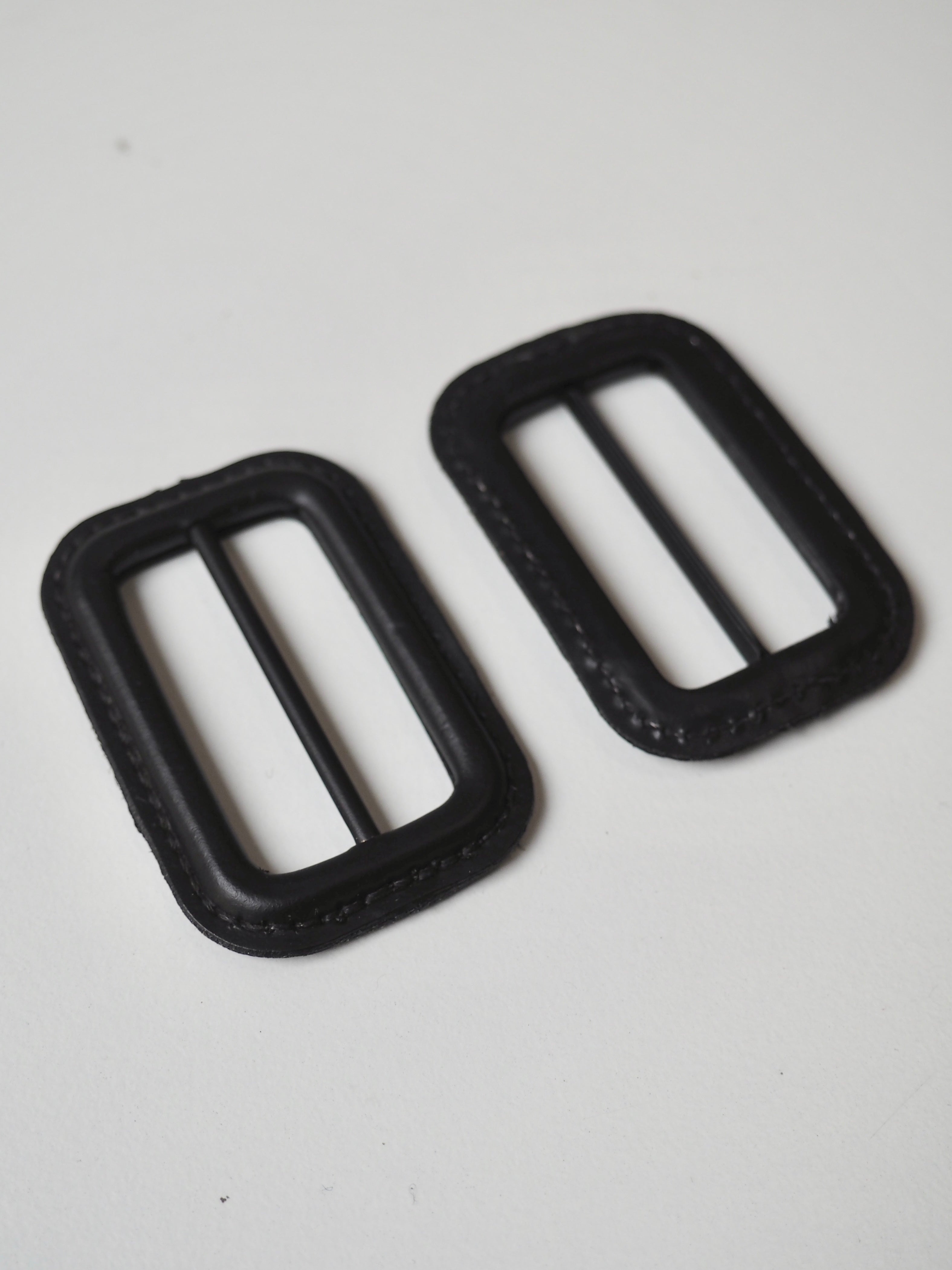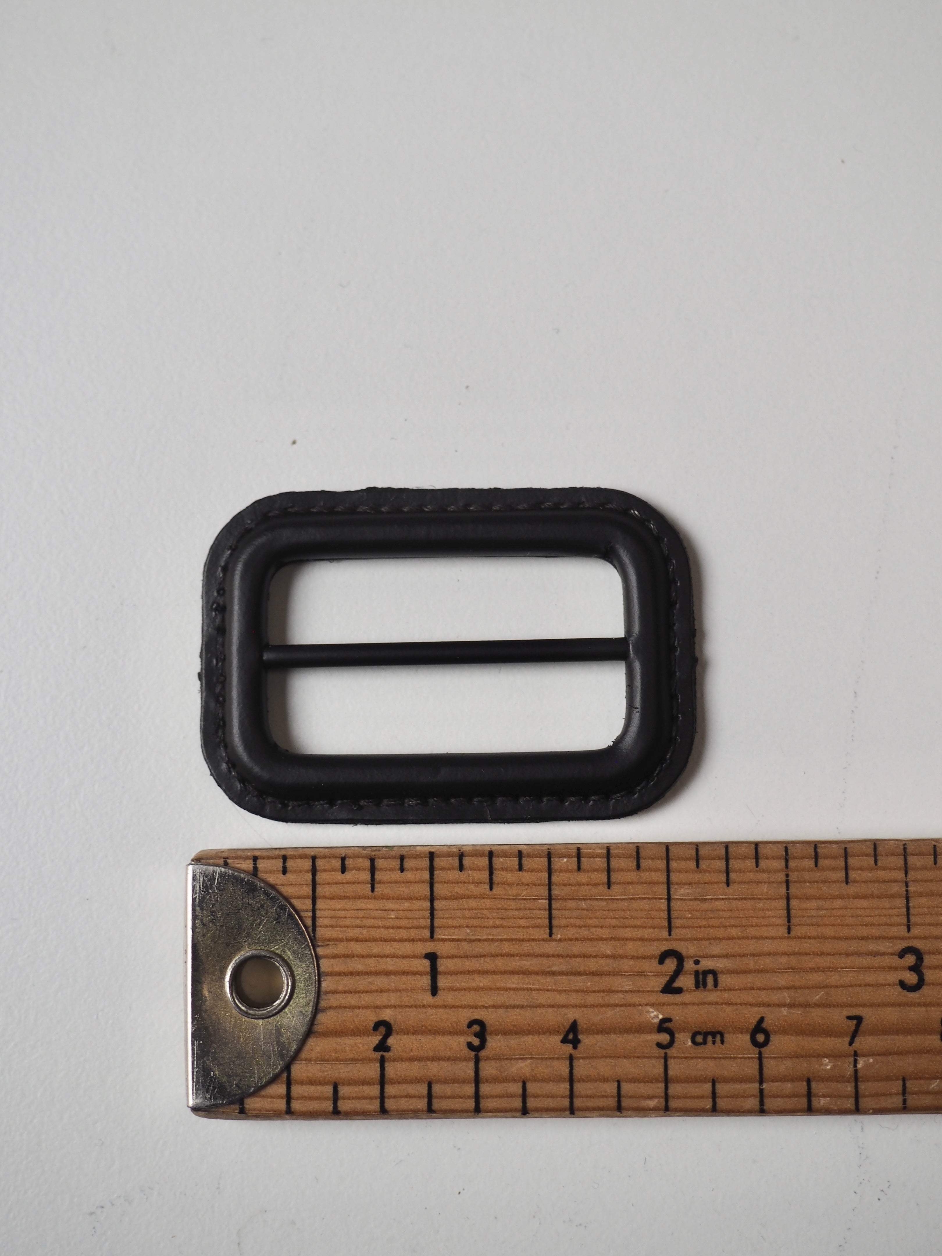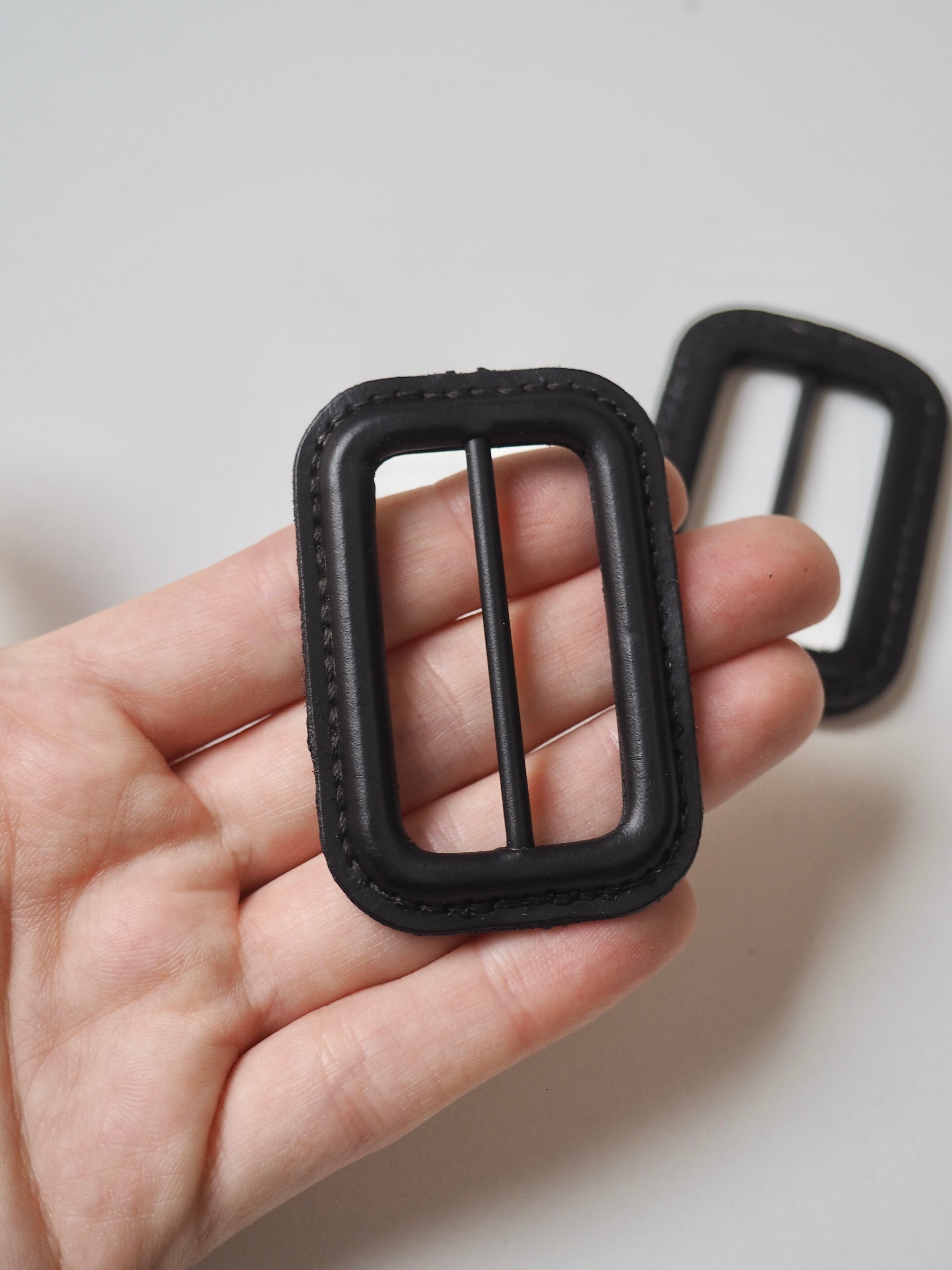 This ex-designer hardware is a slider. It's lightweight and has a fixed central bar for adjustments. The surrounding frame is covered by leather with a stitched detail. They could be used for coats, dresses, jumpsuits, or accessories - they're great for adding an extra detail to your me-mades.