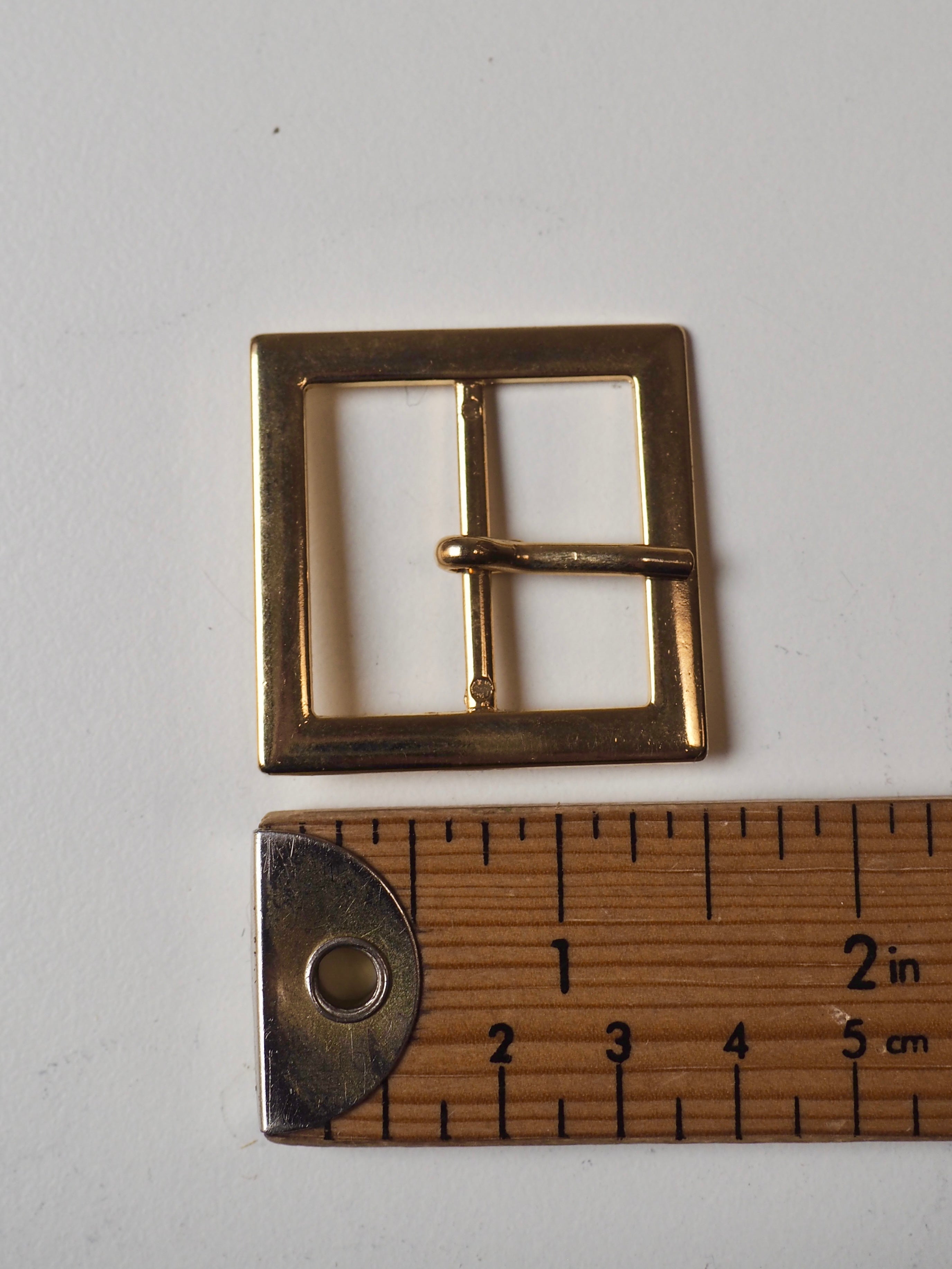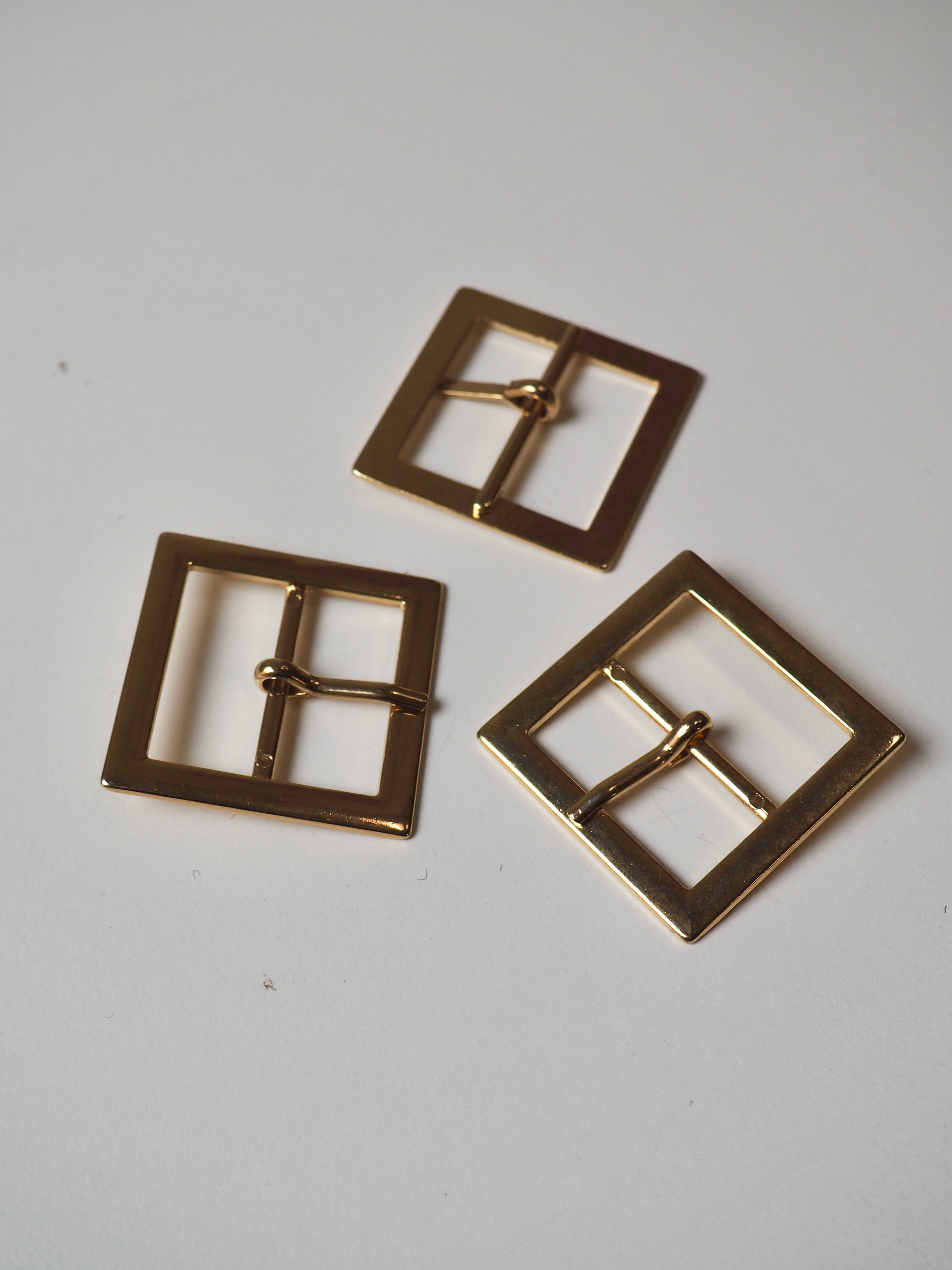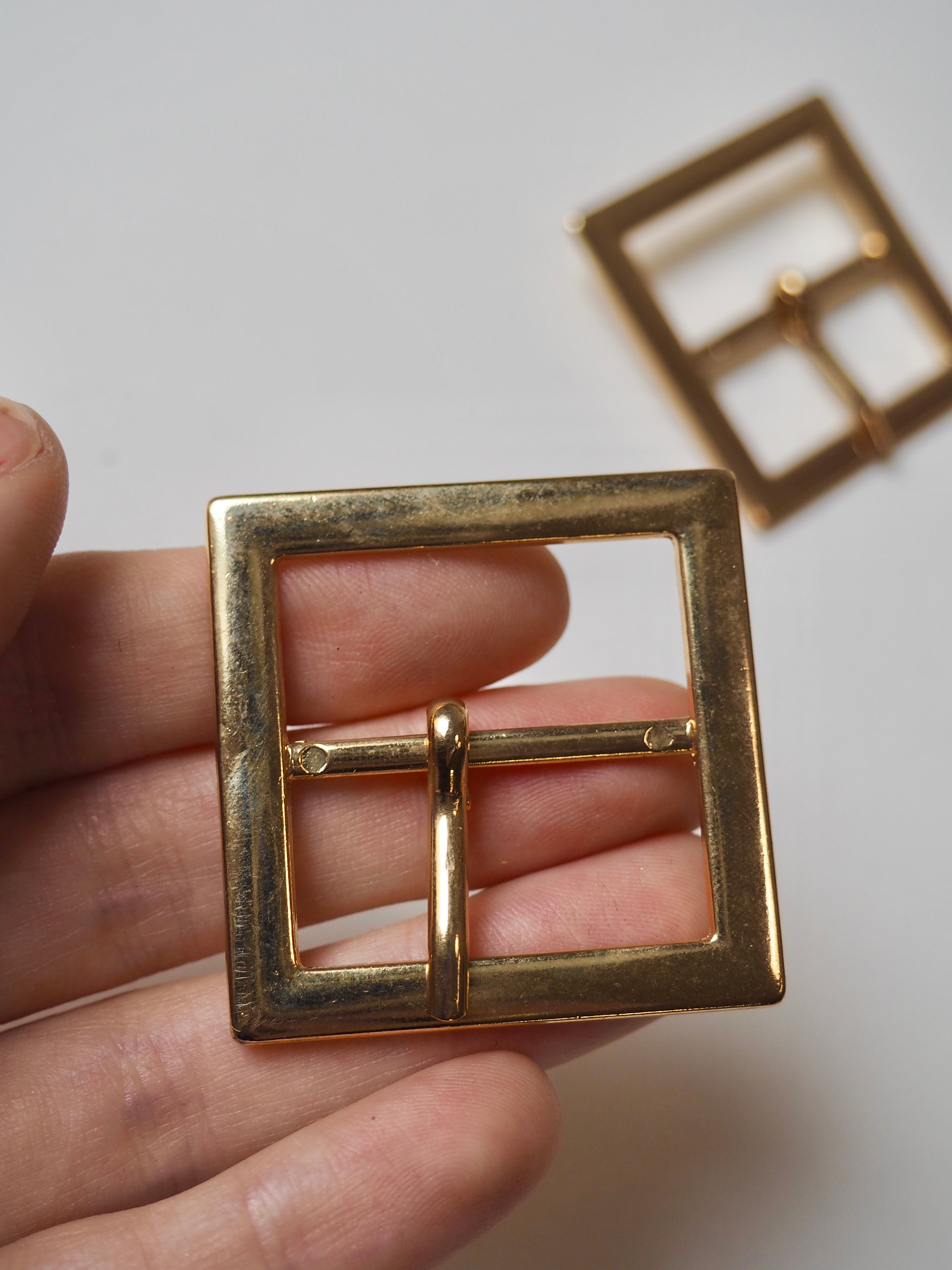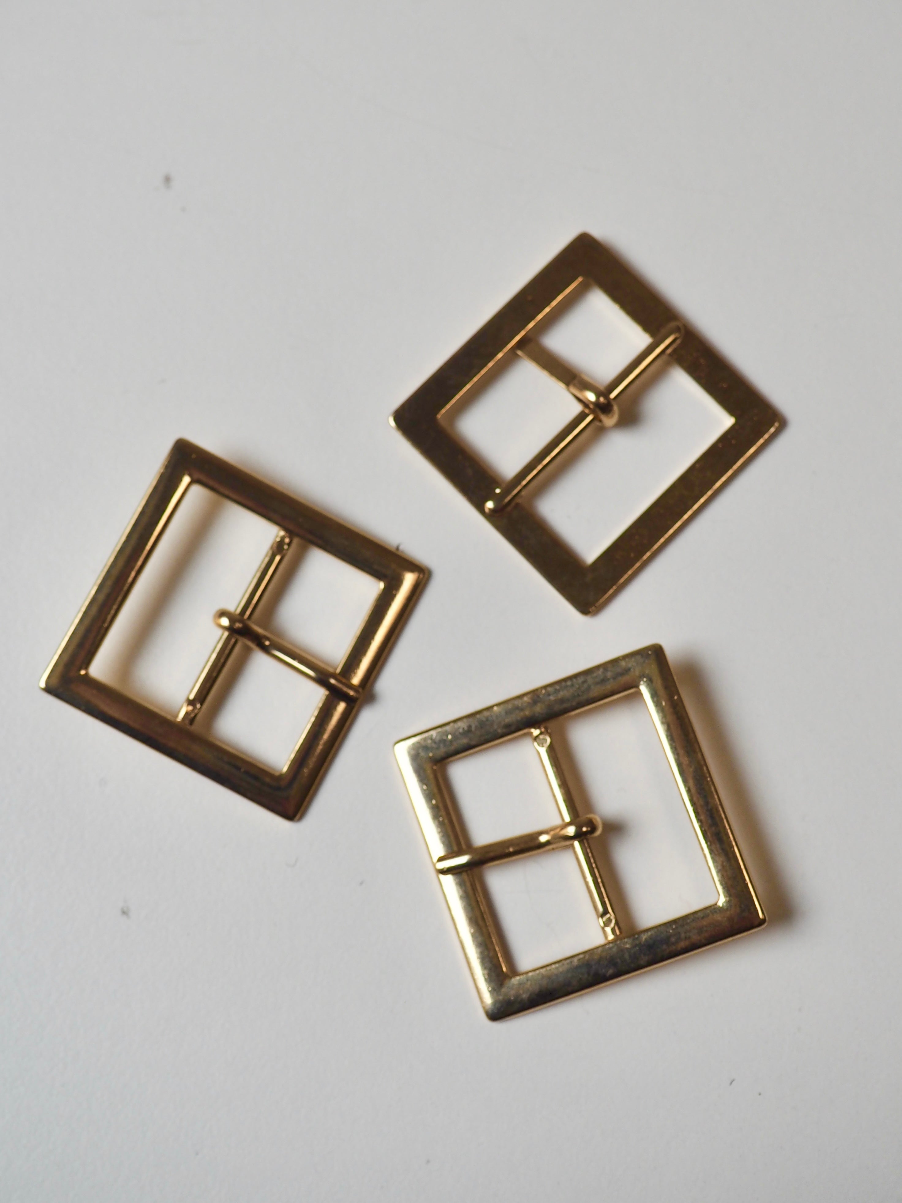 This ex-designer hardware is a buckle. They are perfect for adding to garments or accessories. They have a sliding prong on the central bar and are medium weight and have a slightly shiny finish.