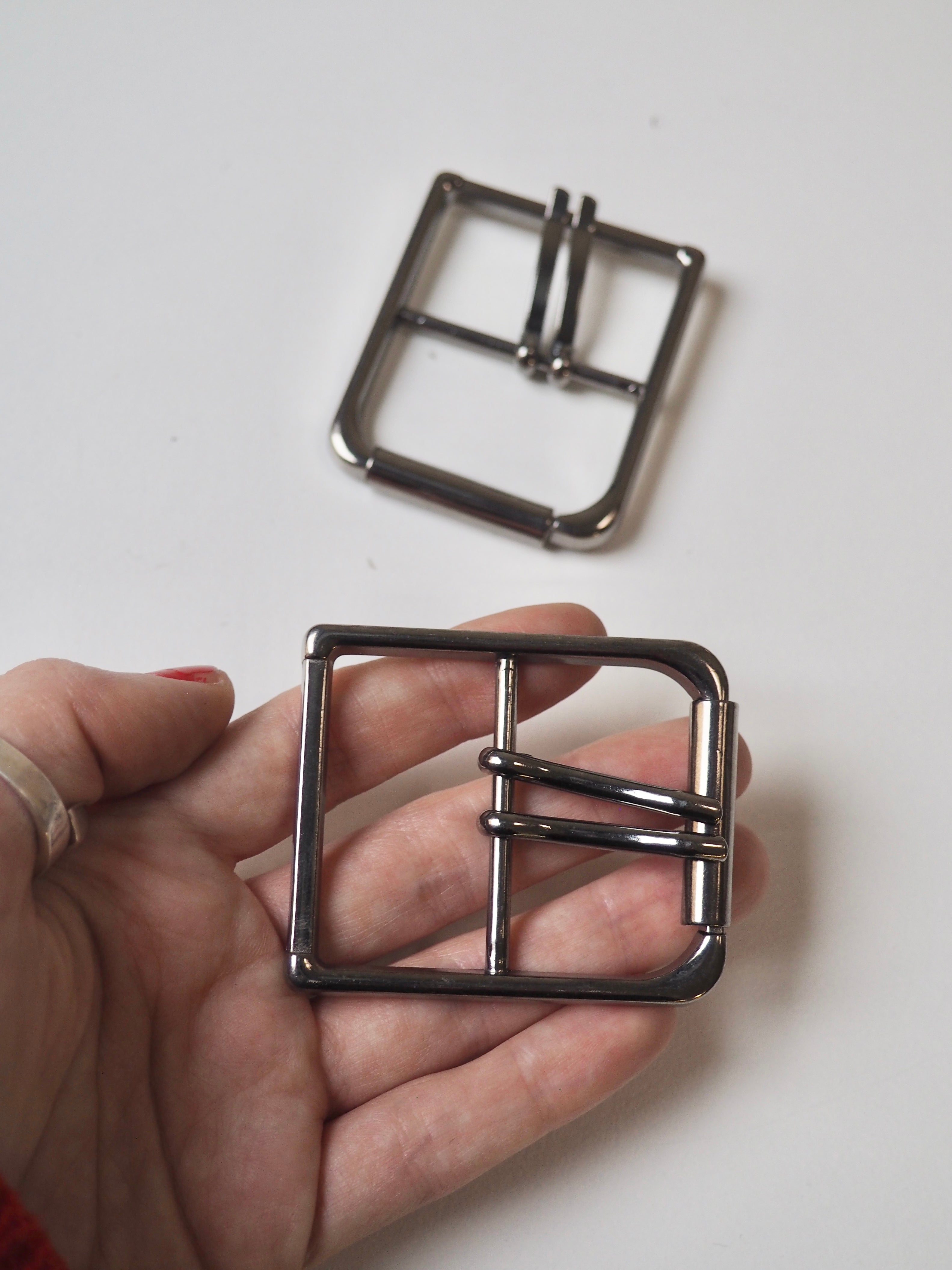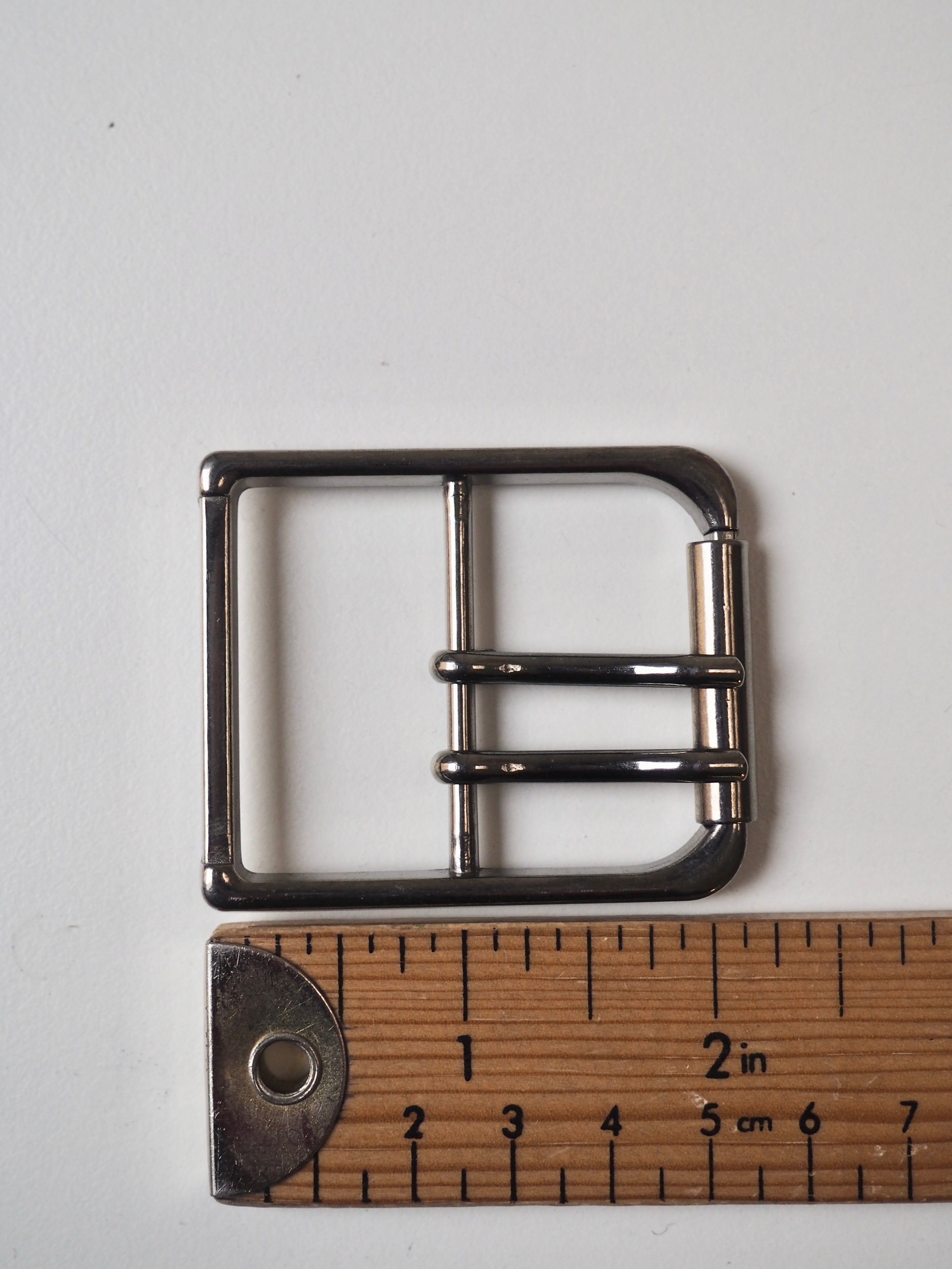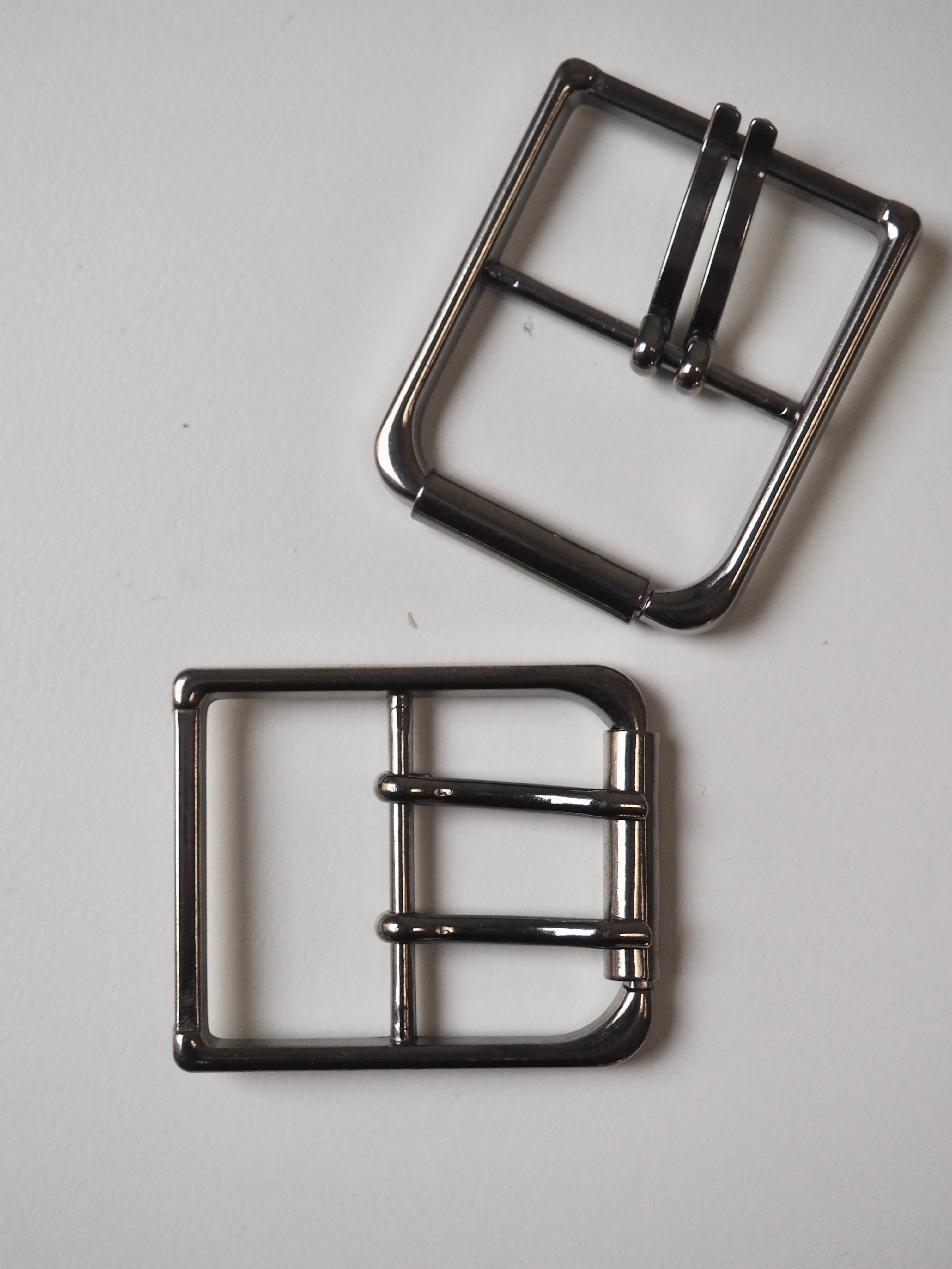 This ex-designer hardware is a buckle. These gunmetal buckles are perfect for adding to garments or accessories. They have a shiny finish, with a roller and two sliding arms/prong that sit on a central bar.
