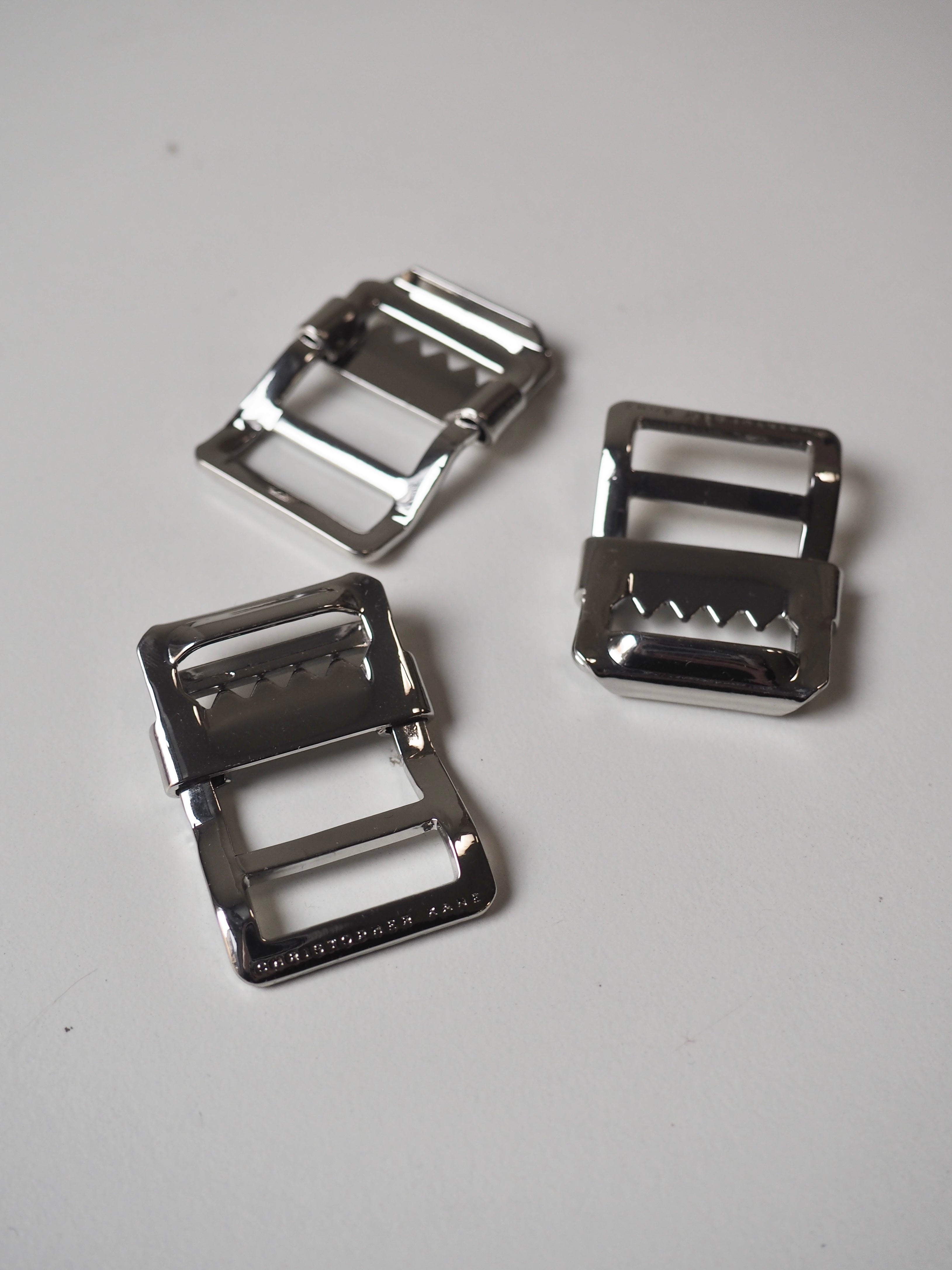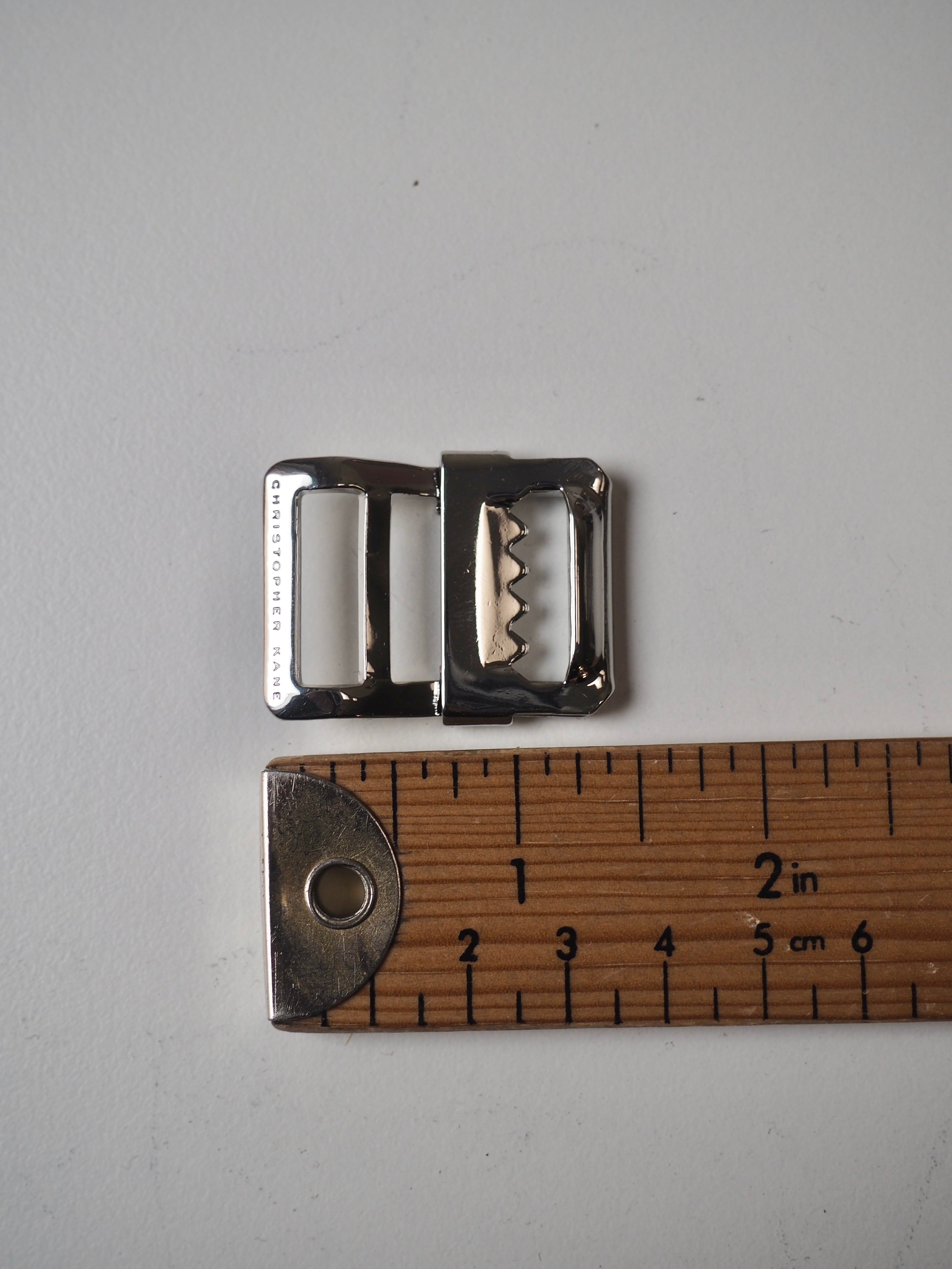 This ex-designer trim is a strap adjuster. It has an angled back and slider with teeth for weight and grip on a bag strap. One edge is engraved with a brand name and it has a shiny finish. Great for bag making and garment accessorizing!