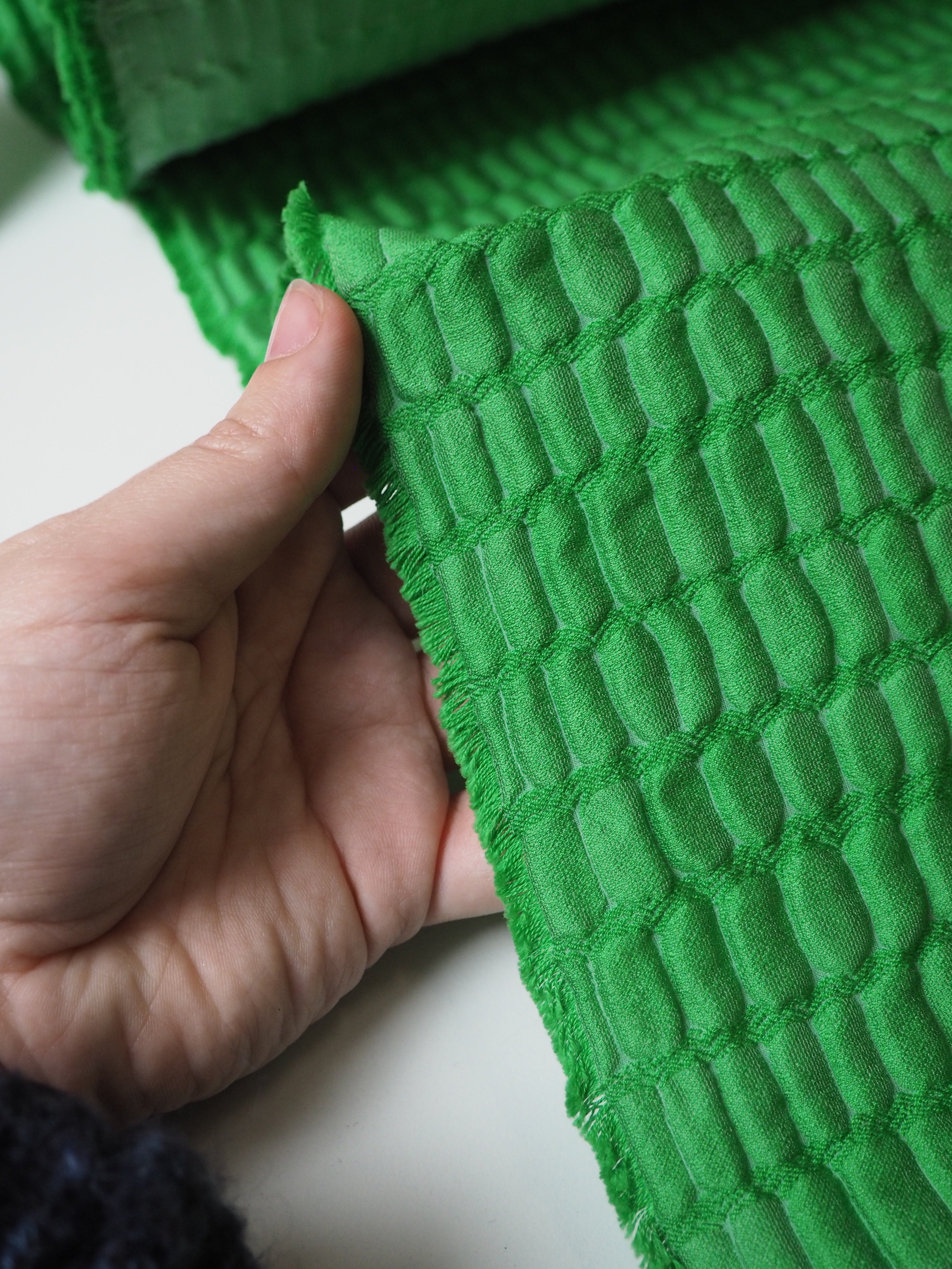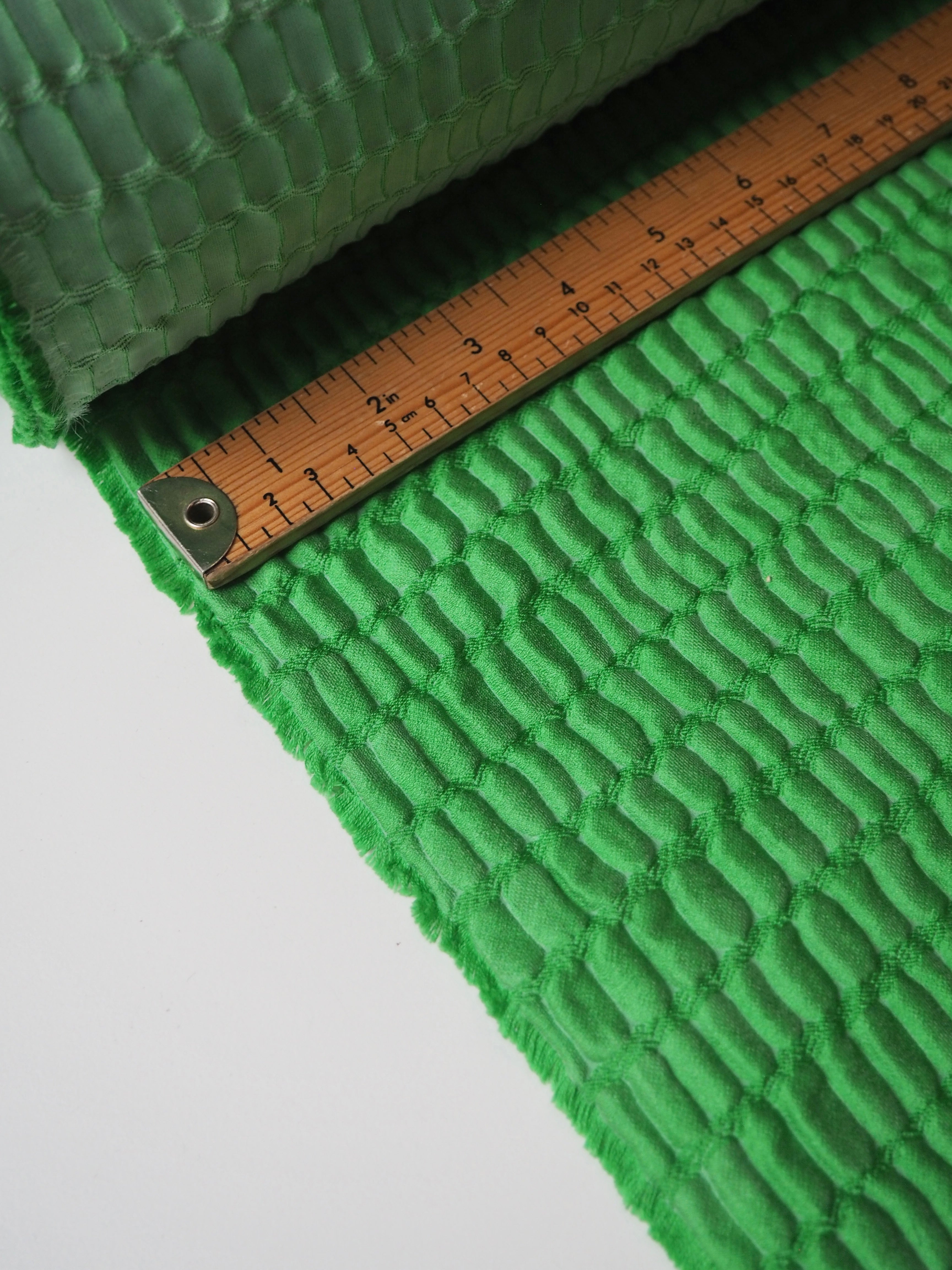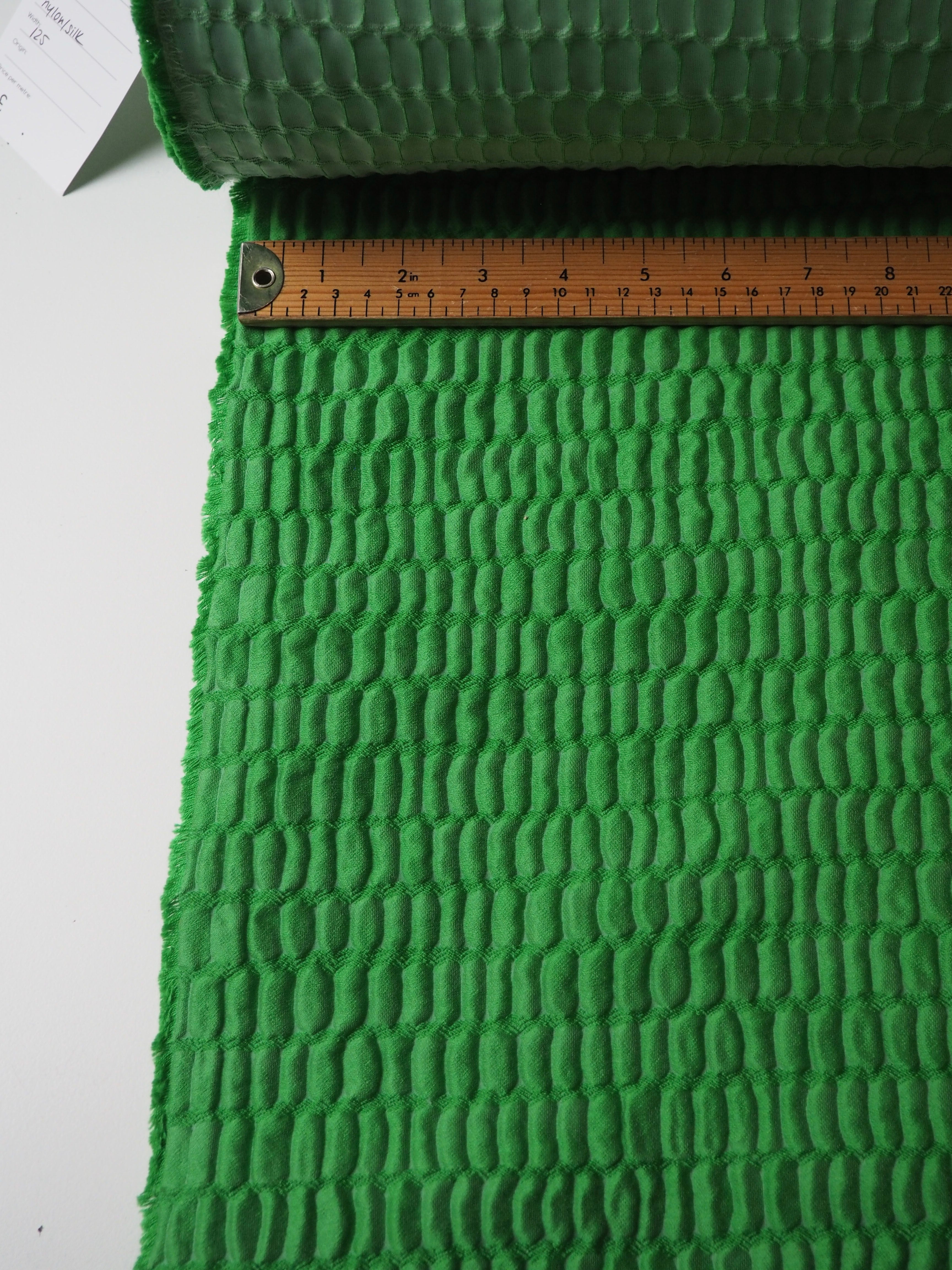 This ex-designer fabric is a stunning cloqué. This cloqué is a rich medium green shade, with a crocodile embossed looking weave. It has a plush risen texture and wonderful nylon/silk blend handle. Lightweight with an incredible airy structure and bouncy movement. Fully opaque. Finishes with a light sheen. Perfect for a special project!