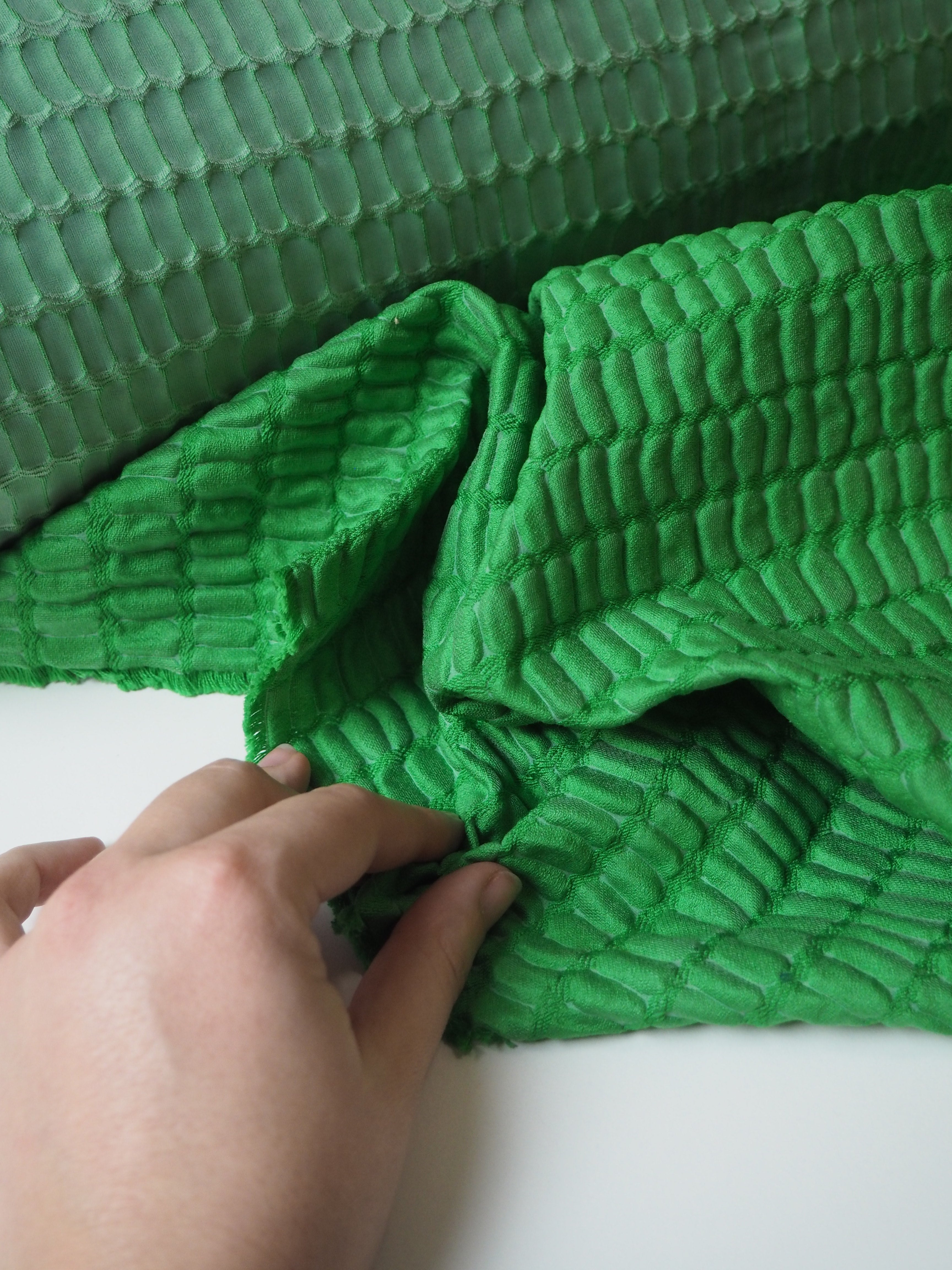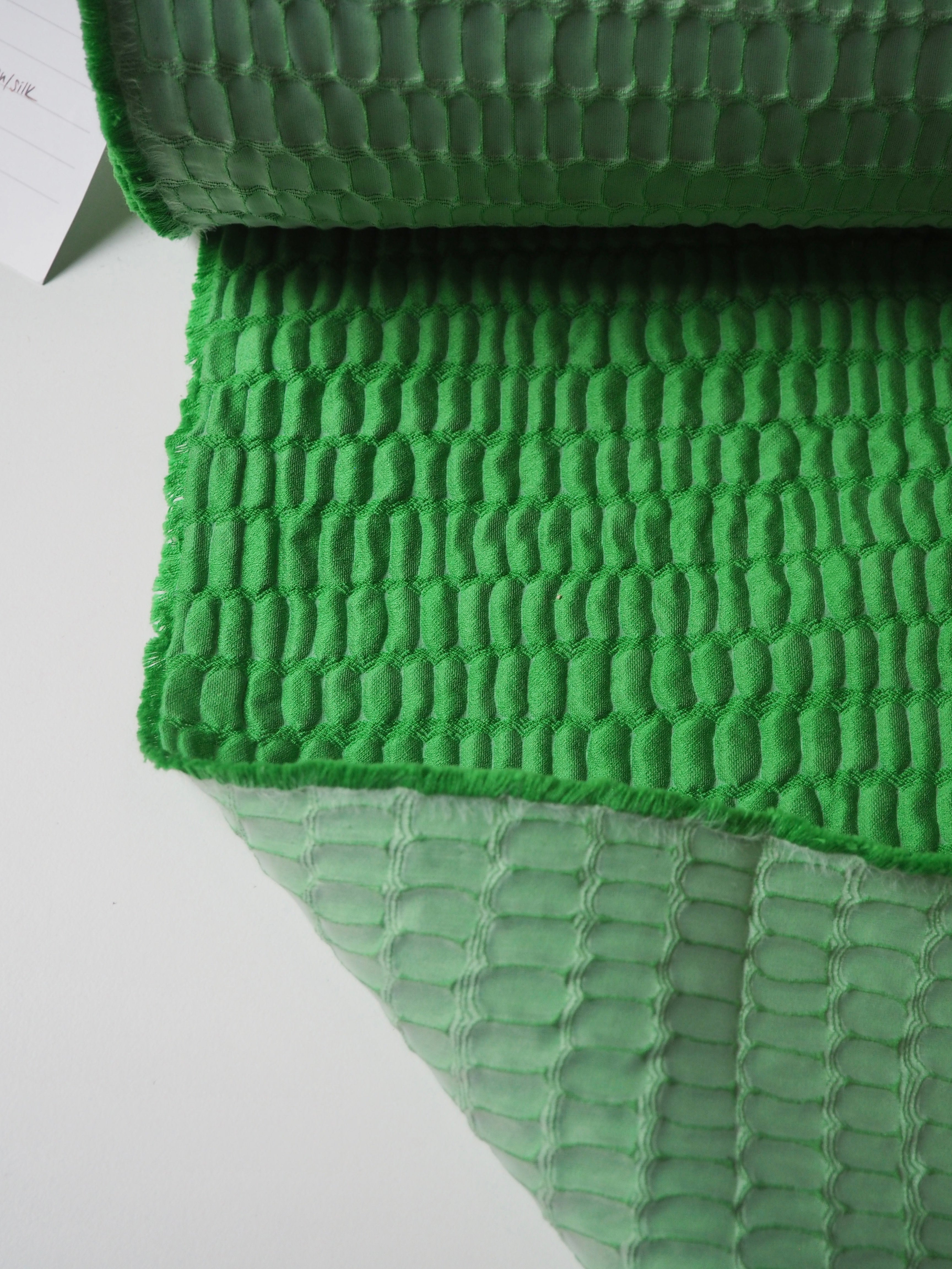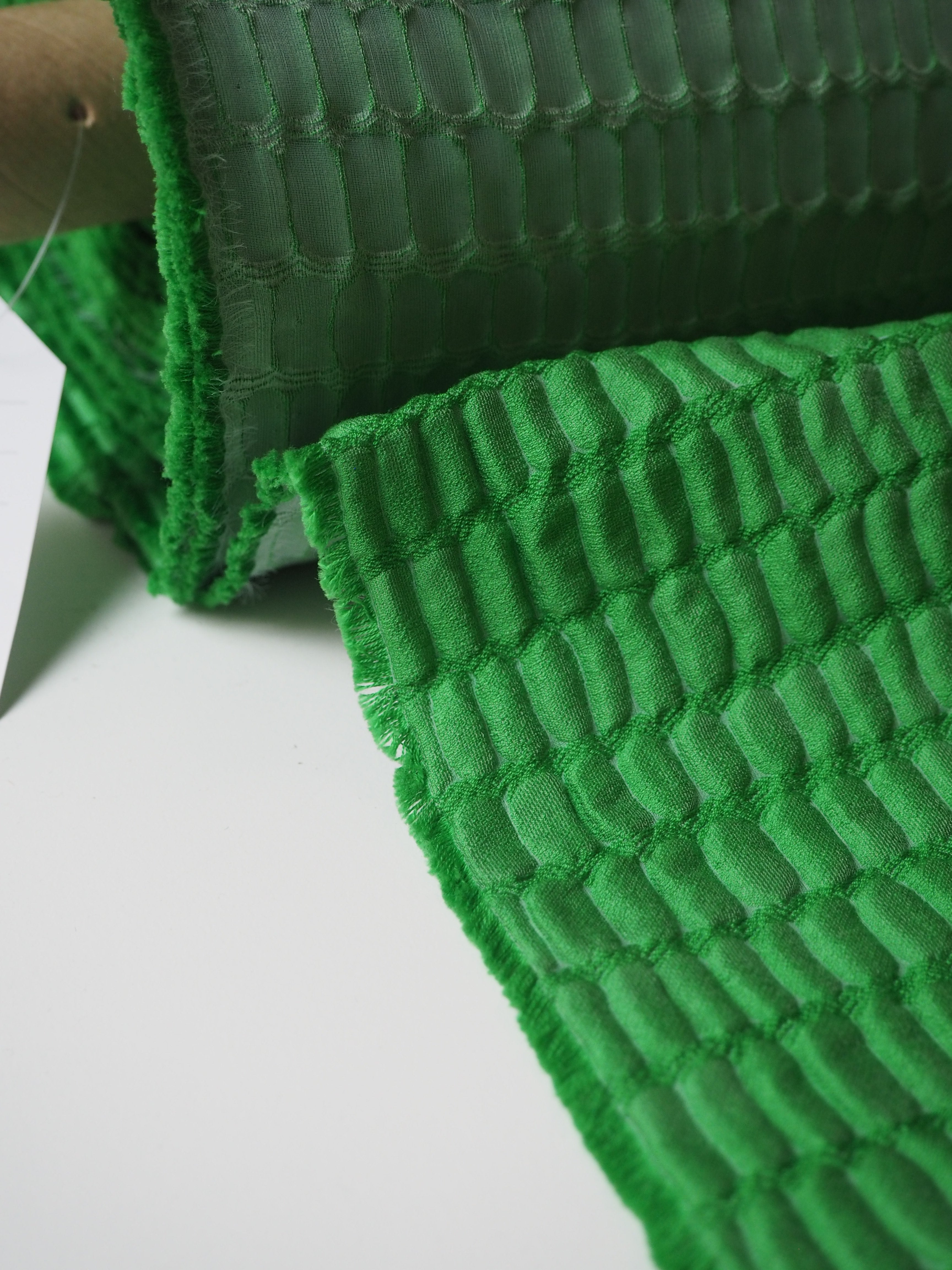 This ex-designer fabric is a stunning cloqué. This cloqué is a rich medium green shade, with a crocodile embossed looking weave. It has a plush risen texture and wonderful nylon/silk blend handle. Lightweight with an incredible airy structure and bouncy movement. Fully opaque. Finishes with a light sheen. Perfect for a special project!
