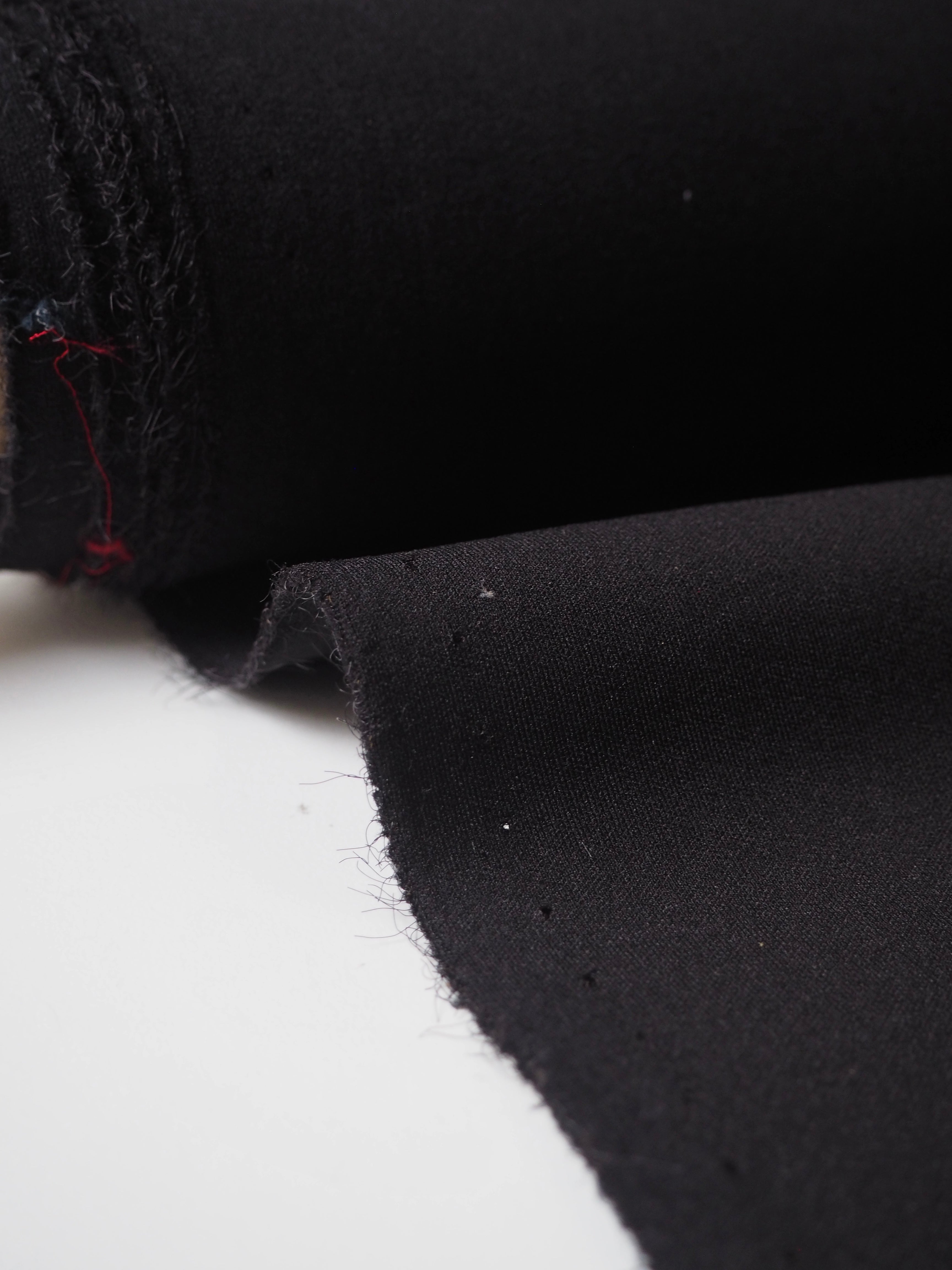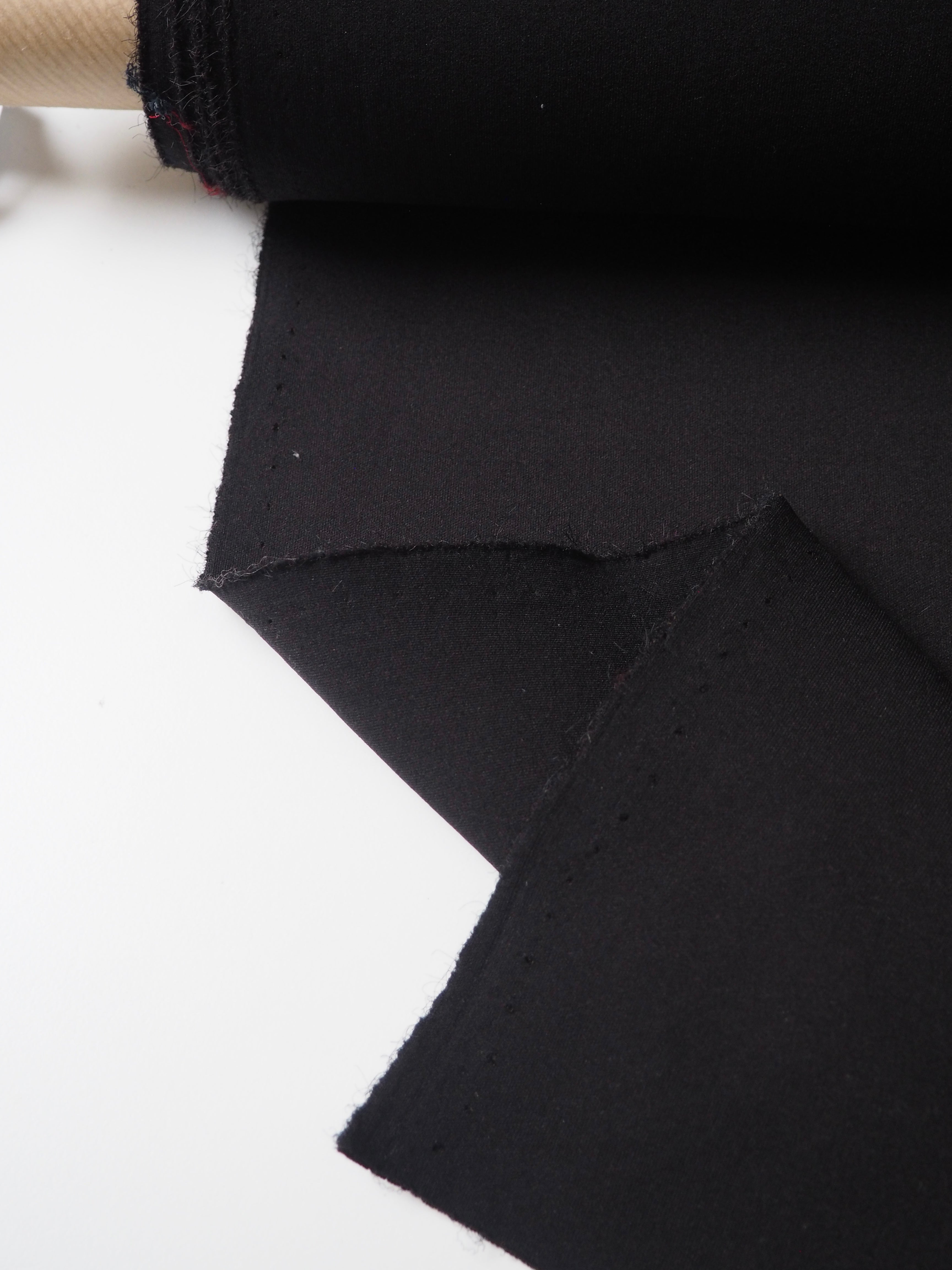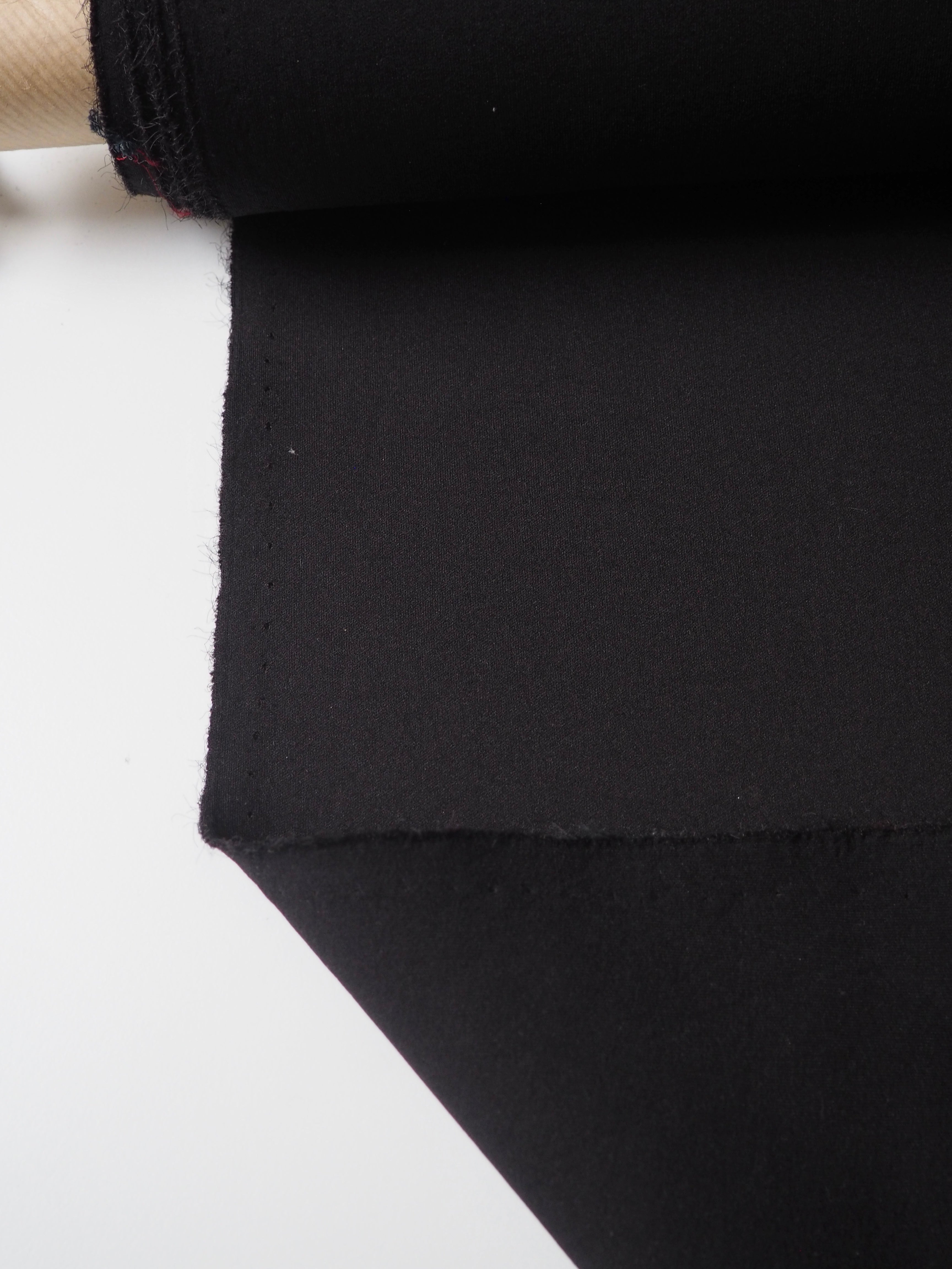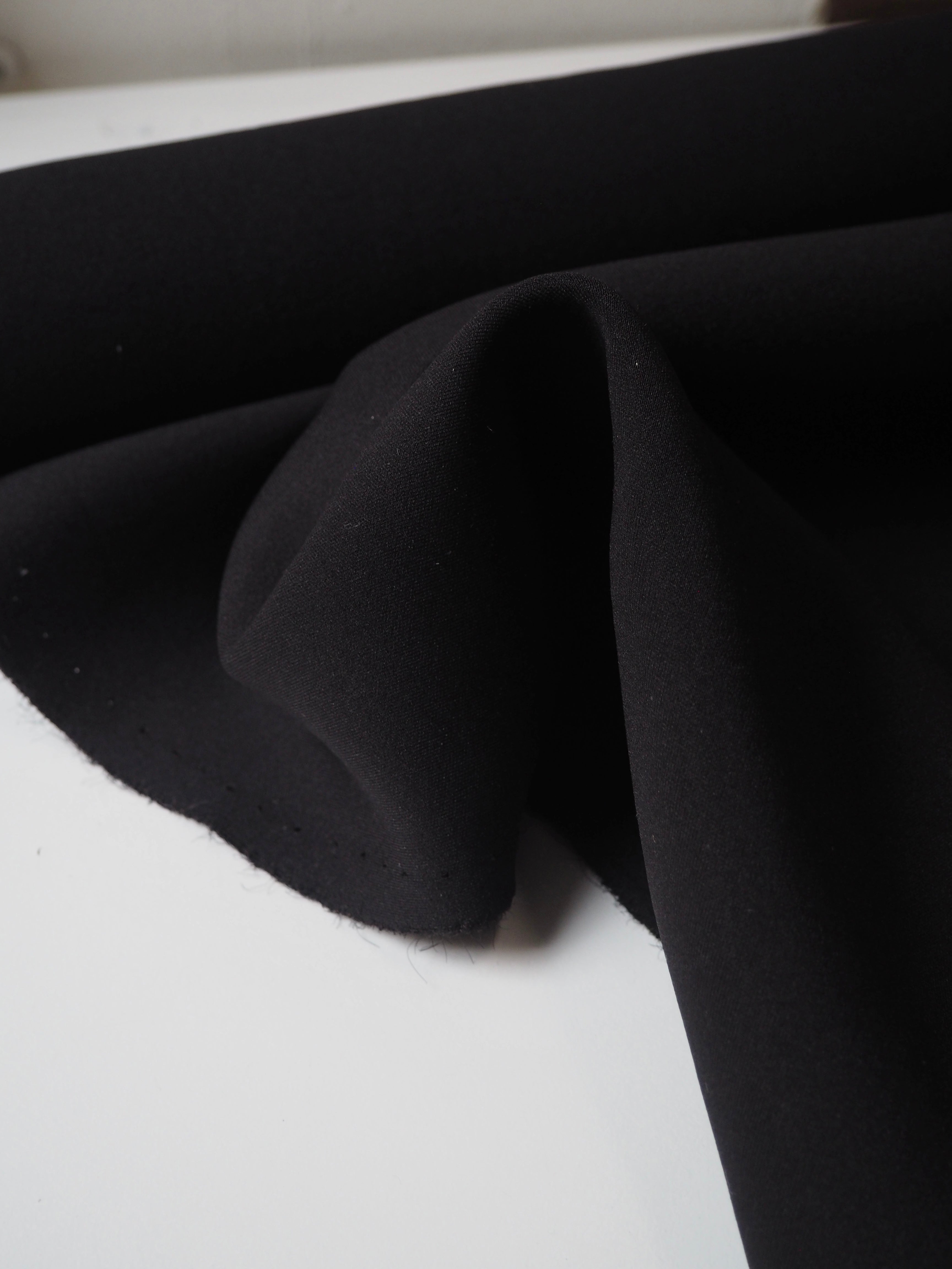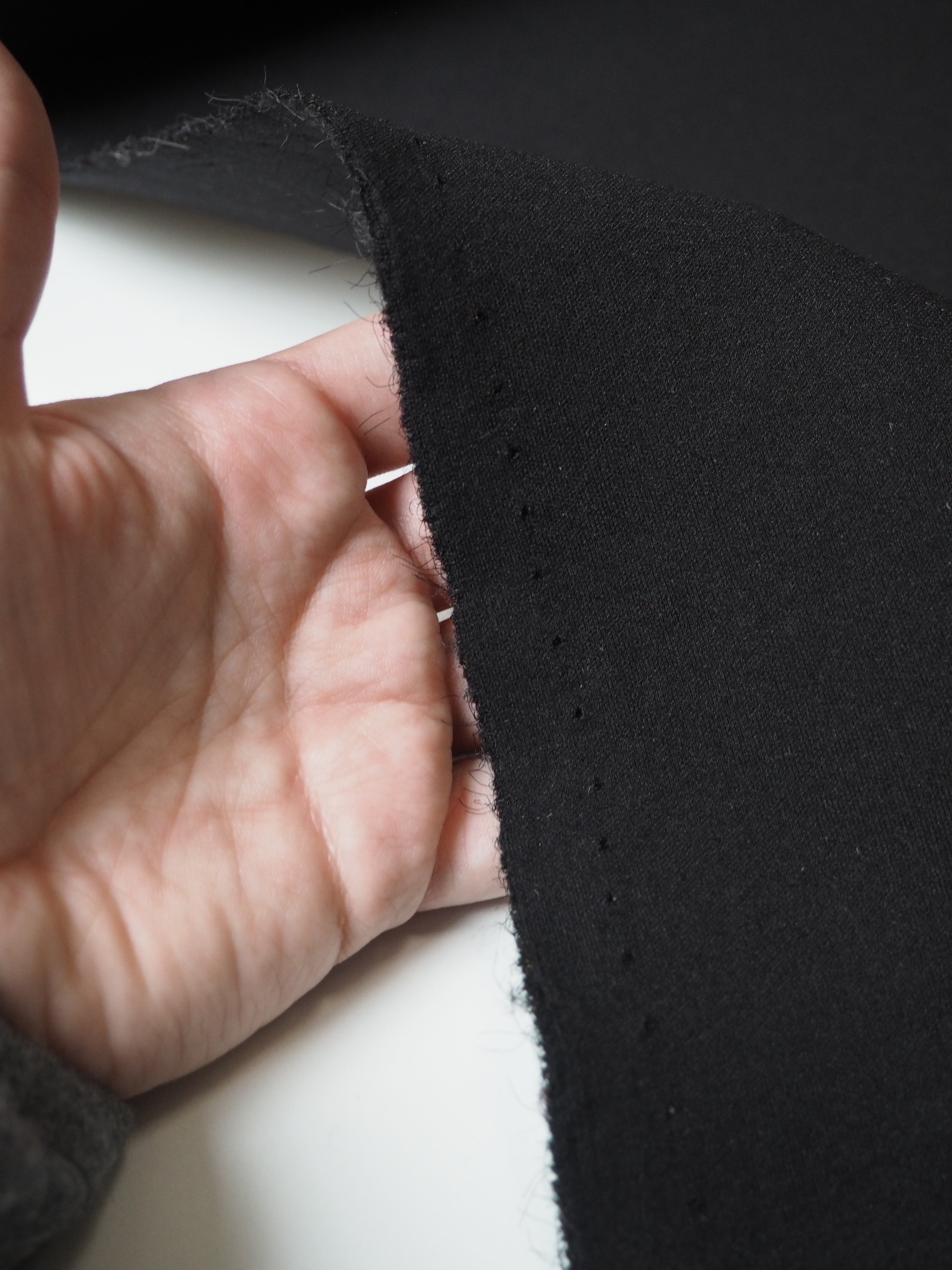 This ex-designer fabric is a scuba jersey. It's a more technical jersey, with a bouncy structure. Light to medium weight but a heavier weight typical for scuba jerseys. Has a soft handle and up to 80% stretch both ways. Perfect for a cosy jumper!