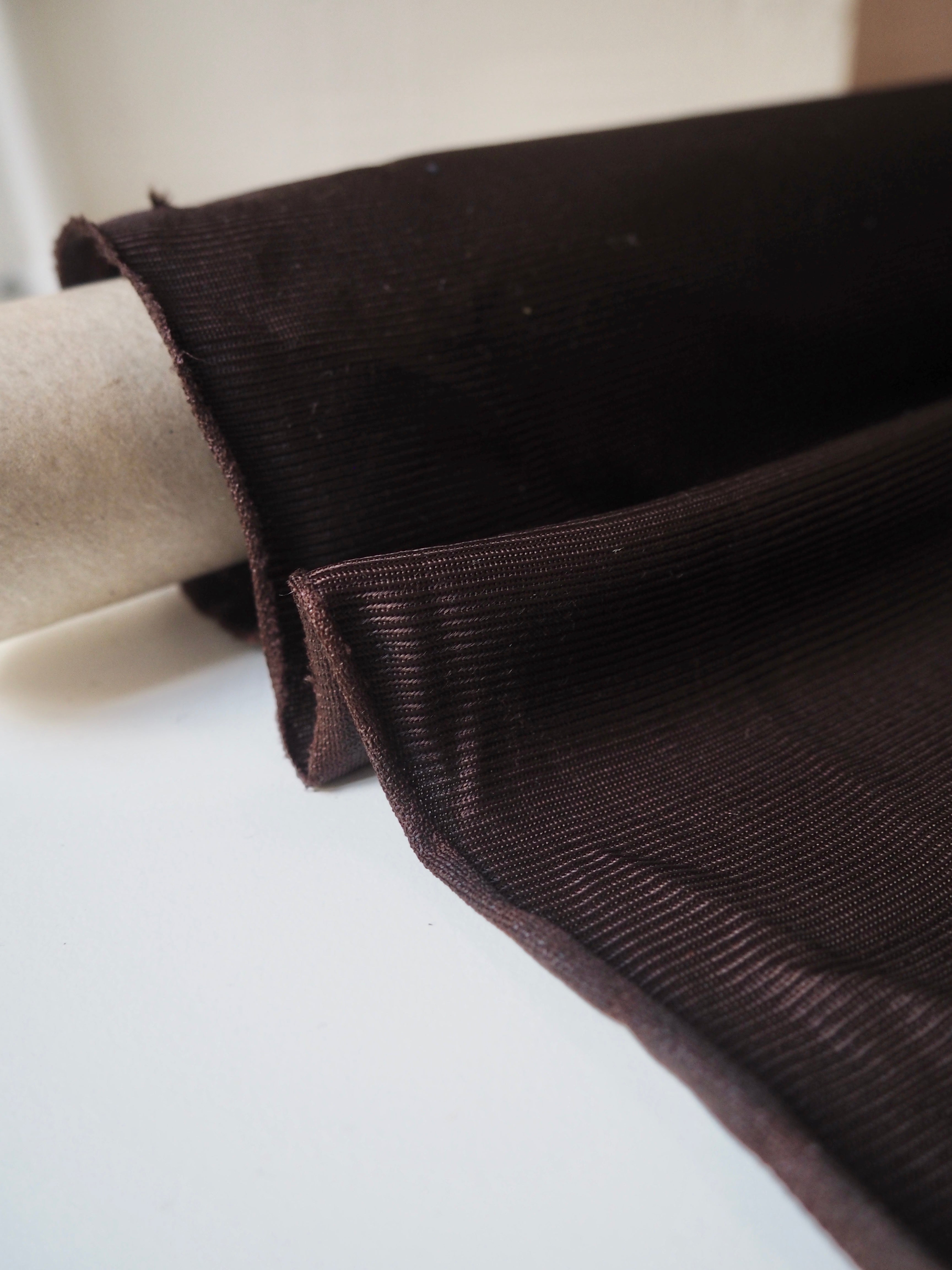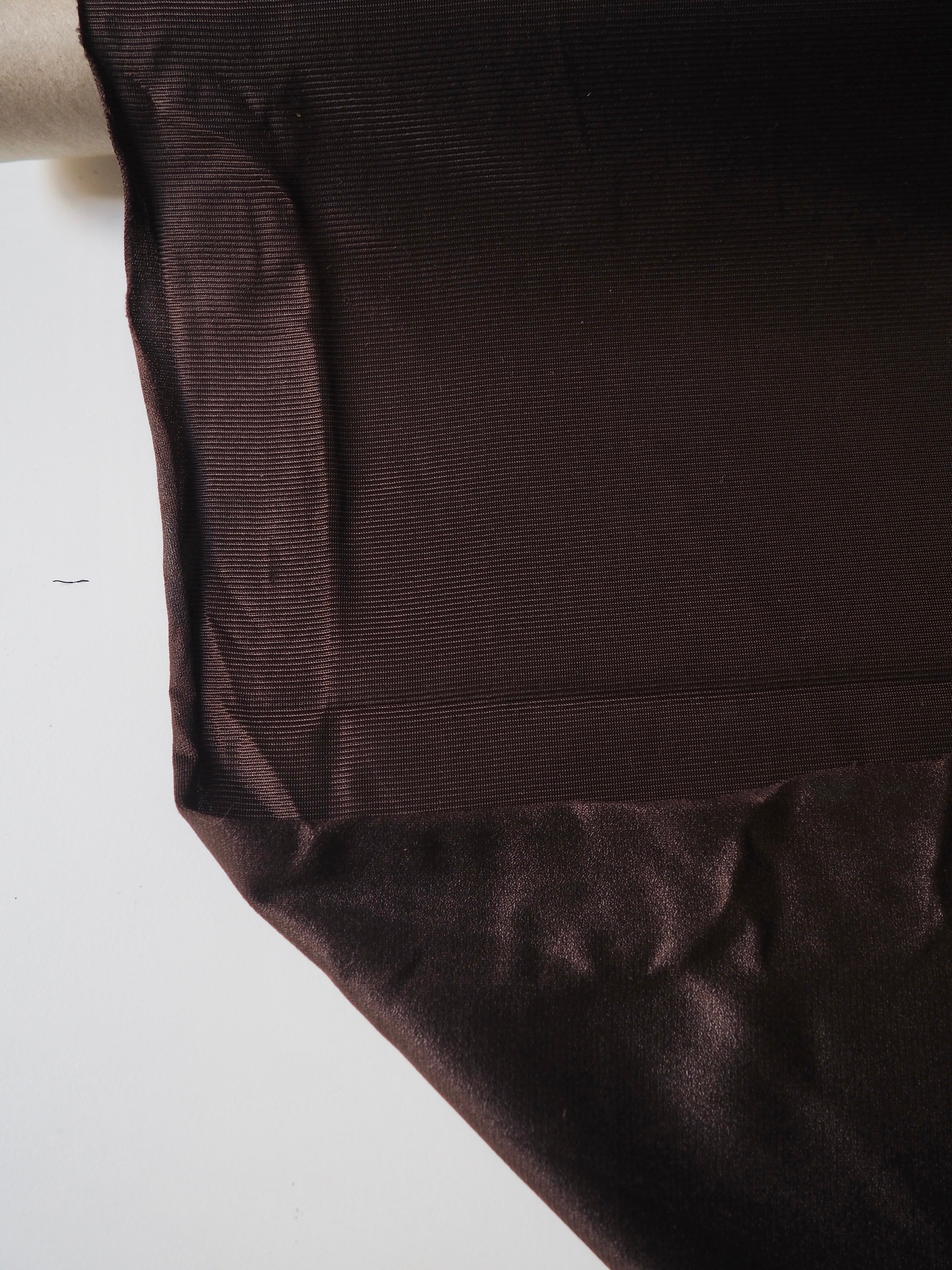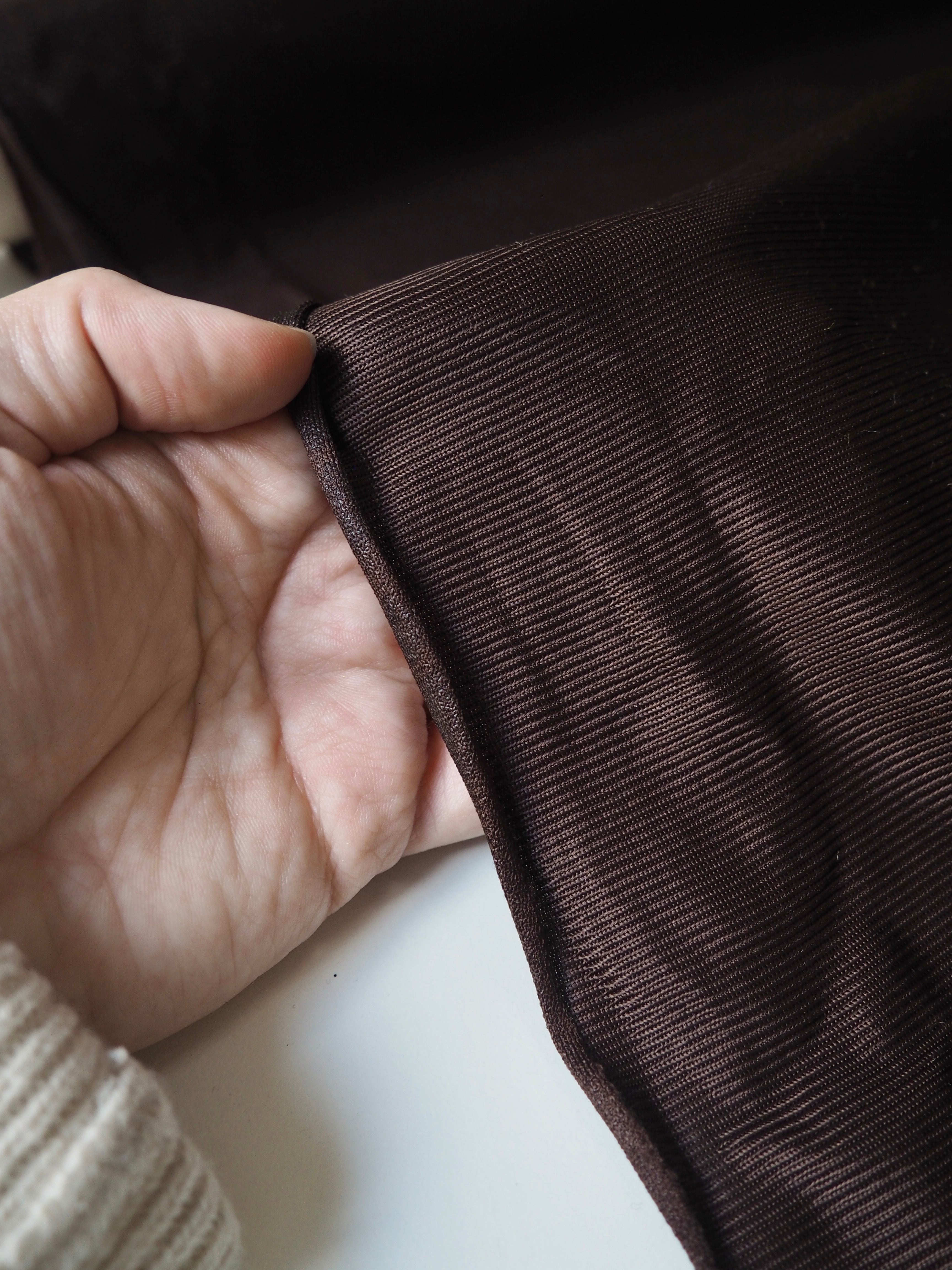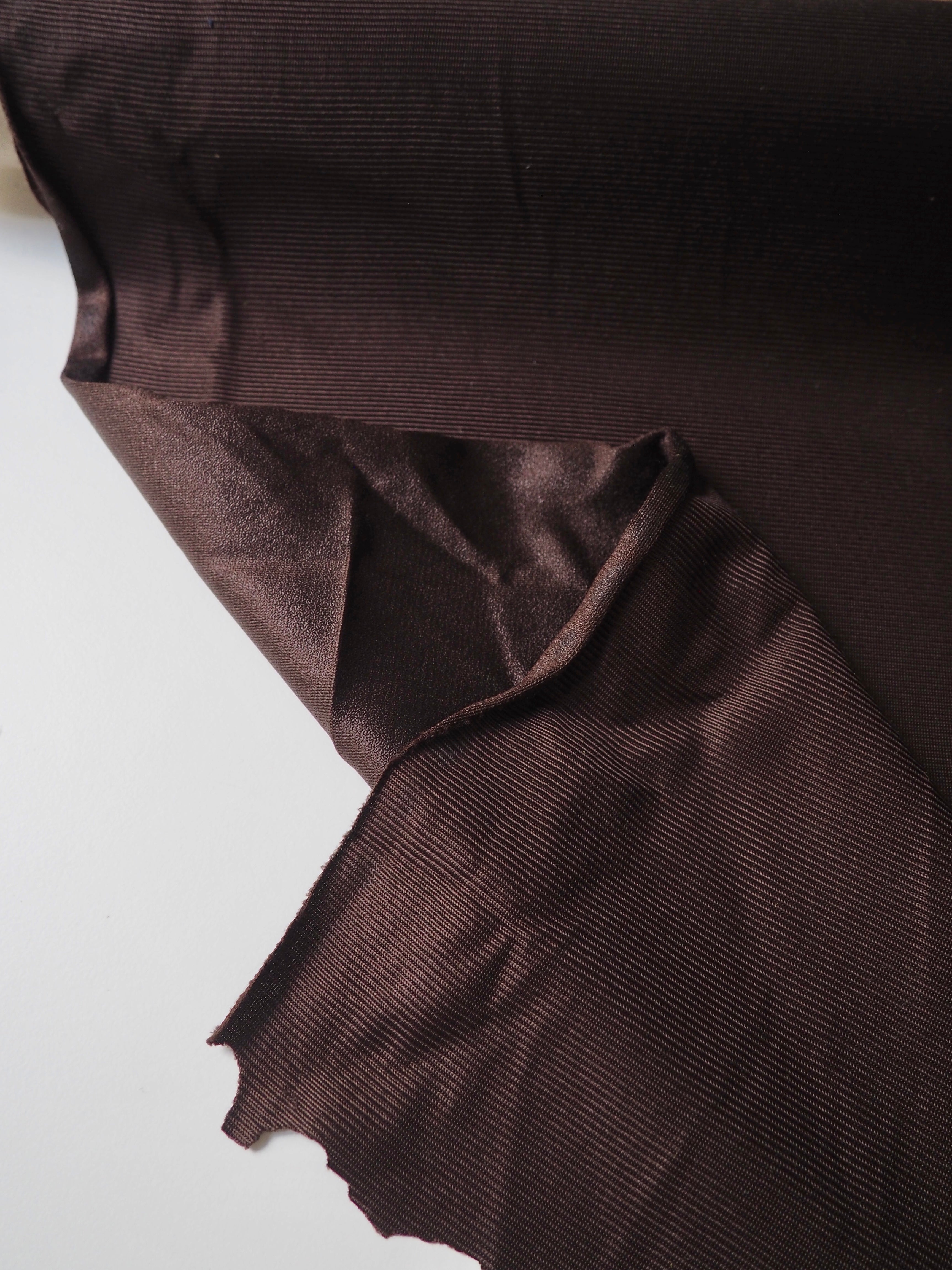 This ex-designer fabric is a jersey. It has a faille-like rib running the width of the cloth, with a smooth backing. Completely opaque, quite slinky, with a lovely sheen finish. Has a nice drape and approximately 20% width-ways stretch. Perfect for an elevated basic!